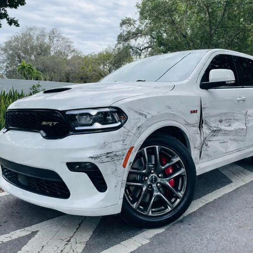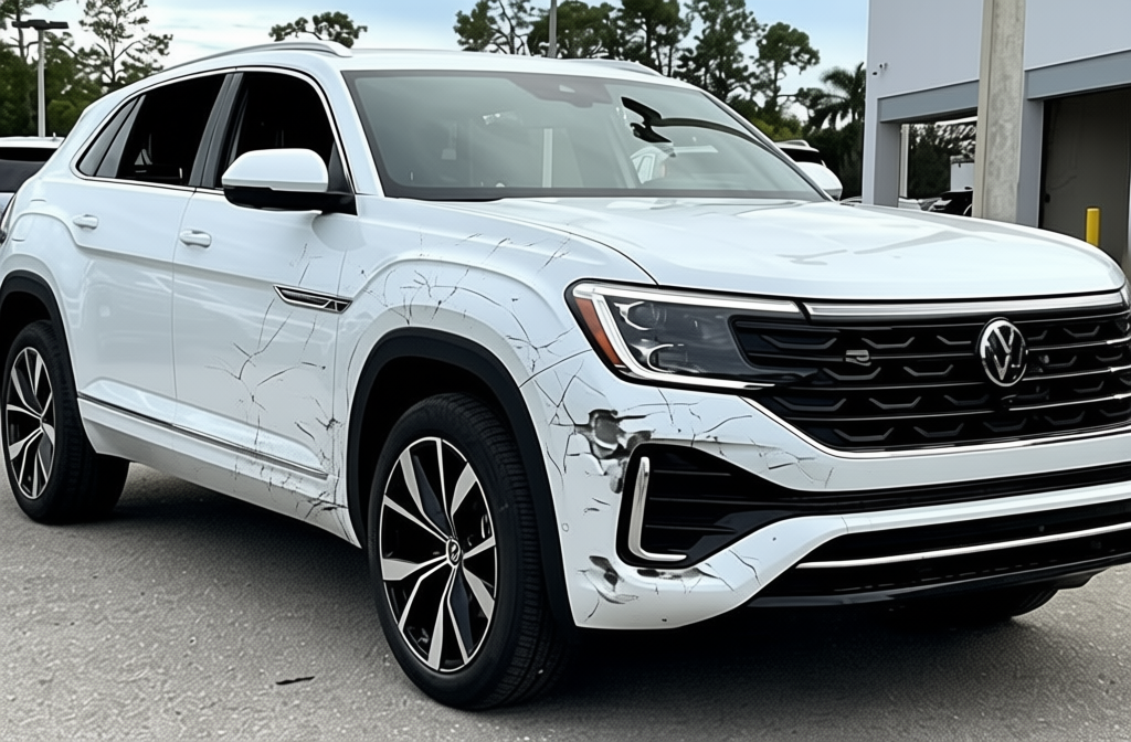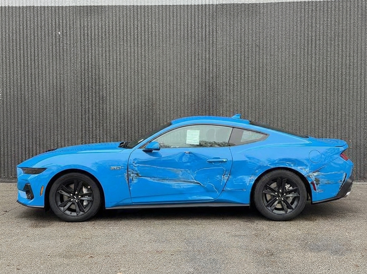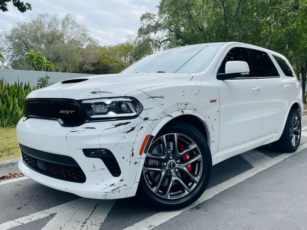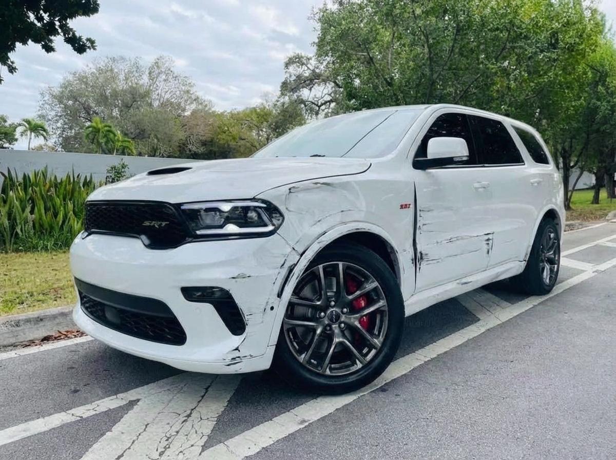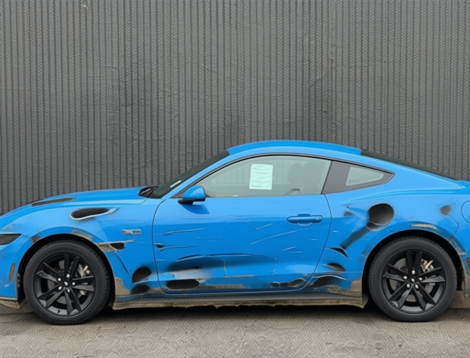 “Add realistic moderate body damage to this car - major scratches or moderate dents on the body panels. Make the damage look natural and real, as if from a minor collision. Preserve existing photo style and lighting as much as possible.”