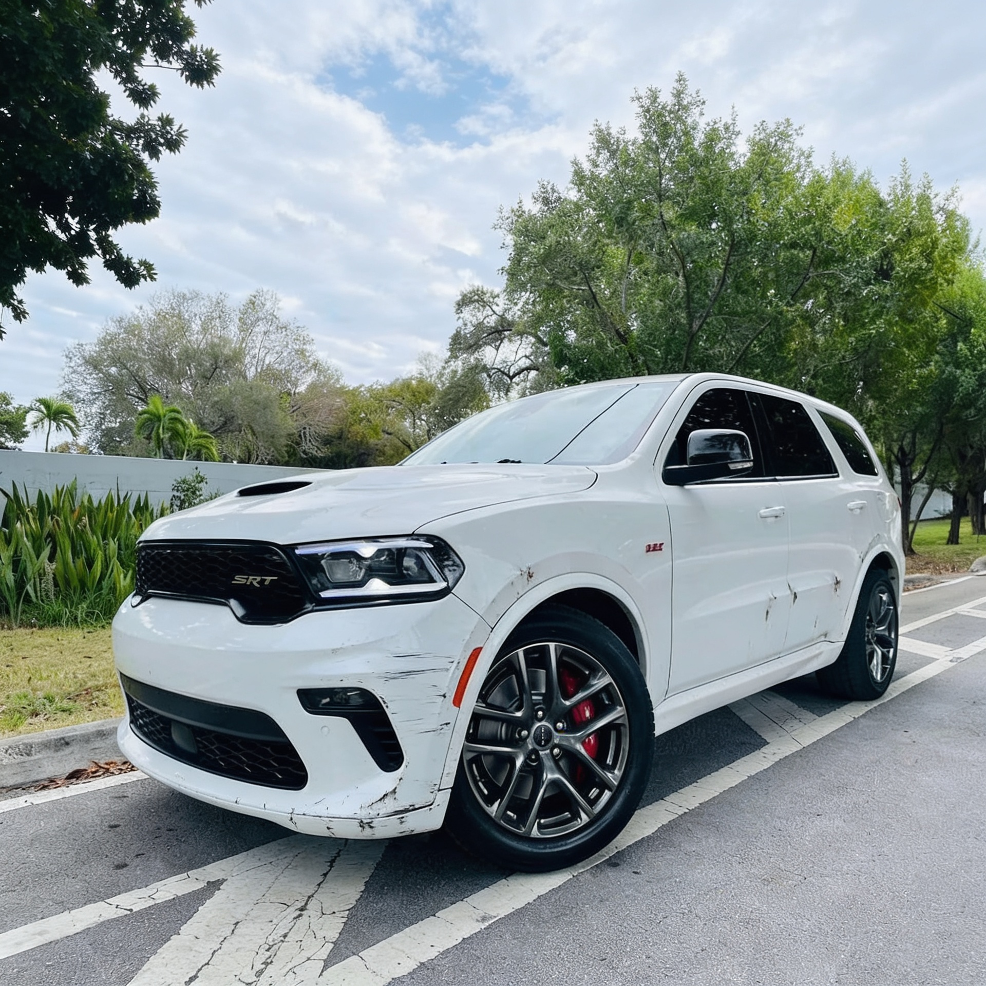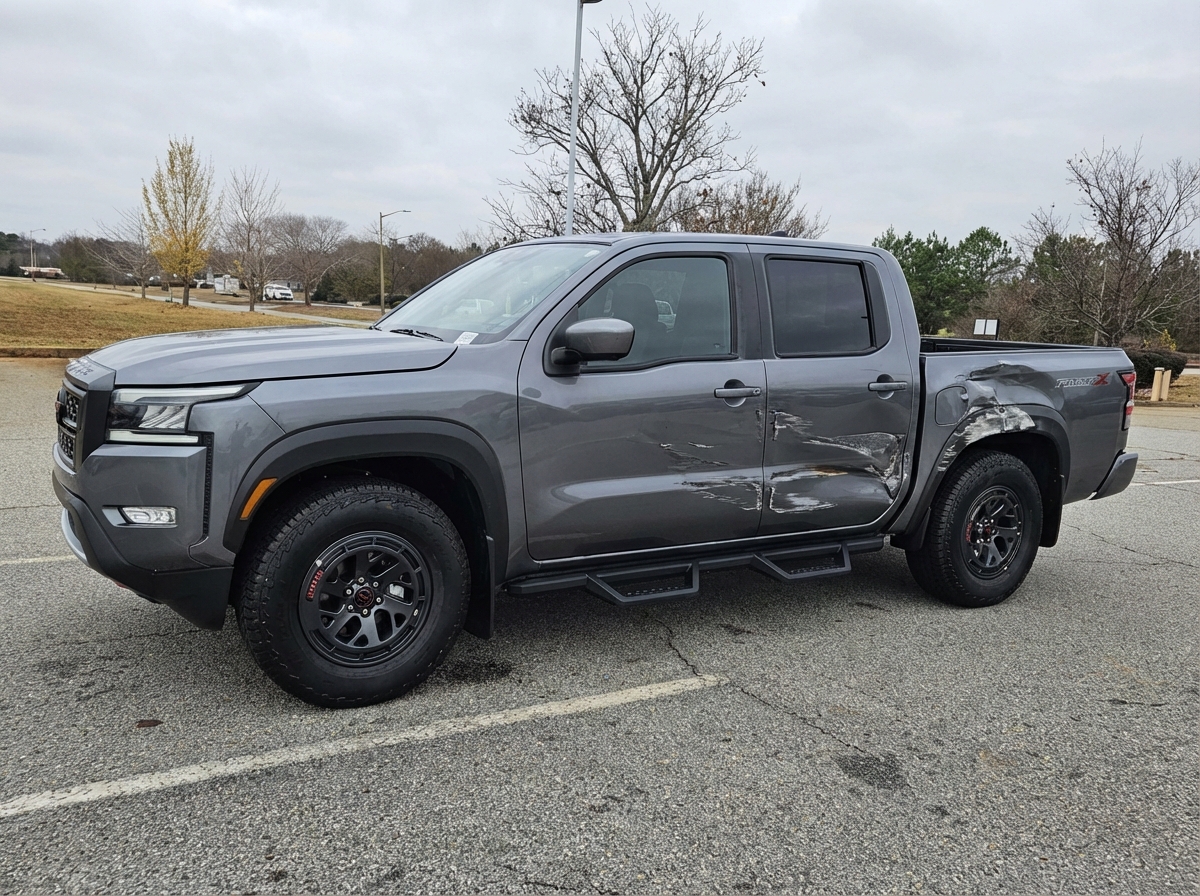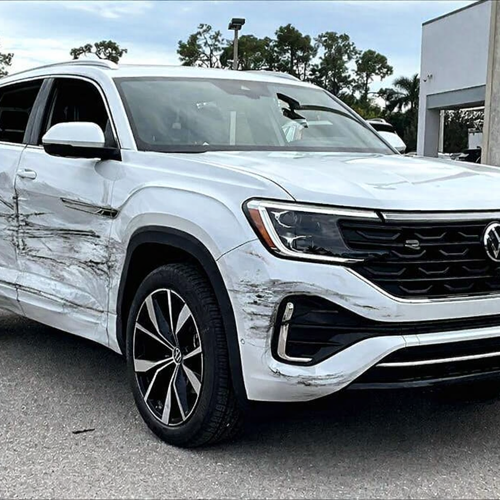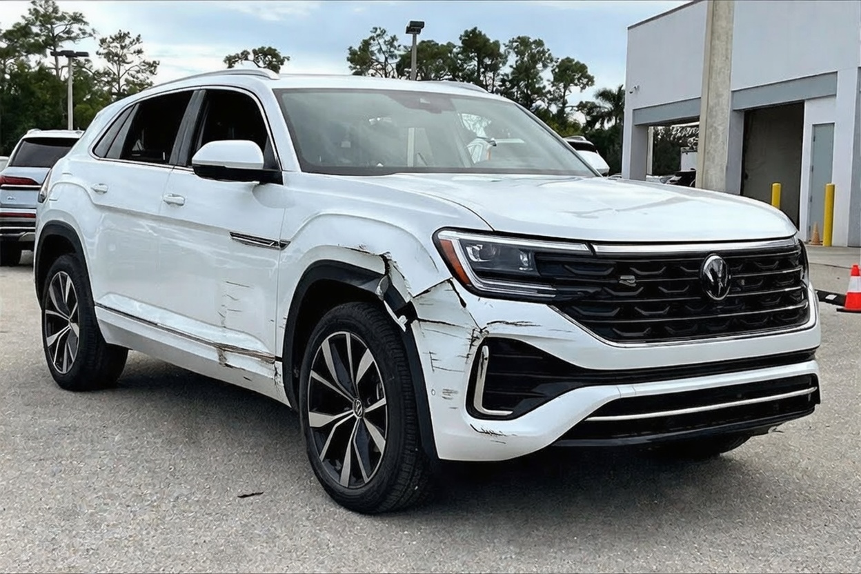 “Add realistic moderate body damage to this car - major scratches or moderate dents on the body panels. Make the damage look natural and real, as if from a minor collision. Preserve existing photo style and lighting as much as possible.”