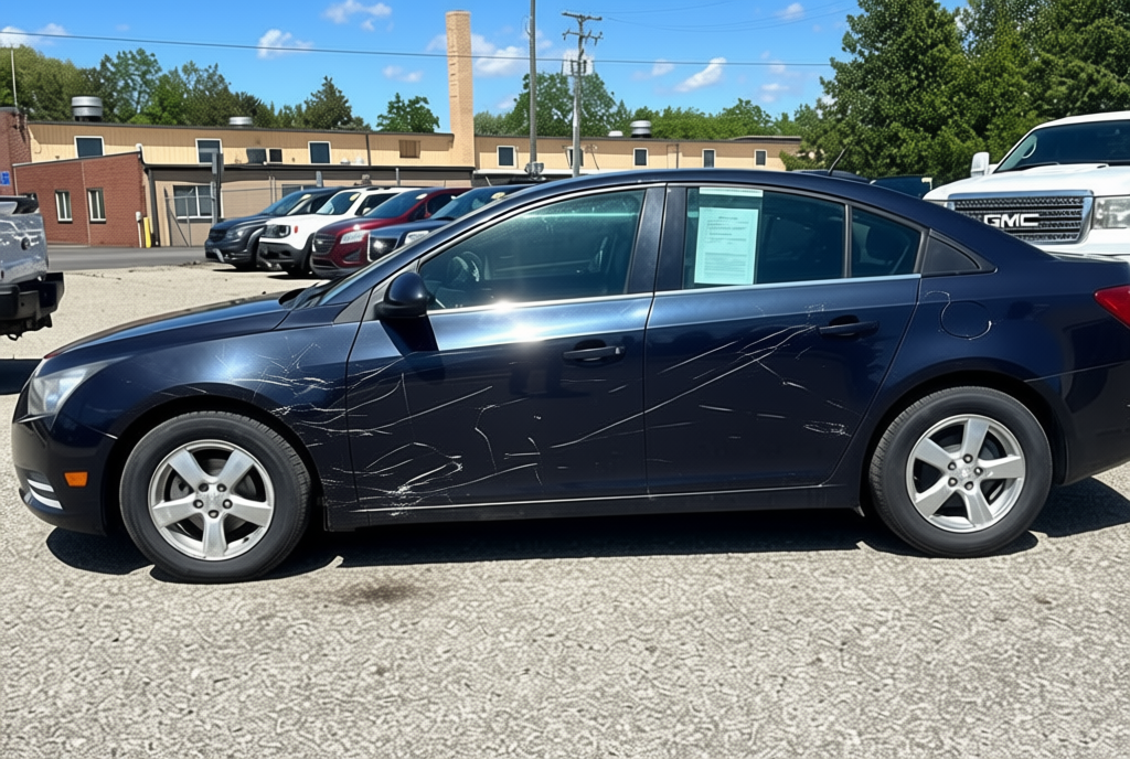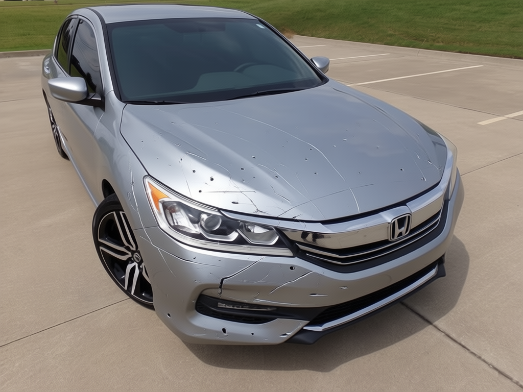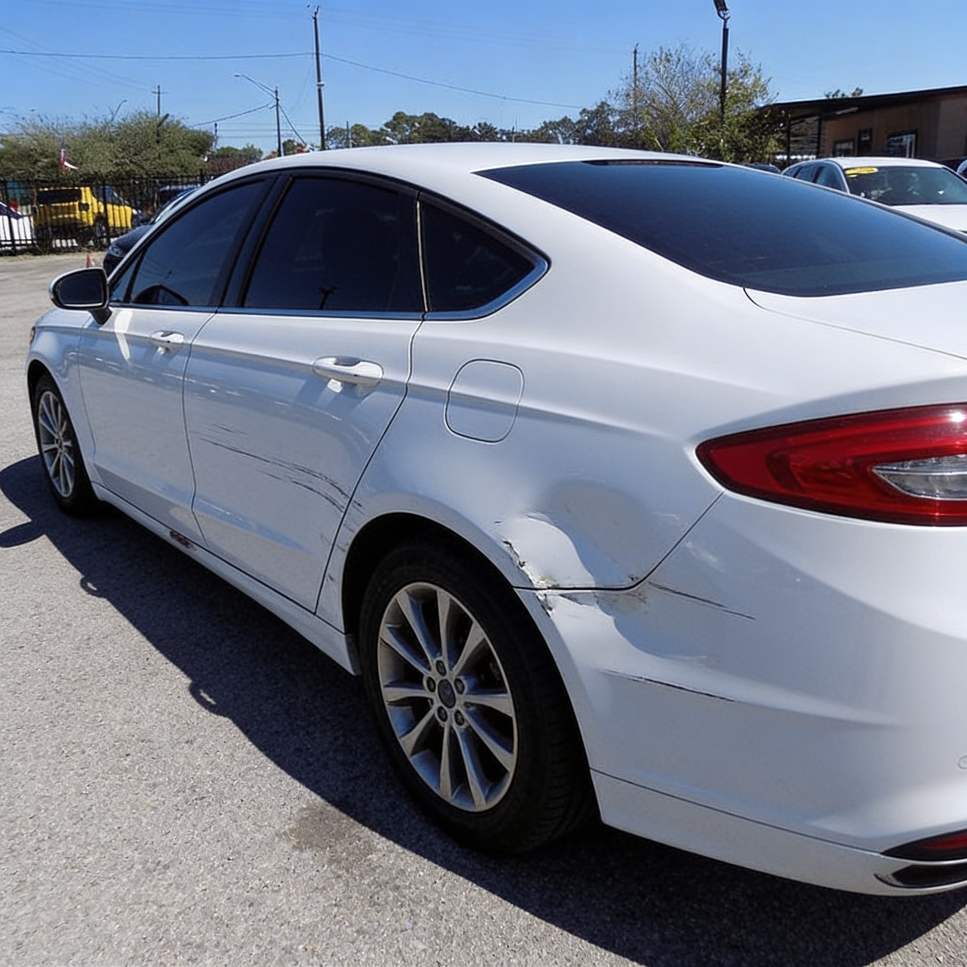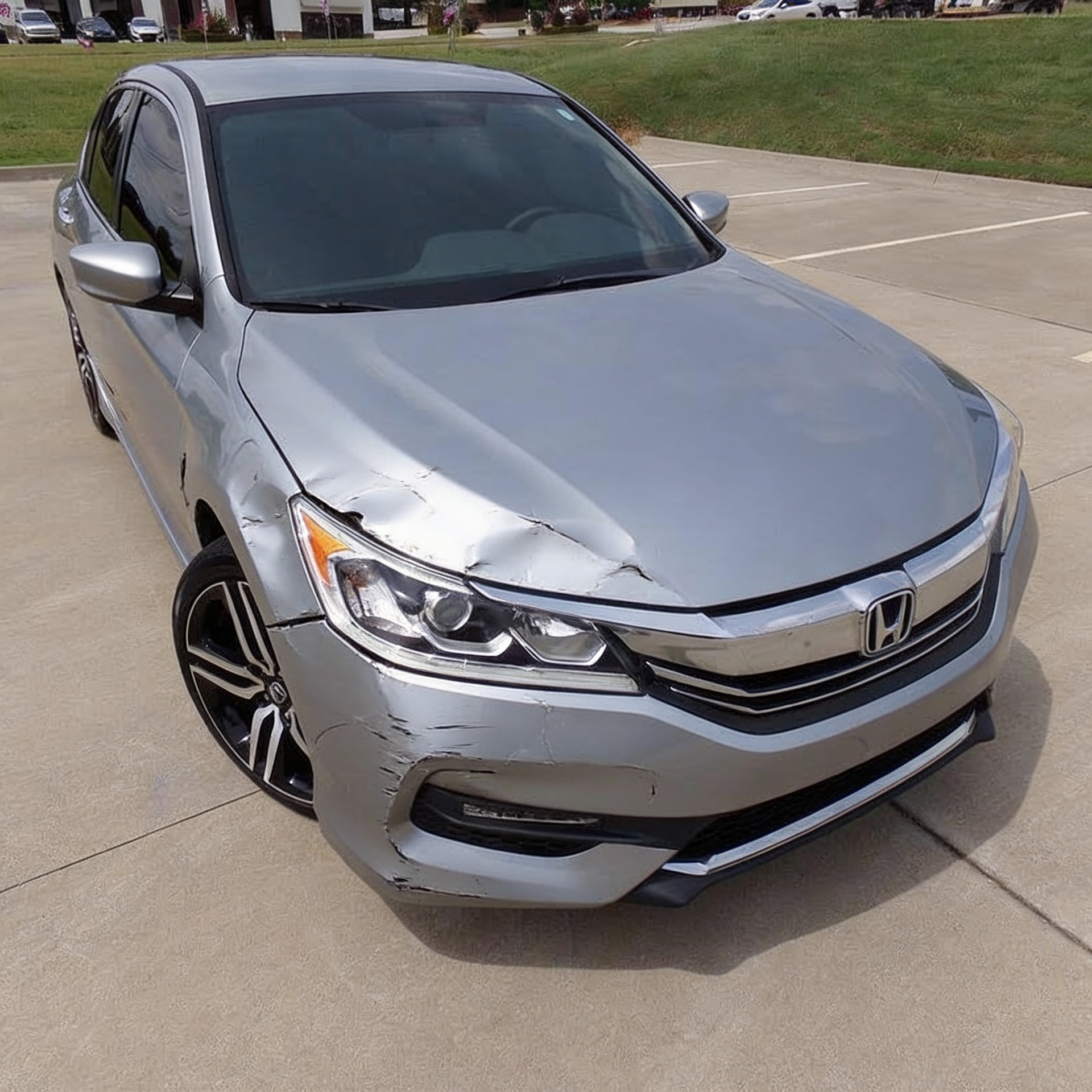 “Add realistic moderate body damage to this car - major scratches or moderate dents on the body panels. Make the damage look natural and real, as if from a minor collision. Preserve existing photo style and lighting as much as possible.”