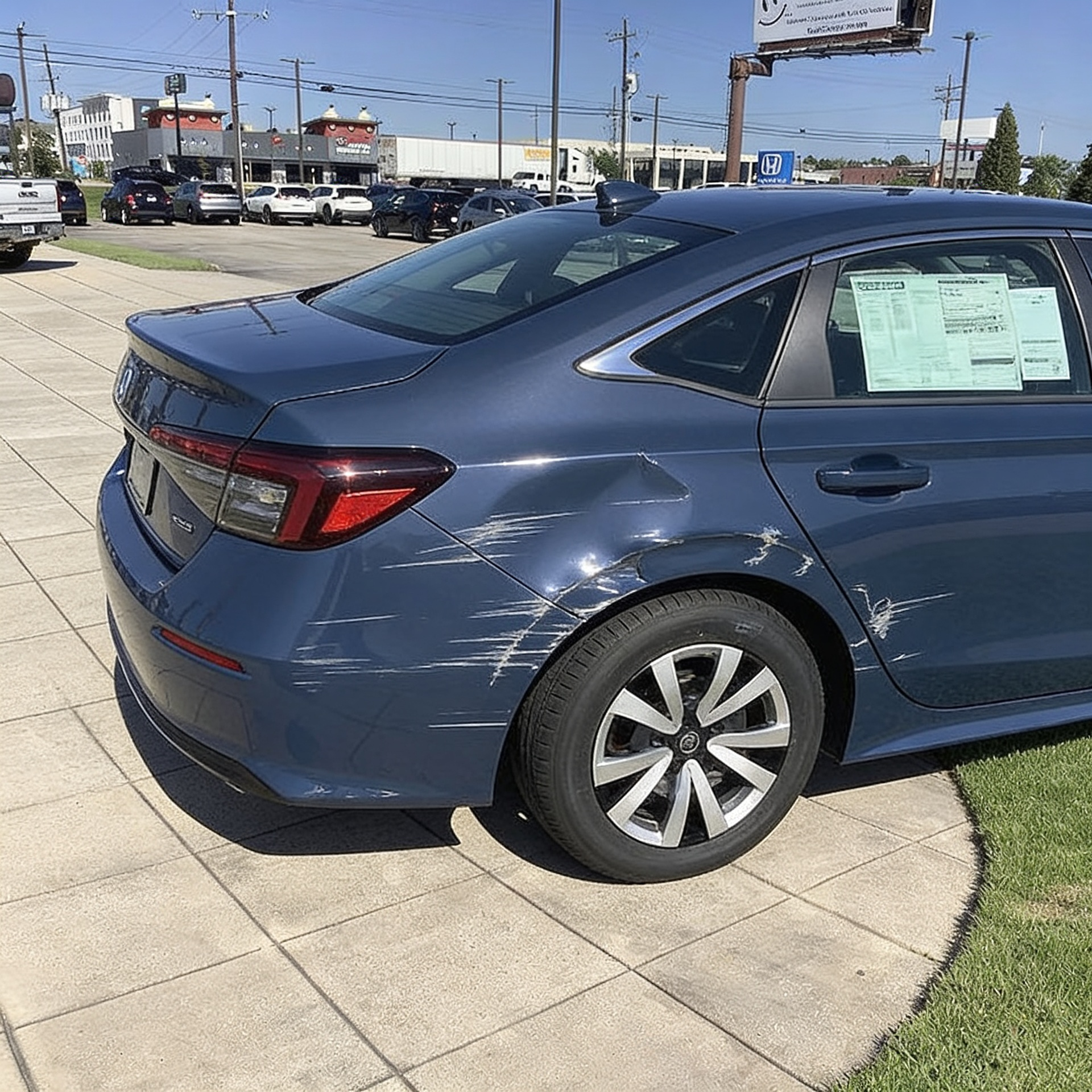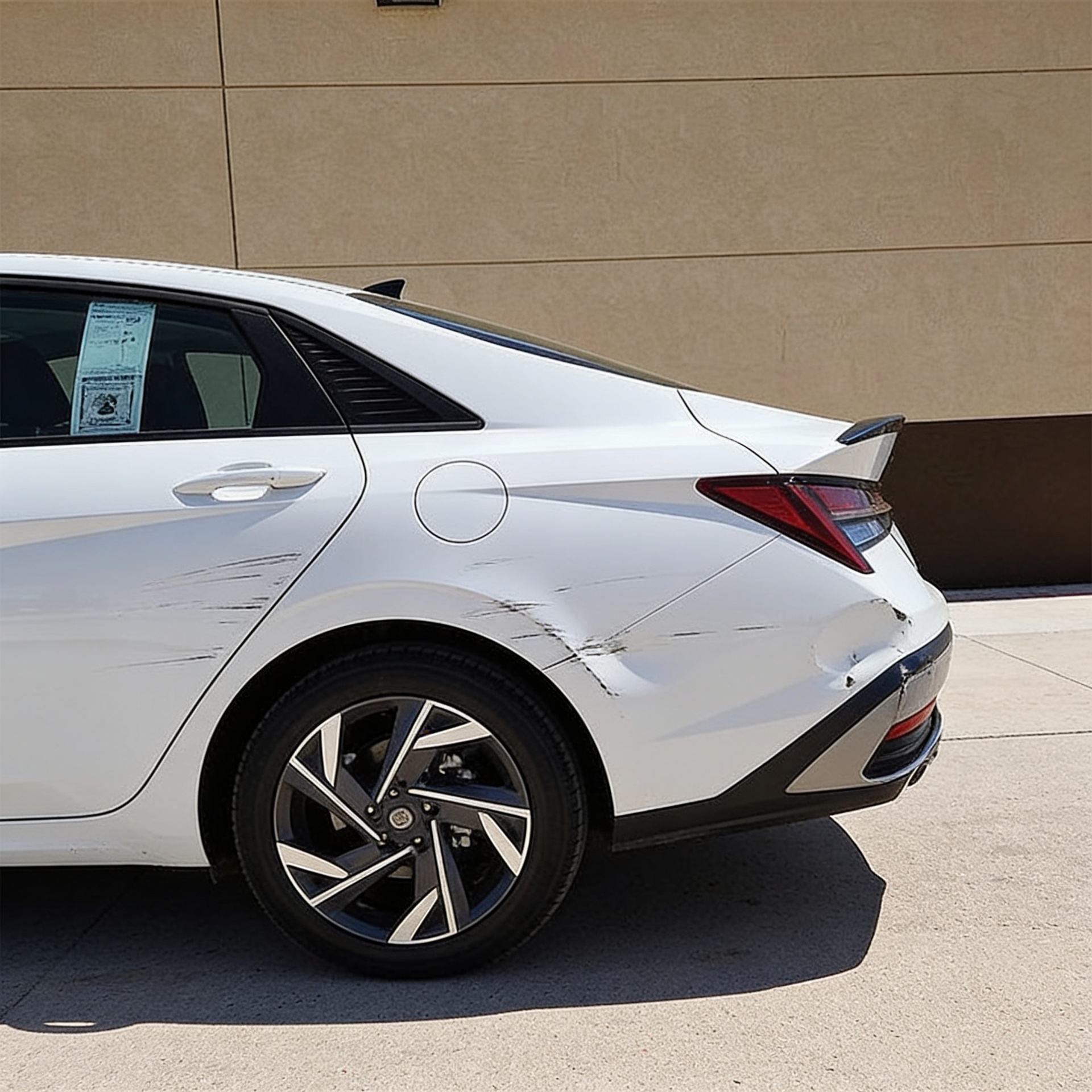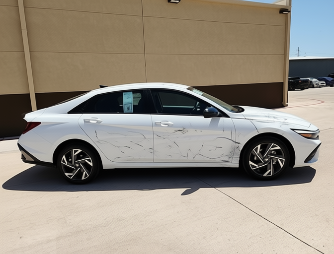 “Add realistic moderate body damage to this car - major scratches or moderate dents on the body panels. Make the damage look natural and real, as if from a minor collision. Preserve existing photo style and lighting as much as possible.”