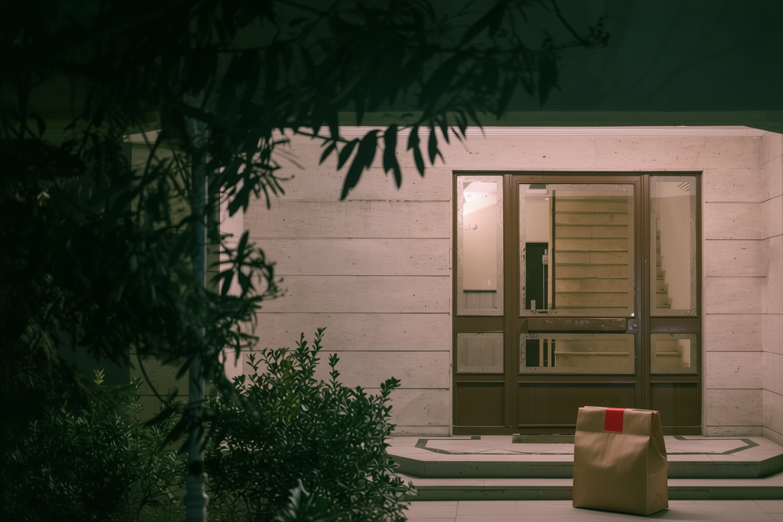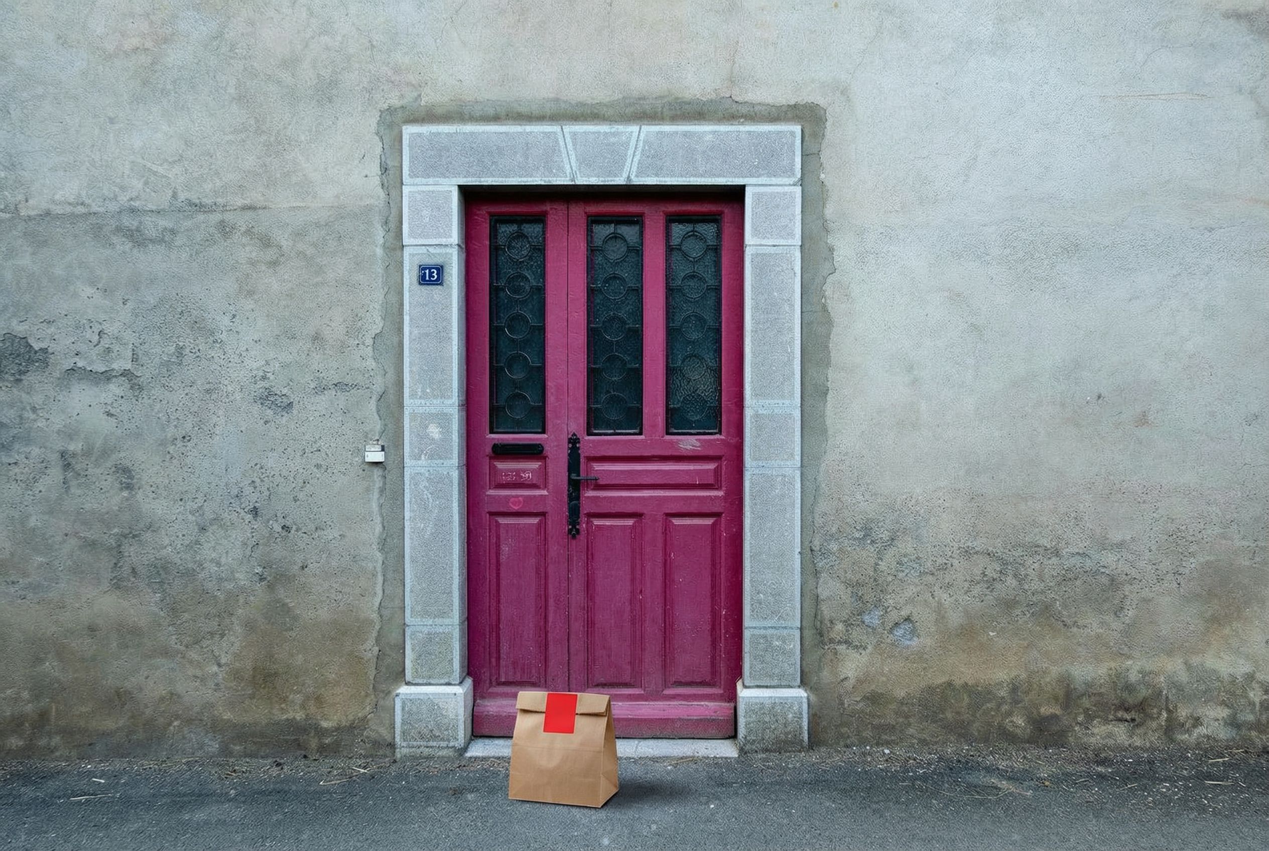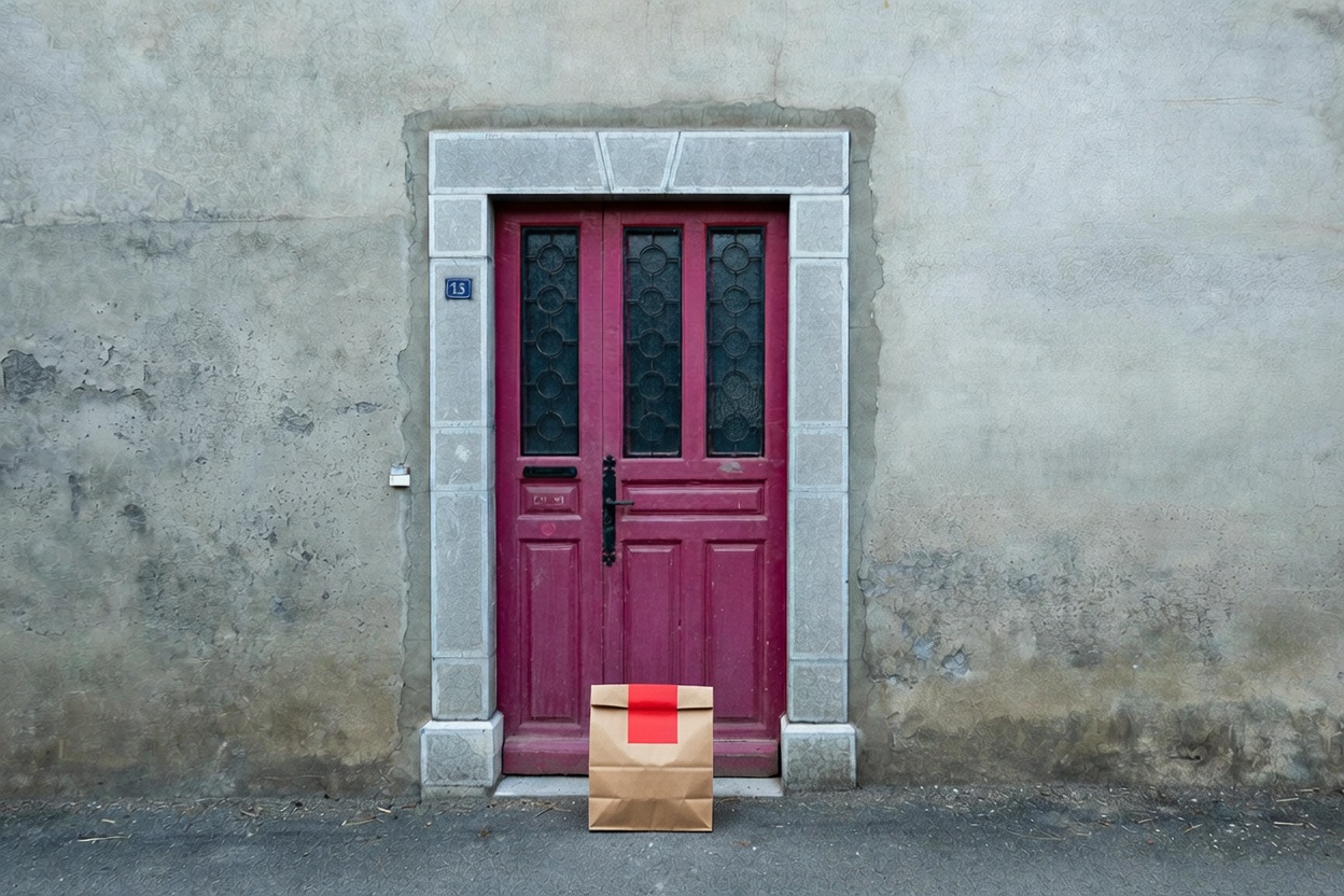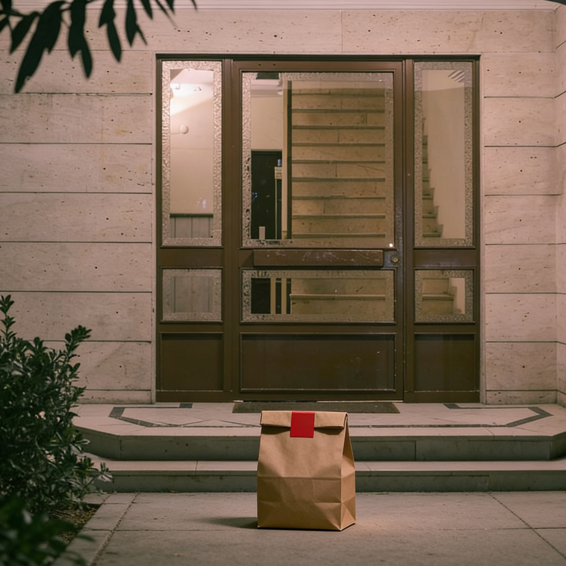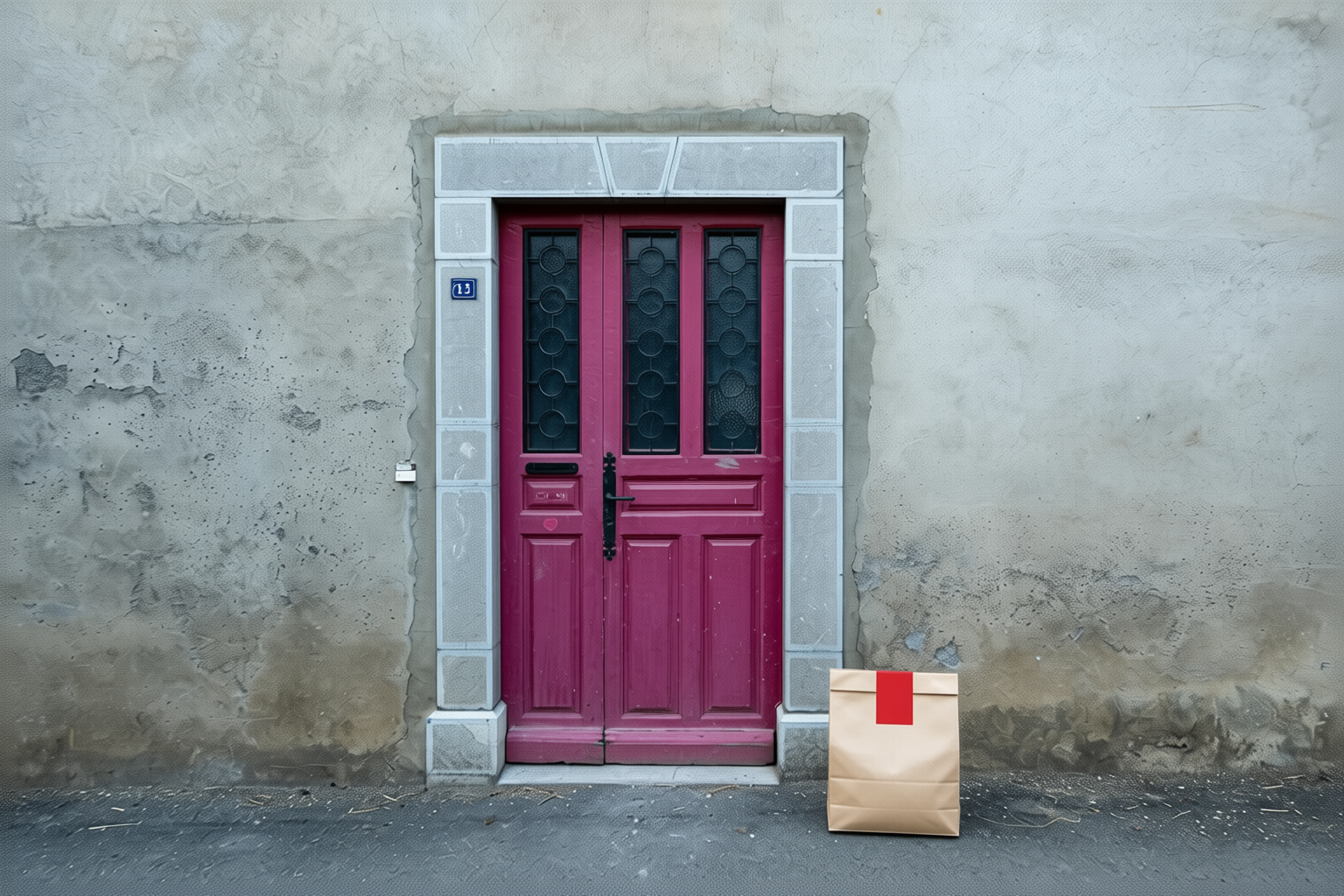 “In this existing photo, add a food delivery paper bag on the ground right in front of the door. The bag should be a small brown paper bag with a solid plain red sticker on the top keeping it closed. Preserve existing photo style and lighting as much as possible.”