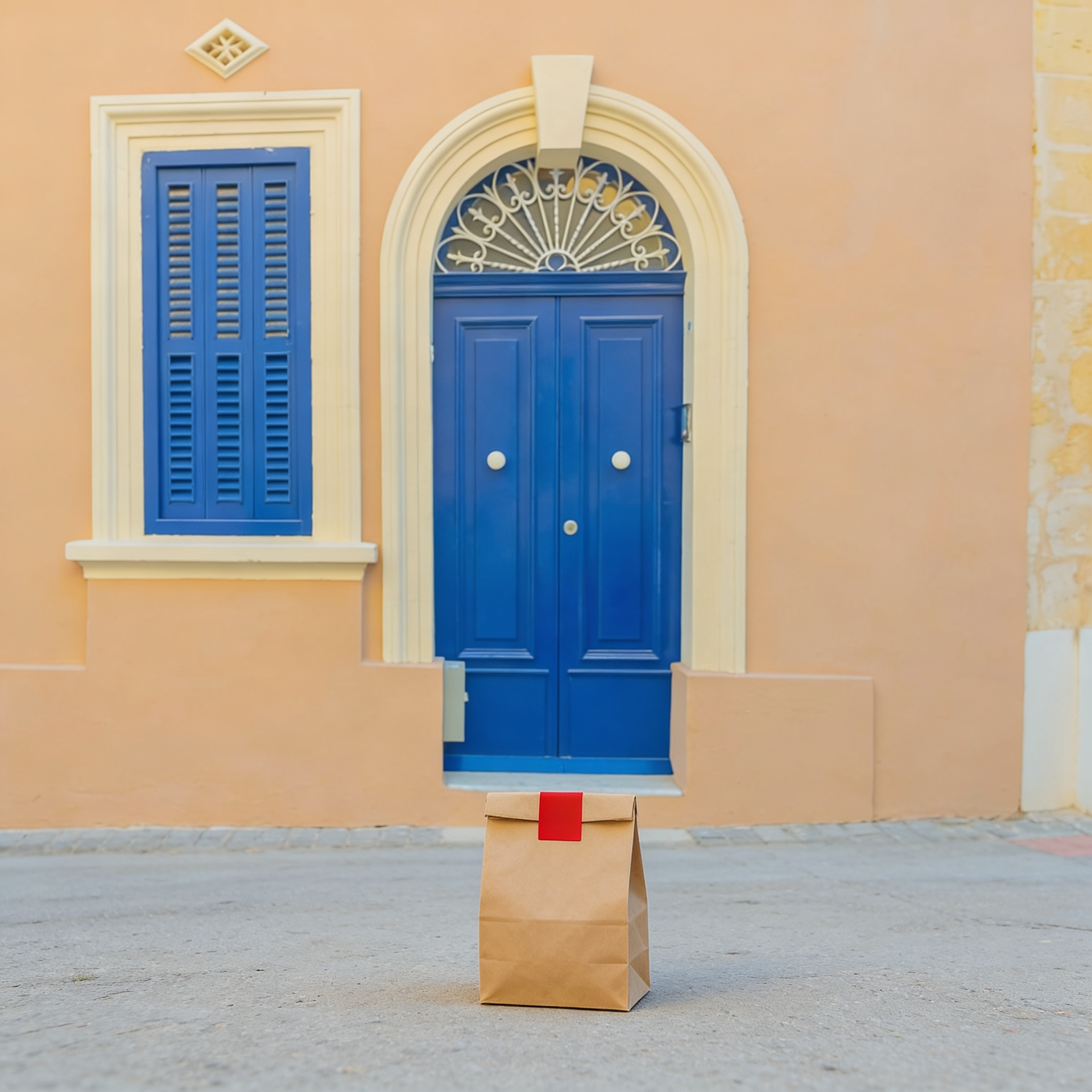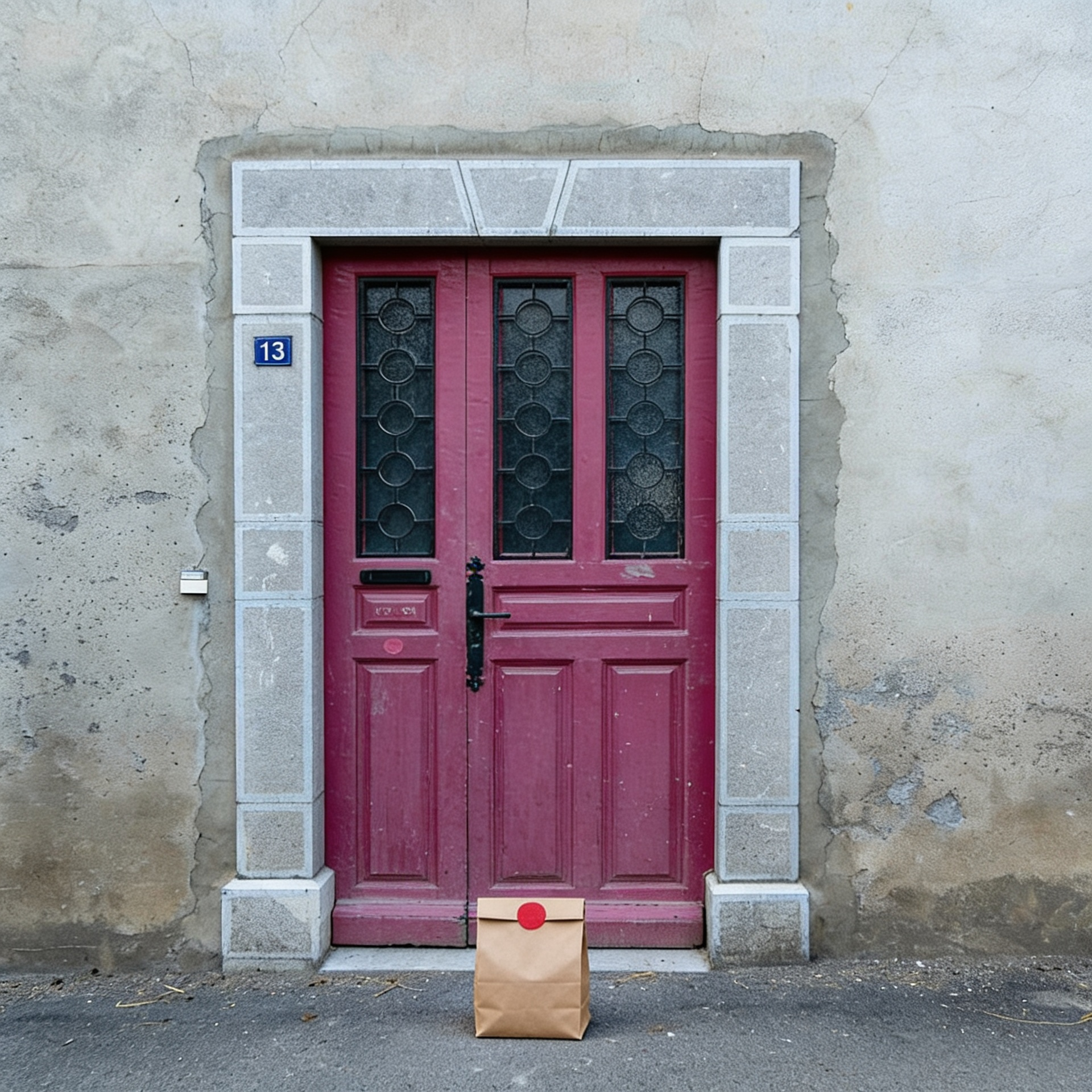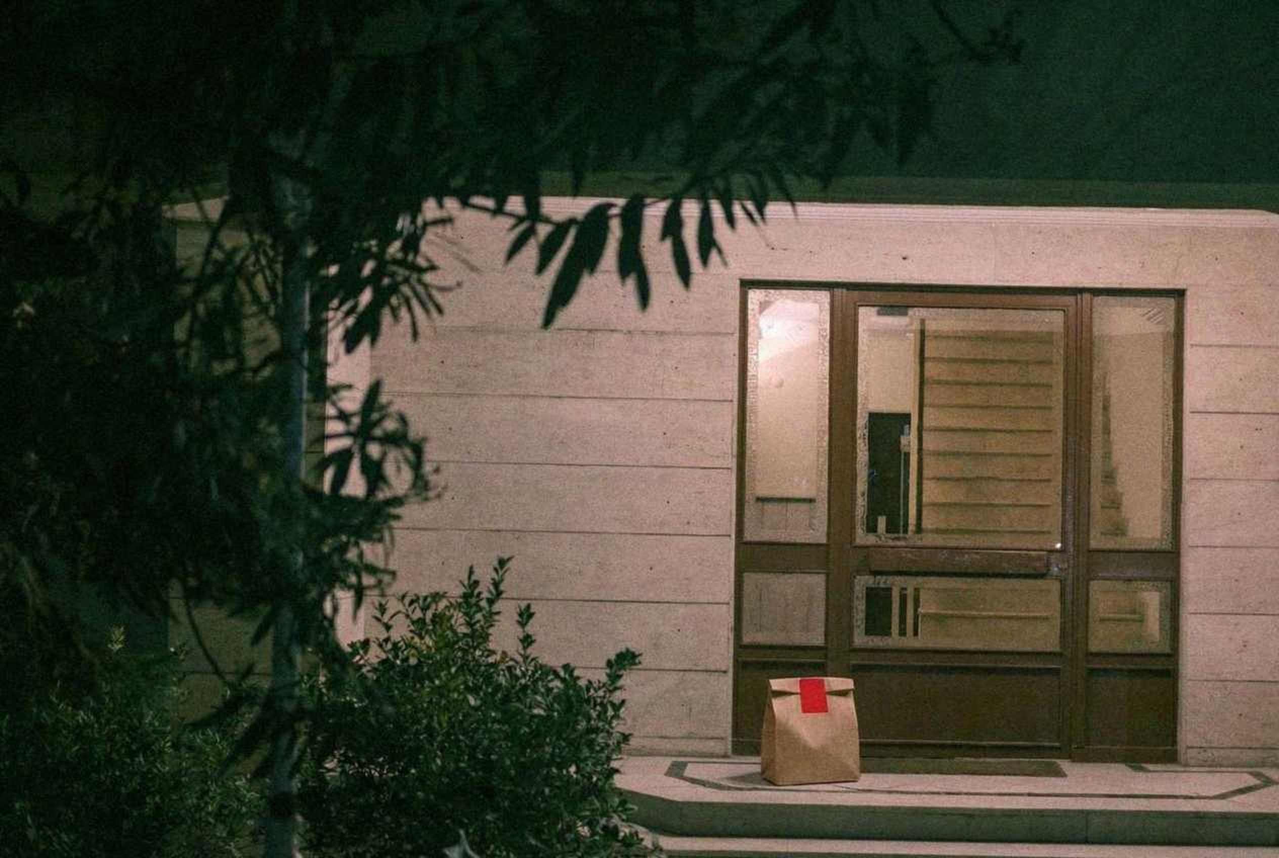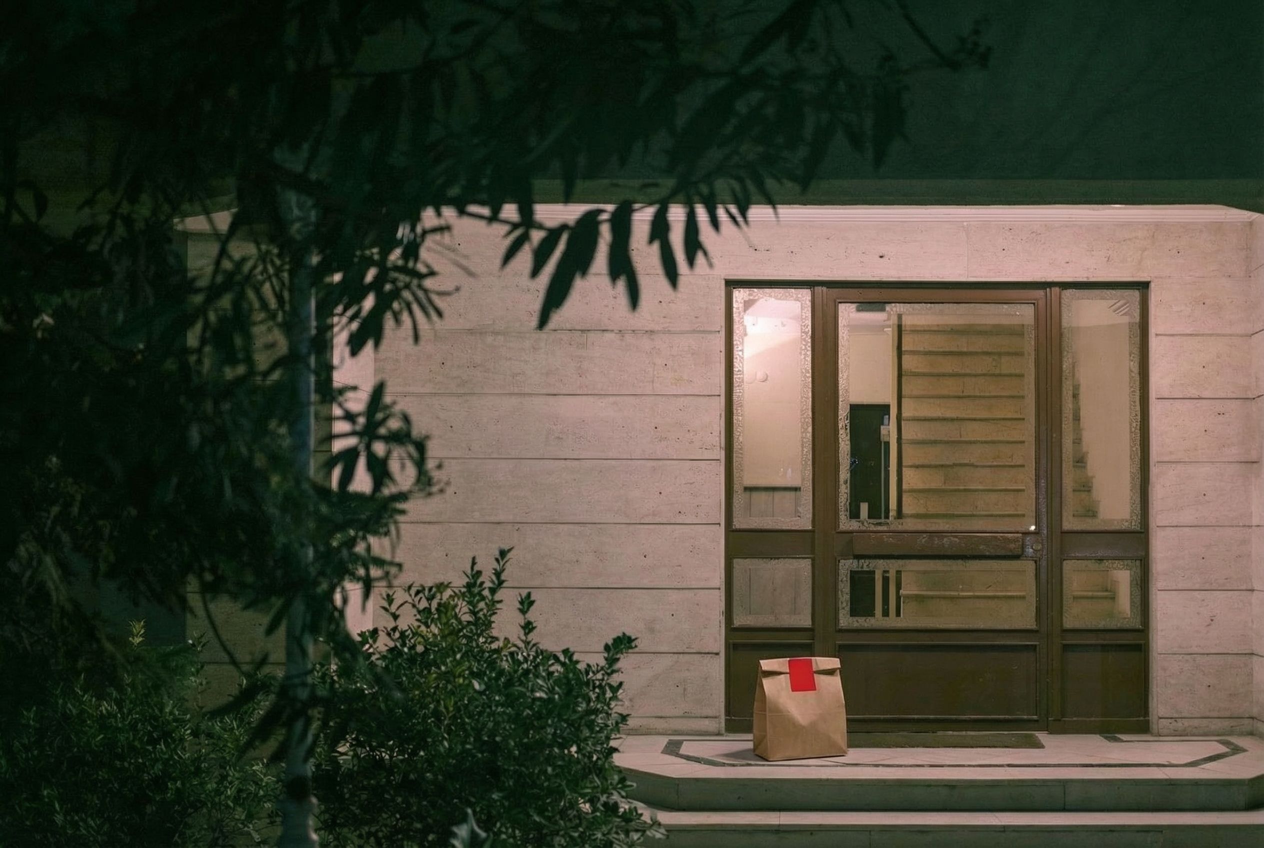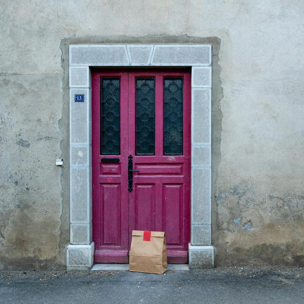 “In this existing photo, add a food delivery paper bag on the ground right in front of the door. The bag should be a small brown paper bag with a solid plain red sticker on the top keeping it closed. Preserve existing photo style and lighting as much as possible.”