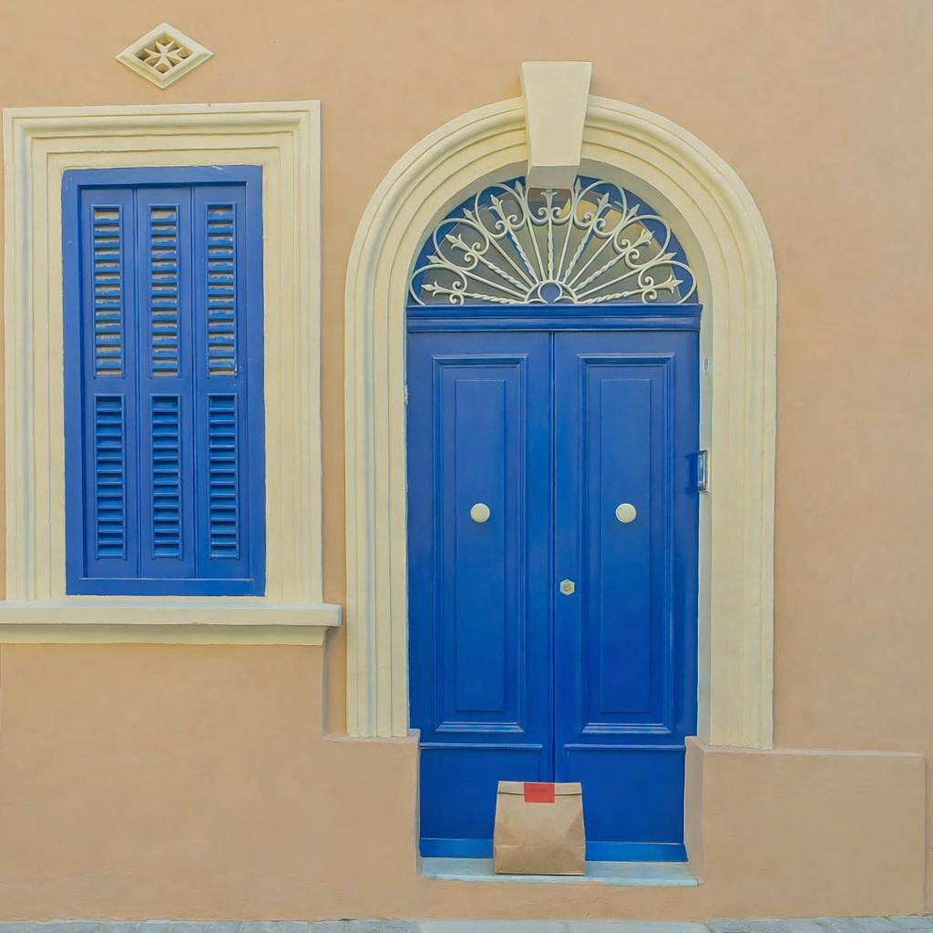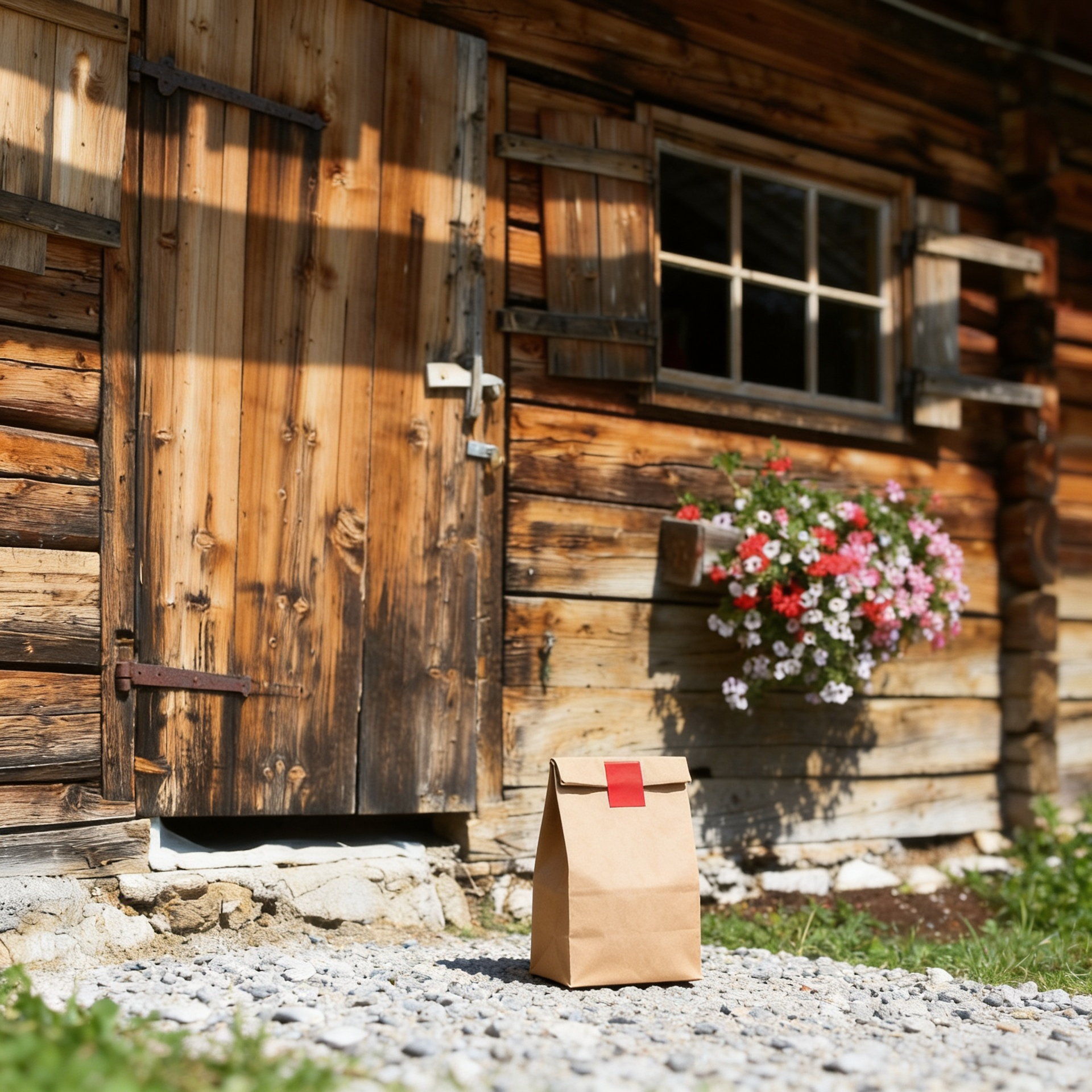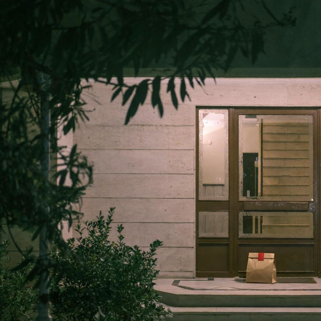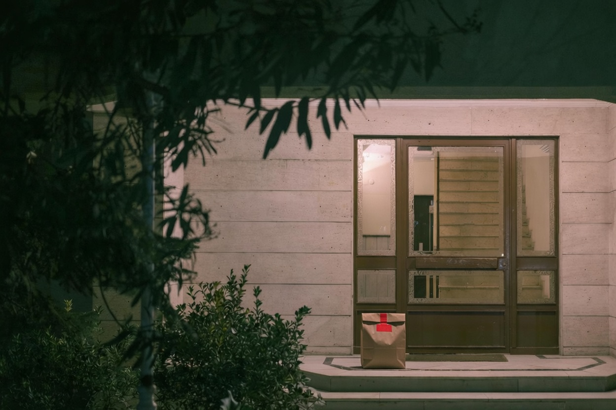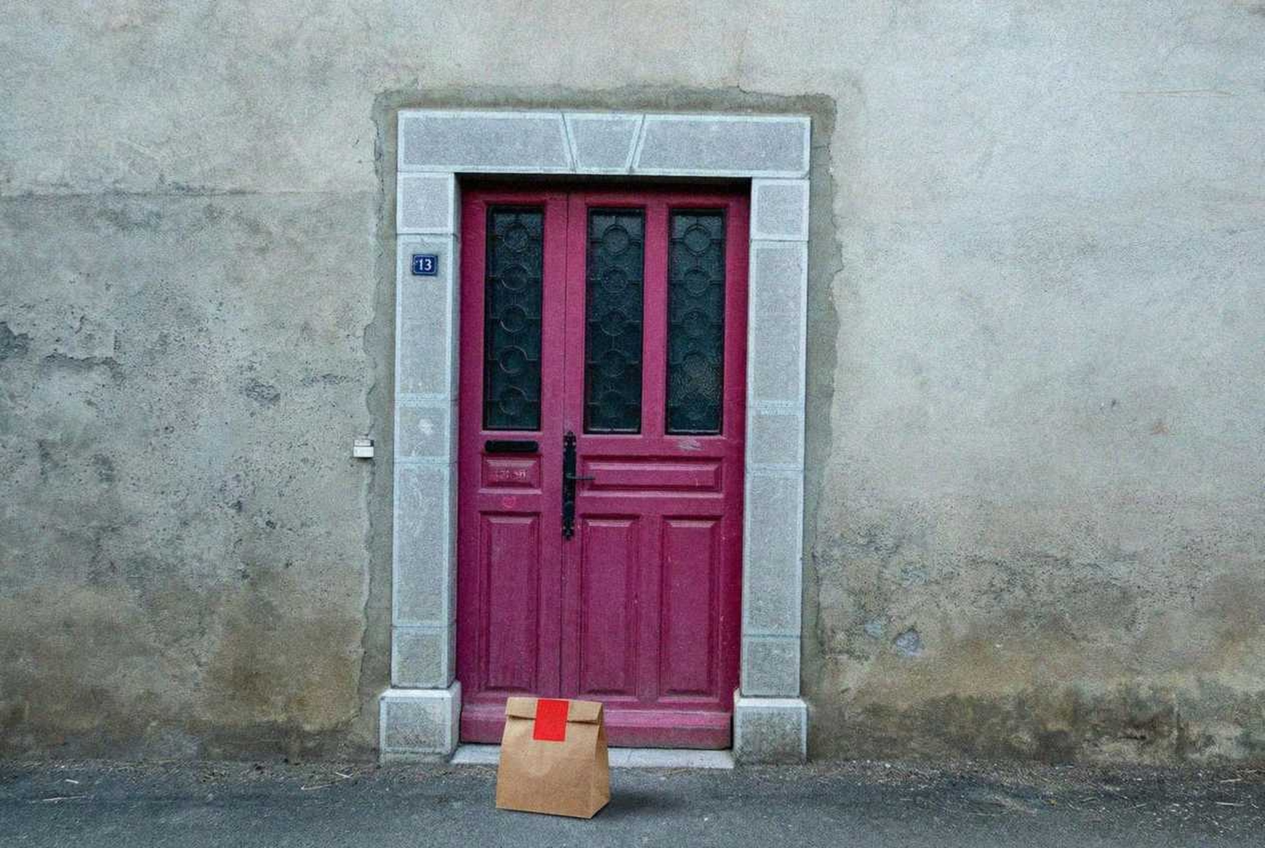 “In this existing photo, add a food delivery paper bag on the ground right in front of the door. The bag should be a small brown paper bag with a solid plain red sticker on the top keeping it closed. Preserve existing photo style and lighting as much as possible.”