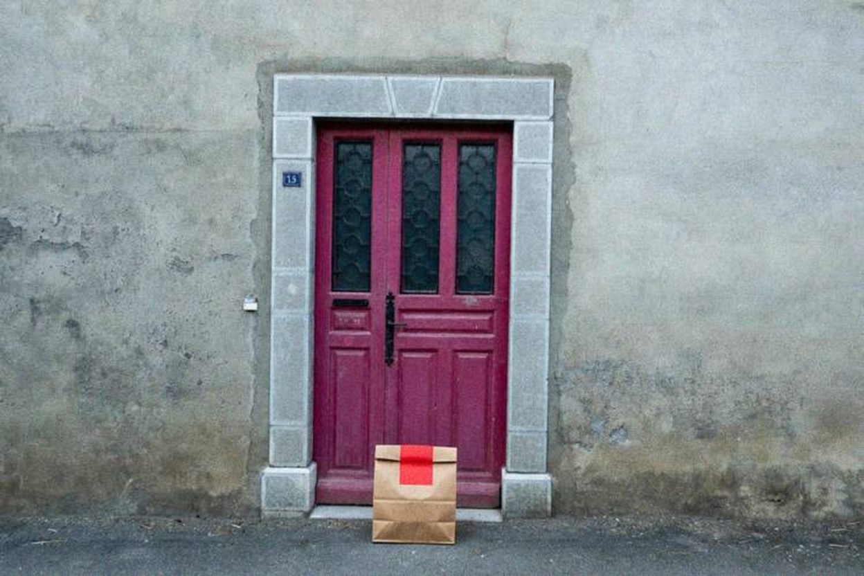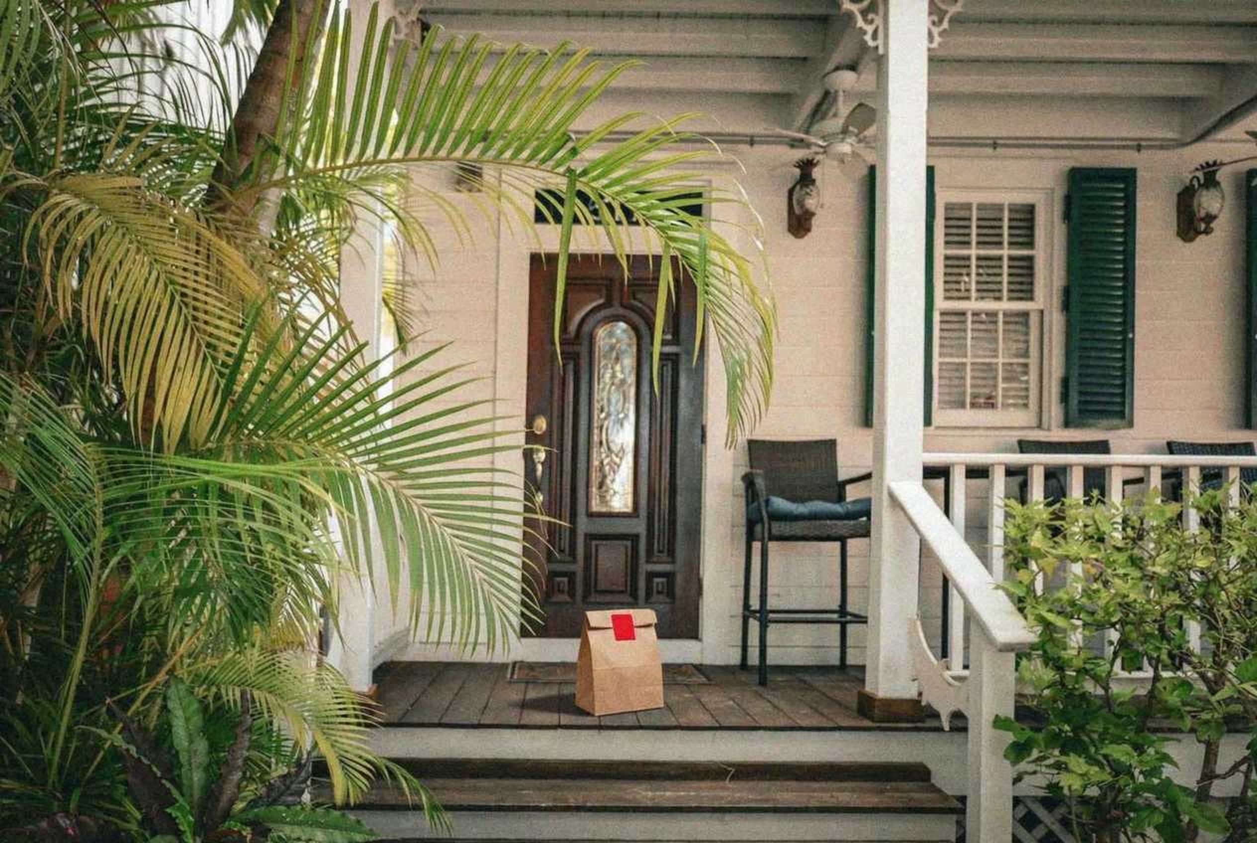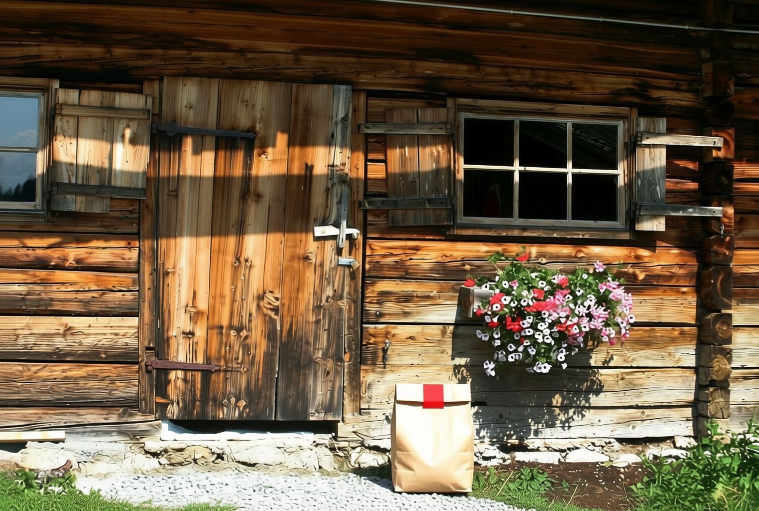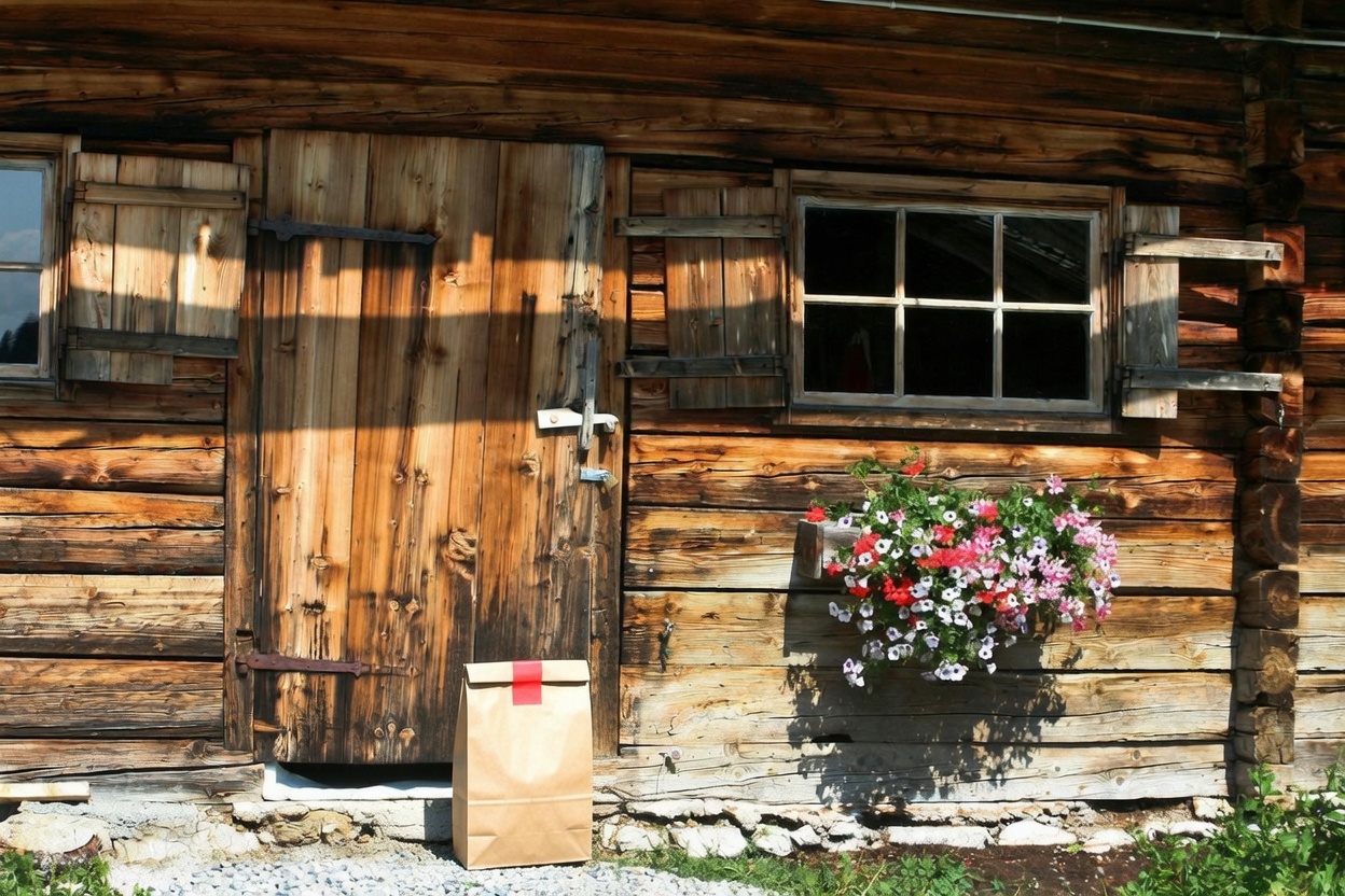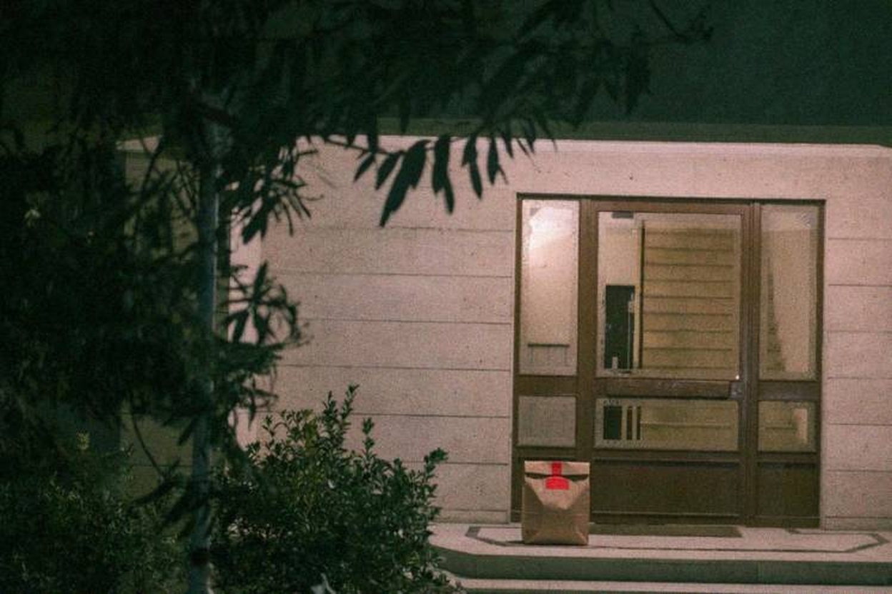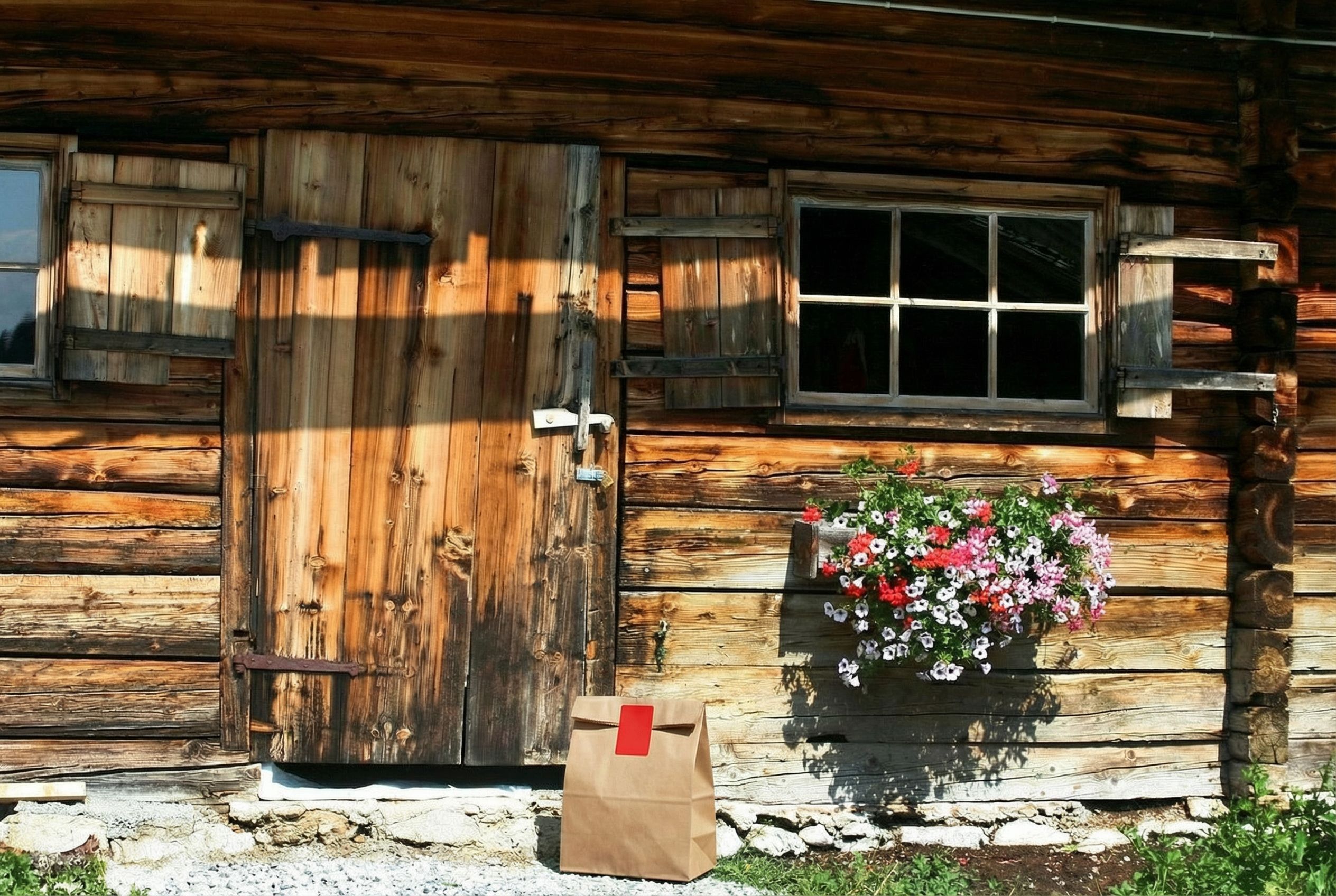 “In this existing photo, add a food delivery paper bag on the ground right in front of the door. The bag should be a small brown paper bag with a solid plain red sticker on the top keeping it closed. Preserve existing photo style and lighting as much as possible.”