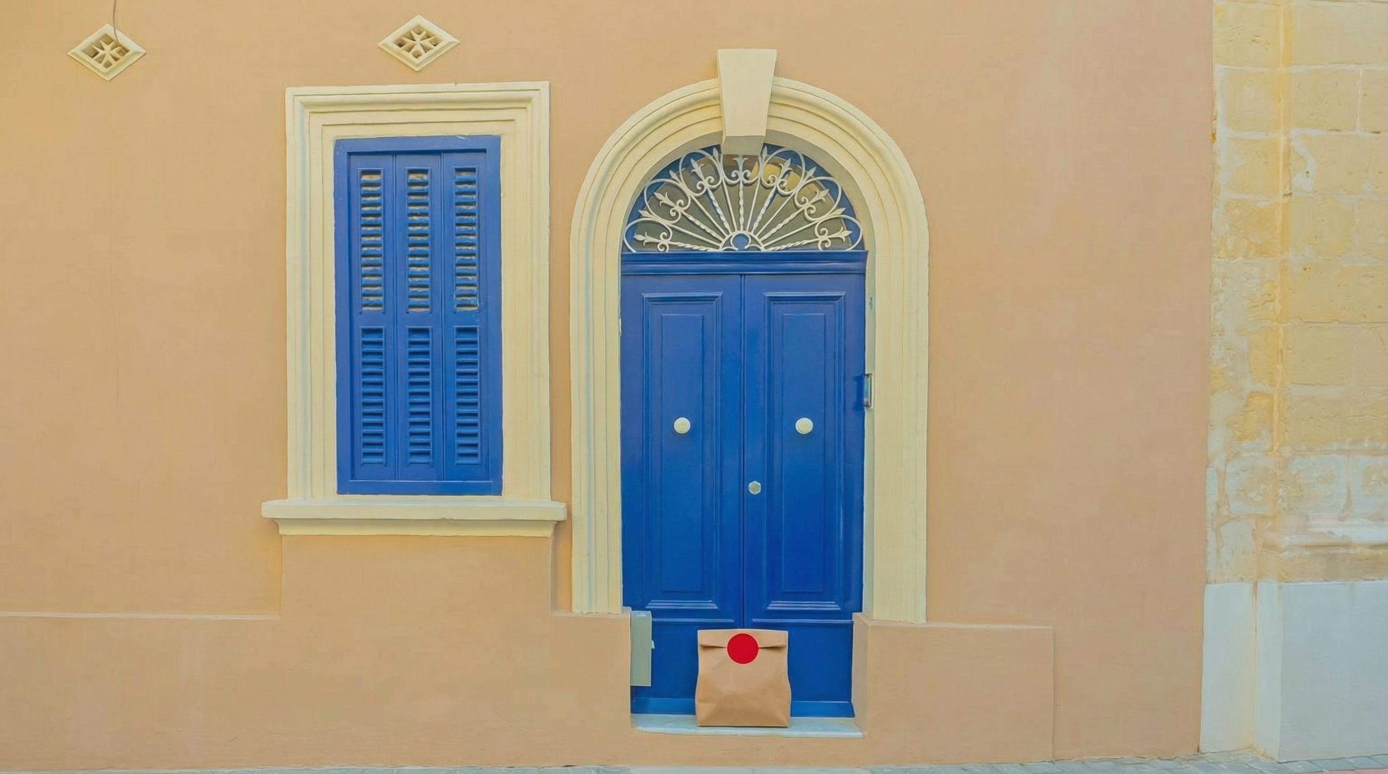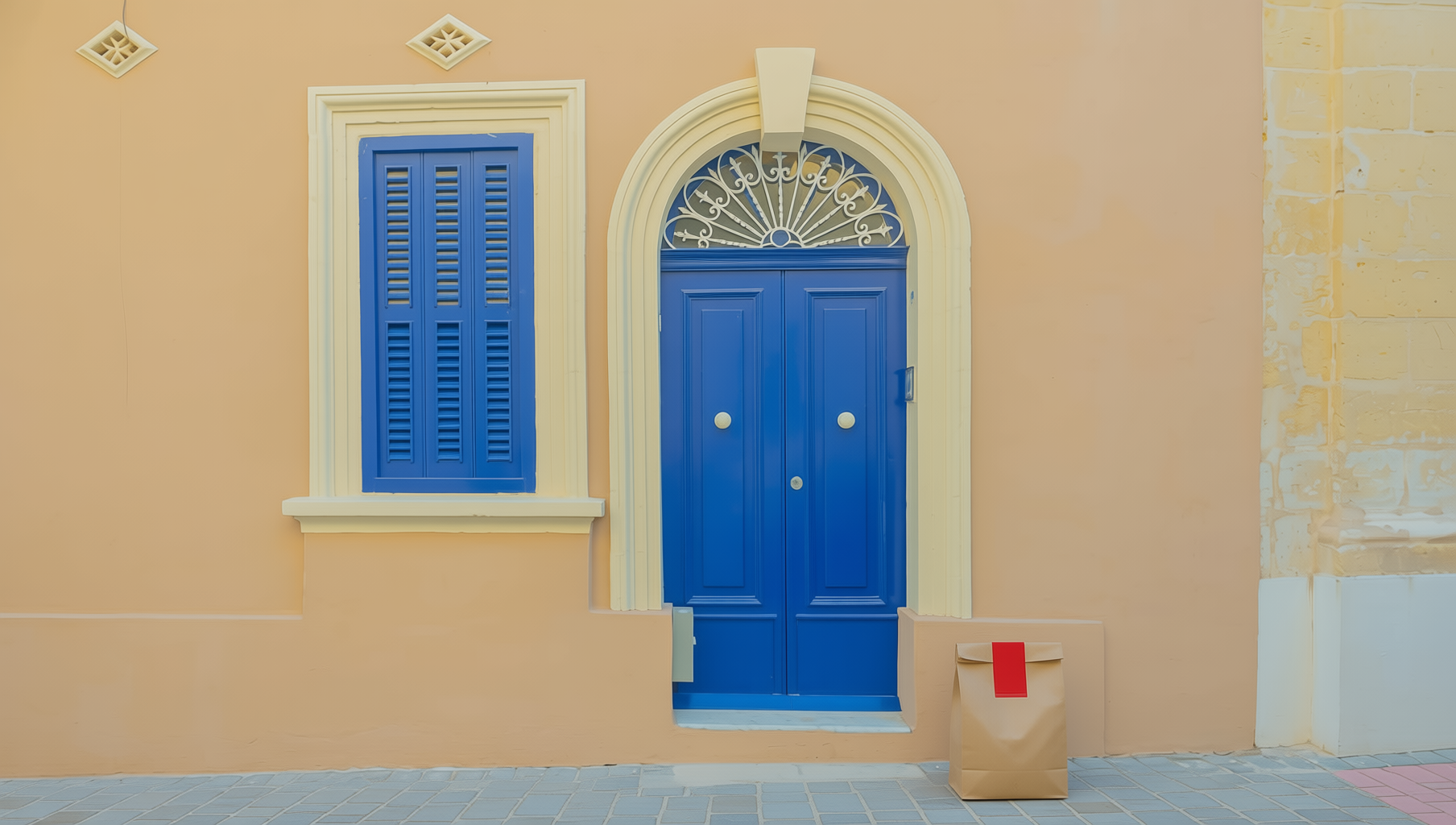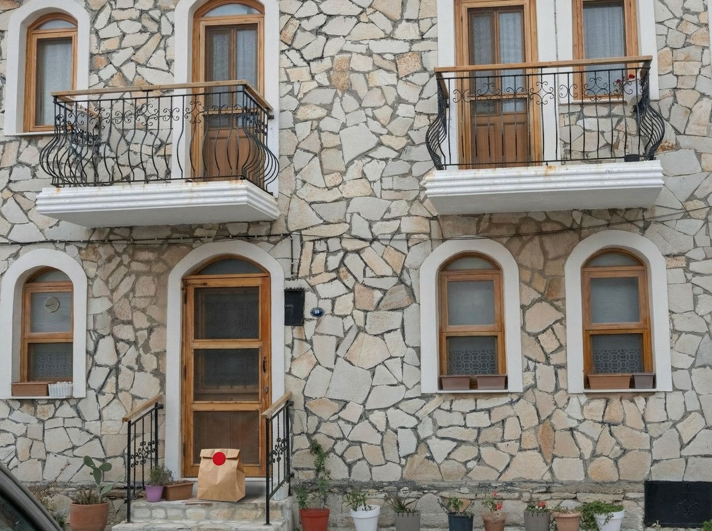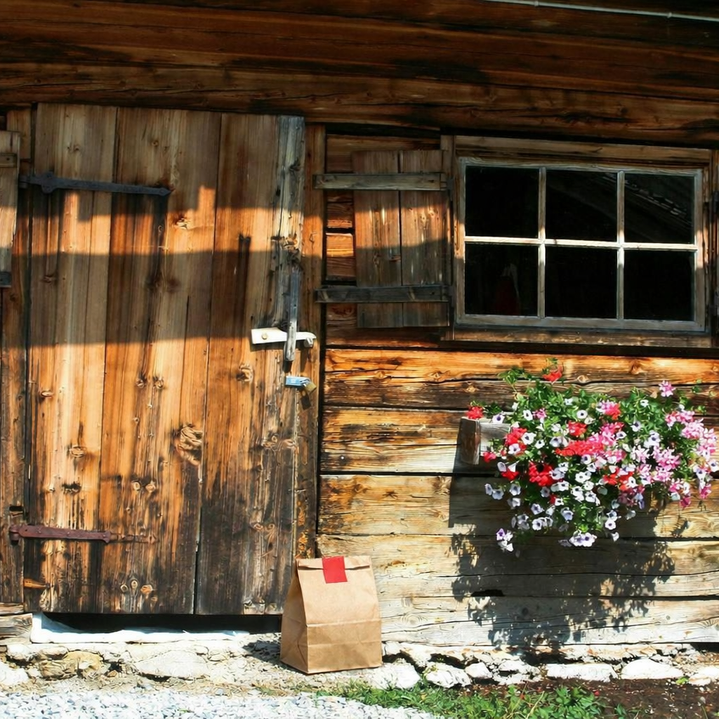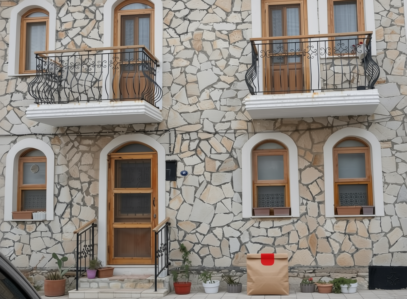 “In this existing photo, add a food delivery paper bag on the ground right in front of the door. The bag should be a small brown paper bag with a solid plain red sticker on the top keeping it closed. Preserve existing photo style and lighting as much as possible.”