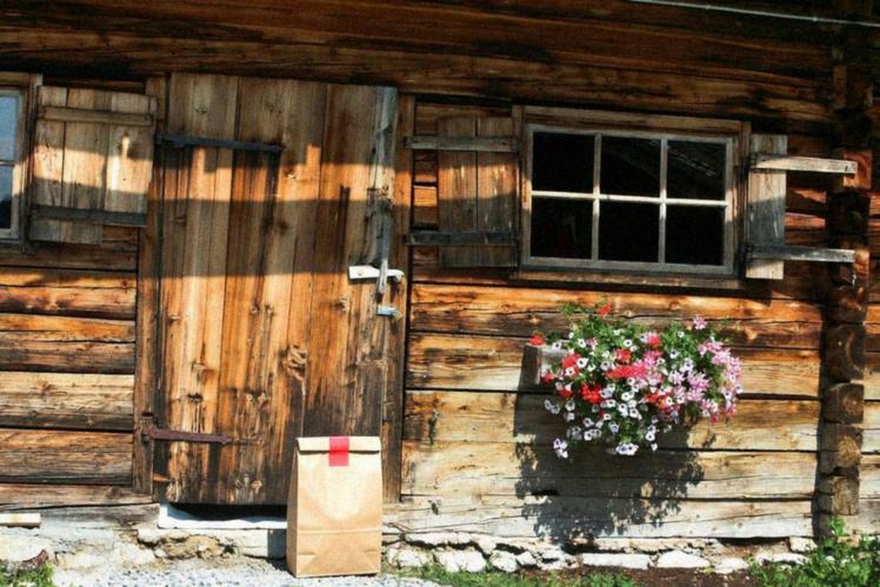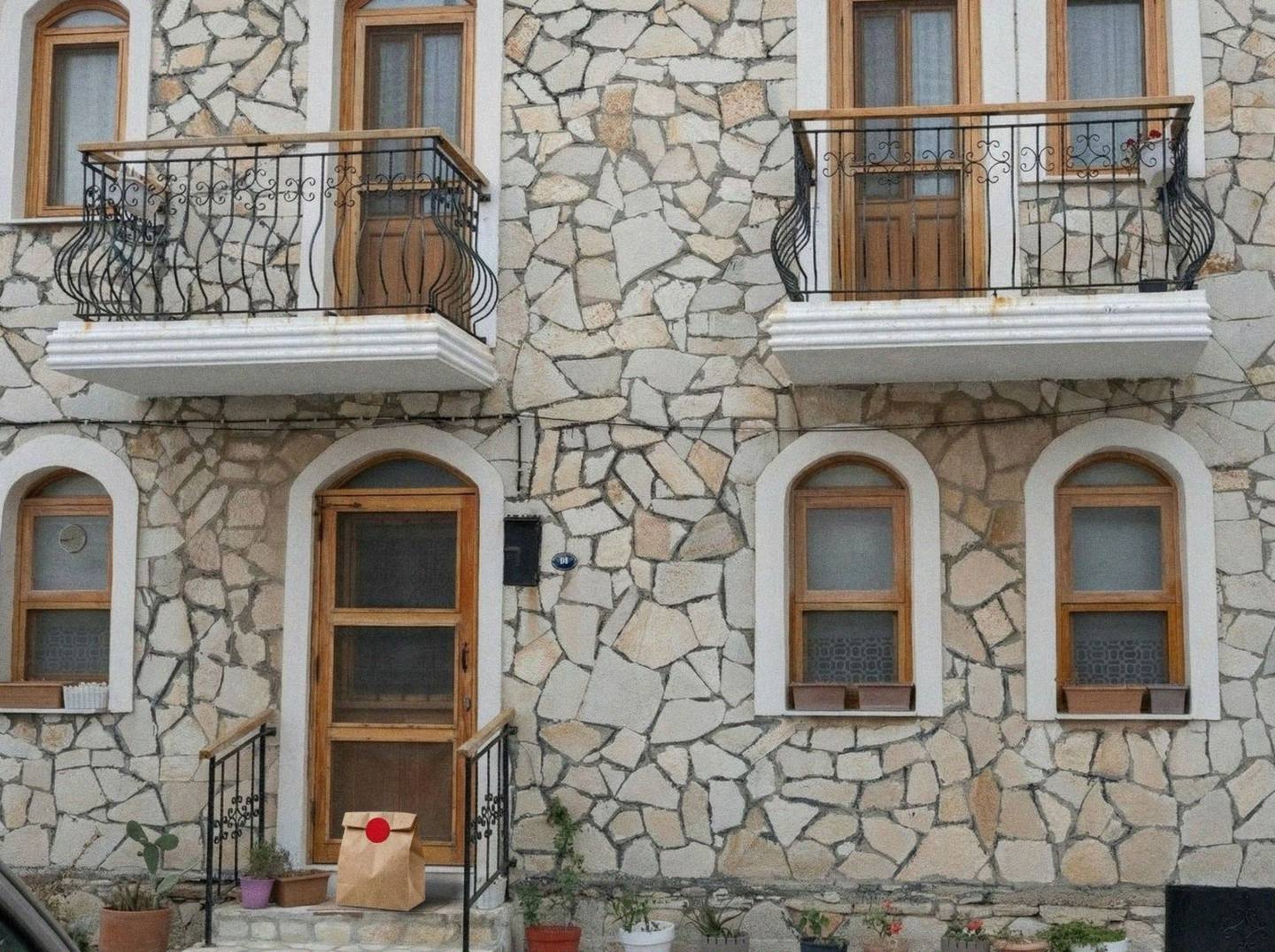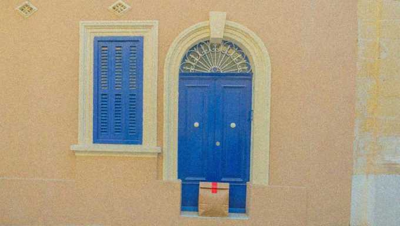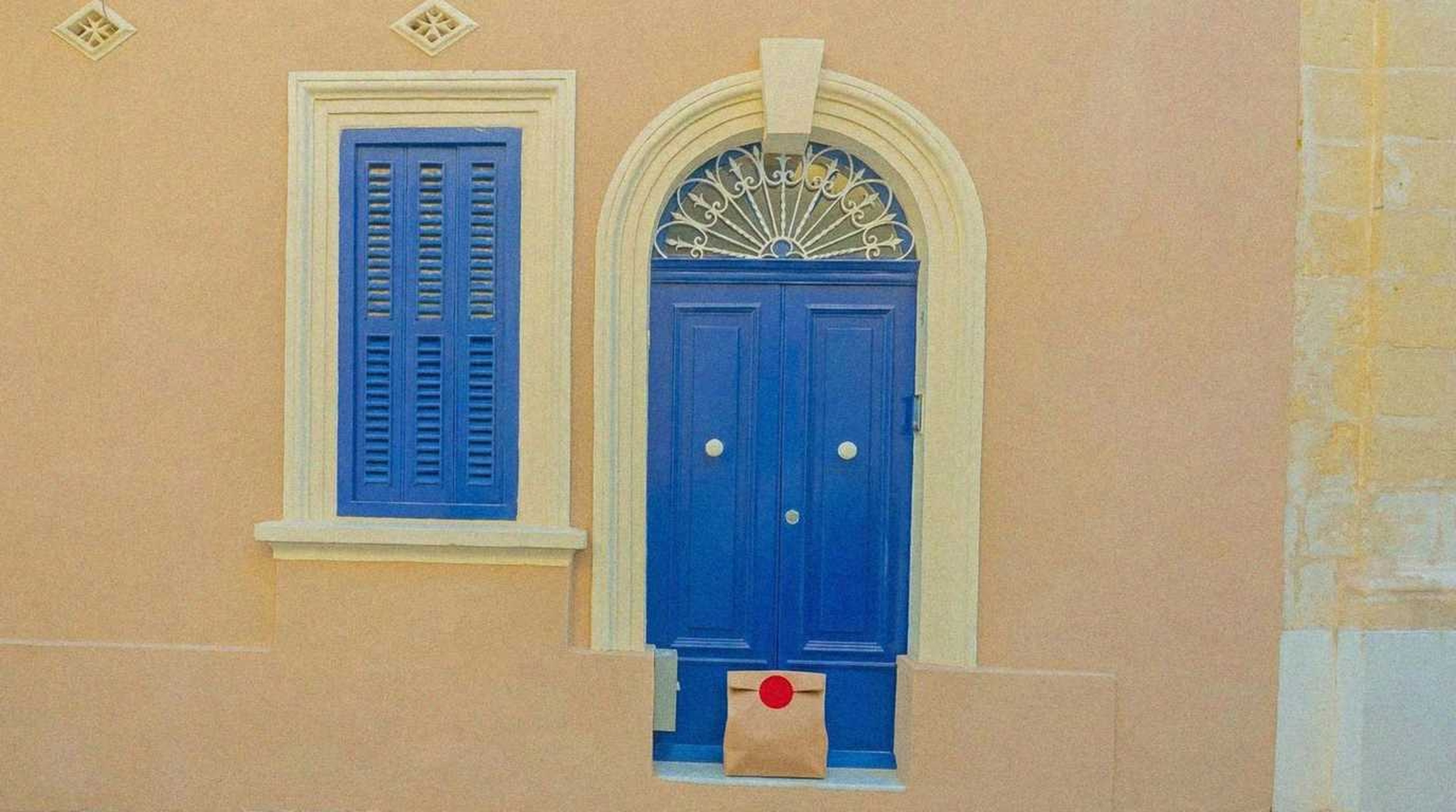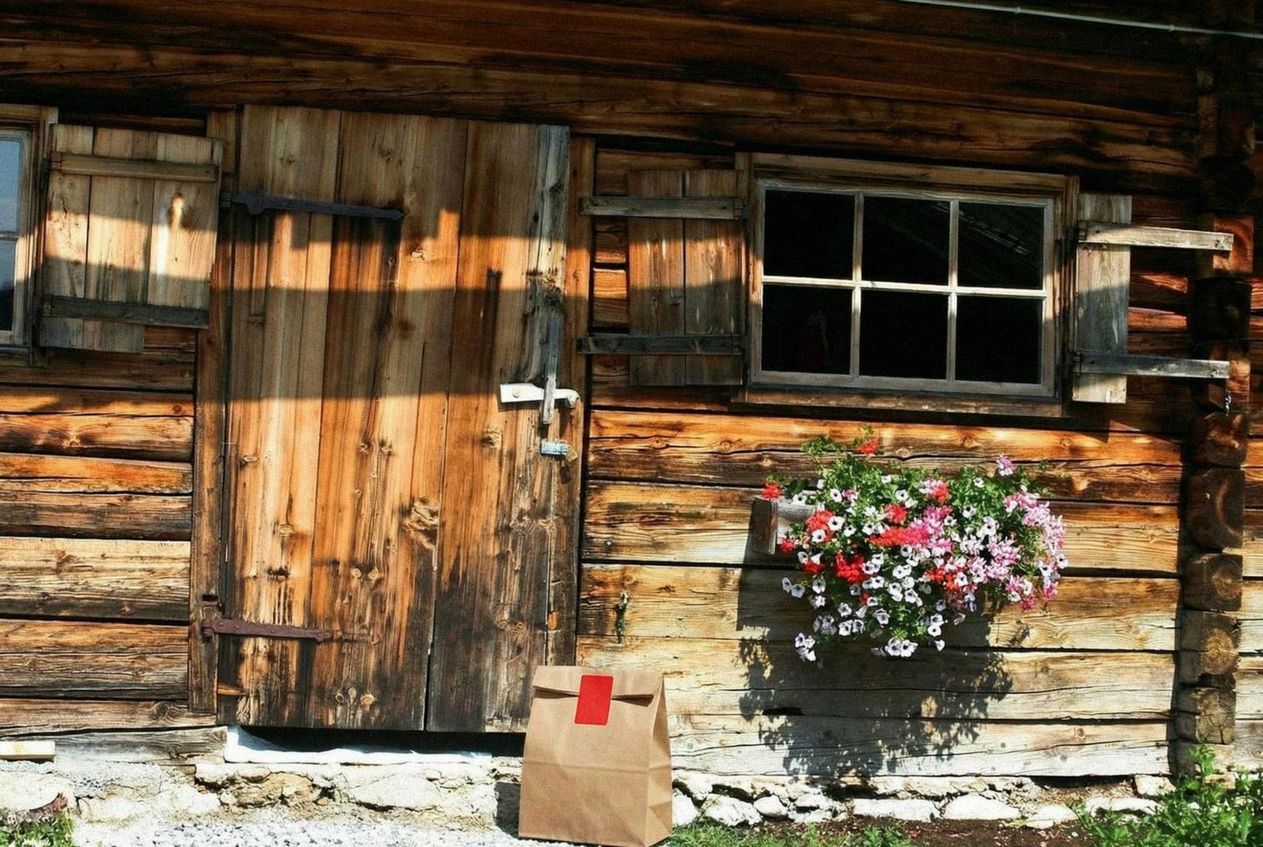 “In this existing photo, add a food delivery paper bag on the ground right in front of the door. The bag should be a small brown paper bag with a solid plain red sticker on the top keeping it closed. Preserve existing photo style and lighting as much as possible.”