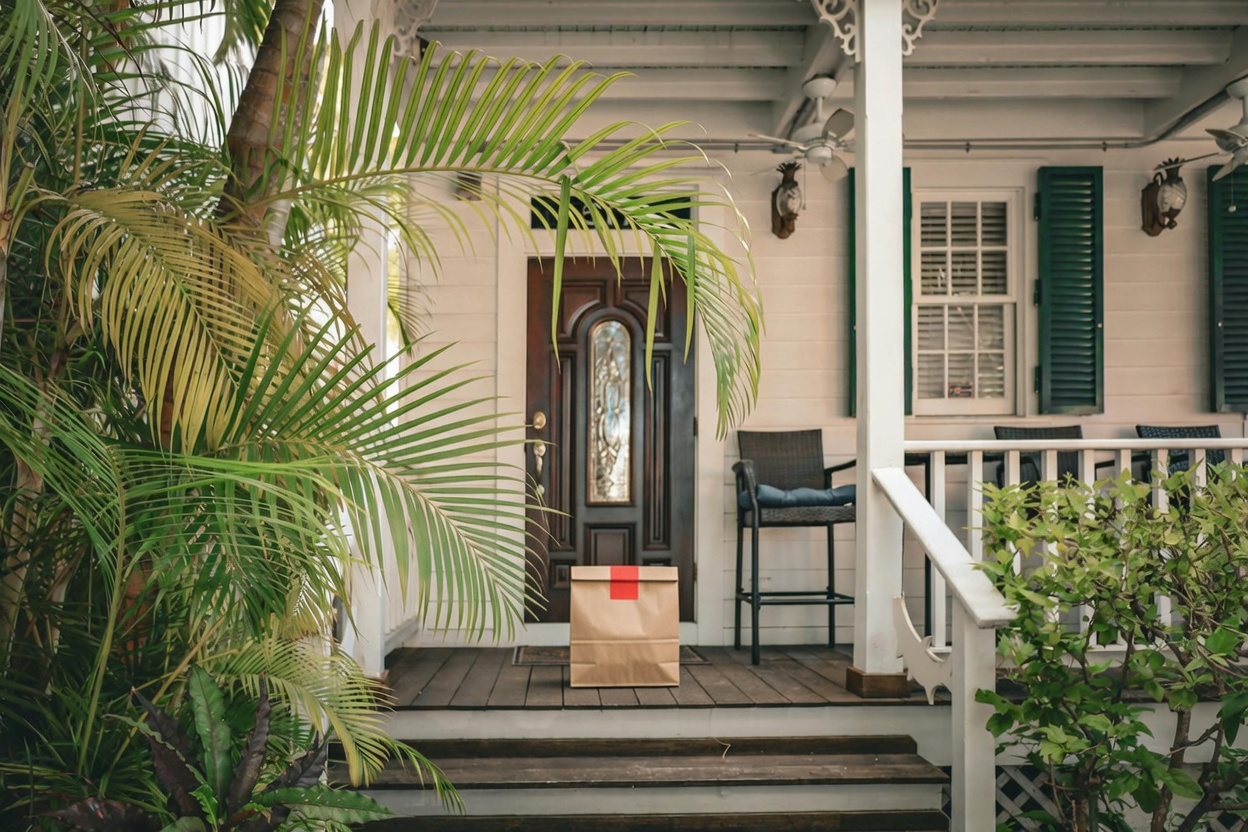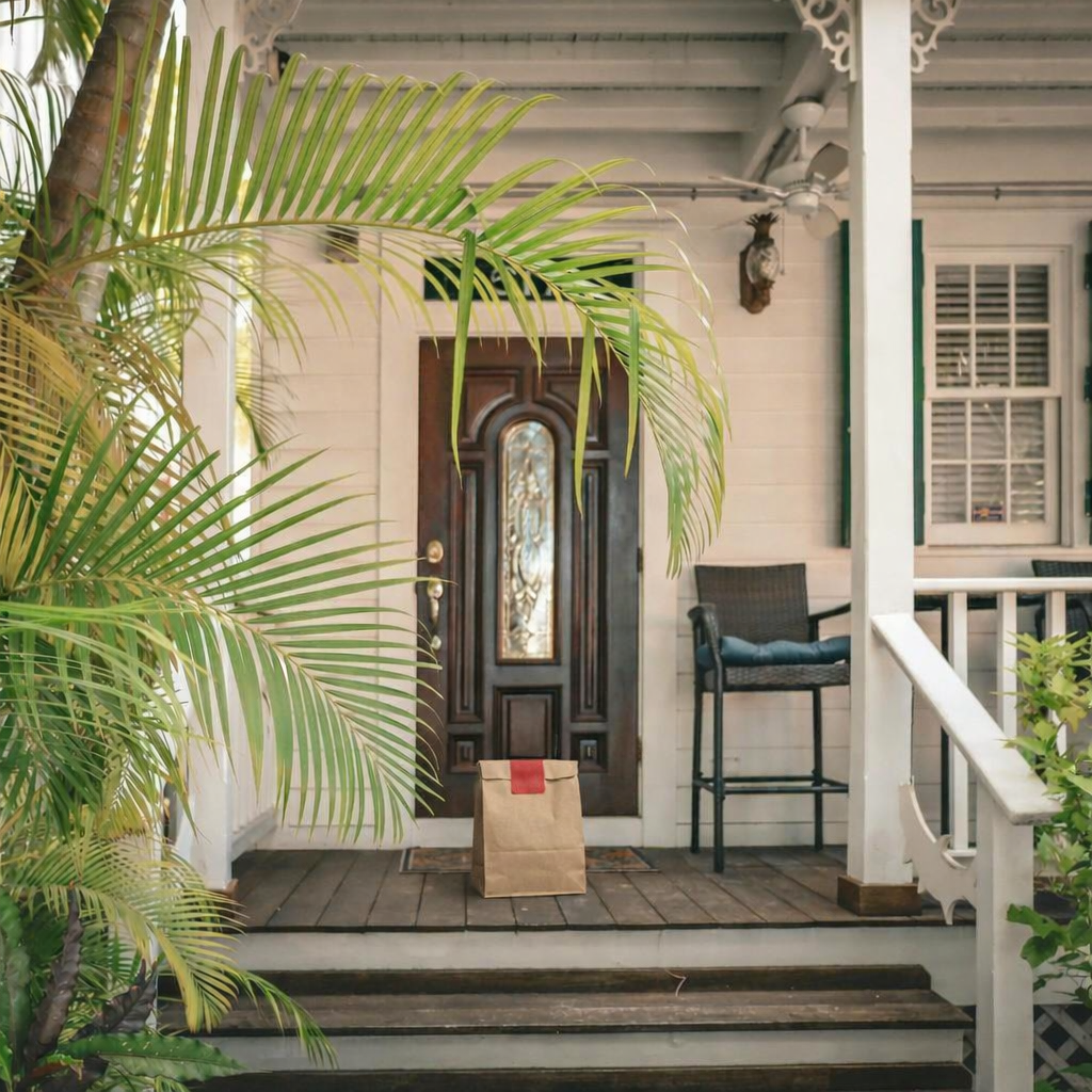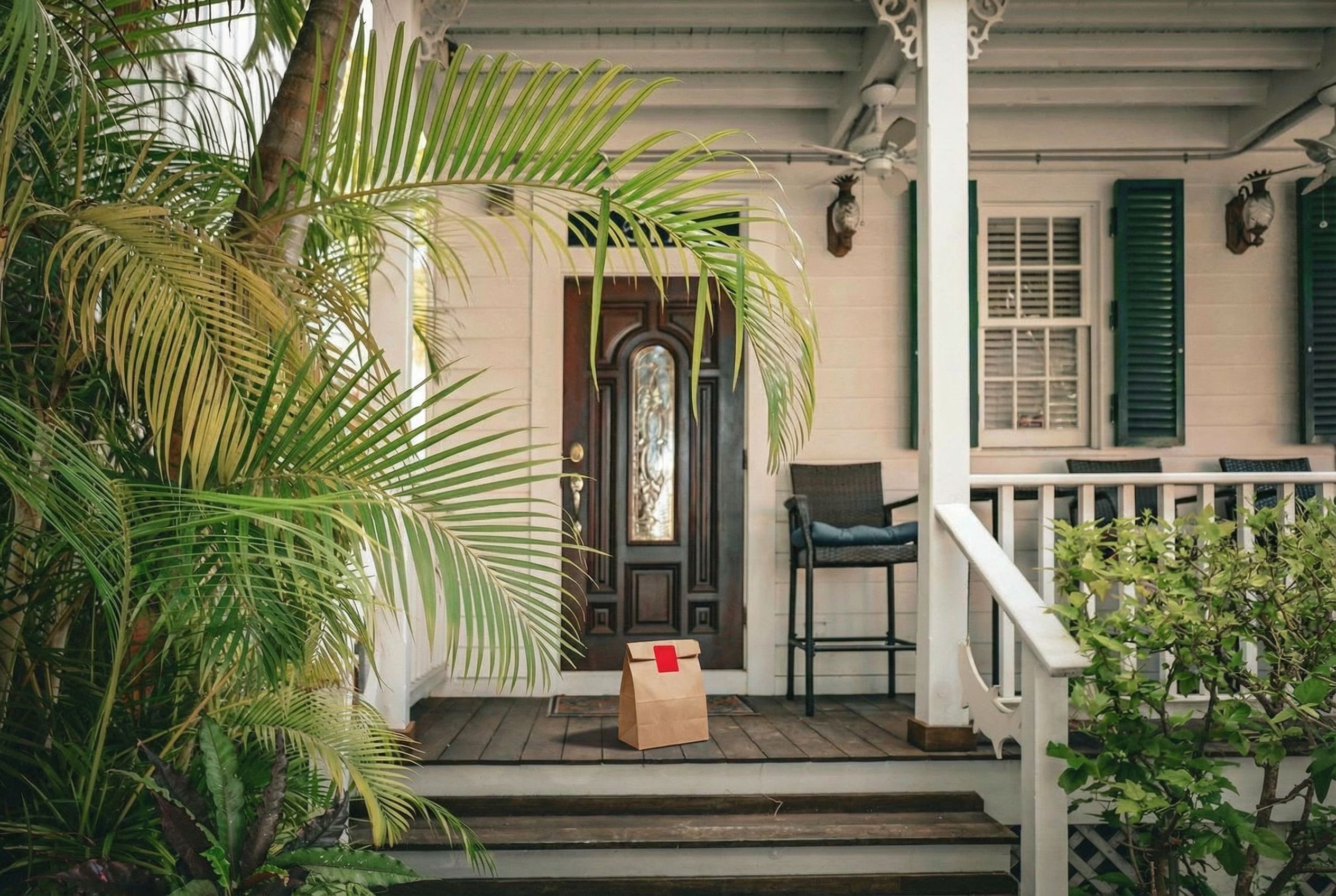Delivery: We took real front door photos and used AI to add a fake delivery bag to the photo.