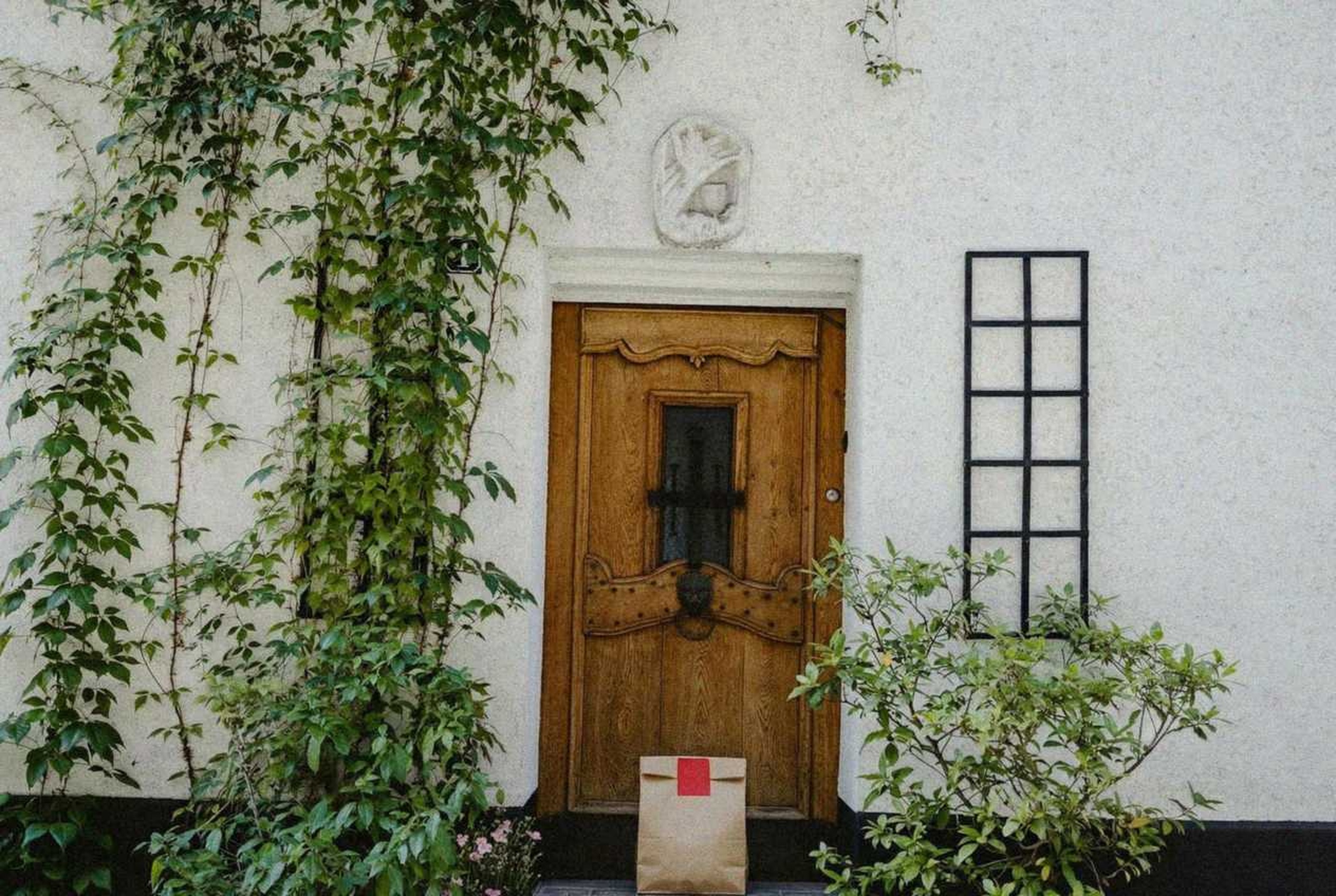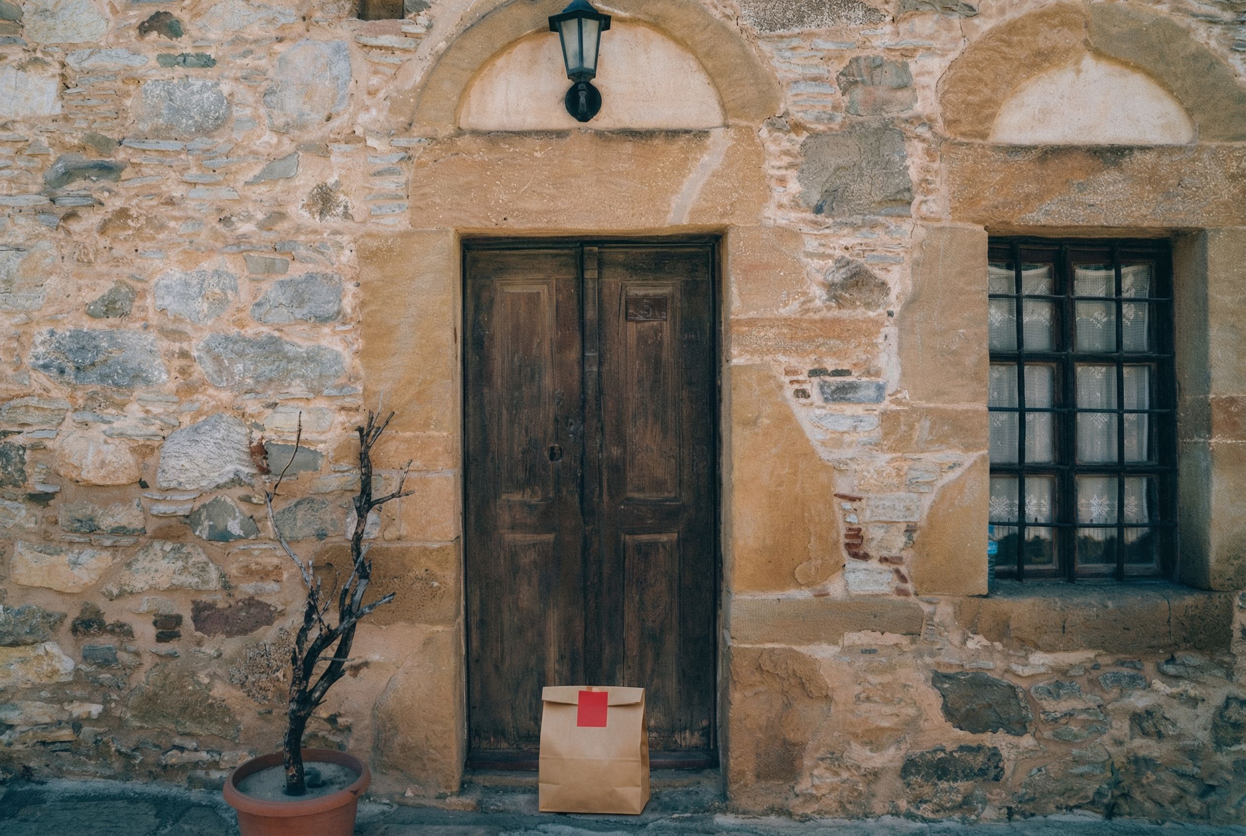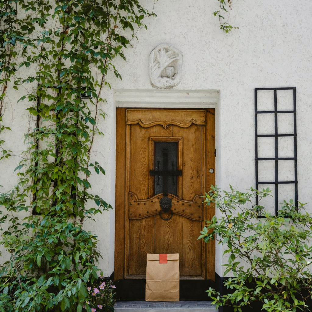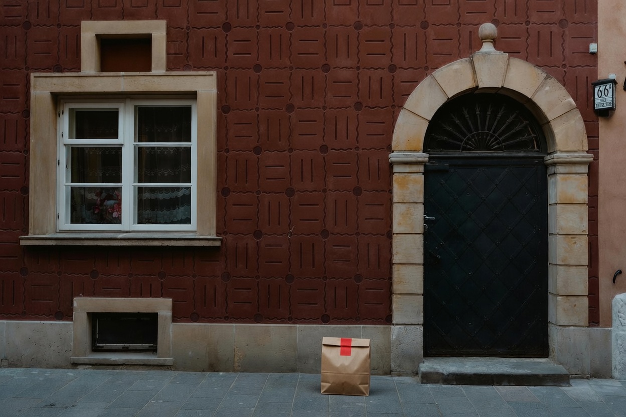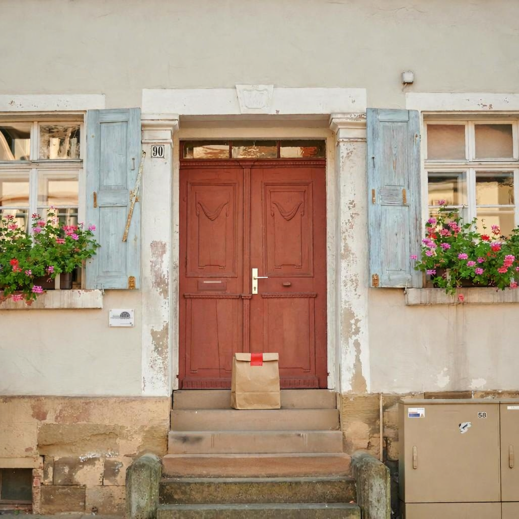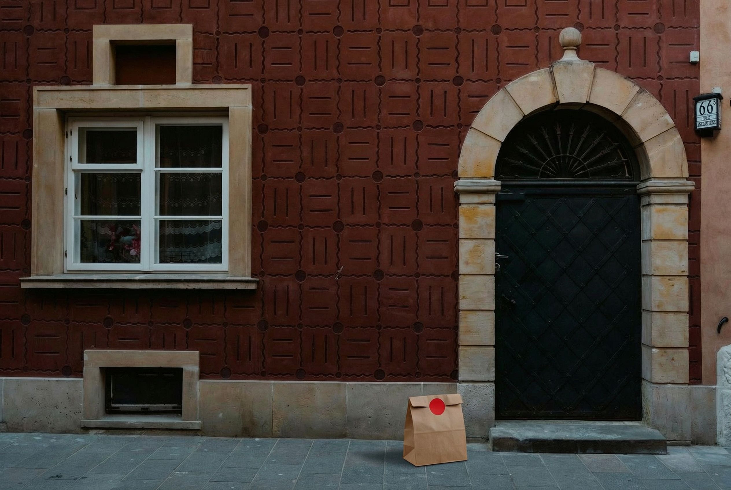 “In this existing photo, add a food delivery paper bag on the ground right in front of the door. The bag should be a small brown paper bag with a solid plain red sticker on the top keeping it closed. Preserve existing photo style and lighting as much as possible.”