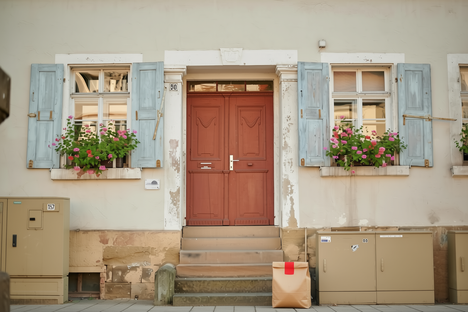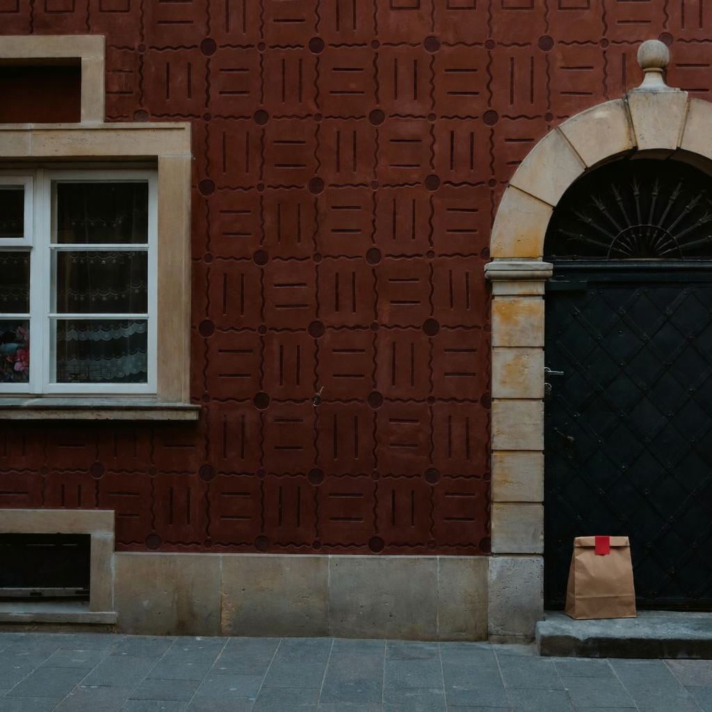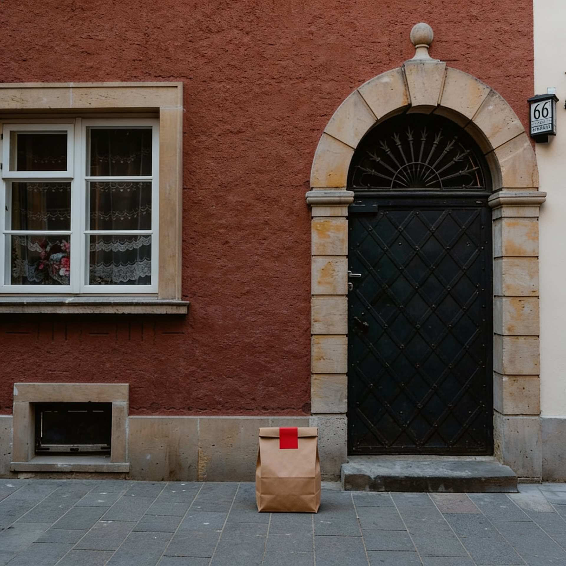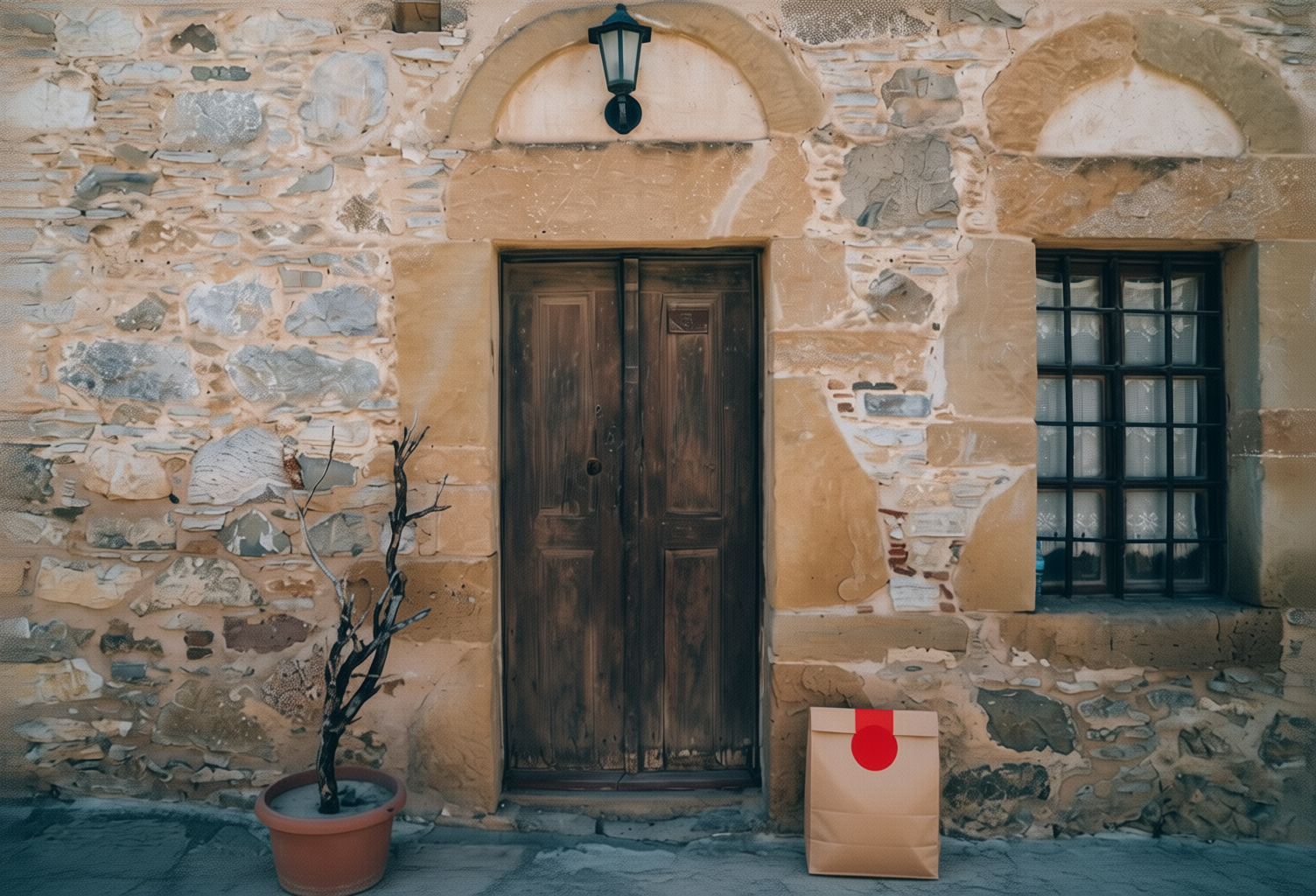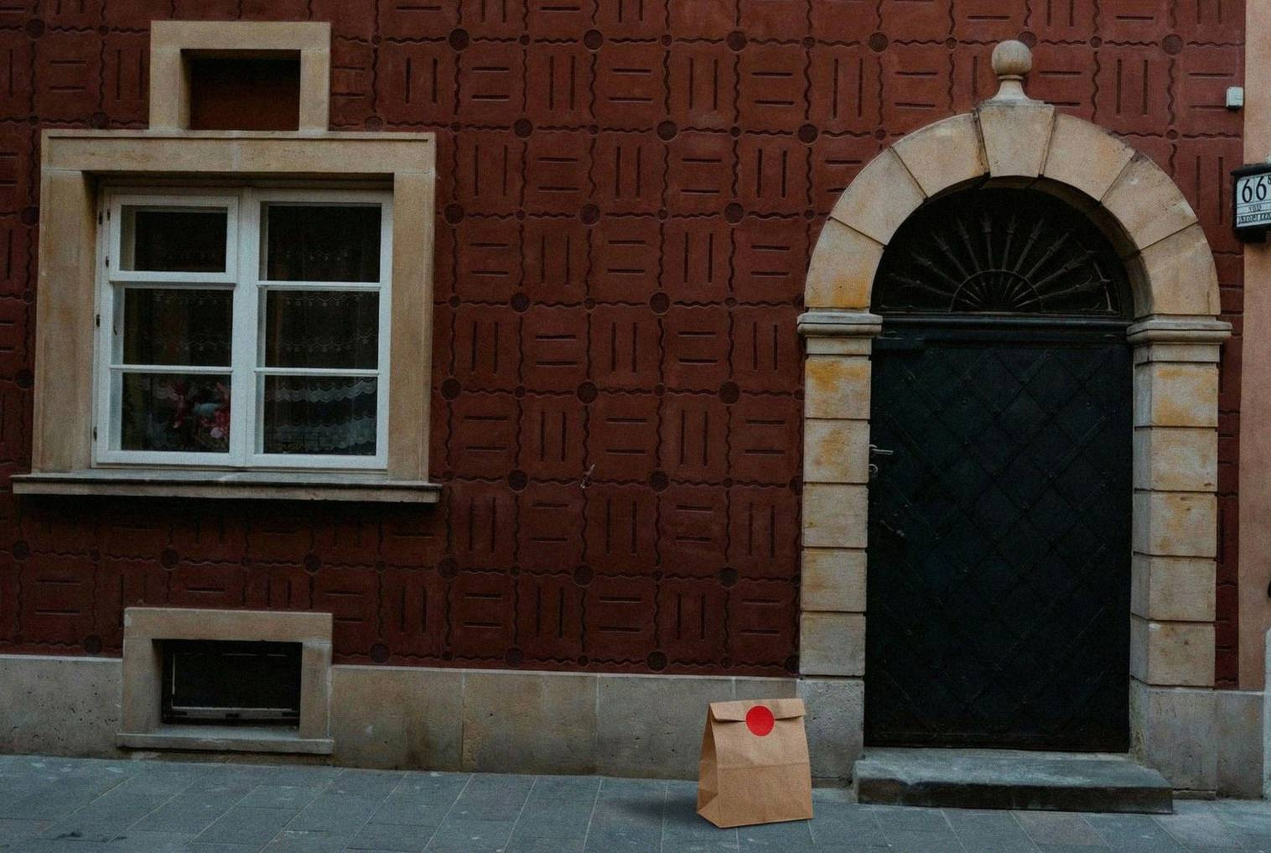 “In this existing photo, add a food delivery paper bag on the ground right in front of the door. The bag should be a small brown paper bag with a solid plain red sticker on the top keeping it closed. Preserve existing photo style and lighting as much as possible.”