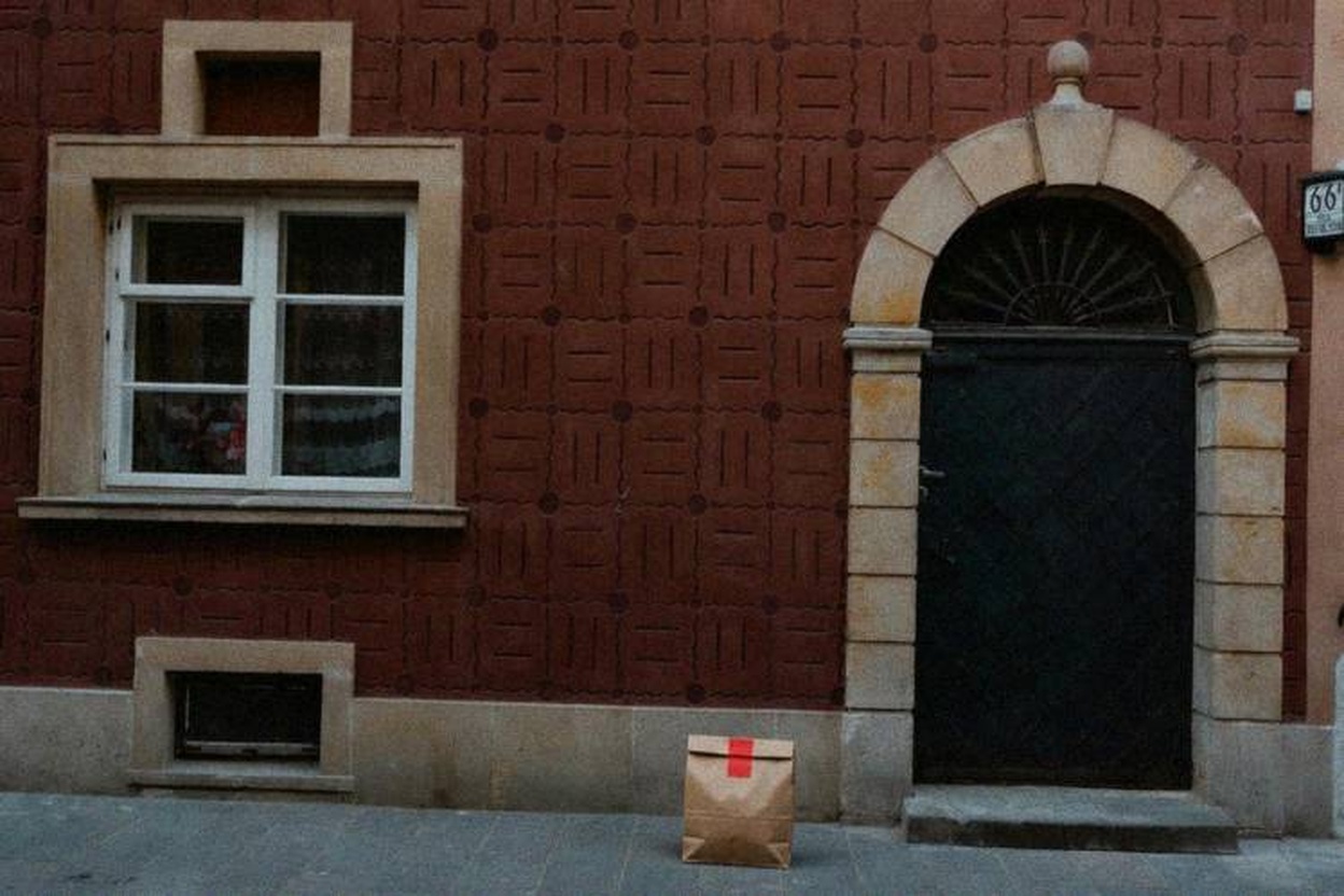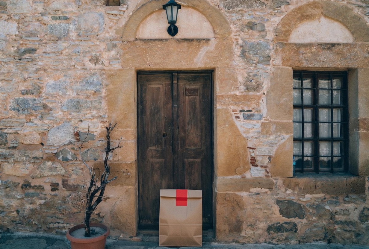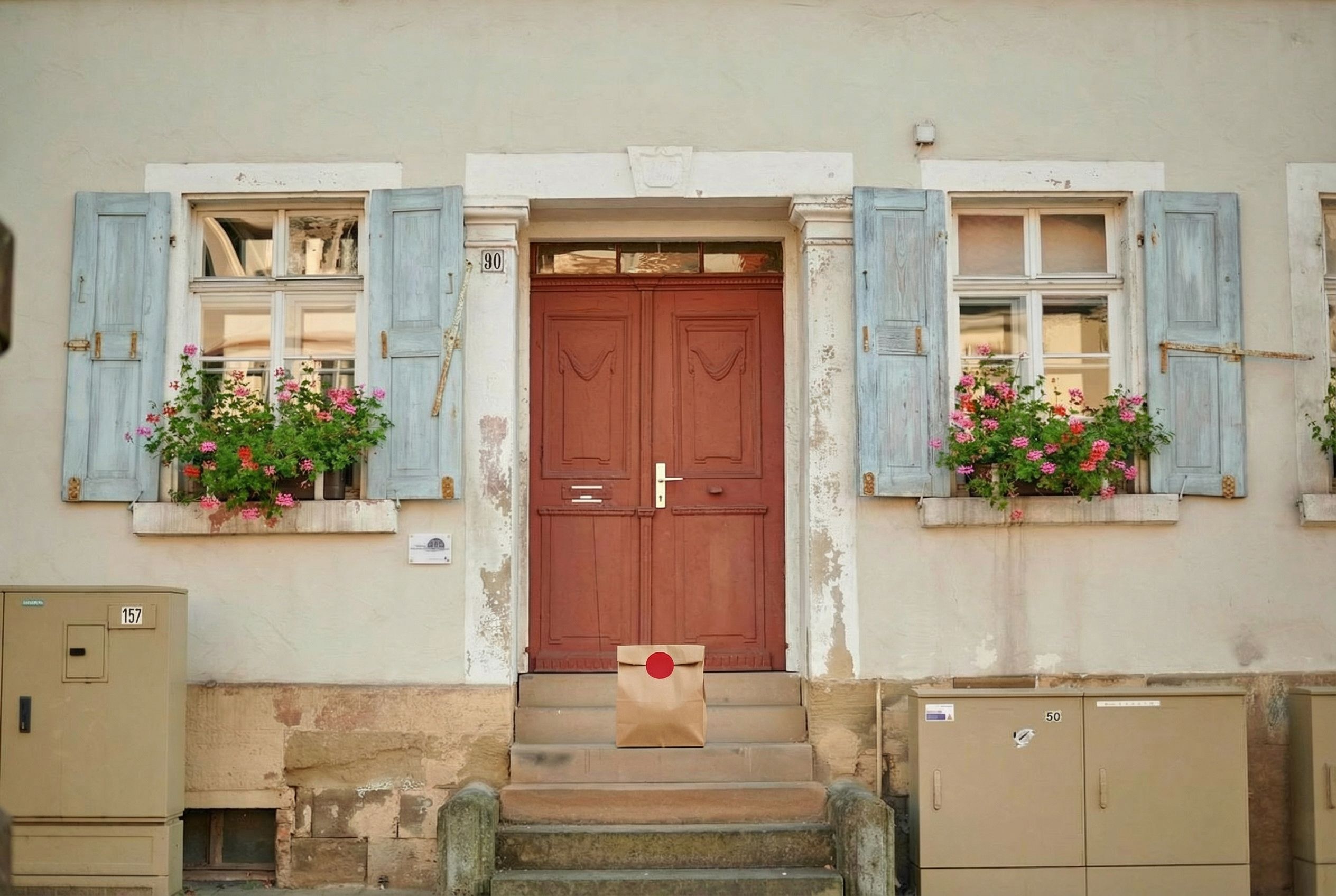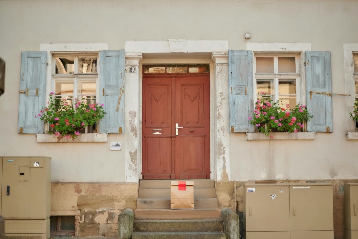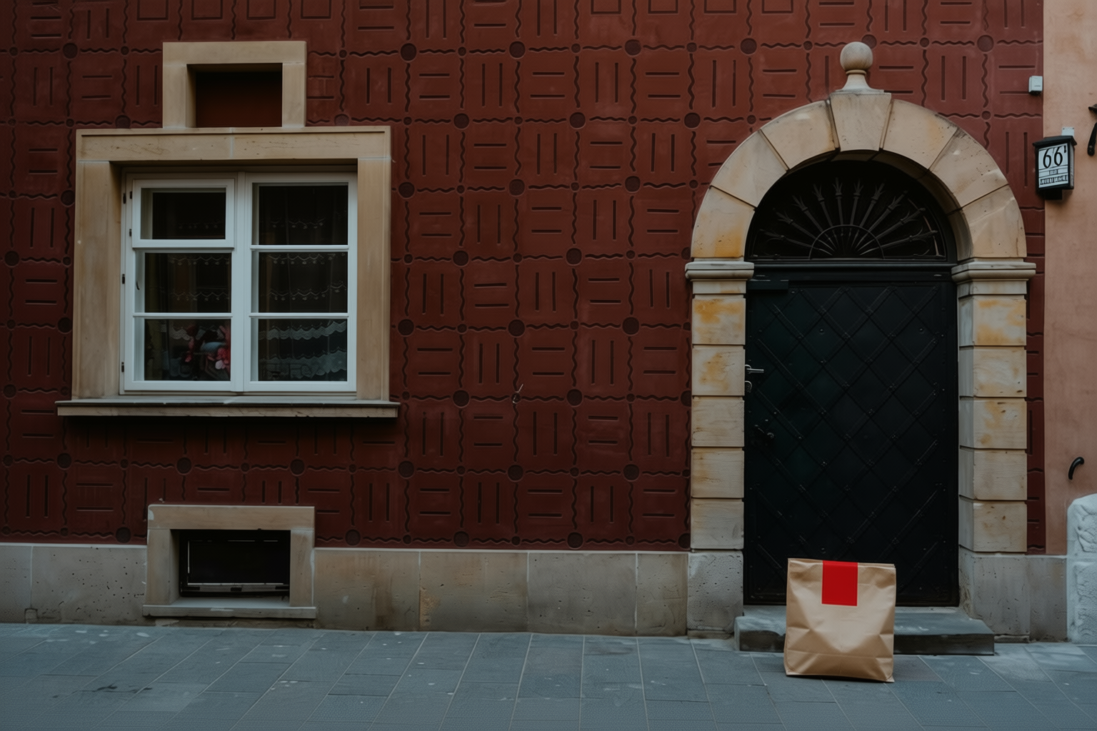 “In this existing photo, add a food delivery paper bag on the ground right in front of the door. The bag should be a small brown paper bag with a solid plain red sticker on the top keeping it closed. Preserve existing photo style and lighting as much as possible.”