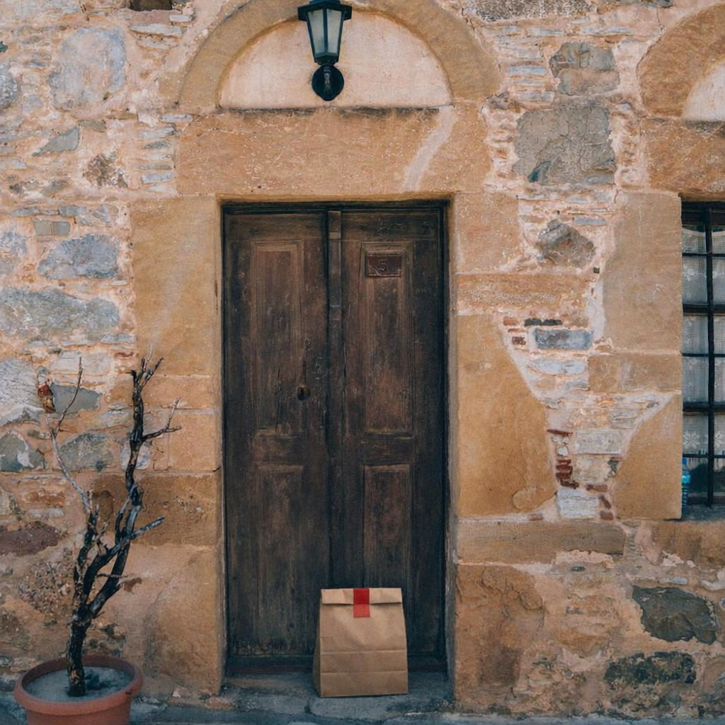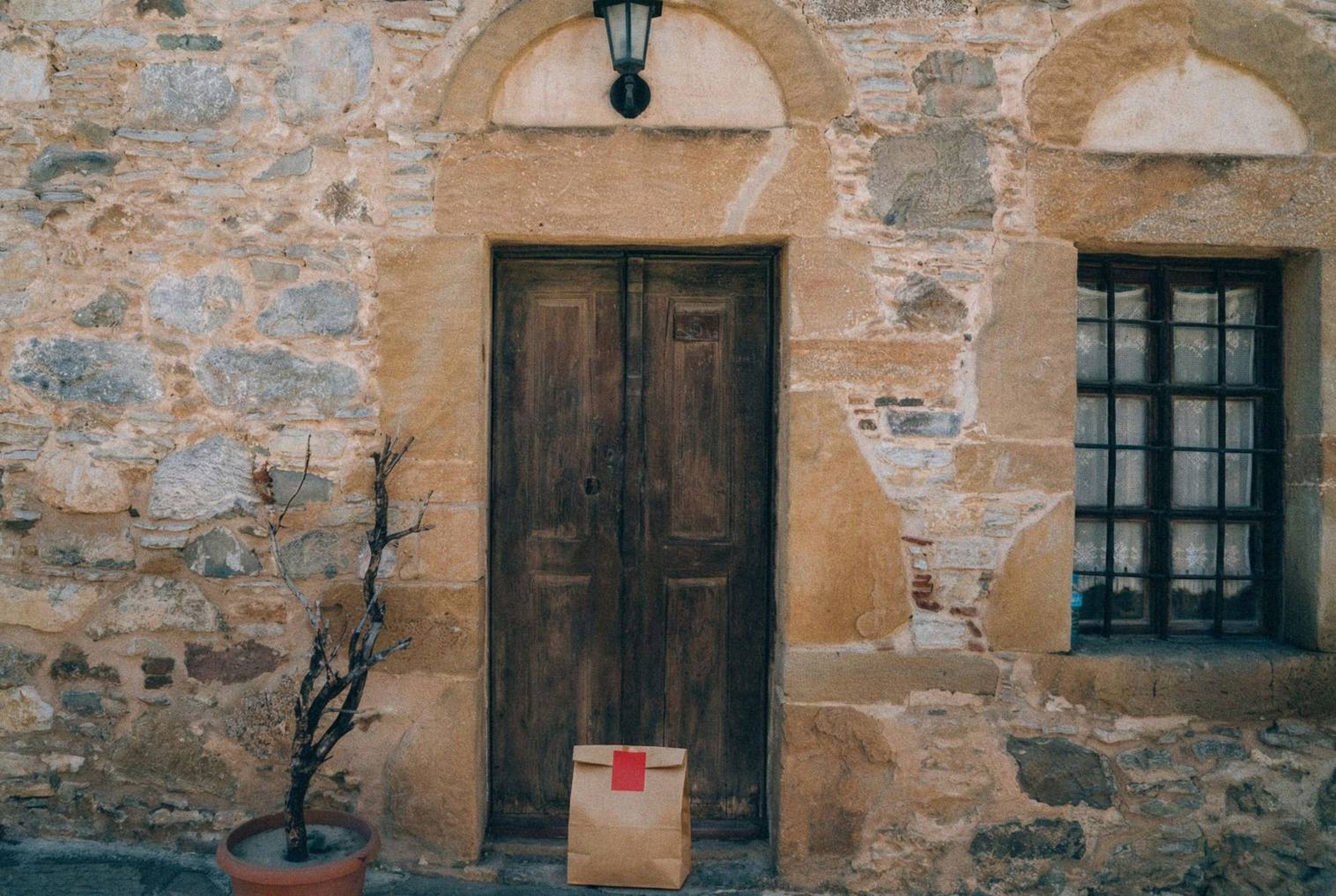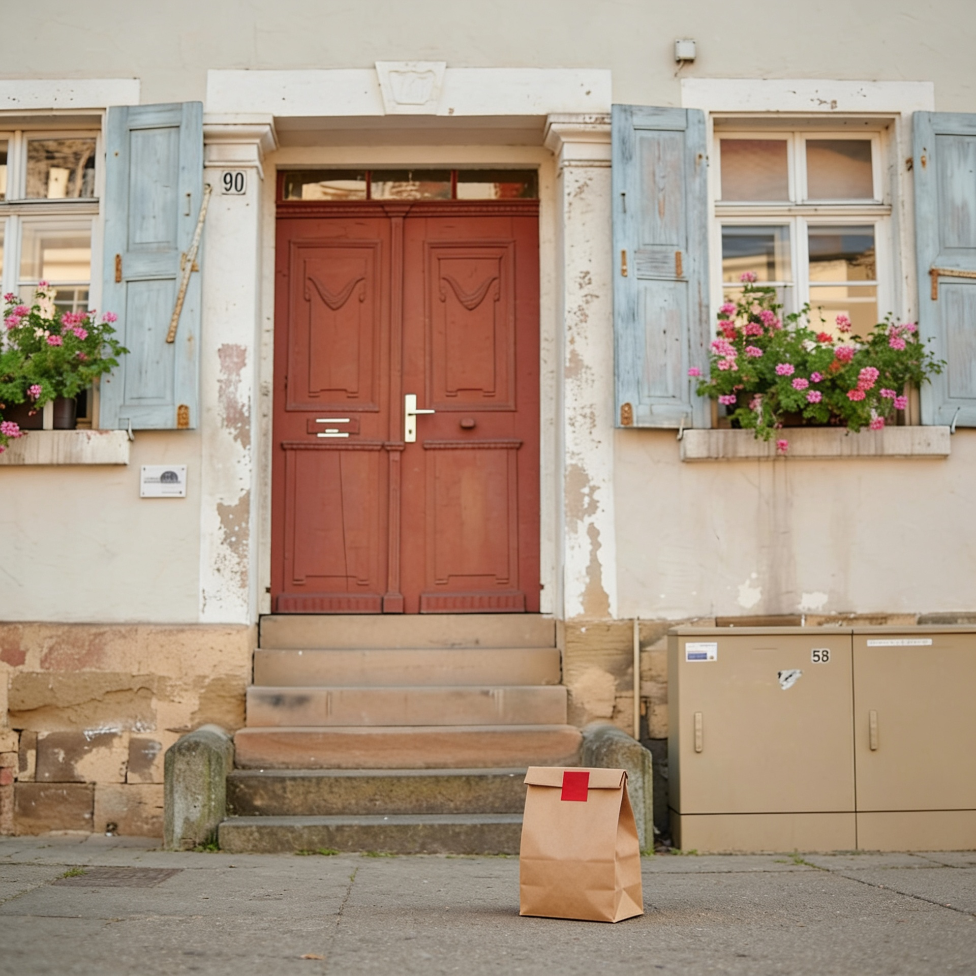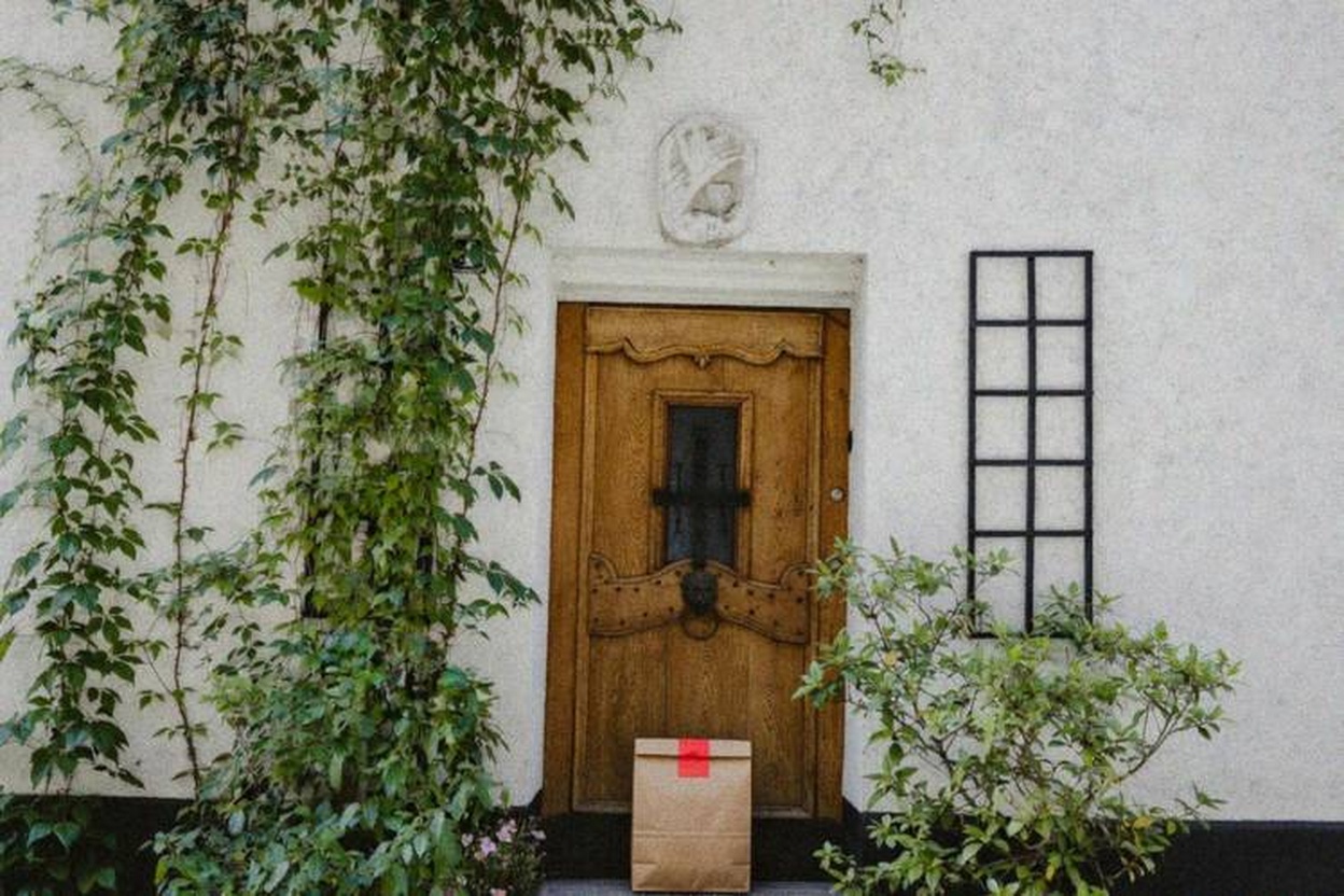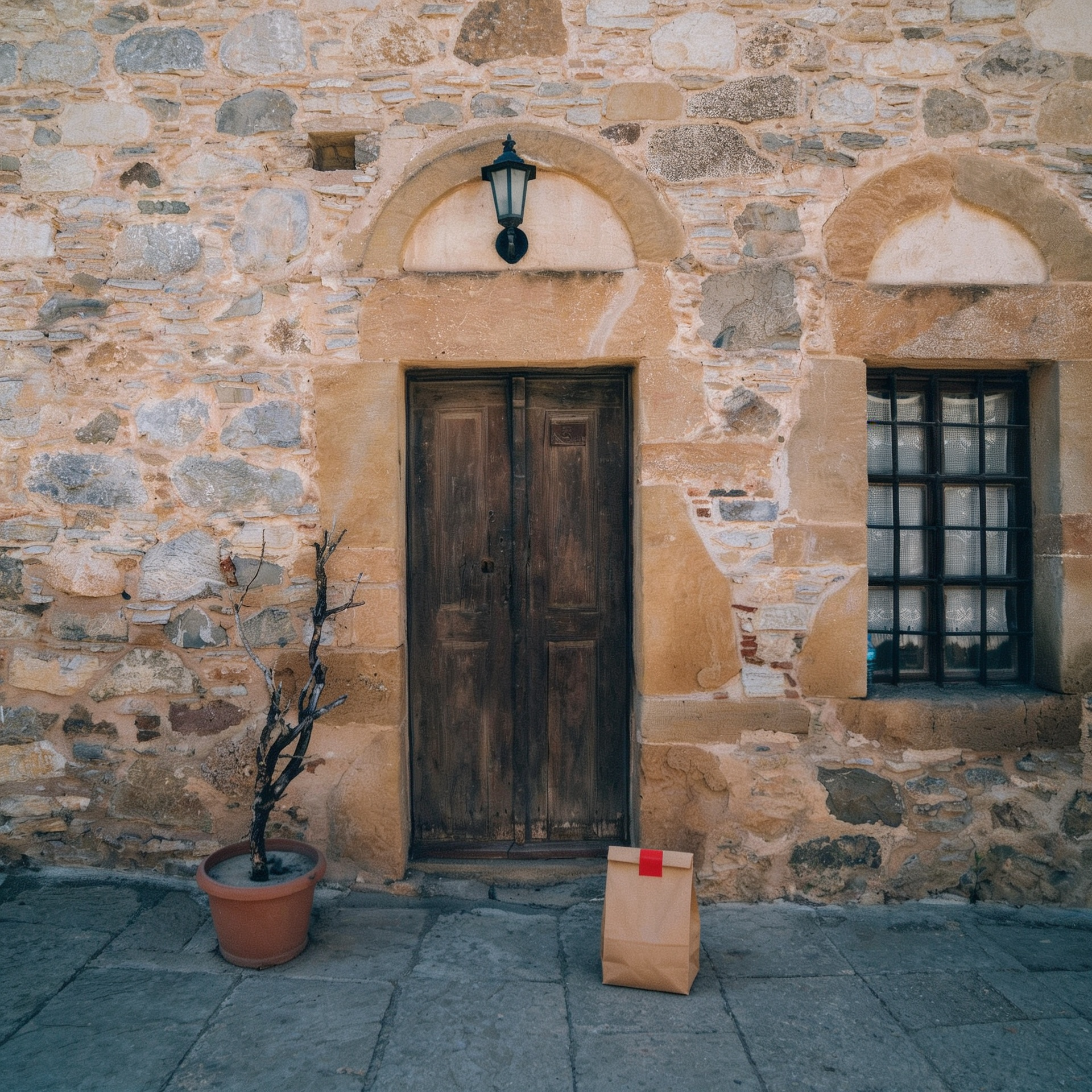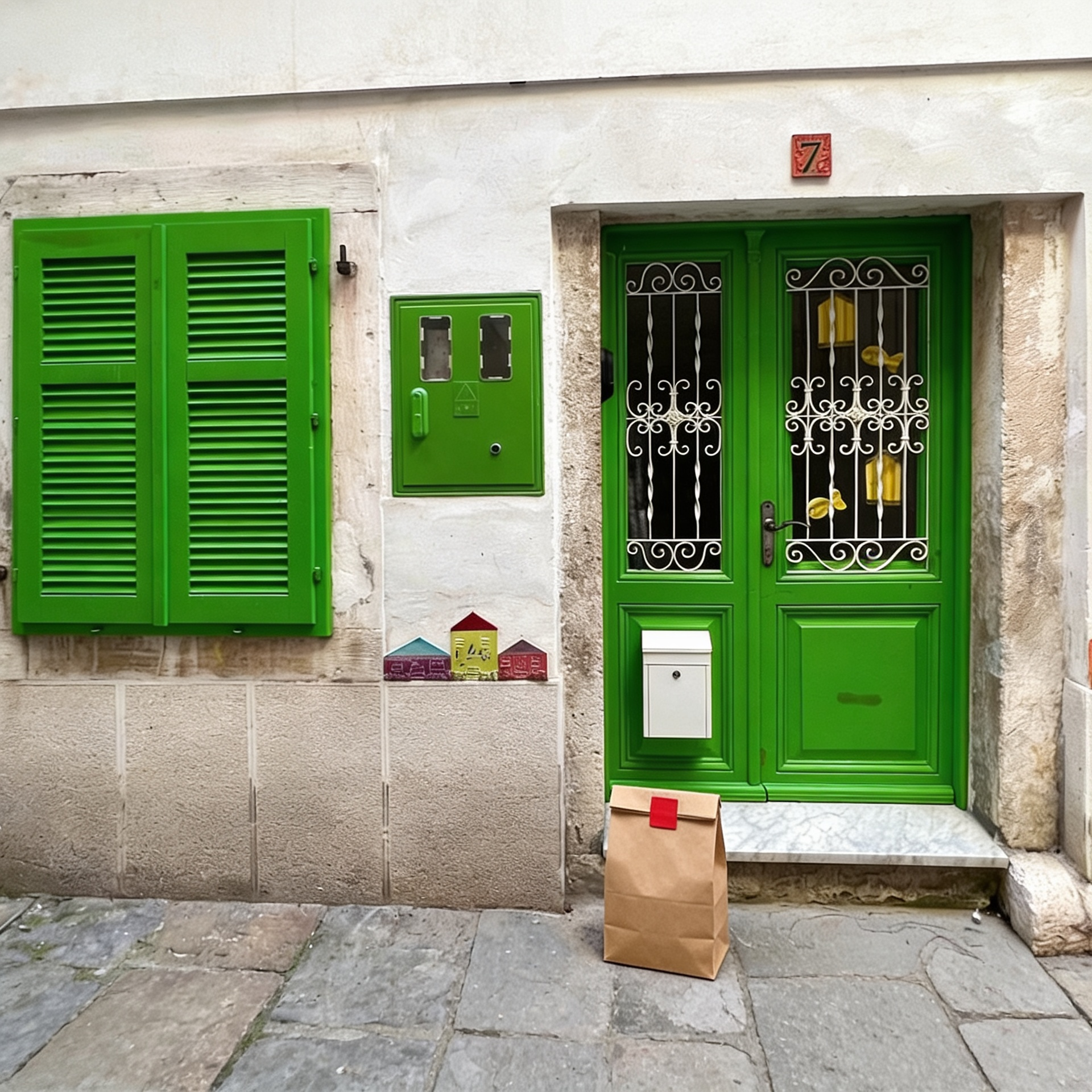 “In this existing photo, add a food delivery paper bag on the ground right in front of the door. The bag should be a small brown paper bag with a solid plain red sticker on the top keeping it closed. Preserve existing photo style and lighting as much as possible.”