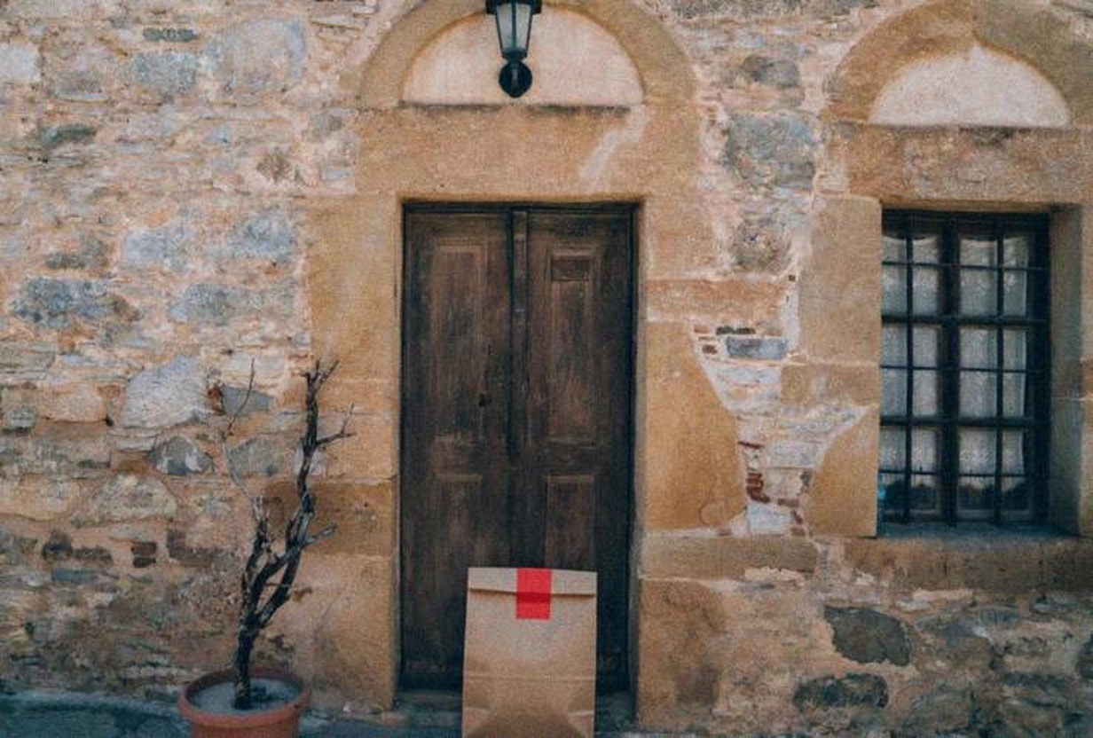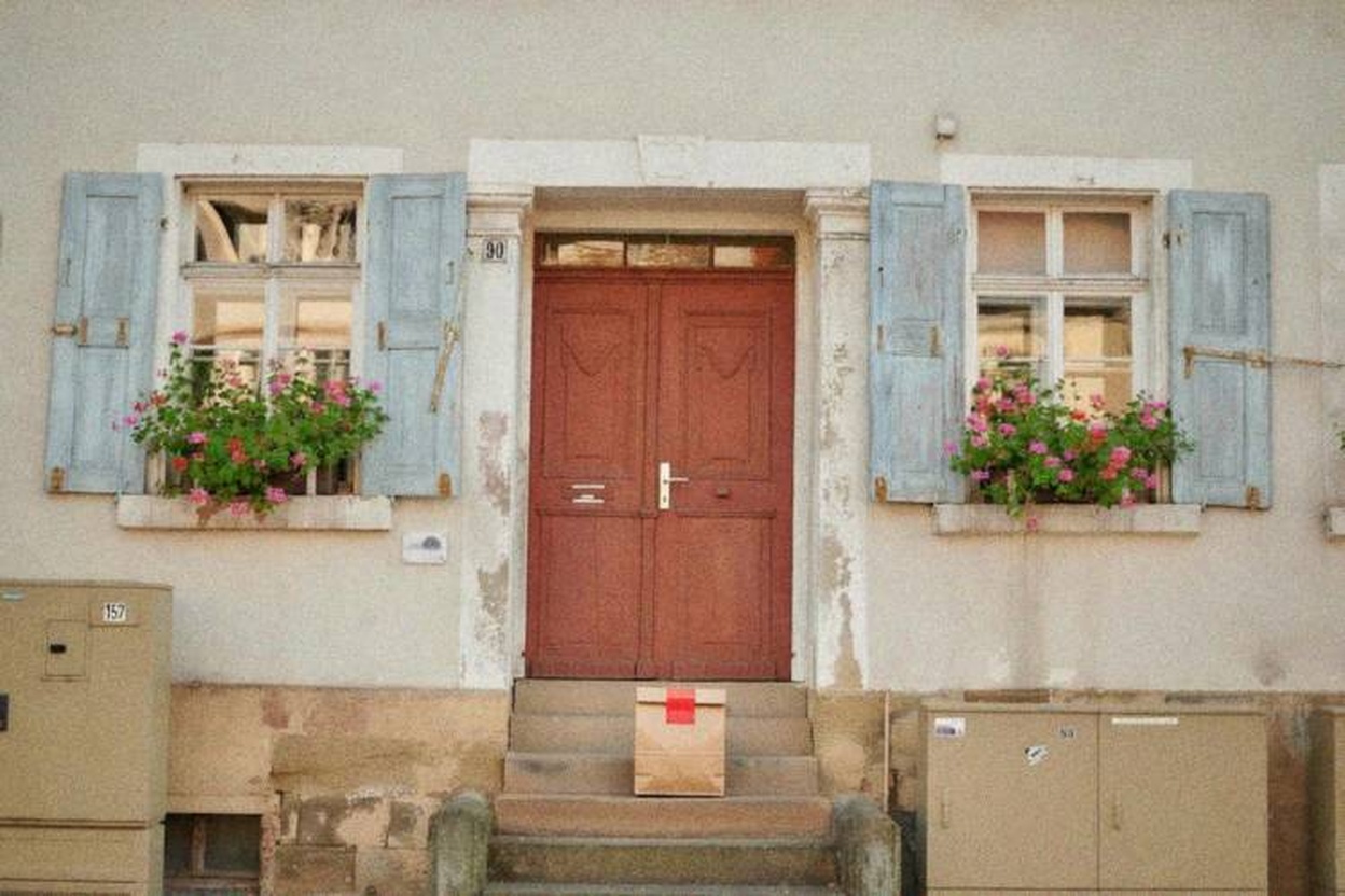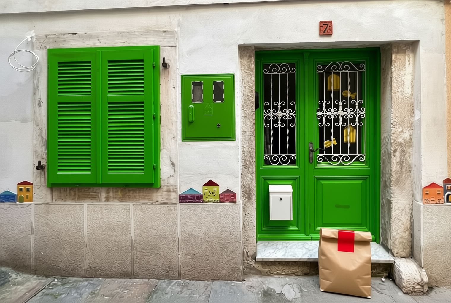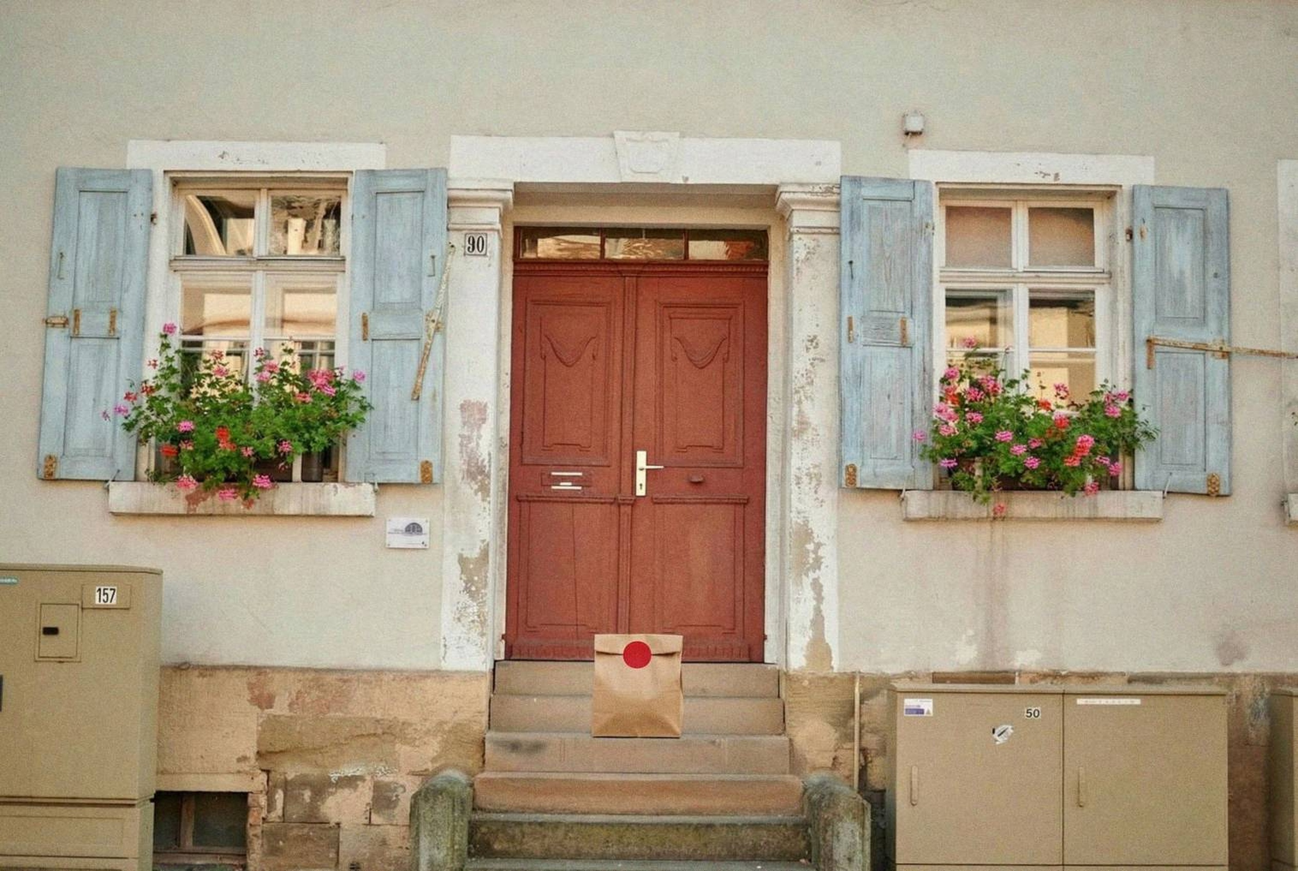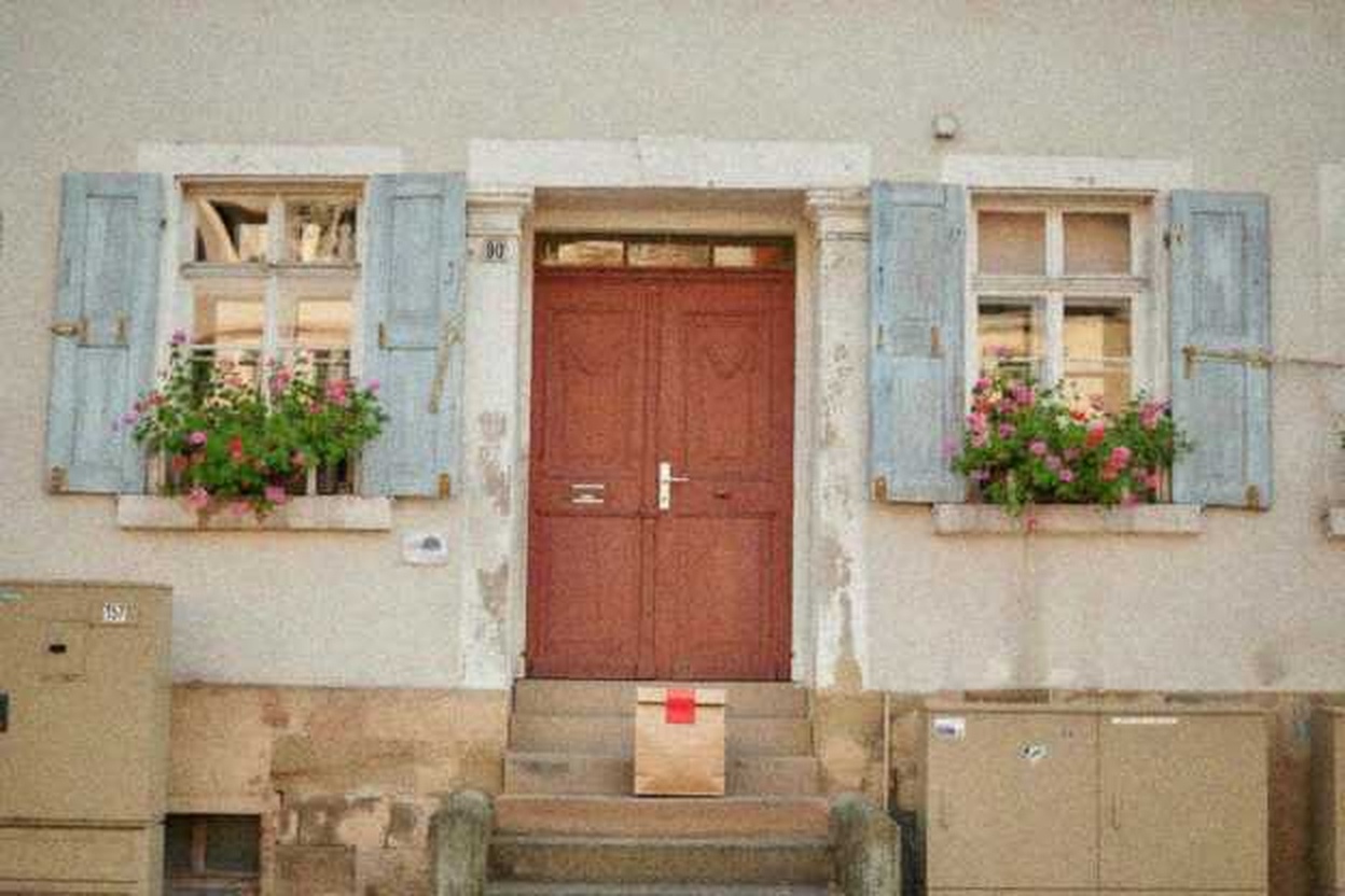 “In this existing photo, add a food delivery paper bag on the ground right in front of the door. The bag should be a small brown paper bag with a solid plain red sticker on the top keeping it closed. Preserve existing photo style and lighting as much as possible.”