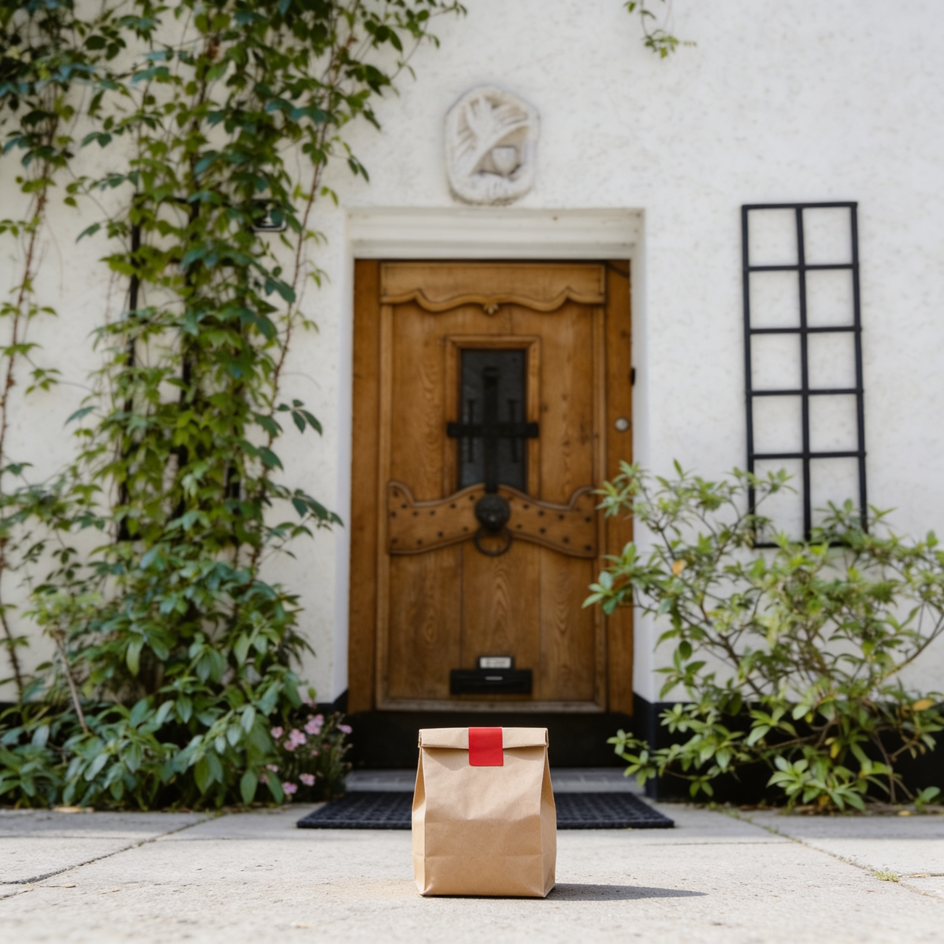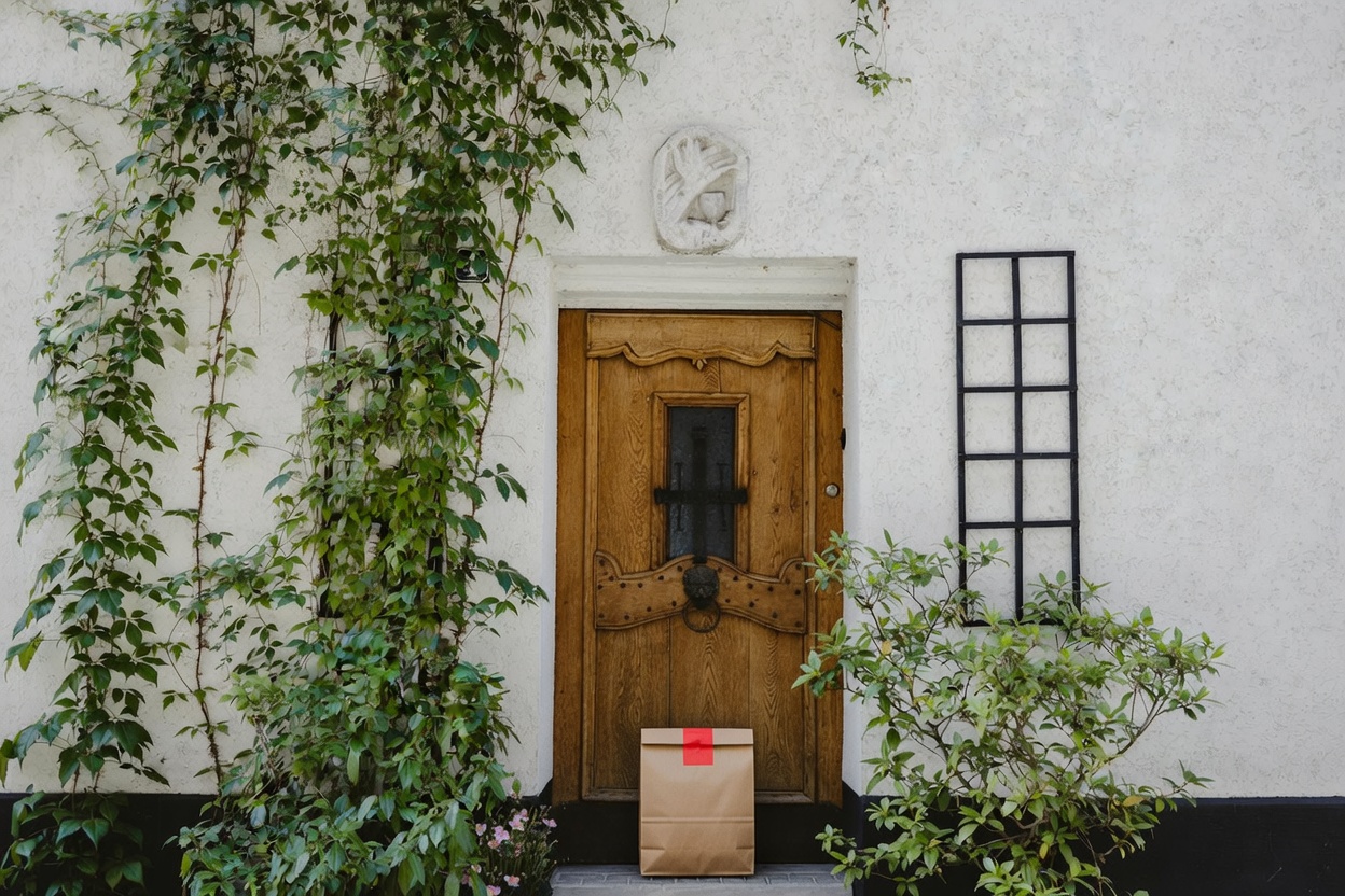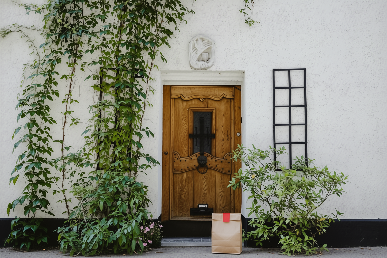 Delivery: We took real front door photos and used AI to add a fake delivery bag to the photo.