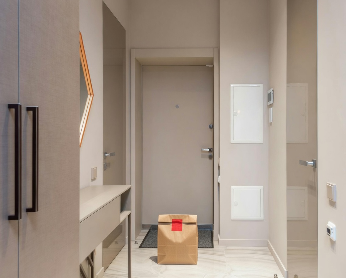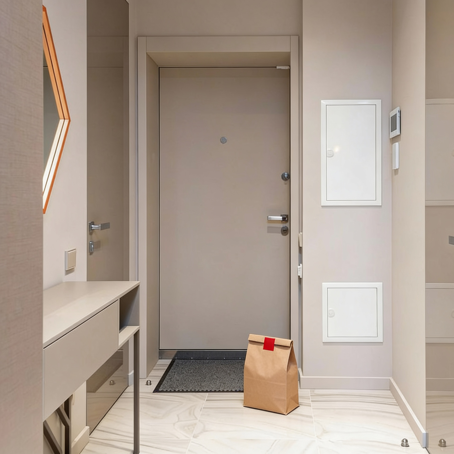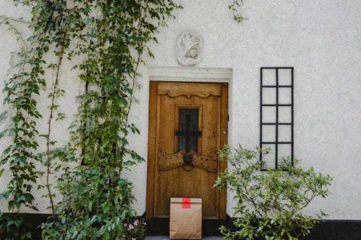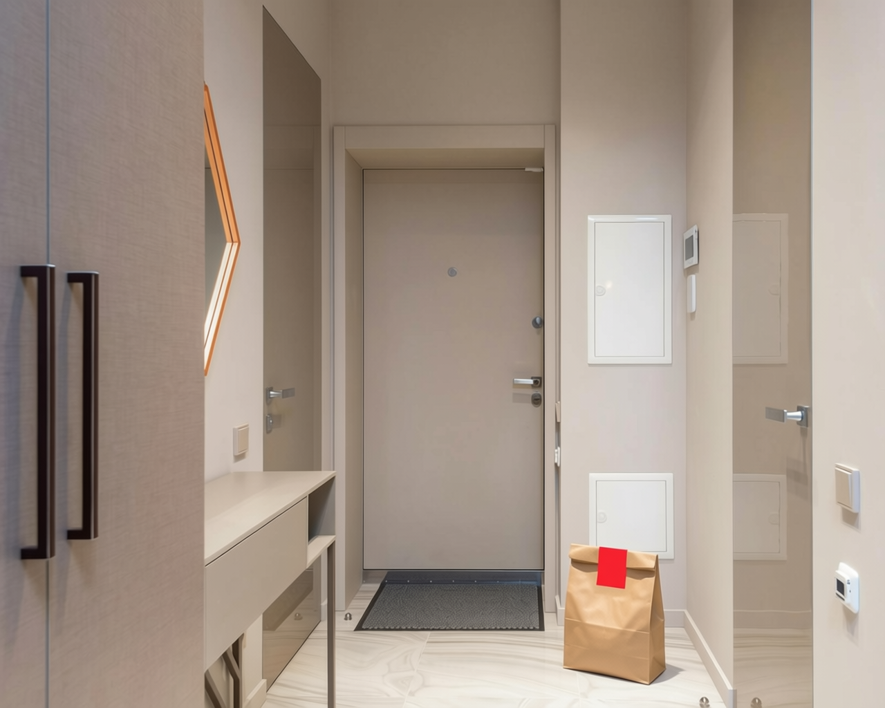 Delivery: We took real front door photos and used AI to add a fake delivery bag to the photo.