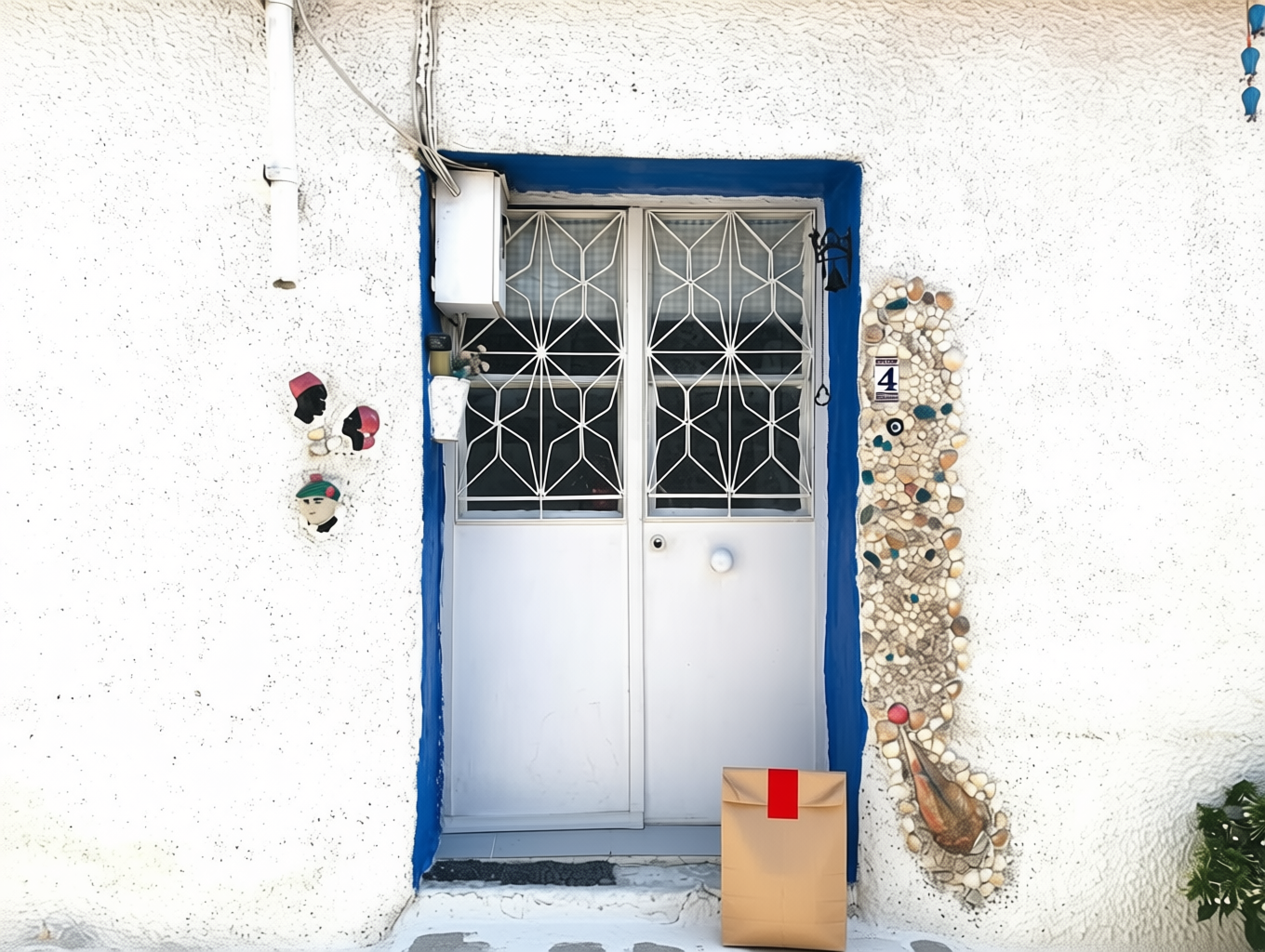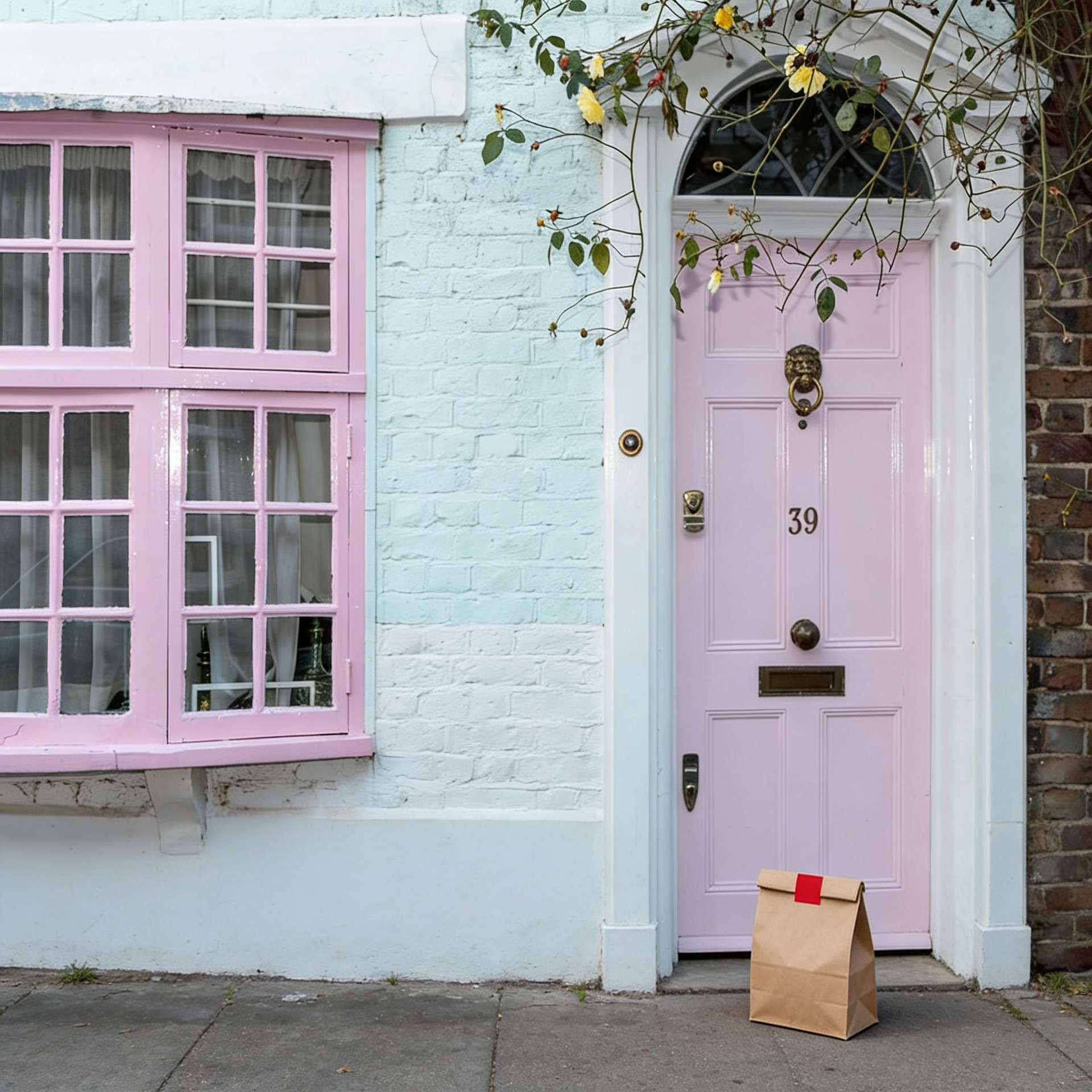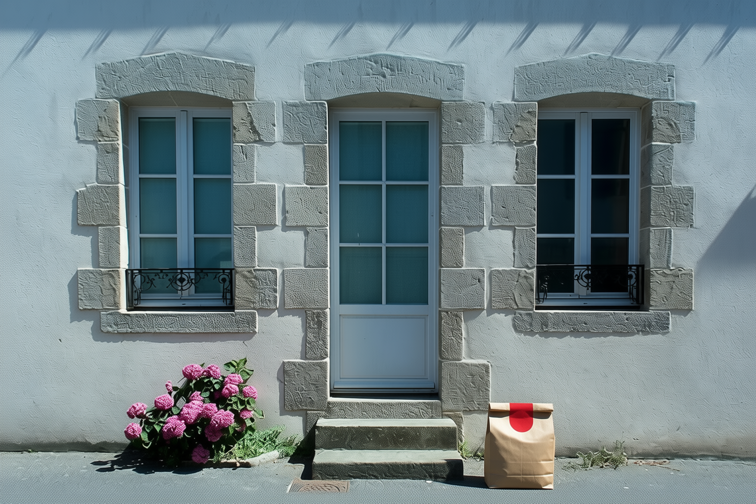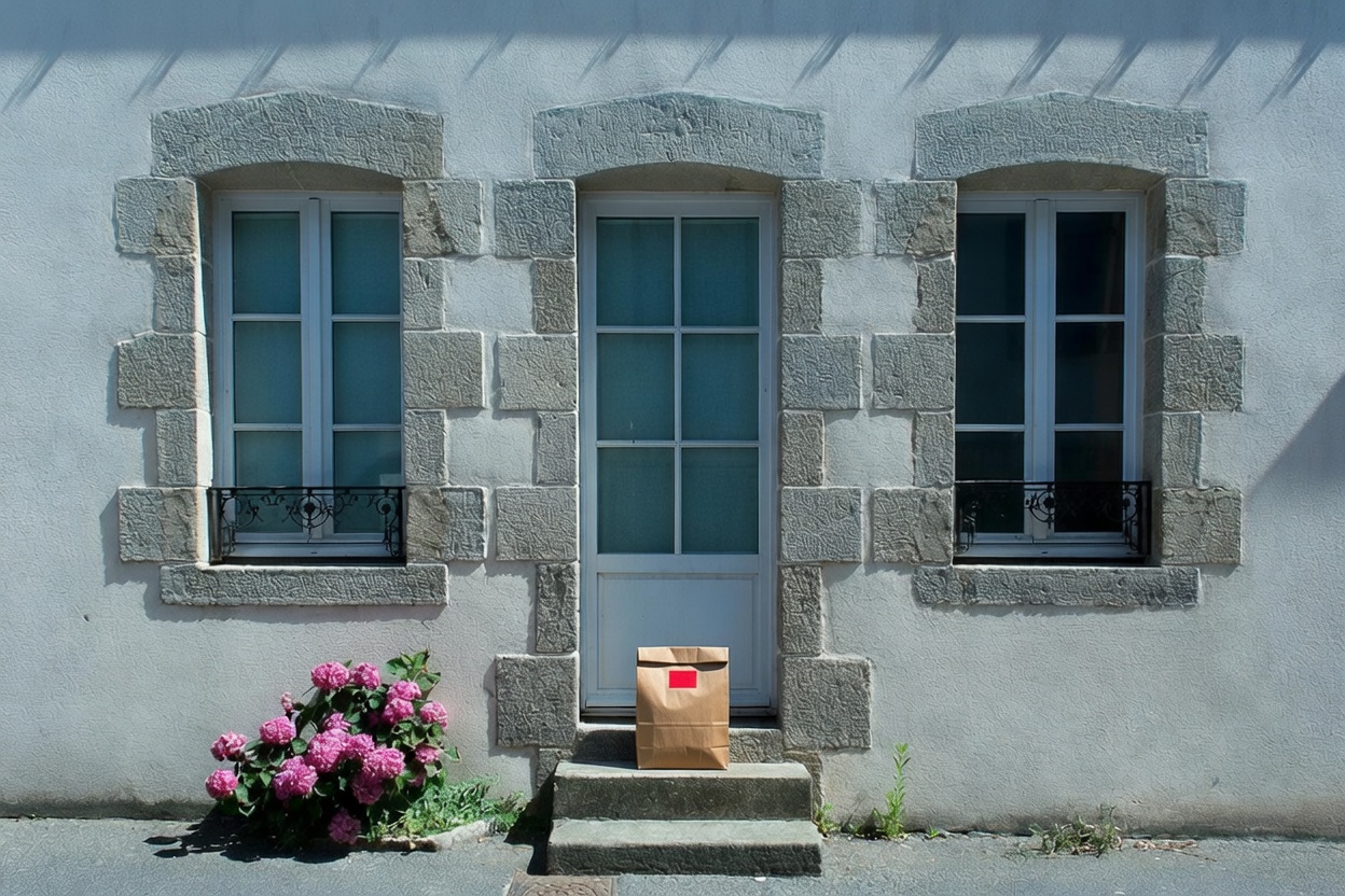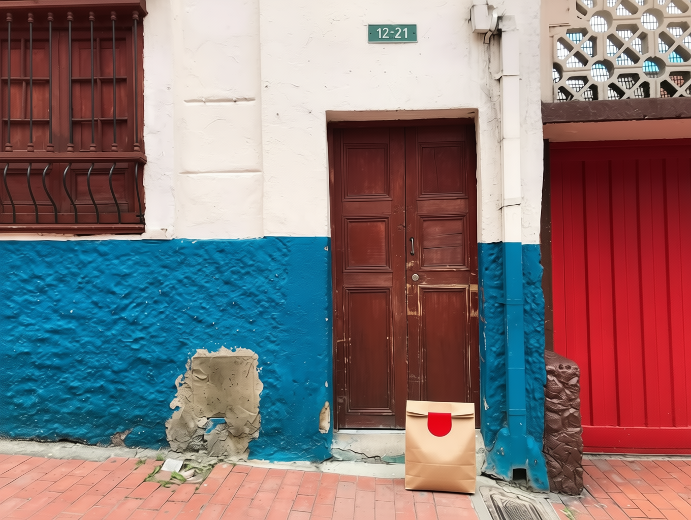 “In this existing photo, add a food delivery paper bag on the ground right in front of the door. The bag should be a small brown paper bag with a solid plain red sticker on the top keeping it closed. Preserve existing photo style and lighting as much as possible.”