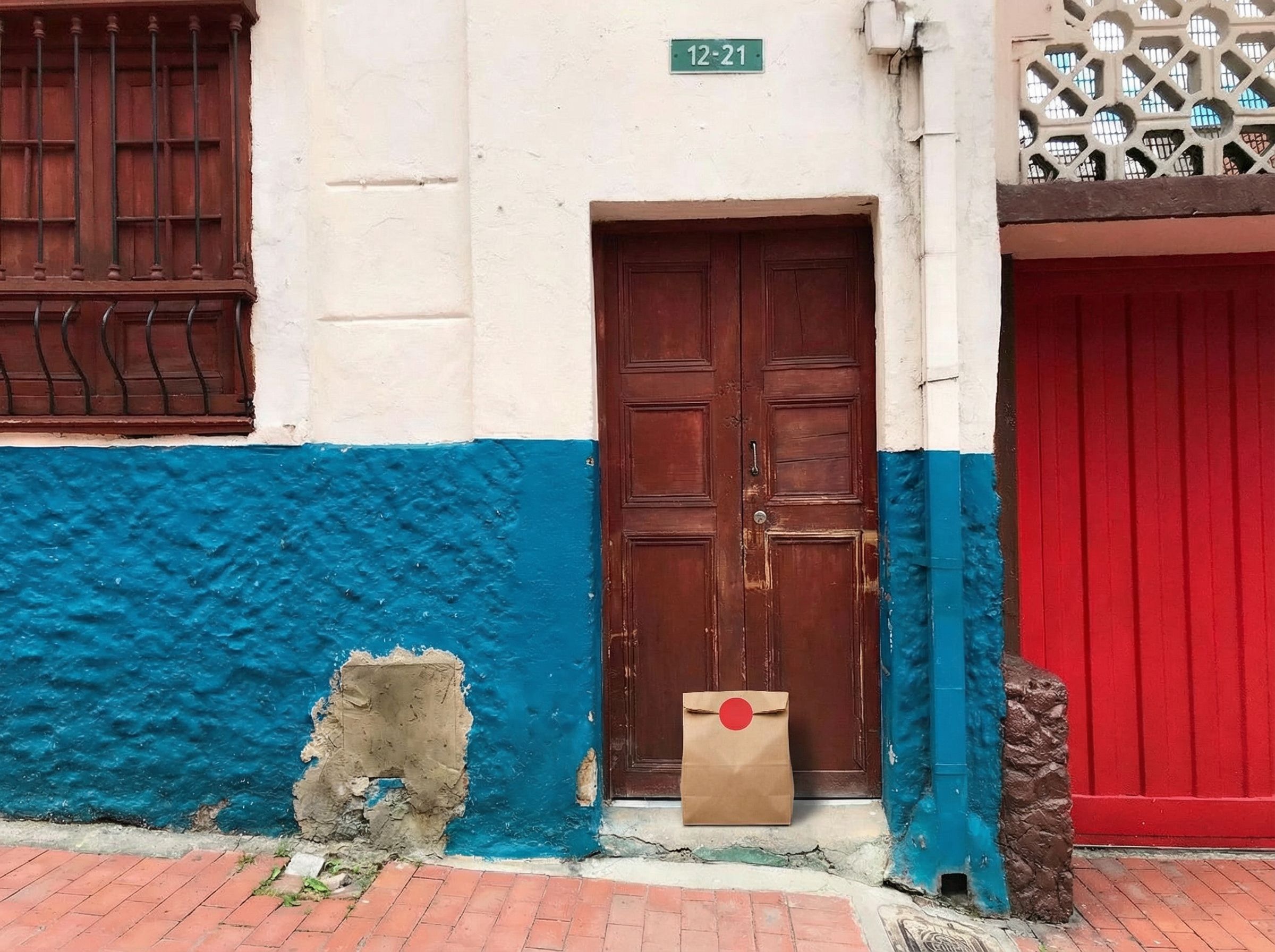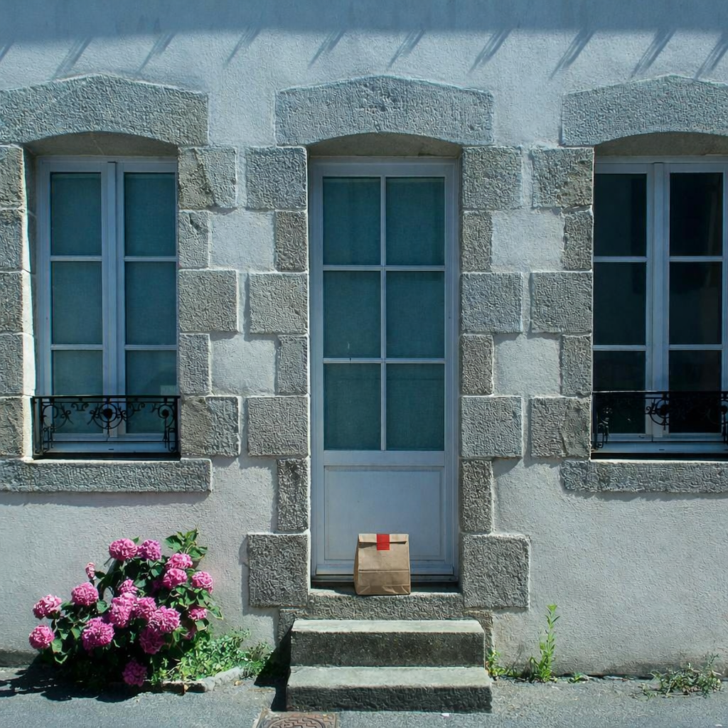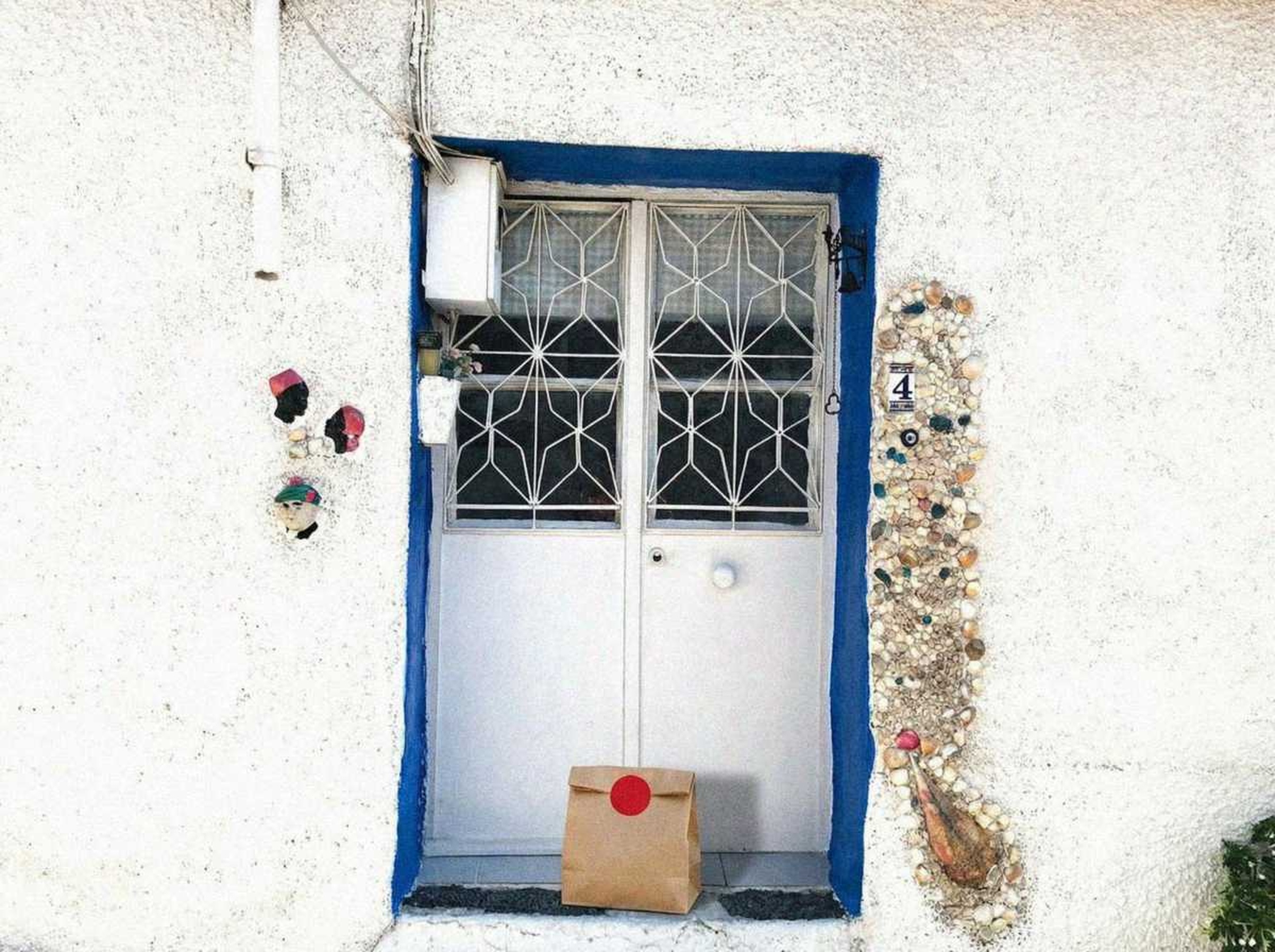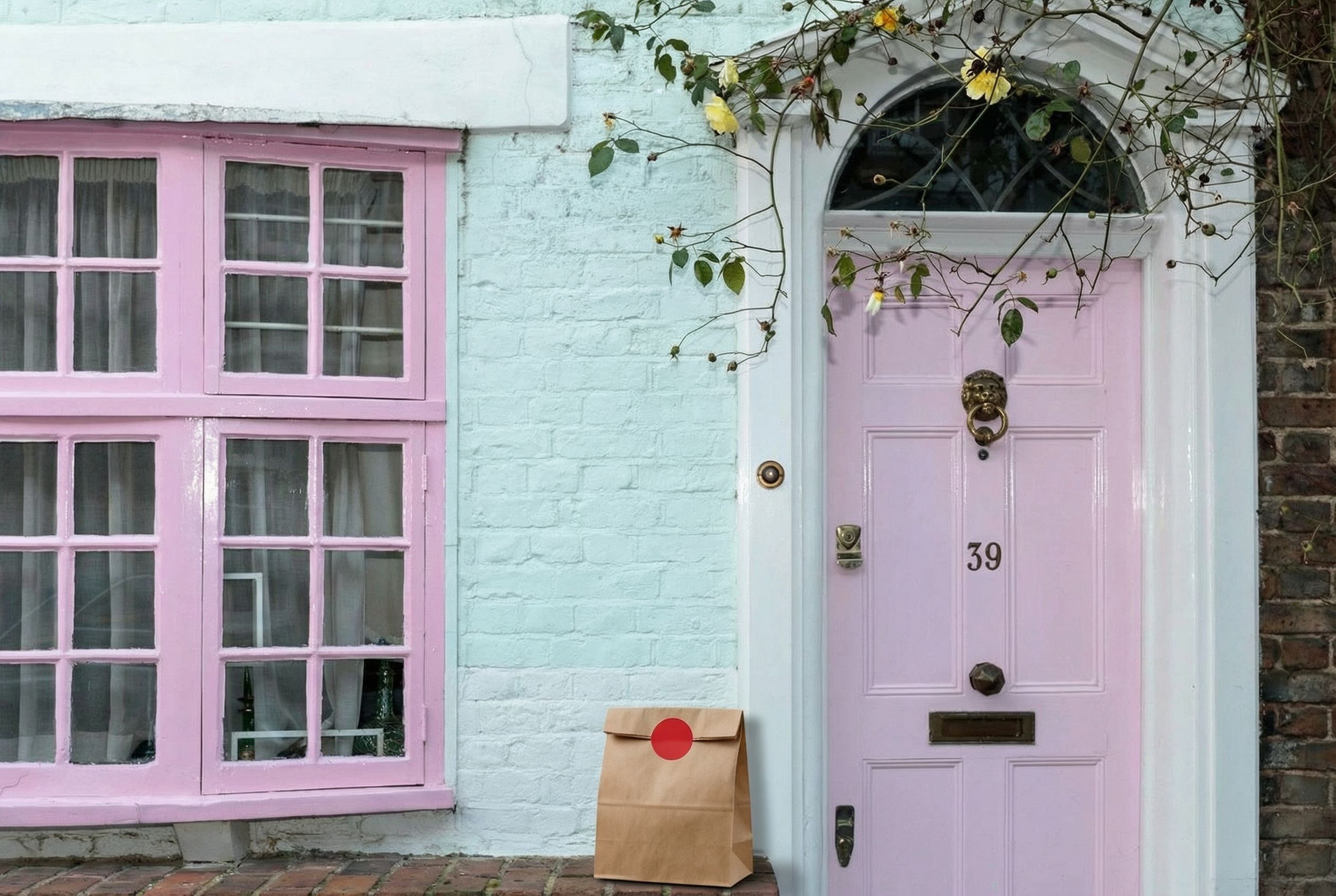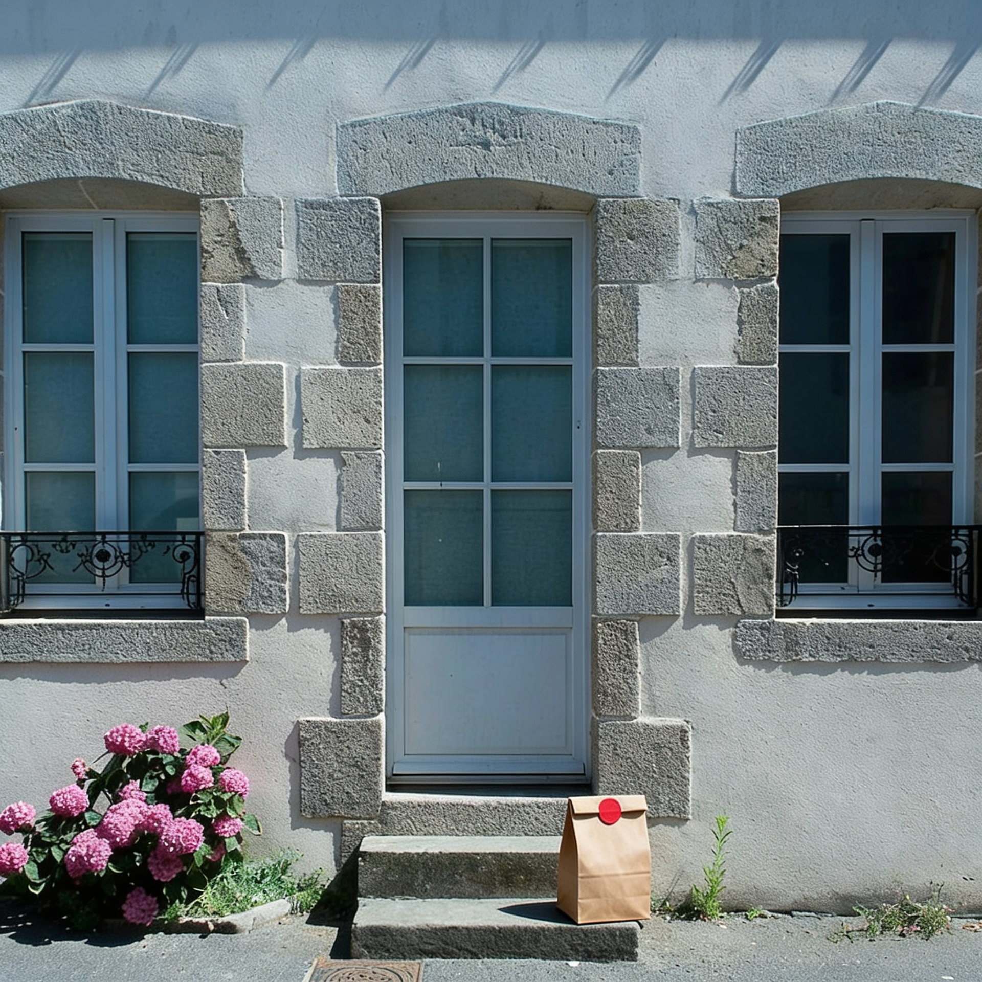 “In this existing photo, add a food delivery paper bag on the ground right in front of the door. The bag should be a small brown paper bag with a solid plain red sticker on the top keeping it closed. Preserve existing photo style and lighting as much as possible.”