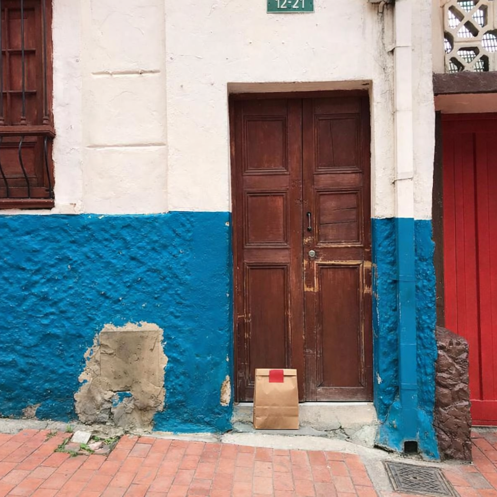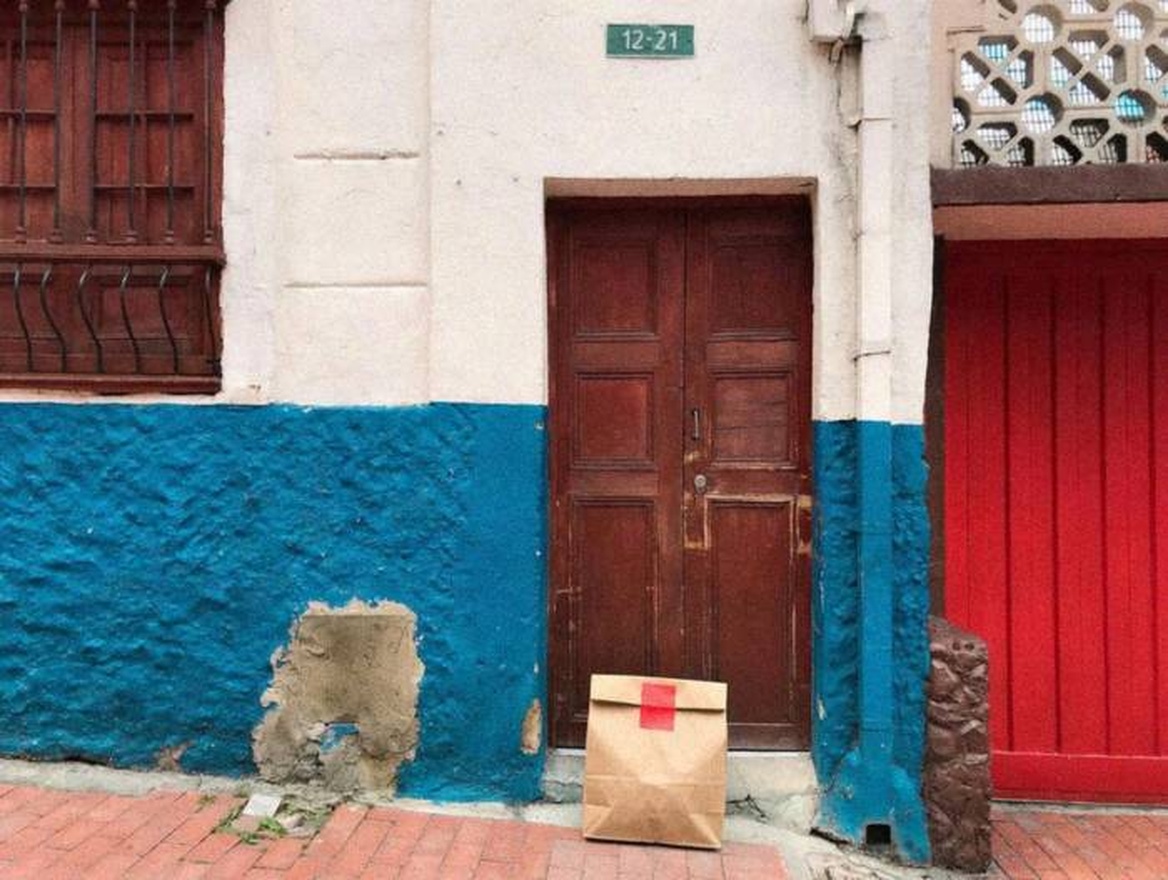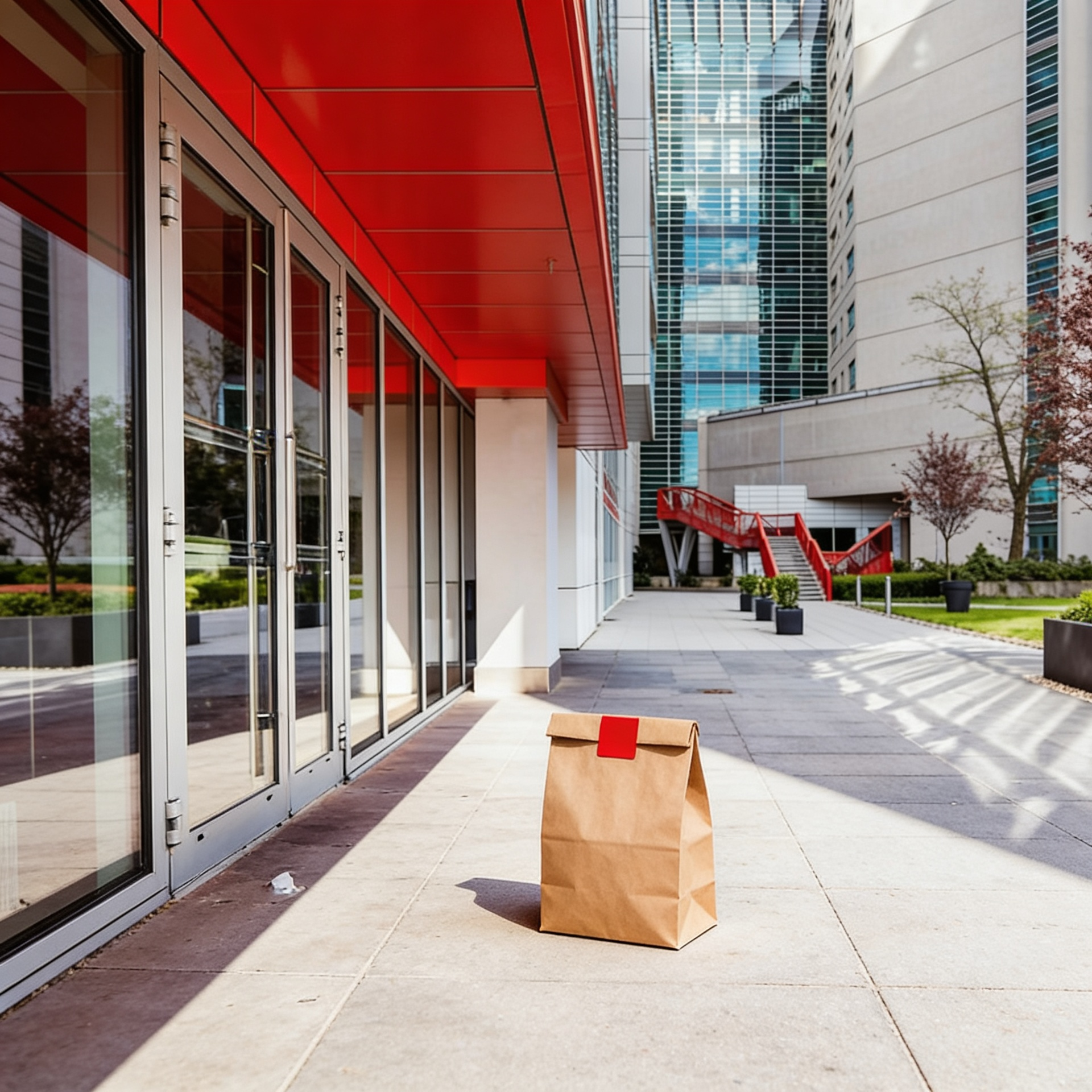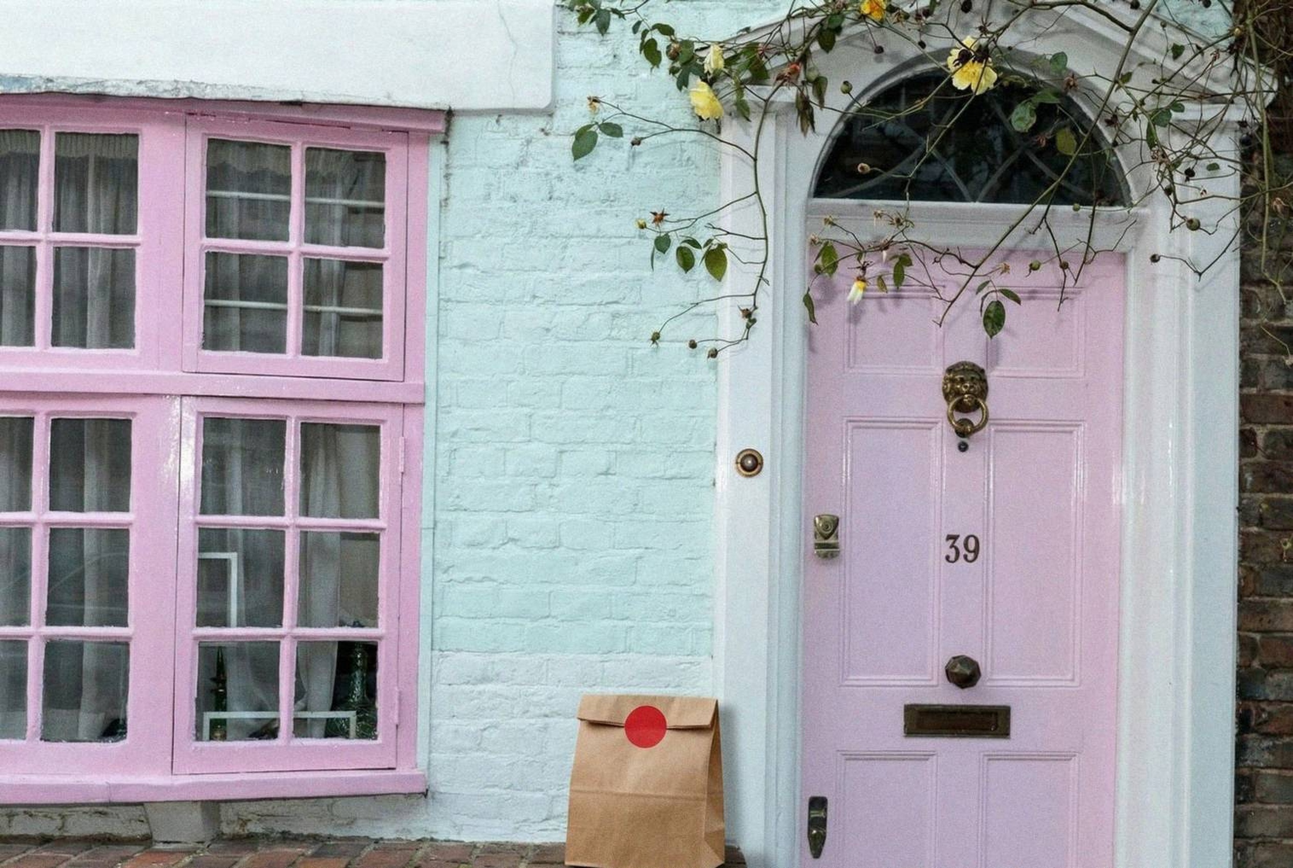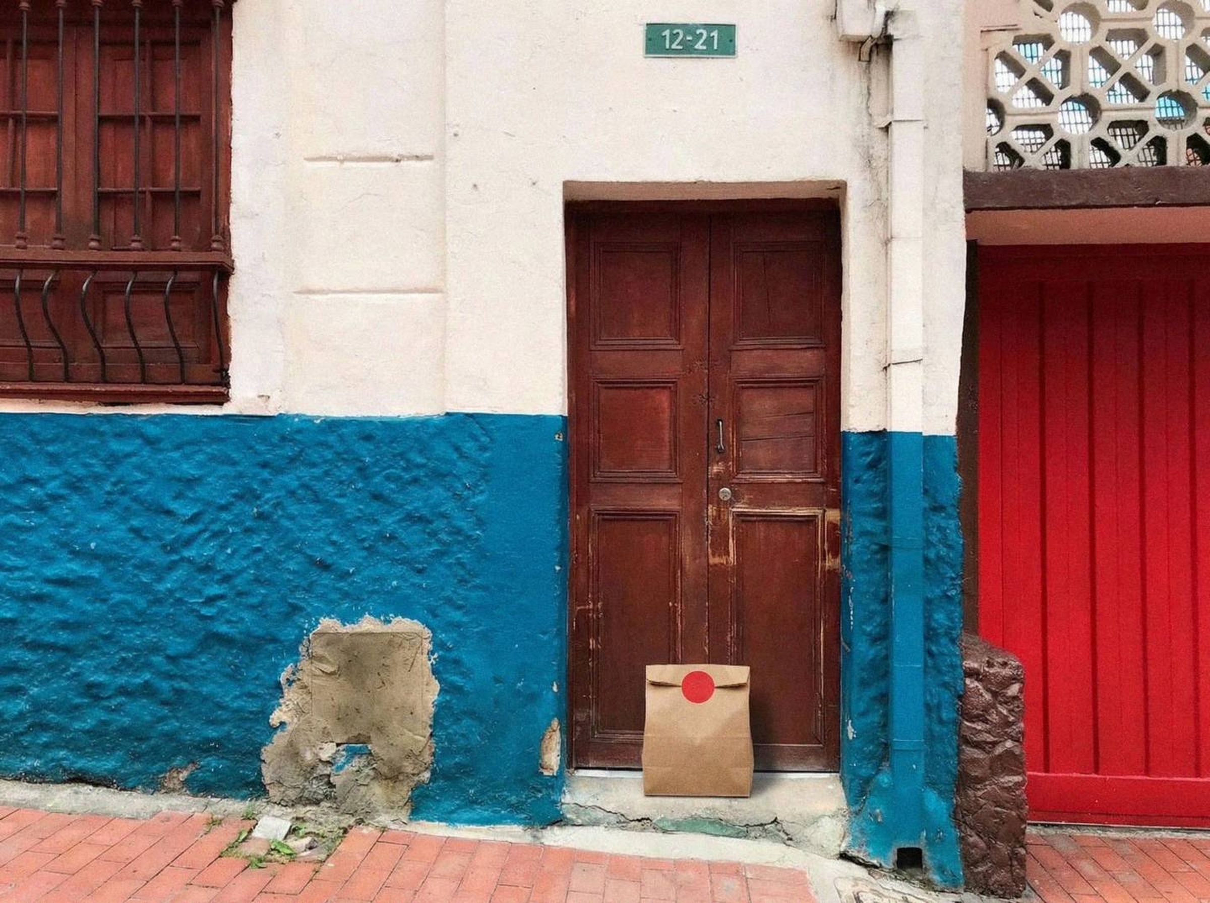 “In this existing photo, add a food delivery paper bag on the ground right in front of the door. The bag should be a small brown paper bag with a solid plain red sticker on the top keeping it closed. Preserve existing photo style and lighting as much as possible.”