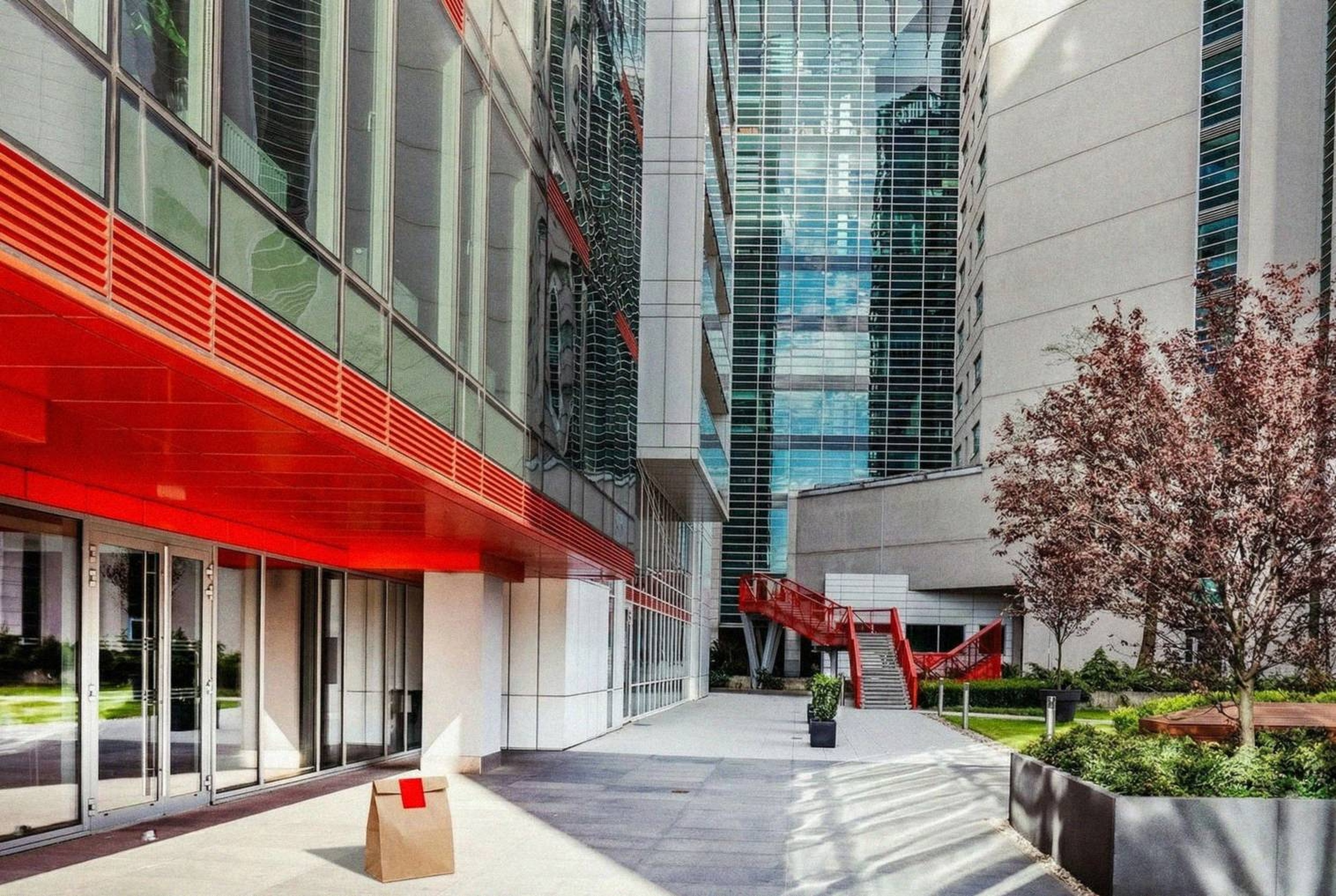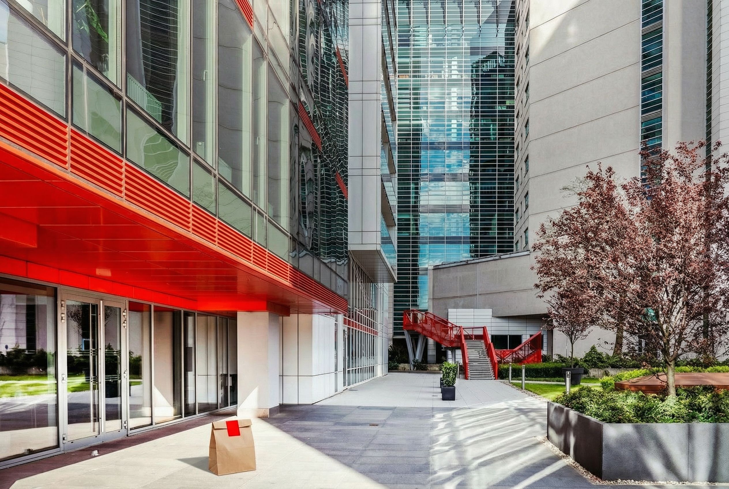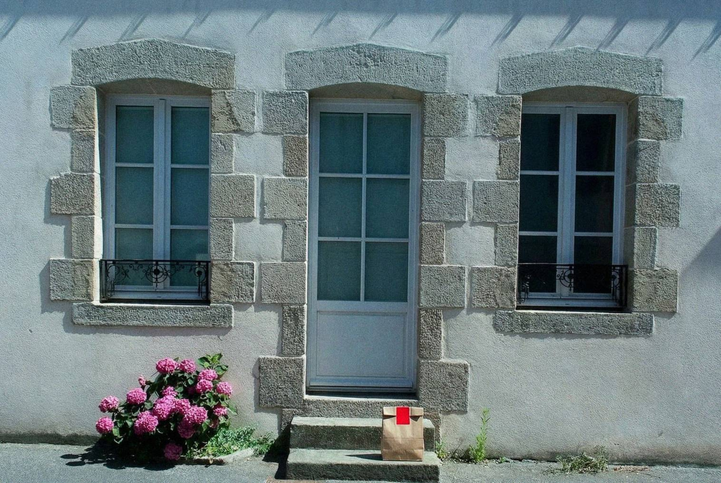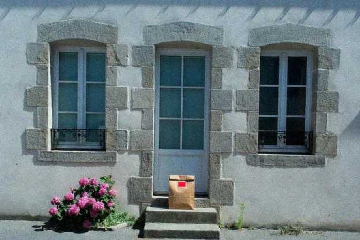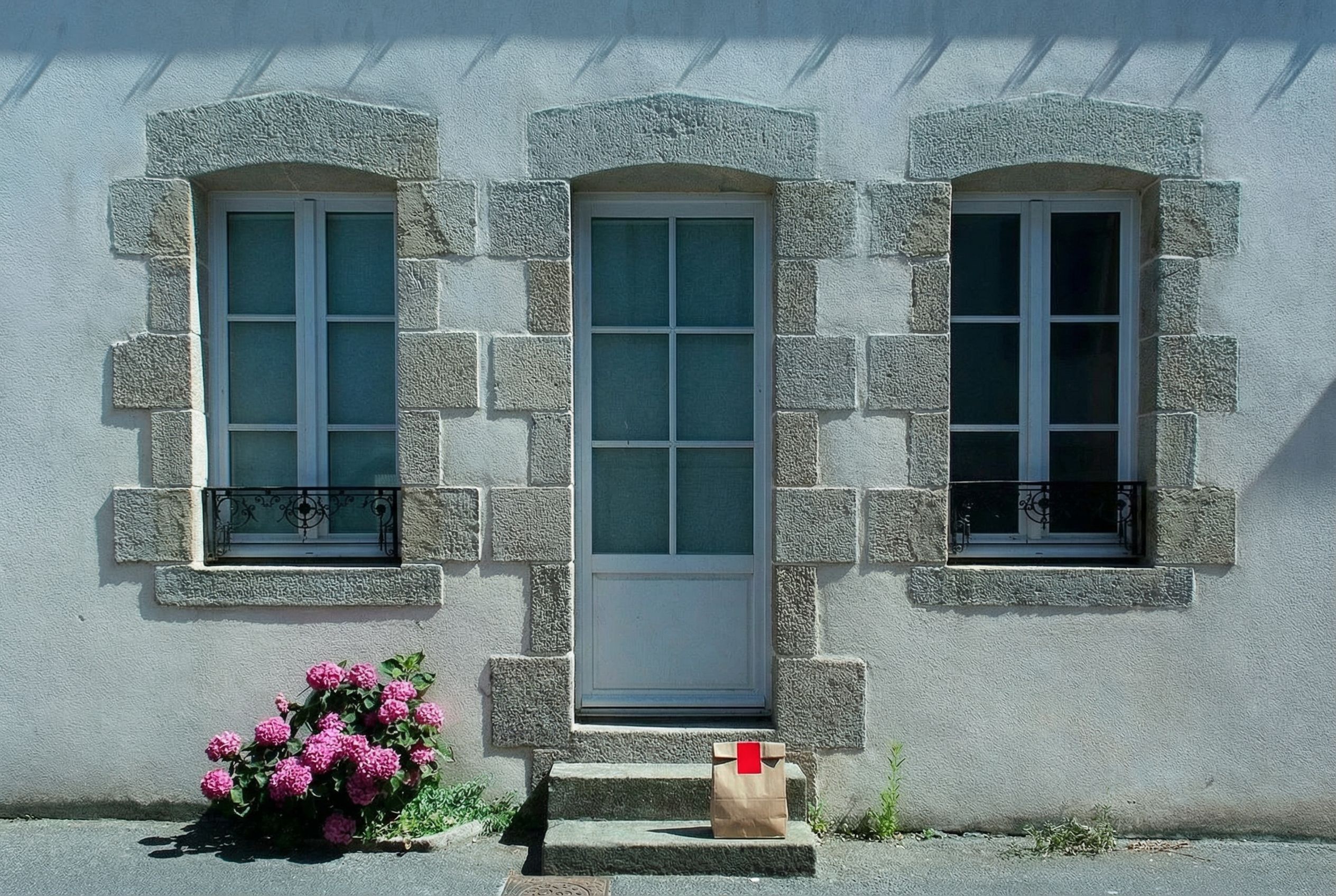 “In this existing photo, add a food delivery paper bag on the ground right in front of the door. The bag should be a small brown paper bag with a solid plain red sticker on the top keeping it closed. Preserve existing photo style and lighting as much as possible.”