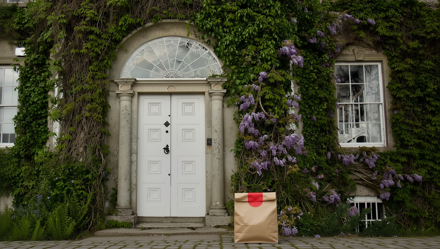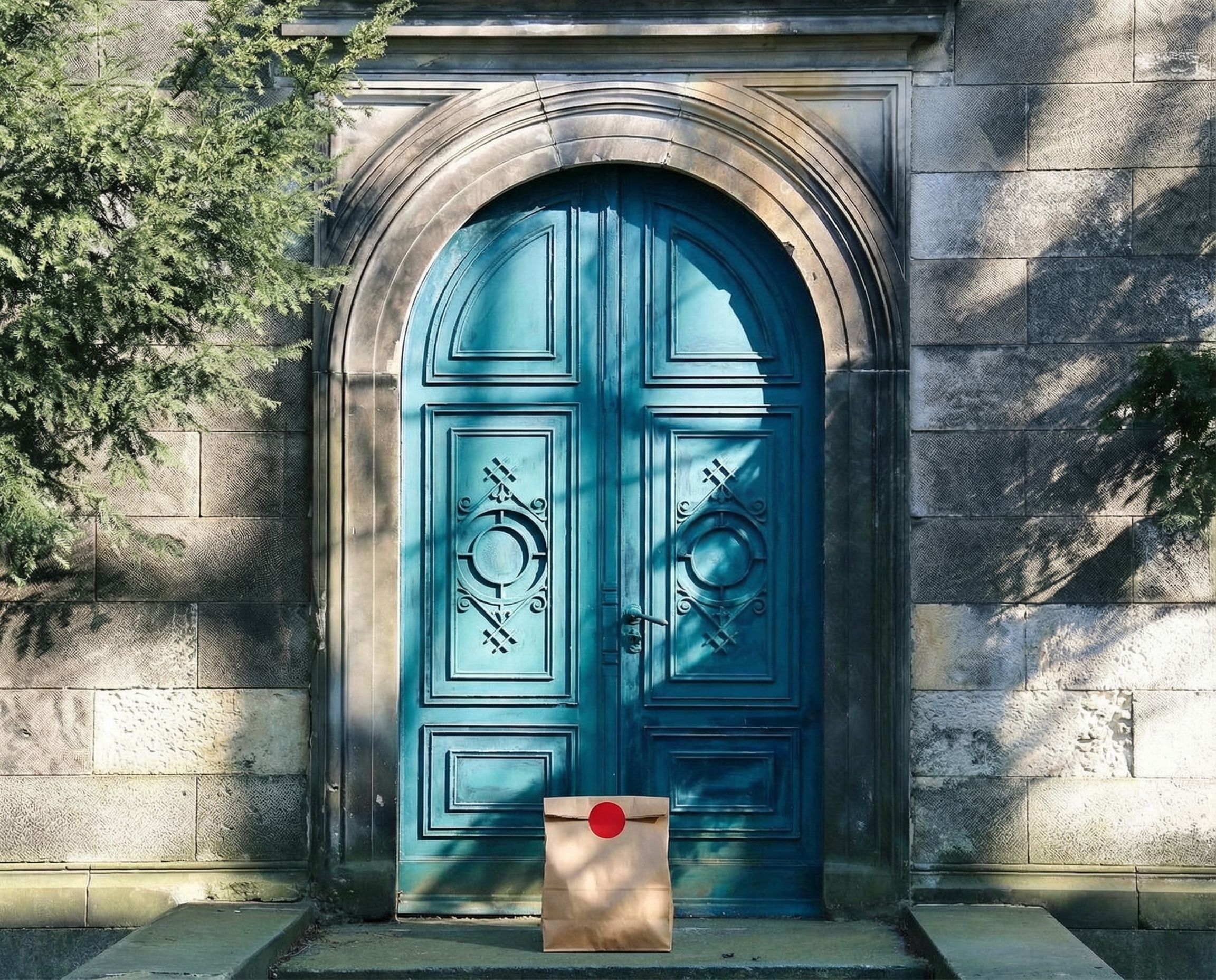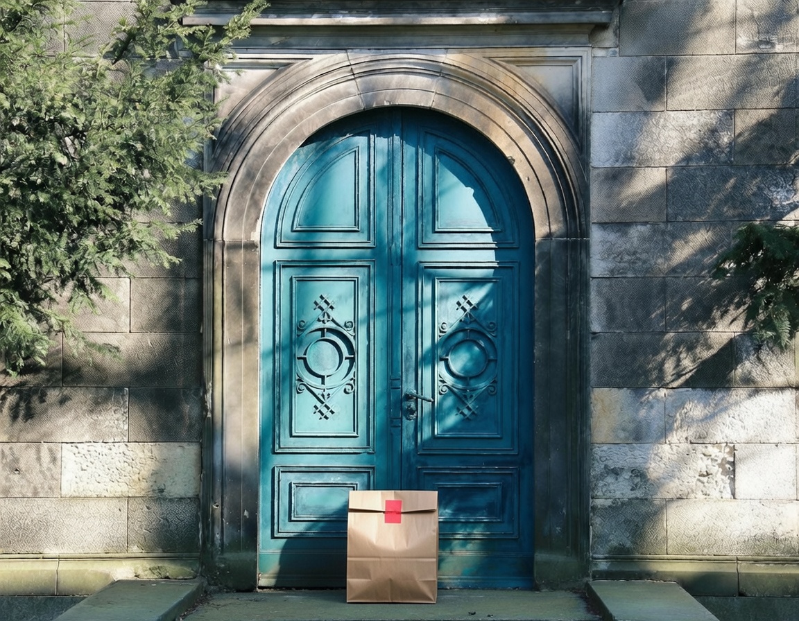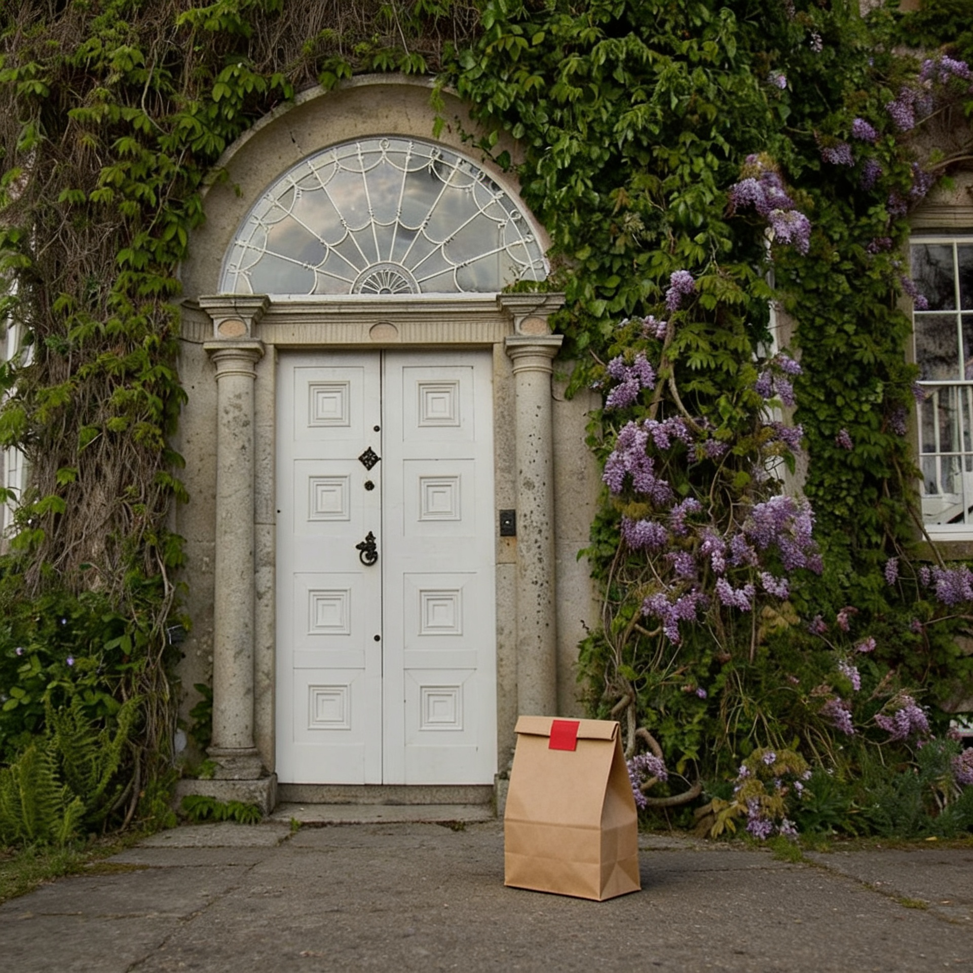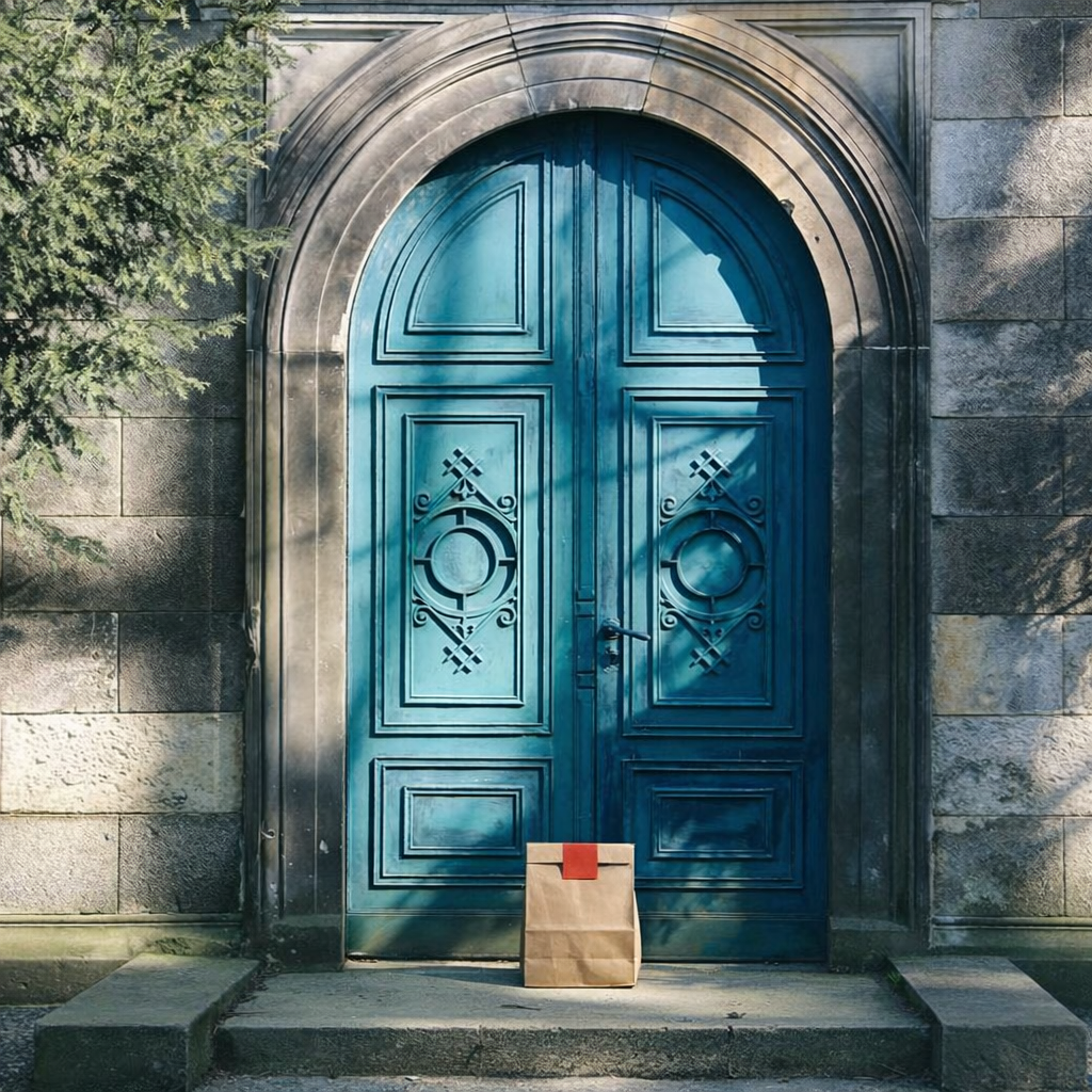“In this existing photo, add a food delivery paper bag on the ground right in front of the door. The bag should be a small brown paper bag with a solid plain red sticker on the top keeping it closed. Preserve existing photo style and lighting as much as possible.”