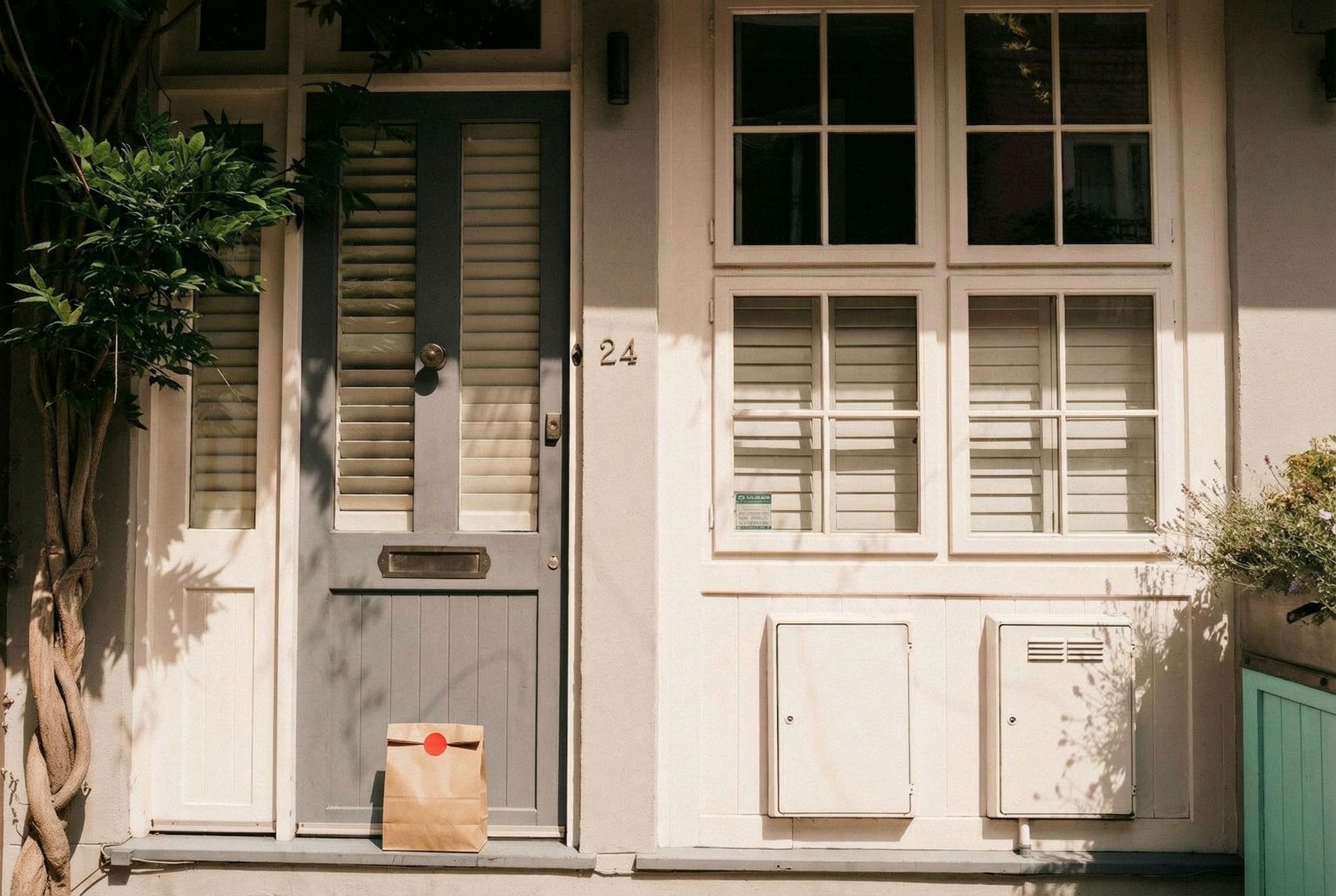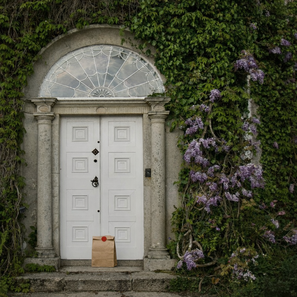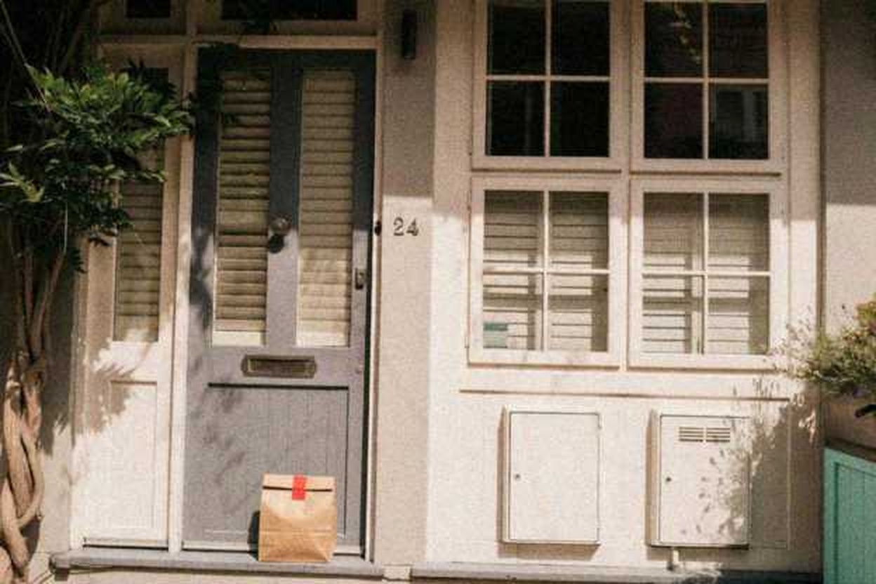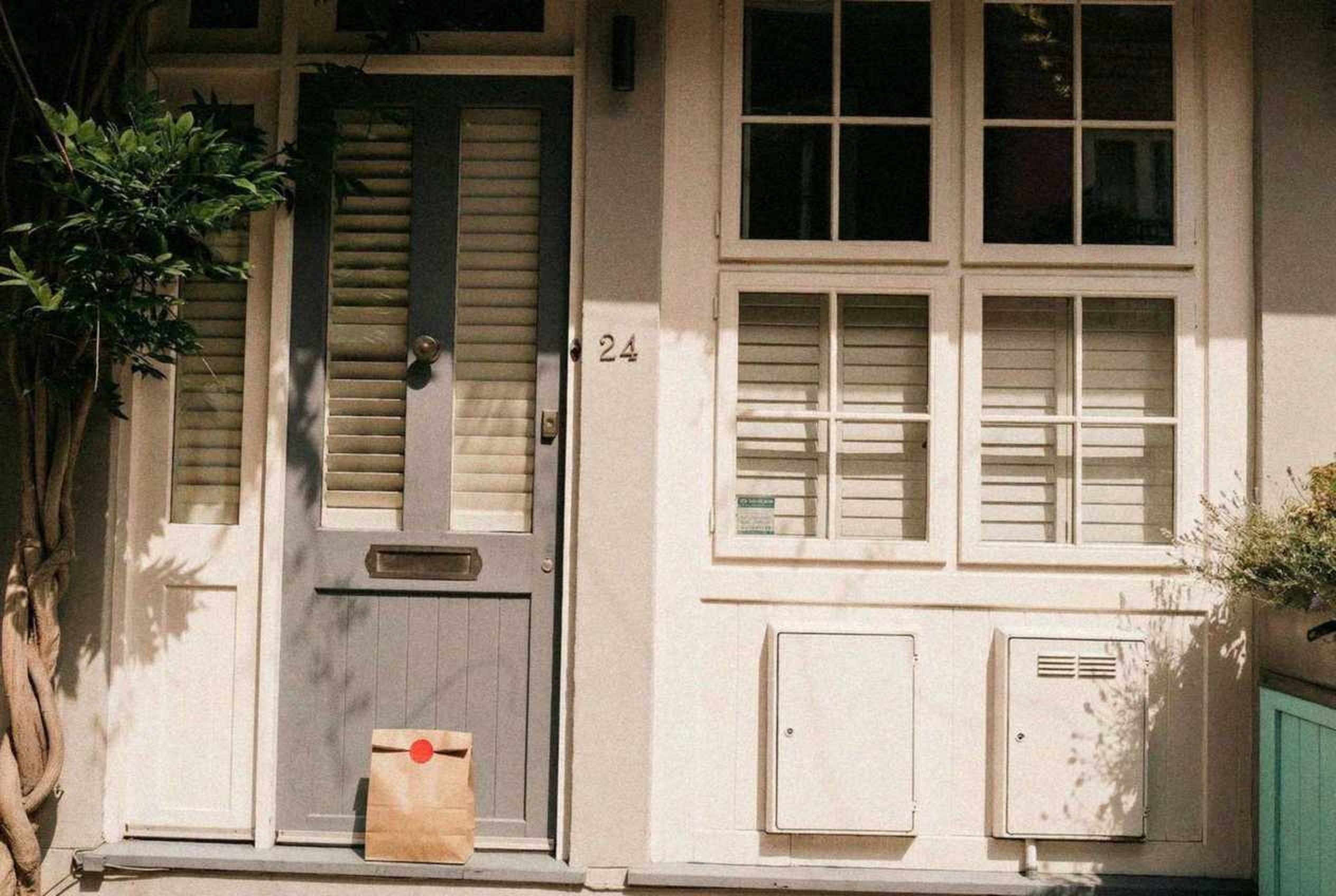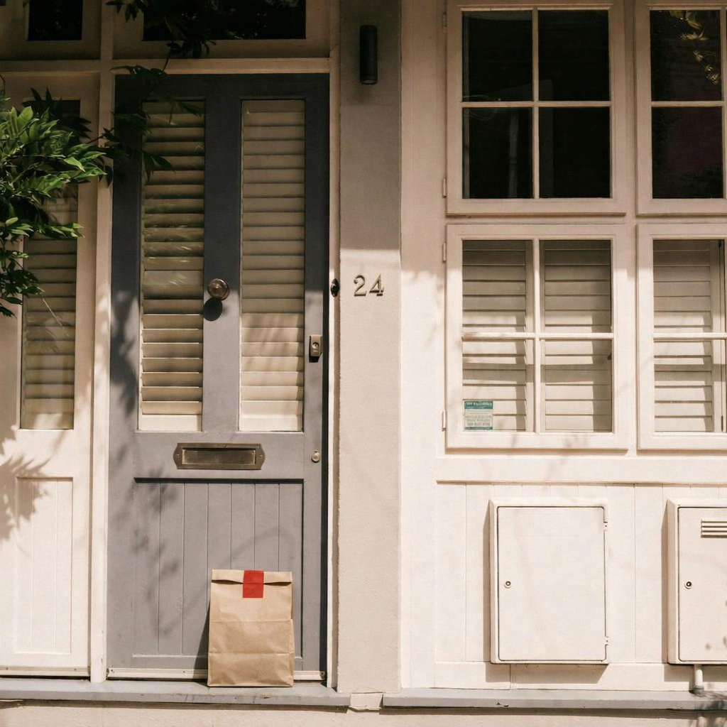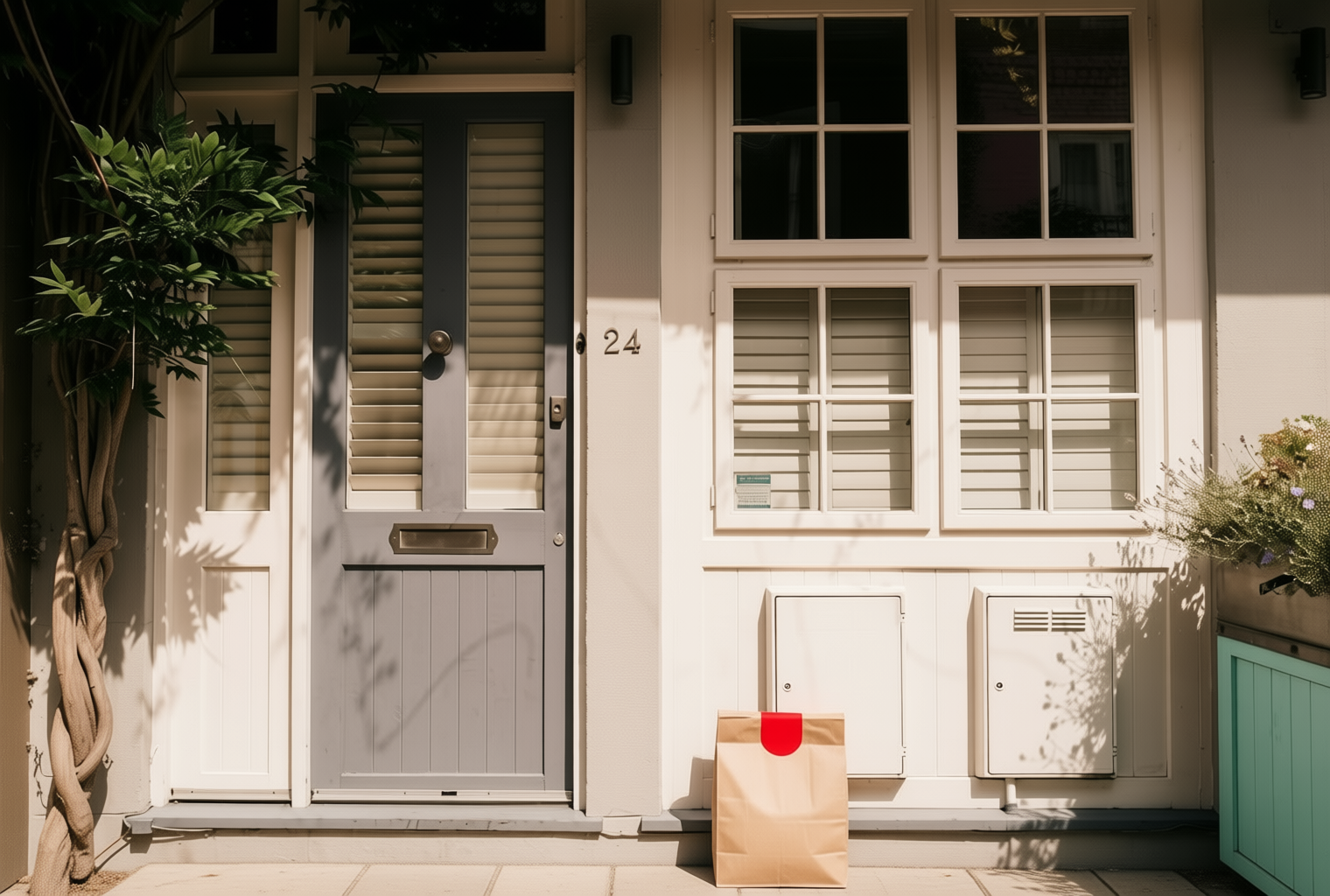 “In this existing photo, add a food delivery paper bag on the ground right in front of the door. The bag should be a small brown paper bag with a solid plain red sticker on the top keeping it closed. Preserve existing photo style and lighting as much as possible.”