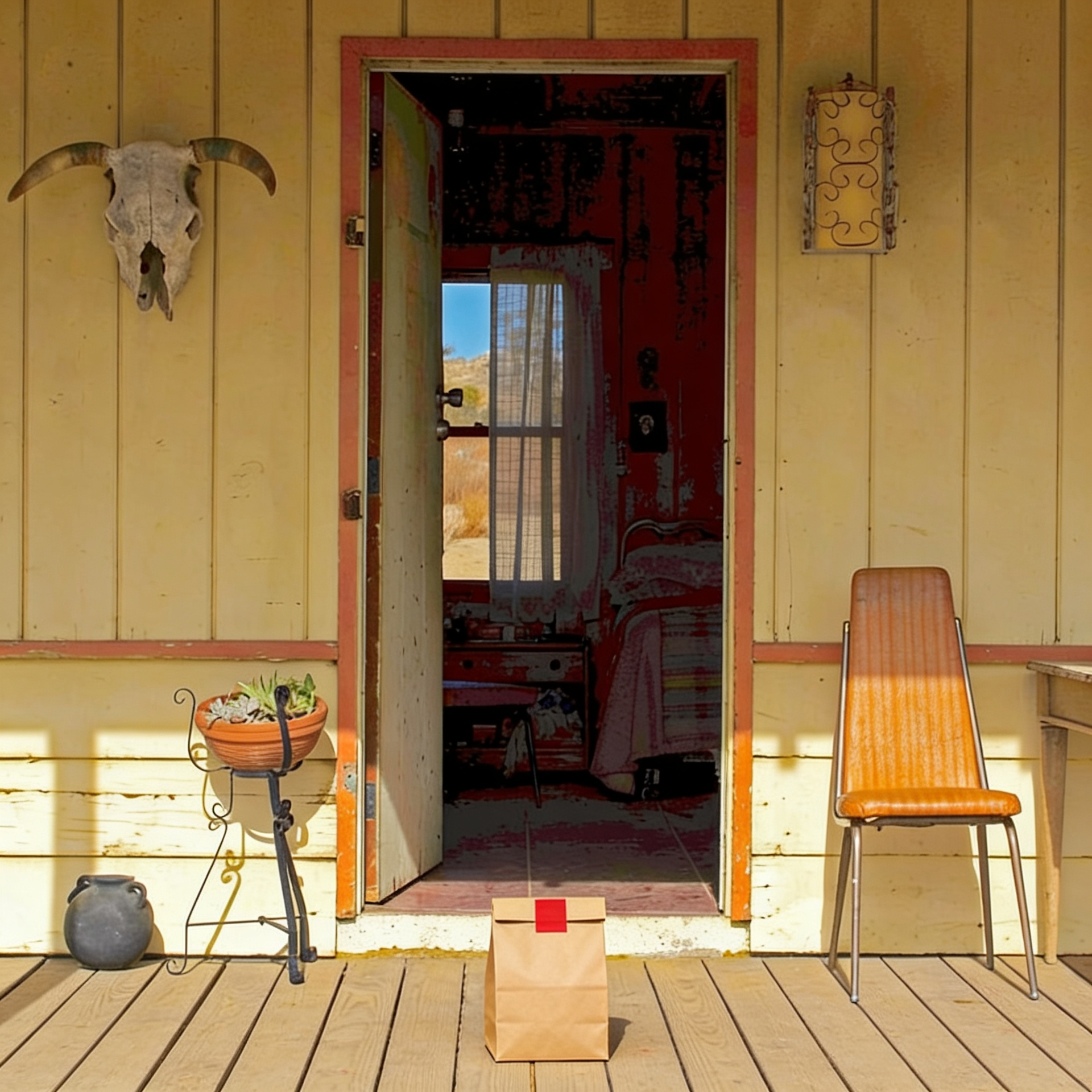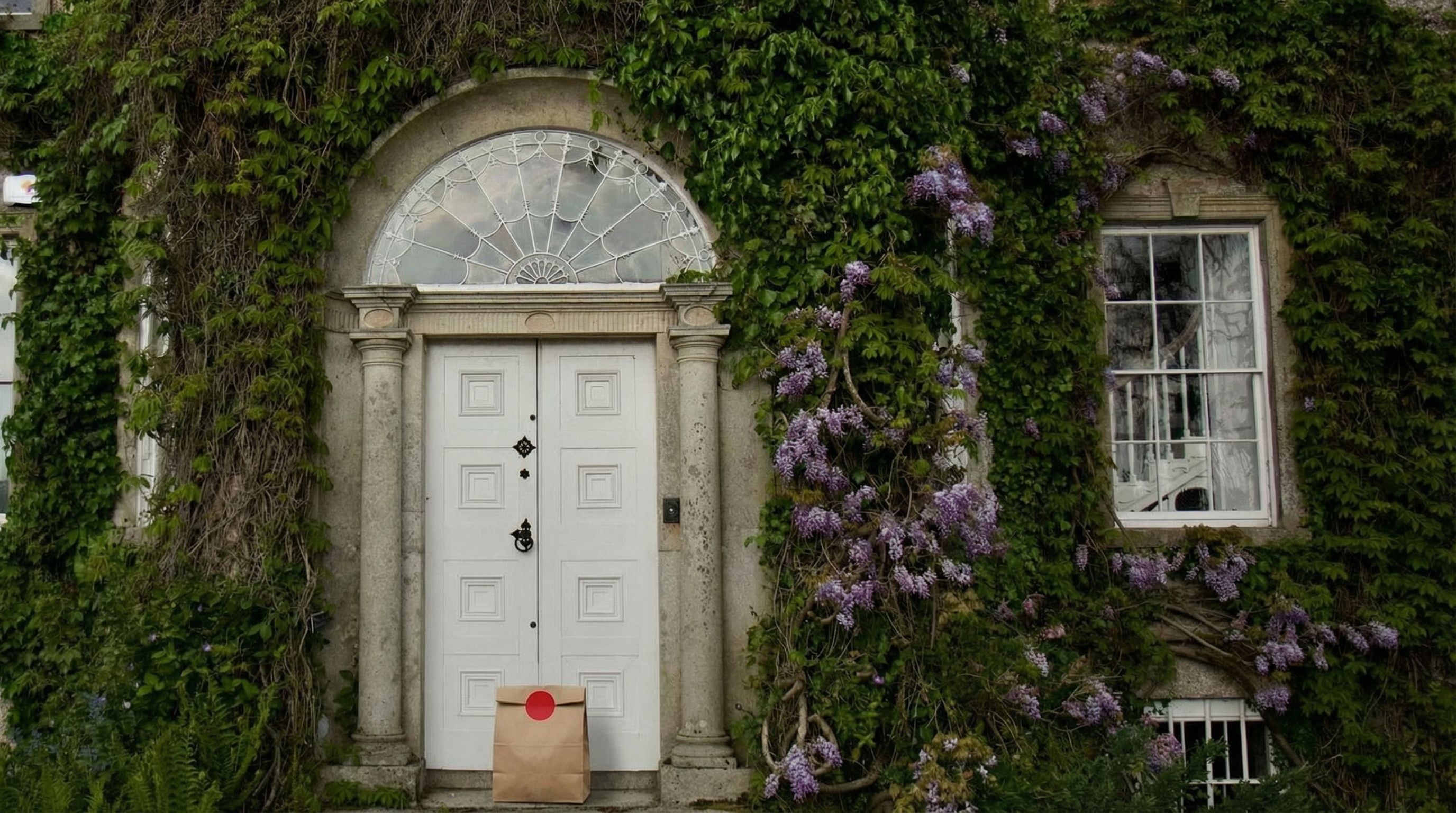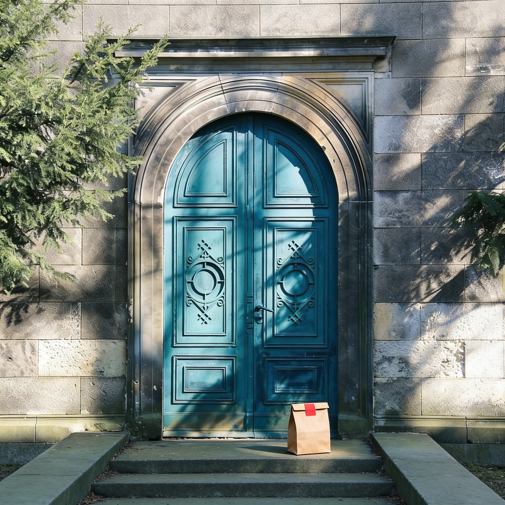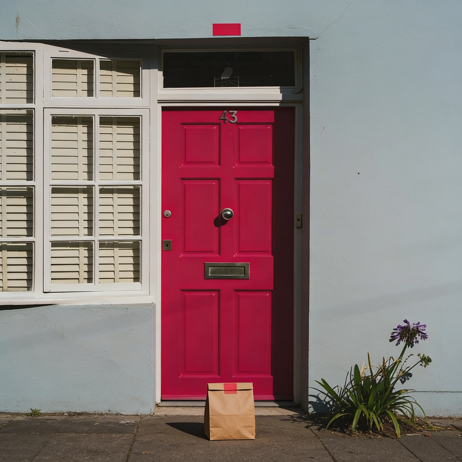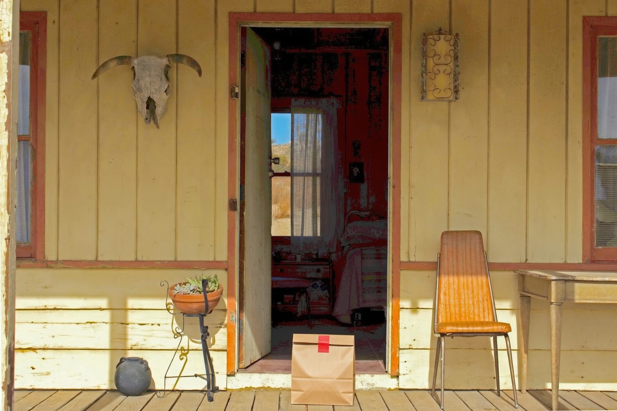 “In this existing photo, add a food delivery paper bag on the ground right in front of the door. The bag should be a small brown paper bag with a solid plain red sticker on the top keeping it closed. Preserve existing photo style and lighting as much as possible.”
