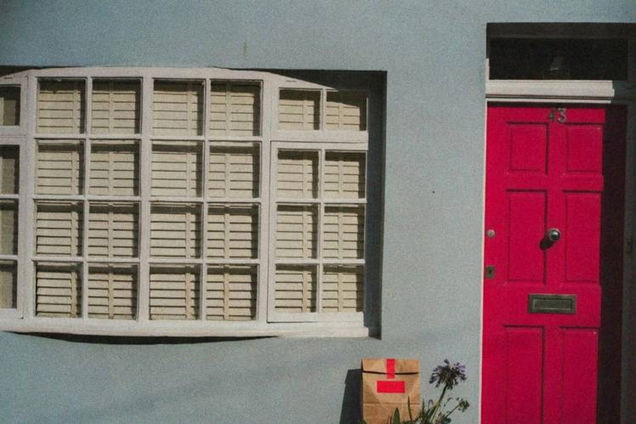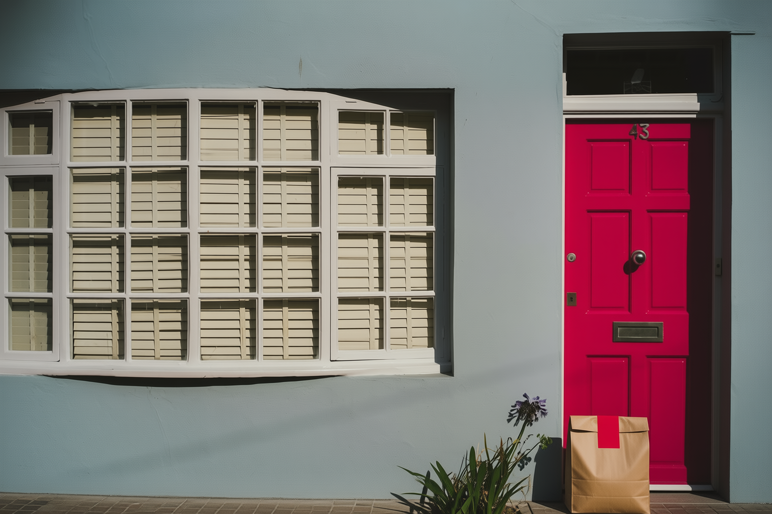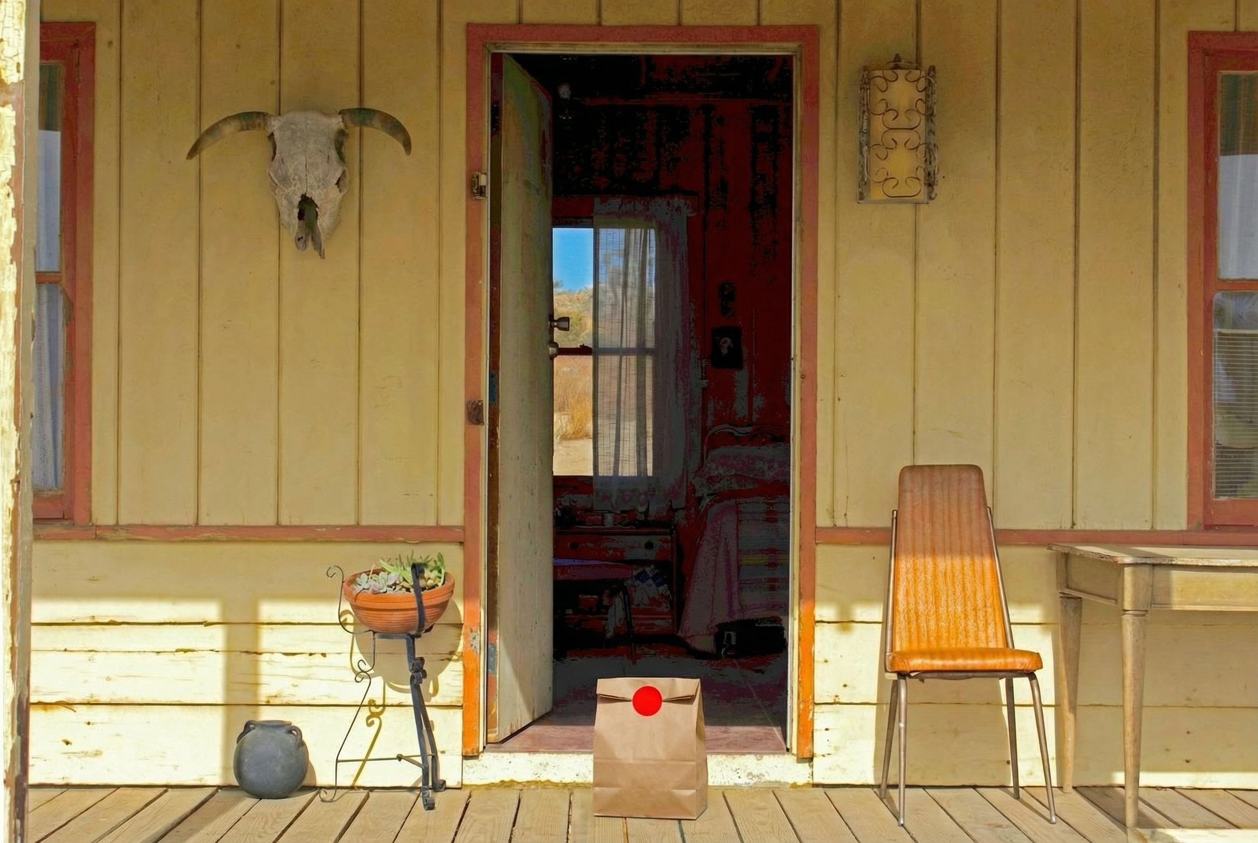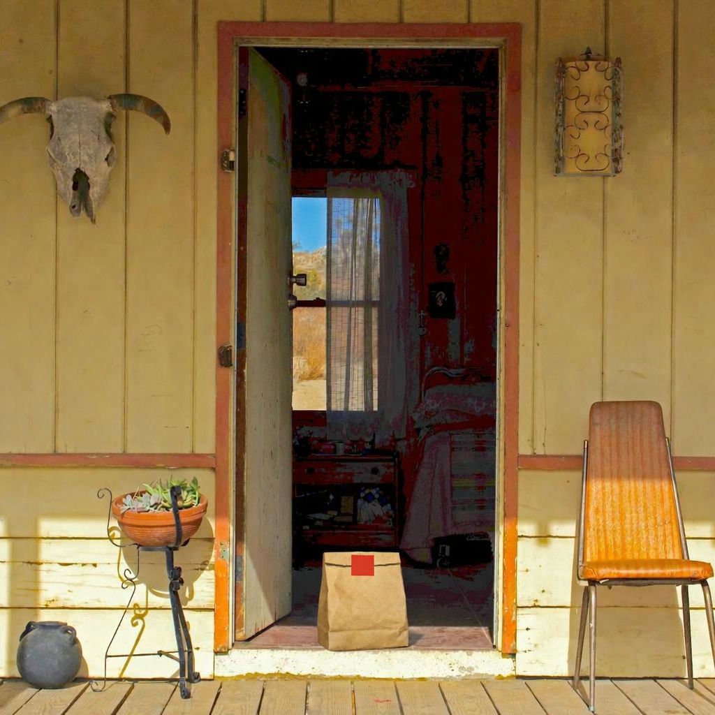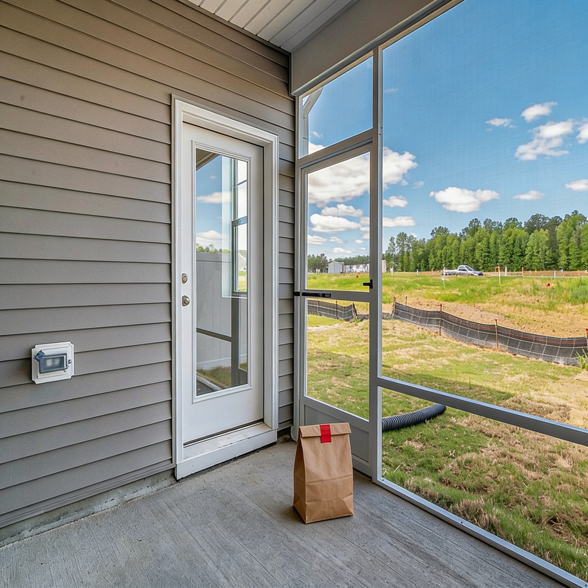 “In this existing photo, add a food delivery paper bag on the ground right in front of the door. The bag should be a small brown paper bag with a solid plain red sticker on the top keeping it closed. Preserve existing photo style and lighting as much as possible.”