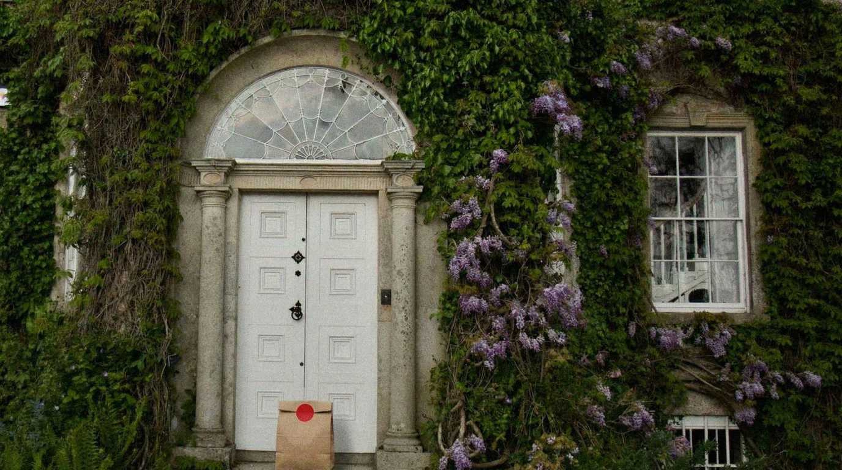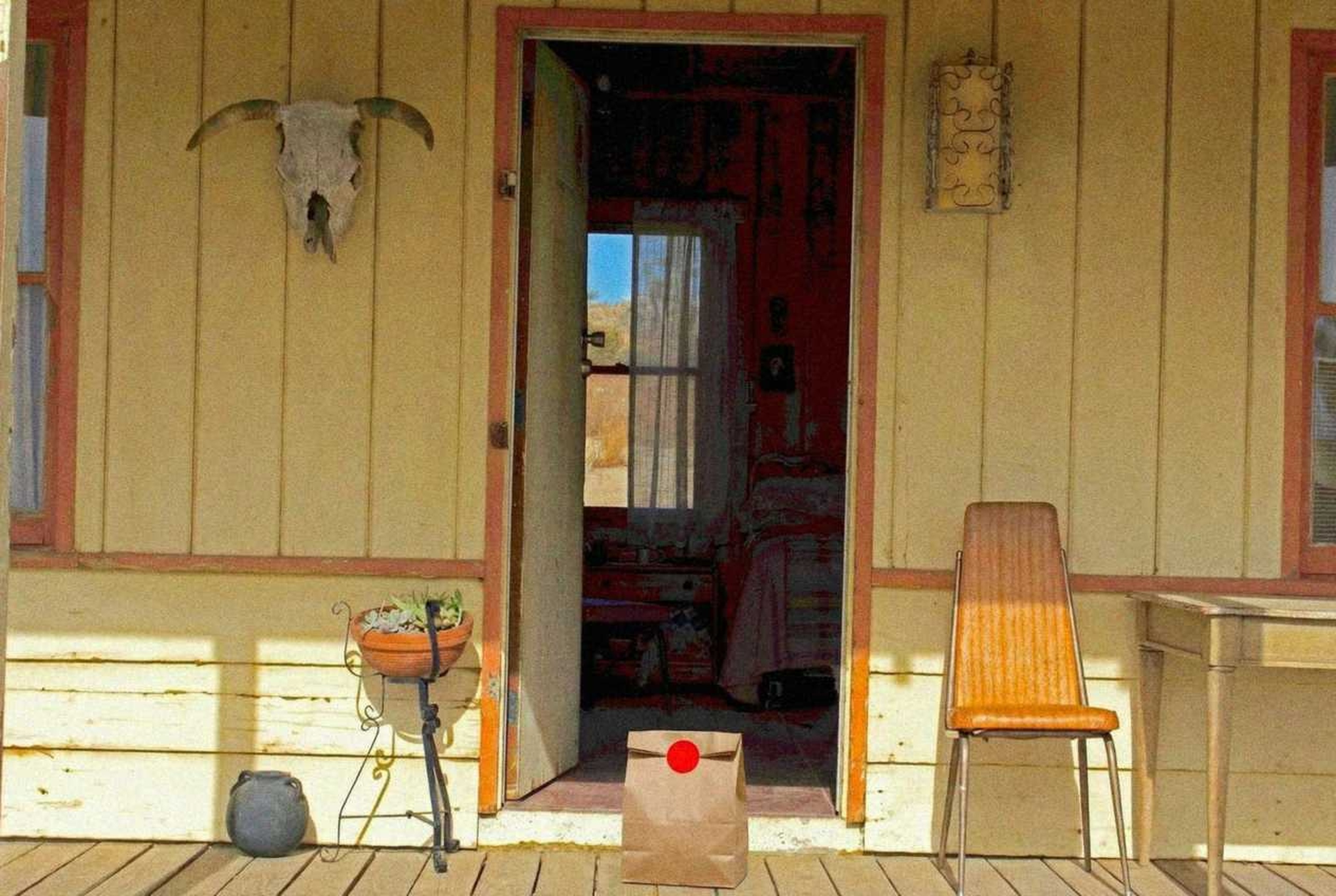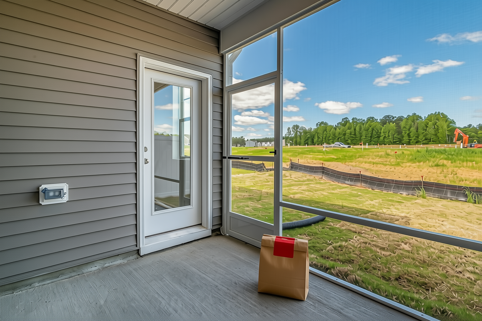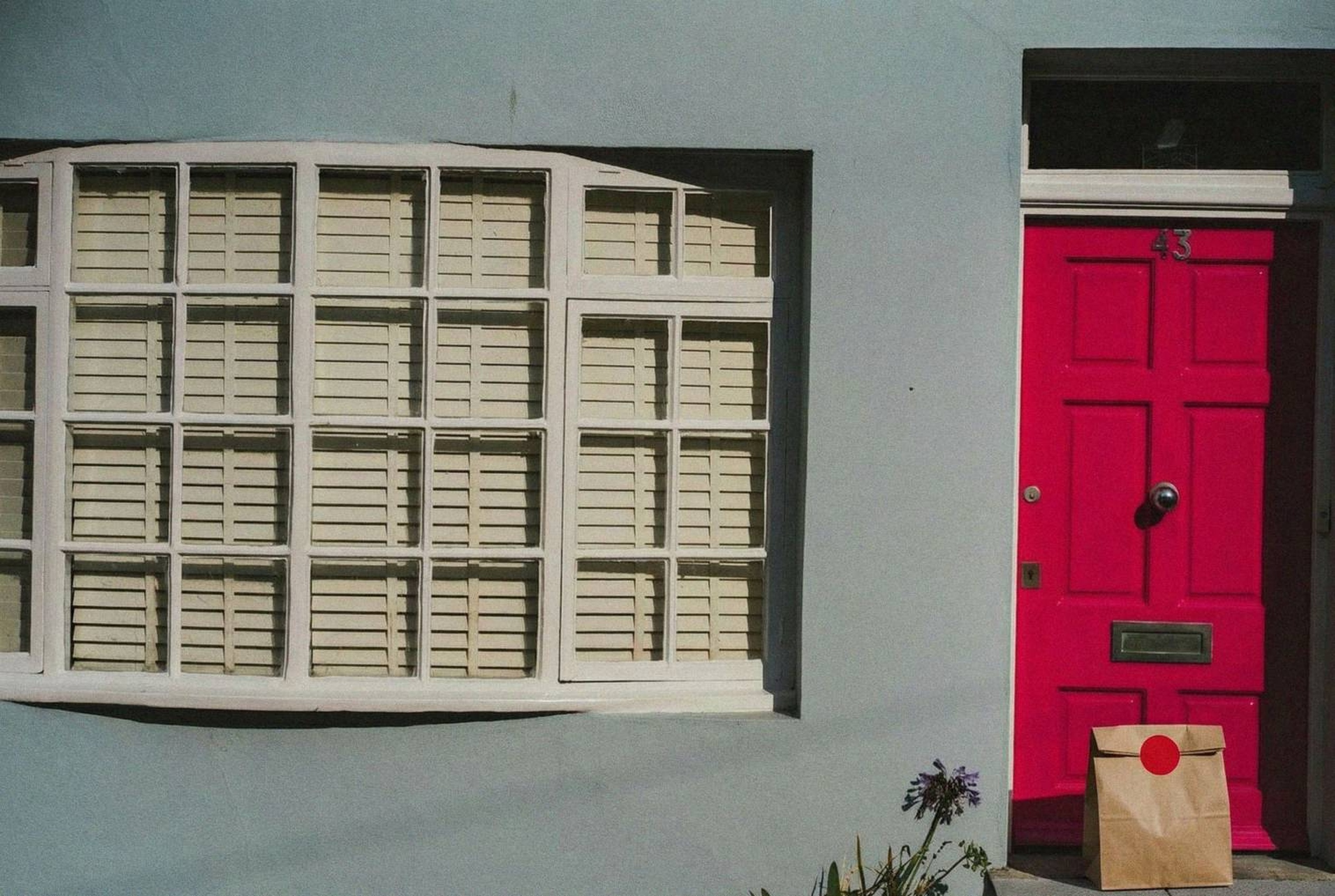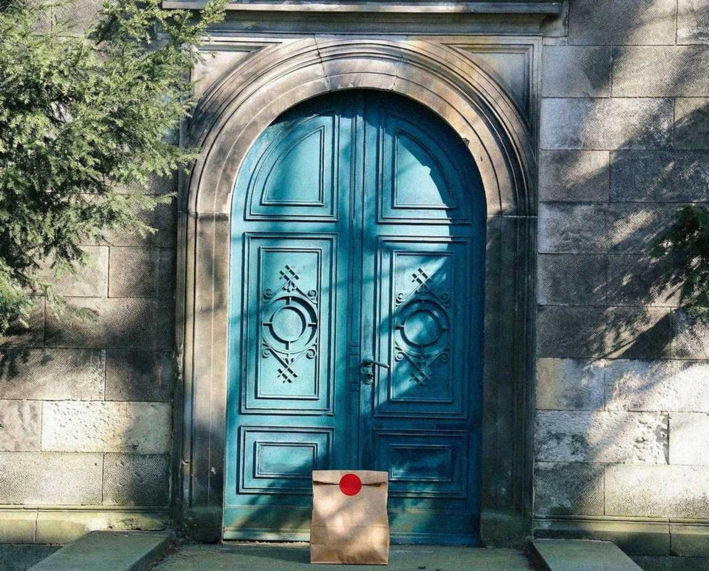 “In this existing photo, add a food delivery paper bag on the ground right in front of the door. The bag should be a small brown paper bag with a solid plain red sticker on the top keeping it closed. Preserve existing photo style and lighting as much as possible.”