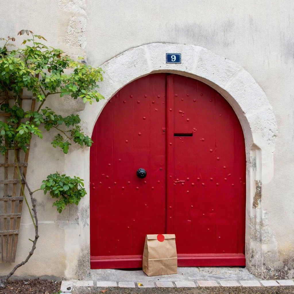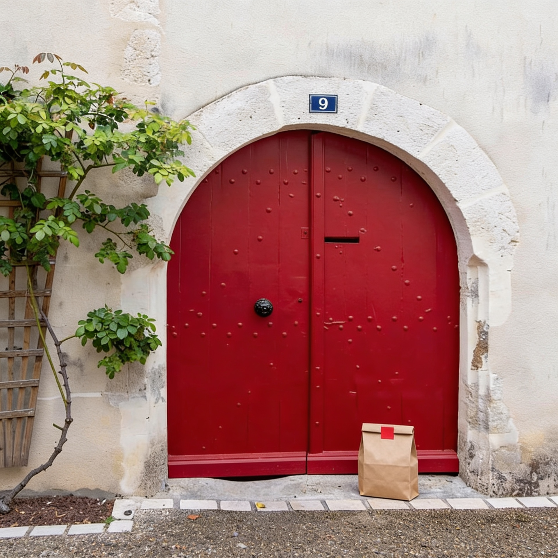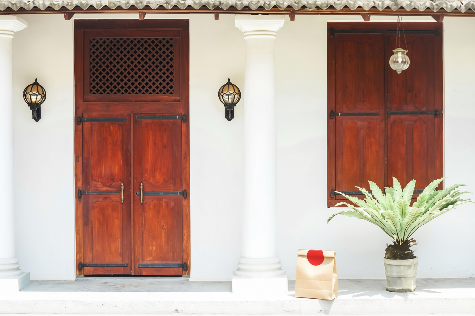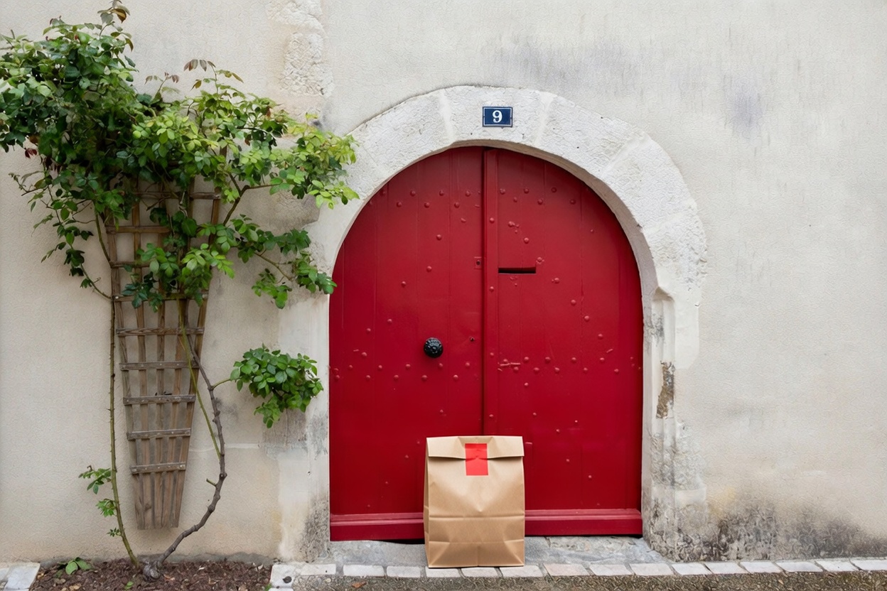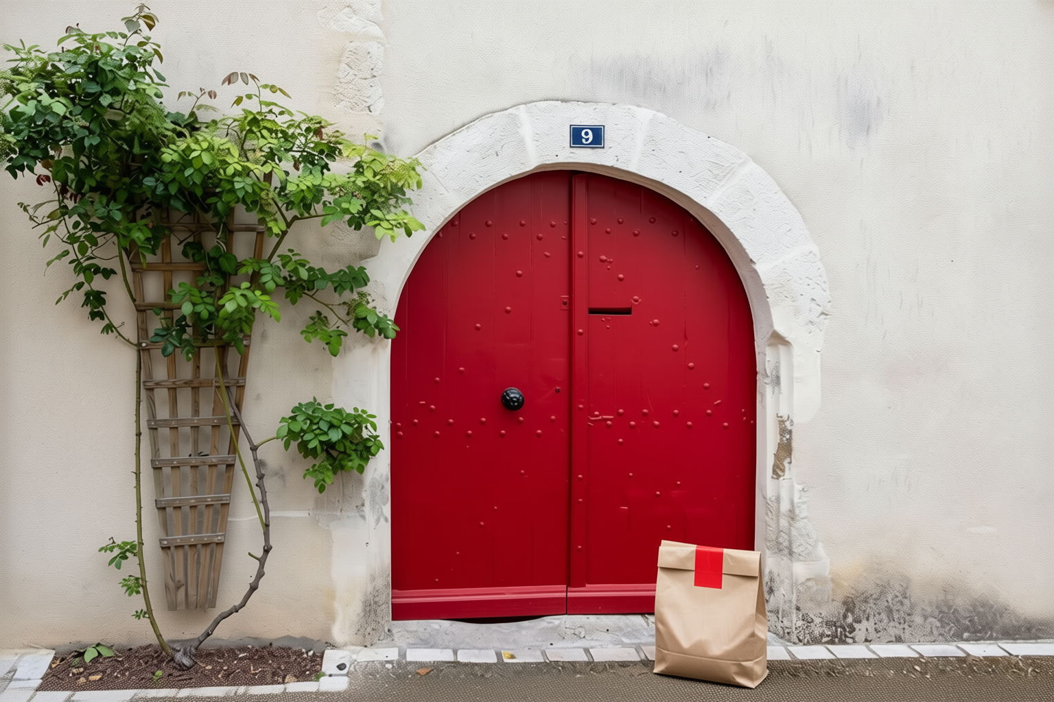 “In this existing photo, add a food delivery paper bag on the ground right in front of the door. The bag should be a small brown paper bag with a solid plain red sticker on the top keeping it closed. Preserve existing photo style and lighting as much as possible.”