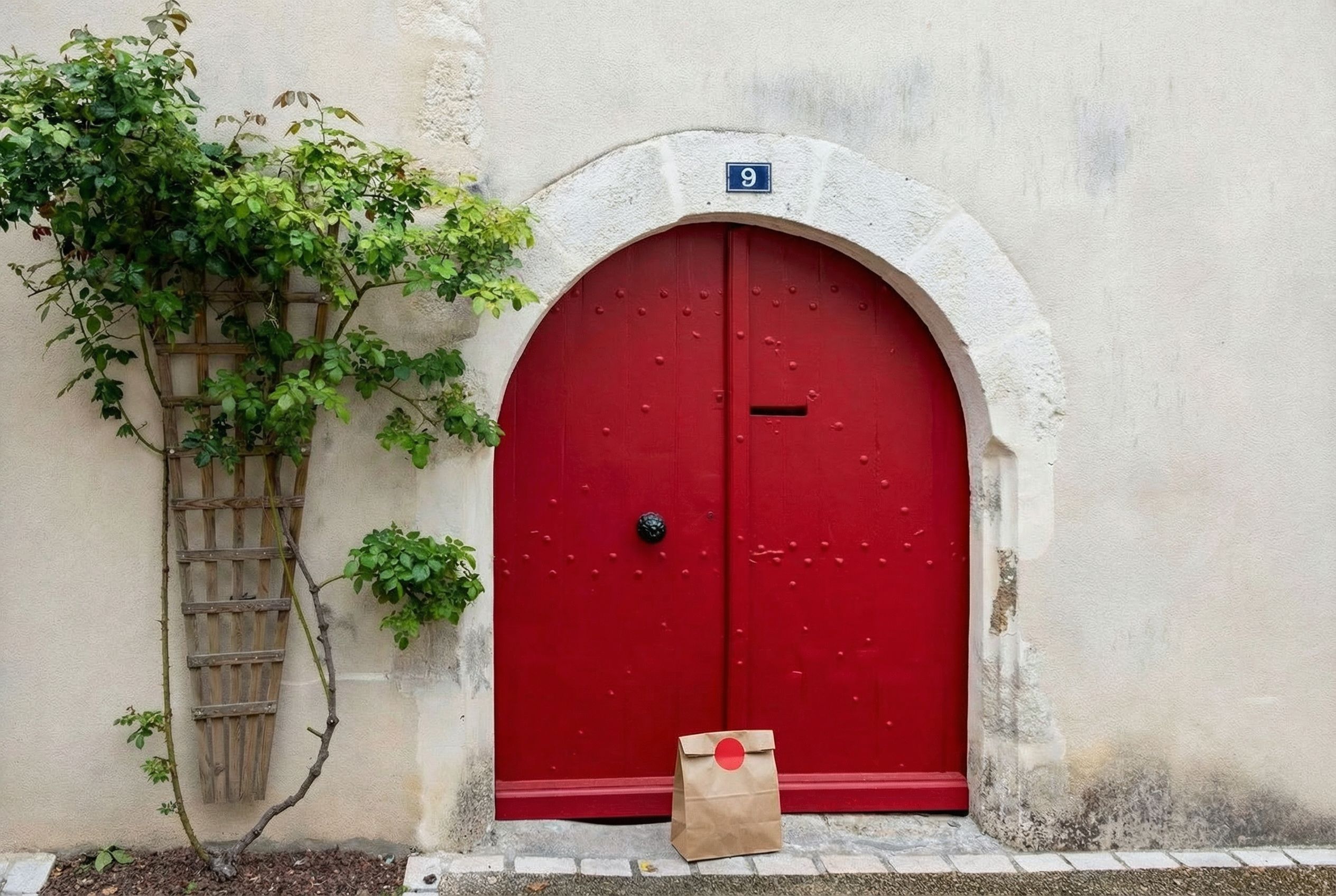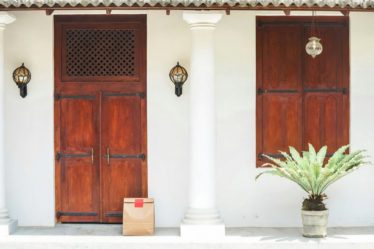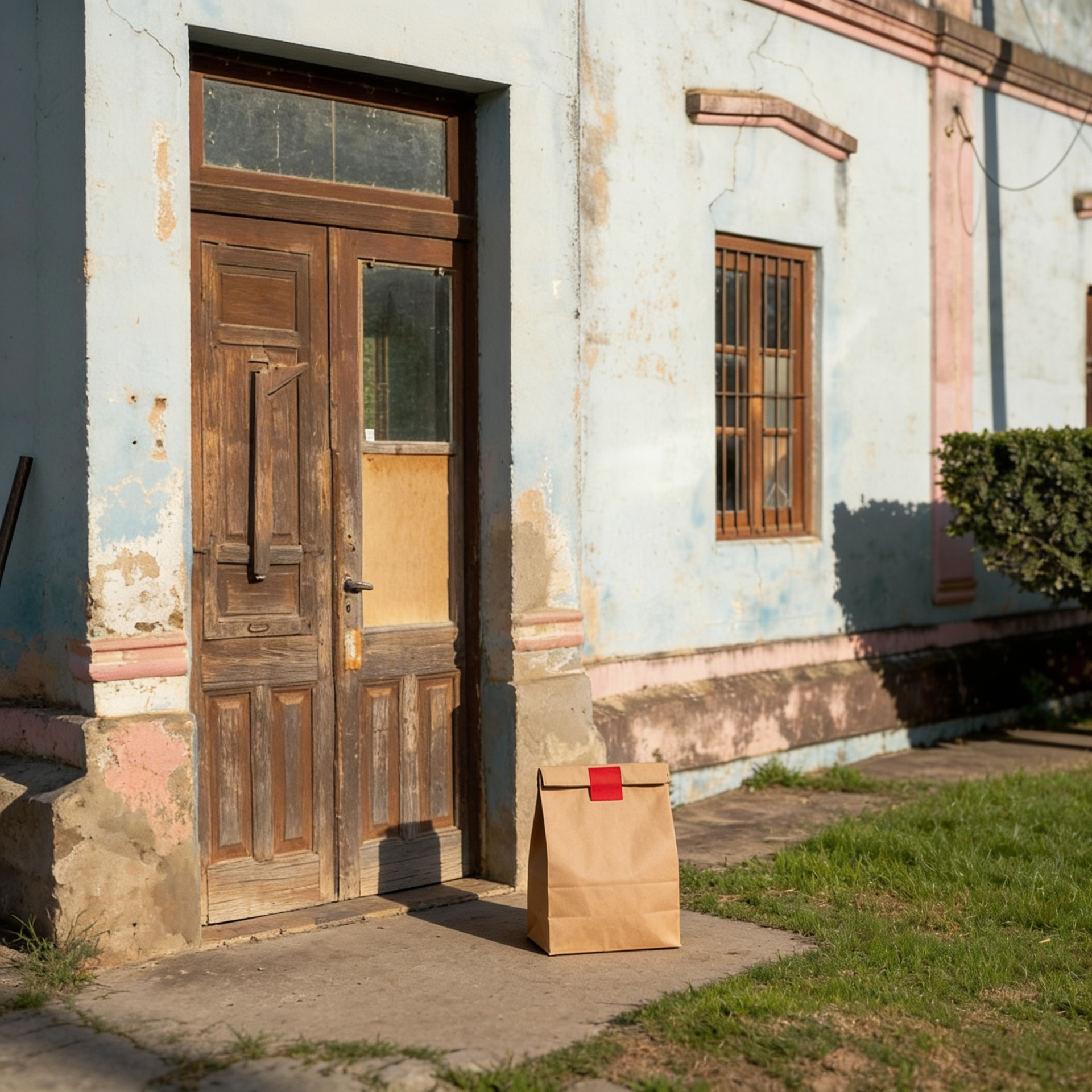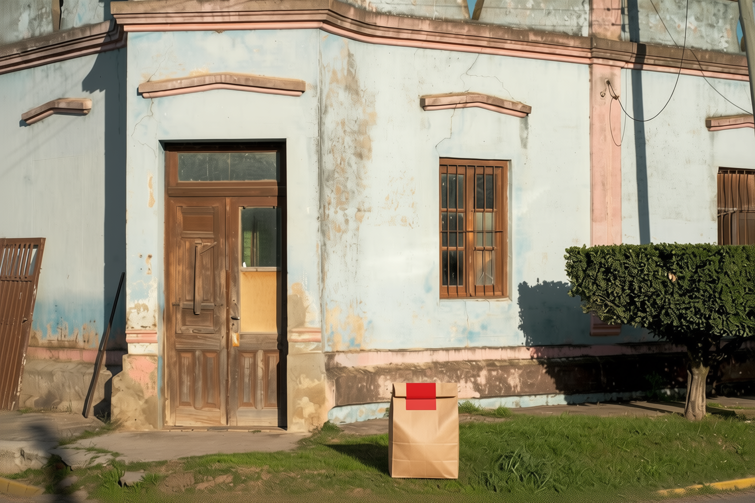 “In this existing photo, add a food delivery paper bag on the ground right in front of the door. The bag should be a small brown paper bag with a solid plain red sticker on the top keeping it closed. Preserve existing photo style and lighting as much as possible.”