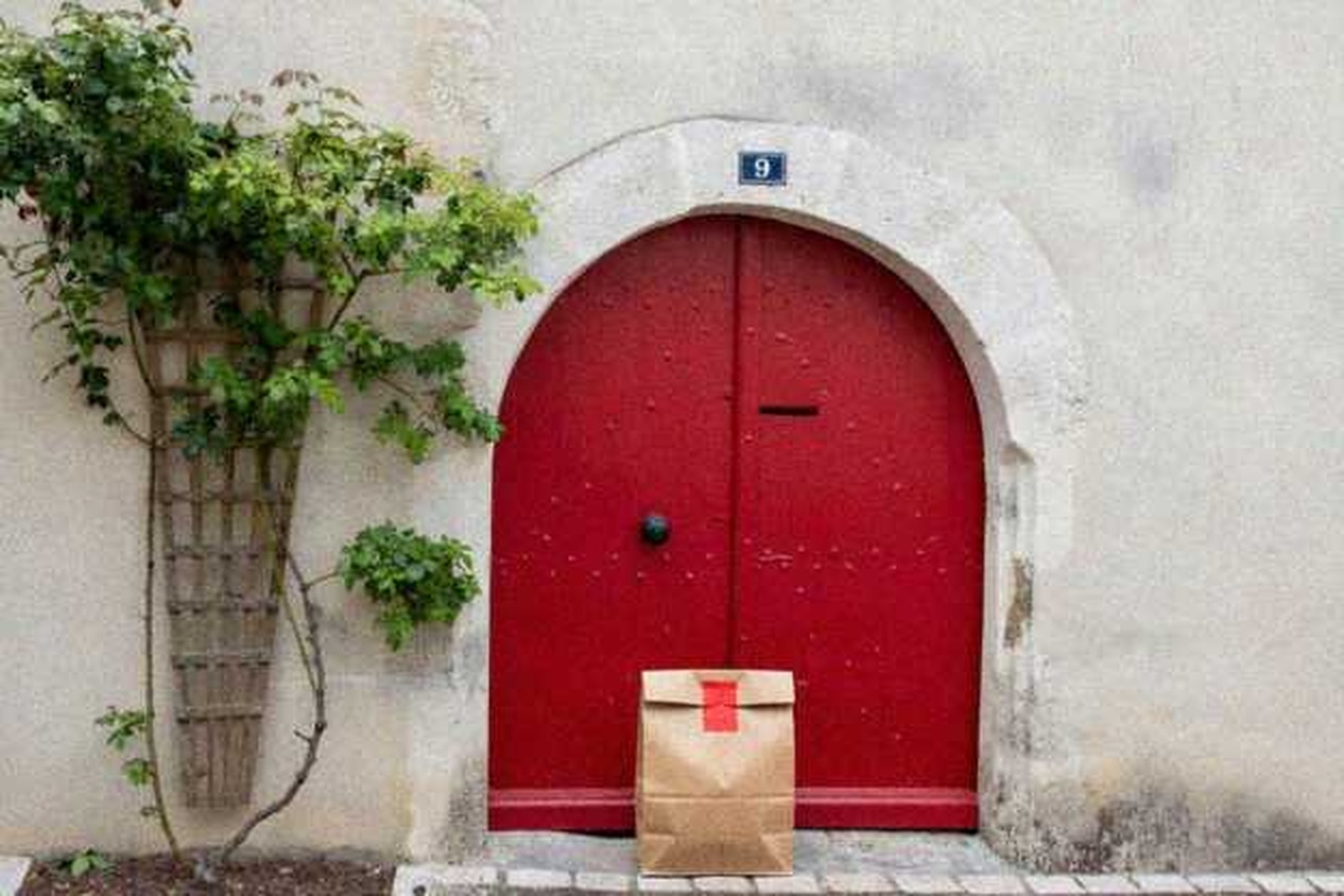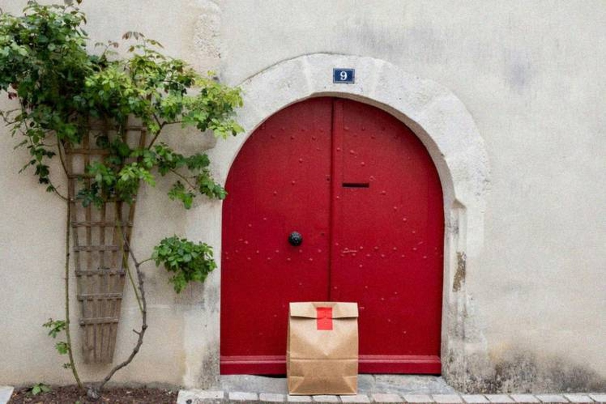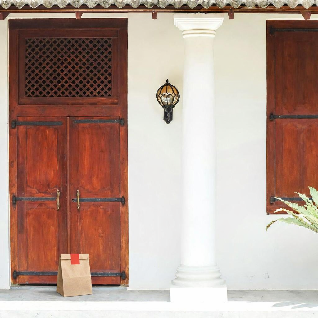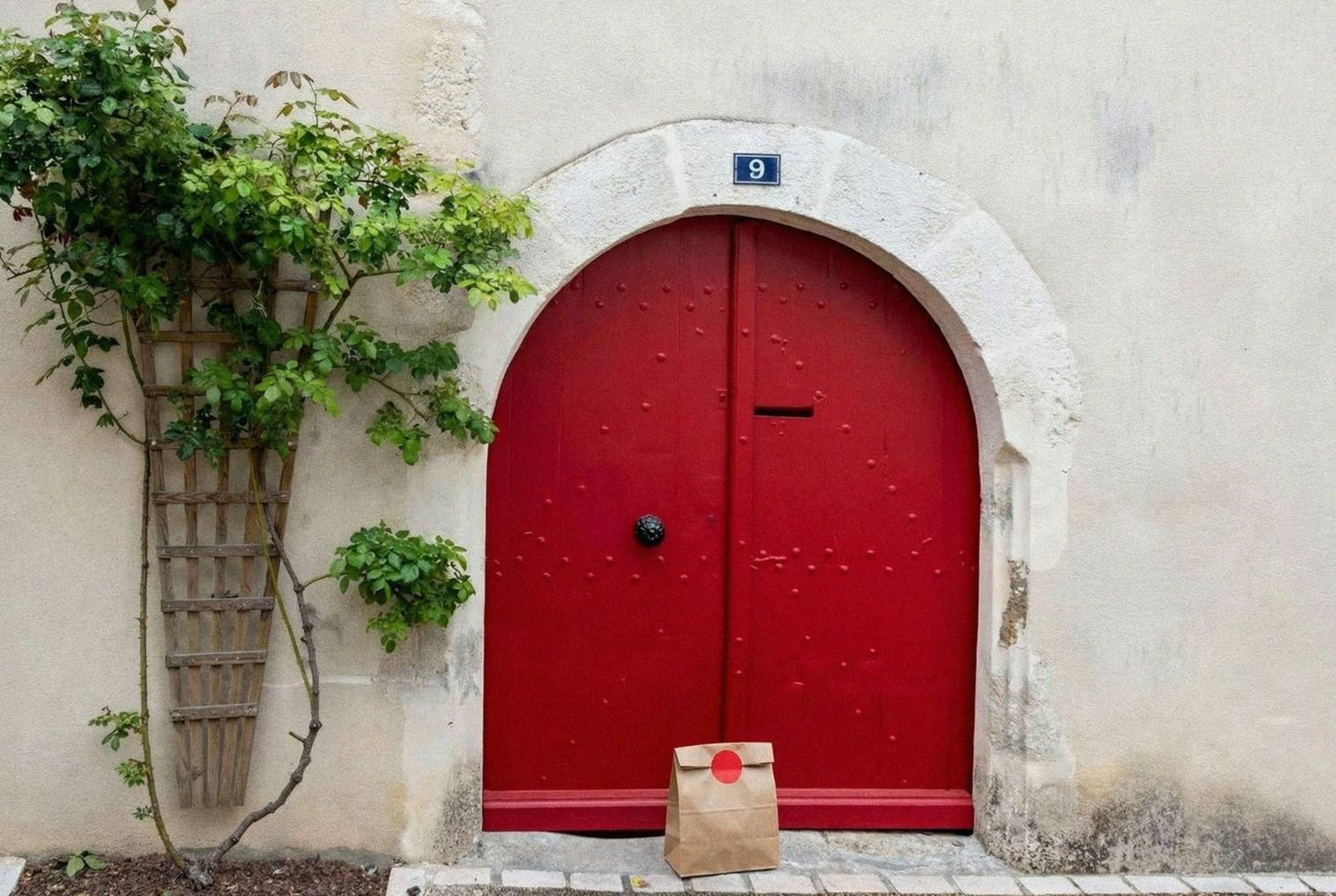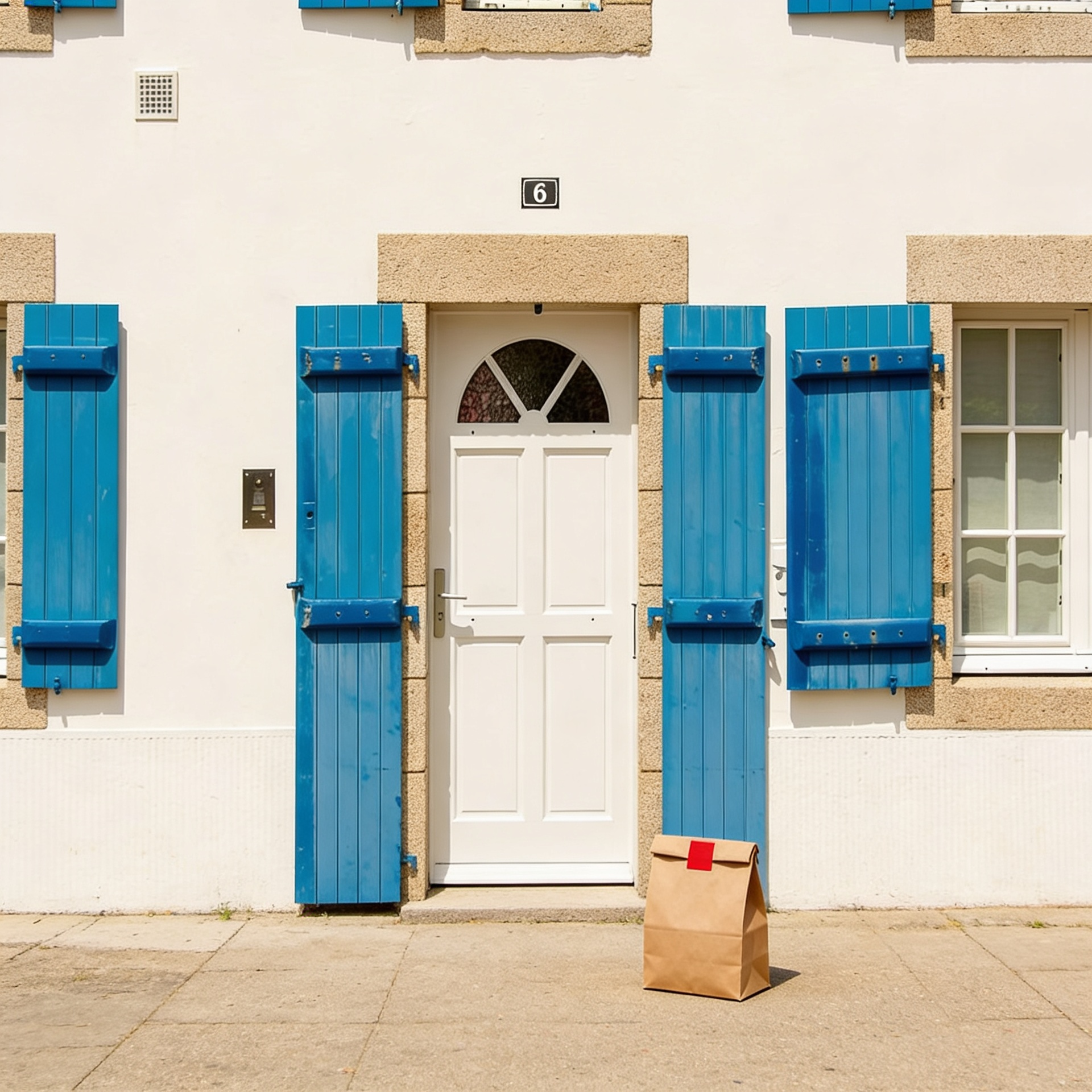 “In this existing photo, add a food delivery paper bag on the ground right in front of the door. The bag should be a small brown paper bag with a solid plain red sticker on the top keeping it closed. Preserve existing photo style and lighting as much as possible.”