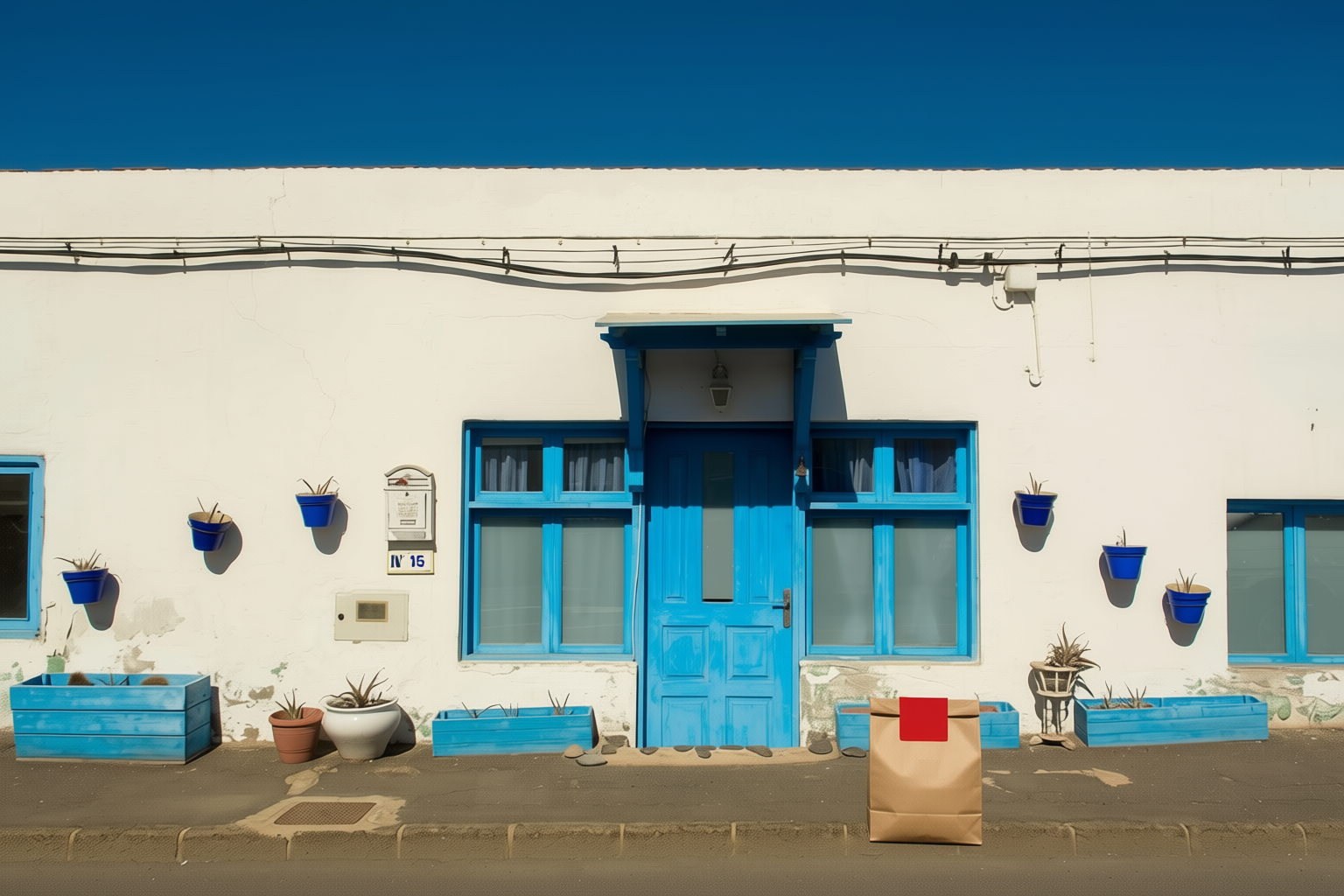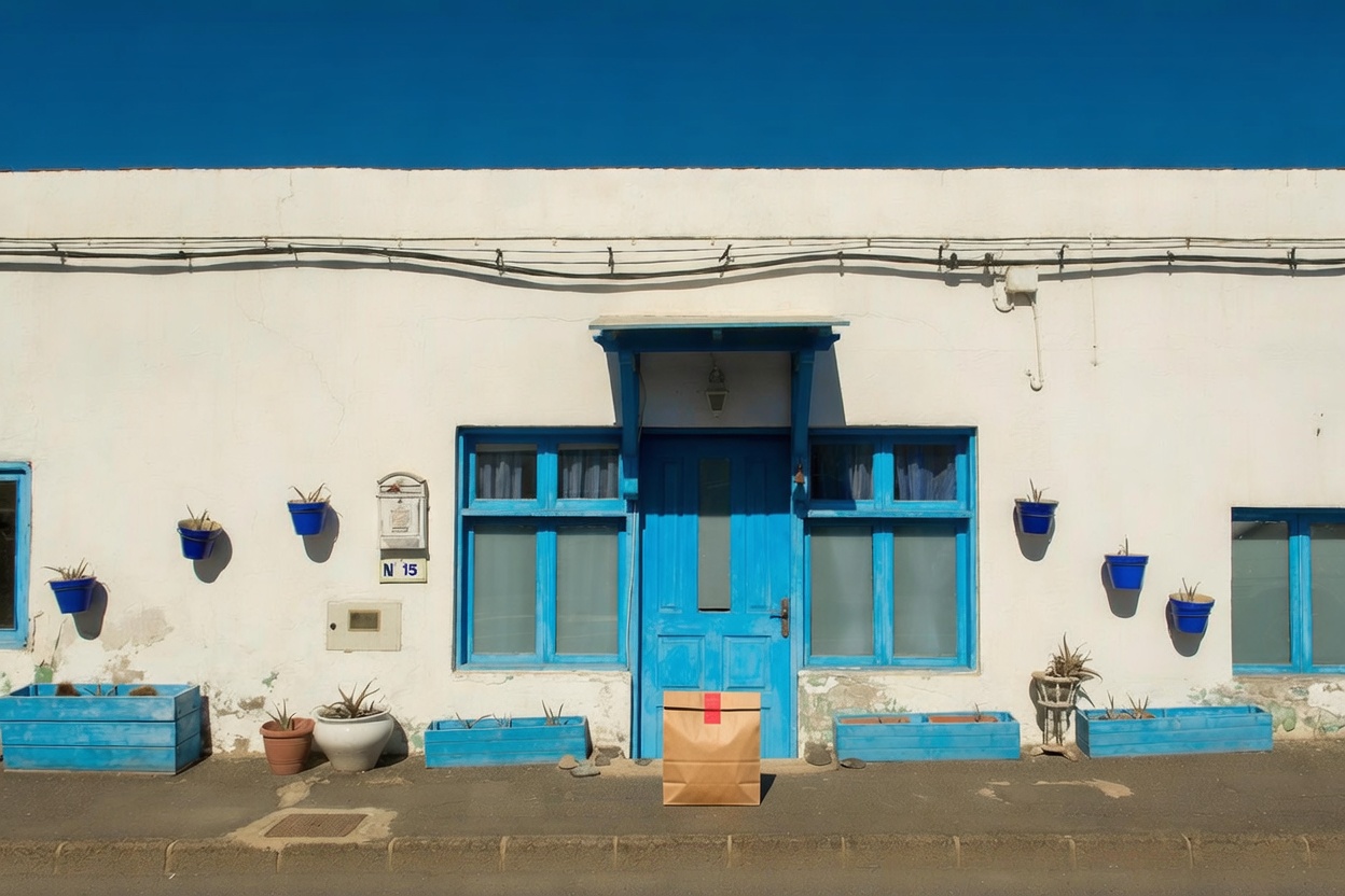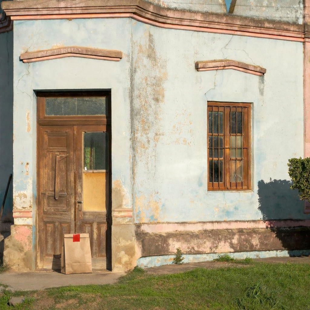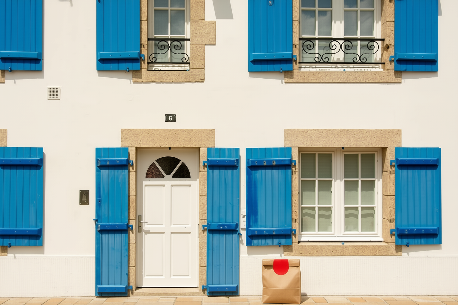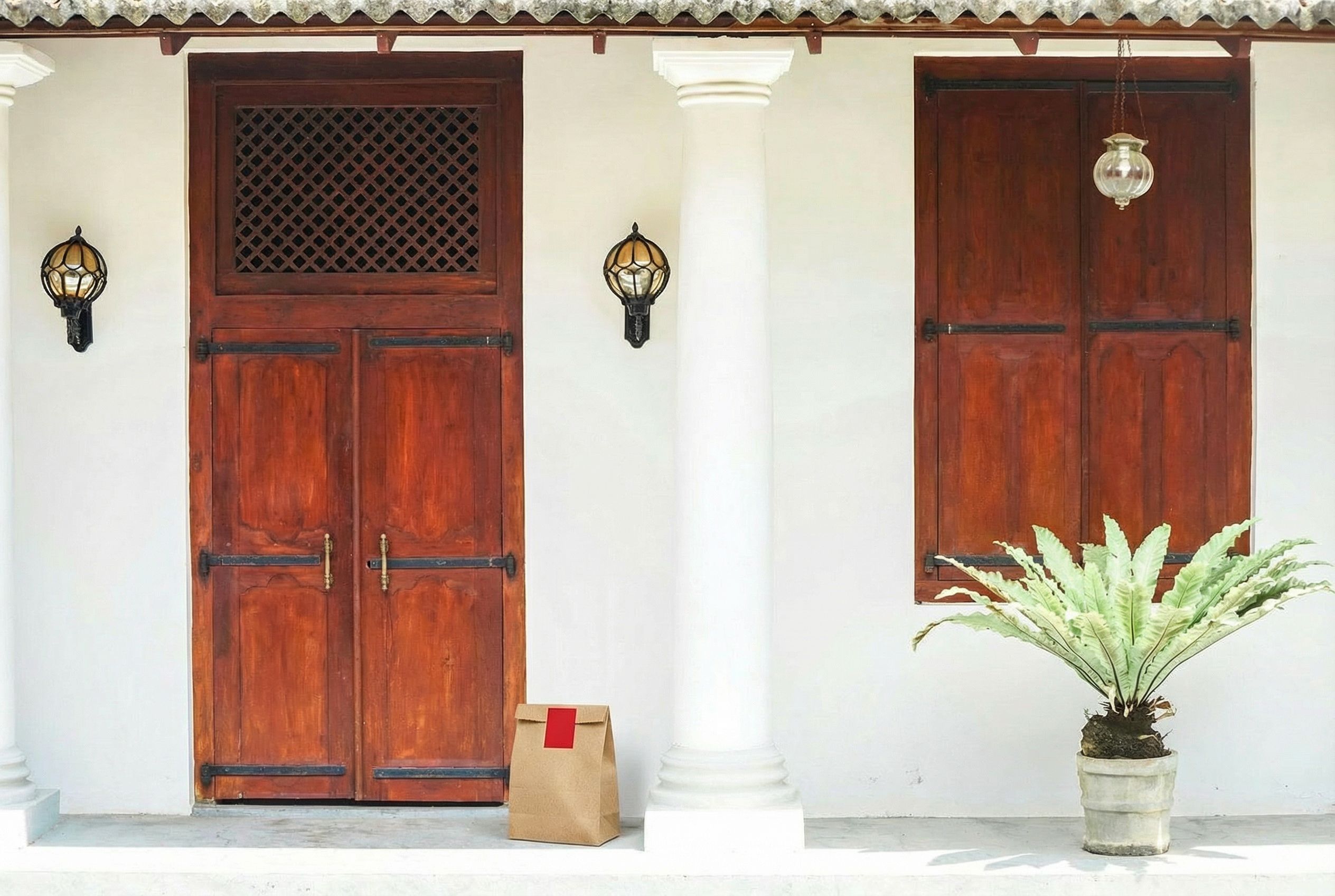 “In this existing photo, add a food delivery paper bag on the ground right in front of the door. The bag should be a small brown paper bag with a solid plain red sticker on the top keeping it closed. Preserve existing photo style and lighting as much as possible.”