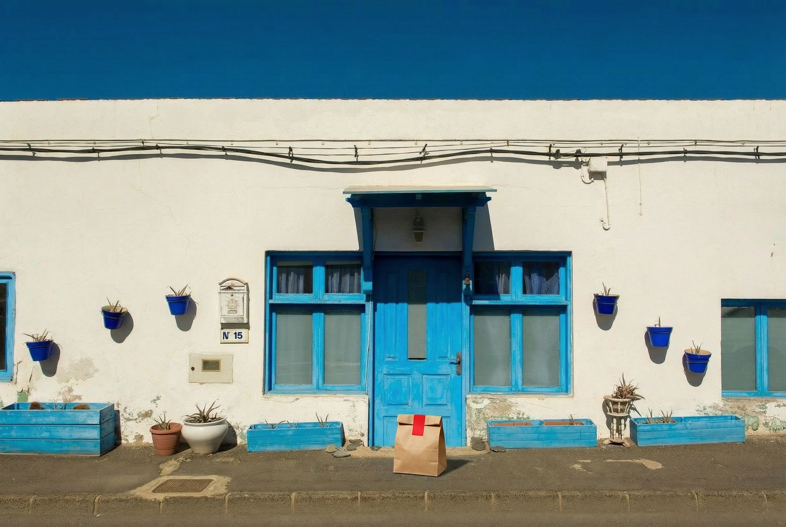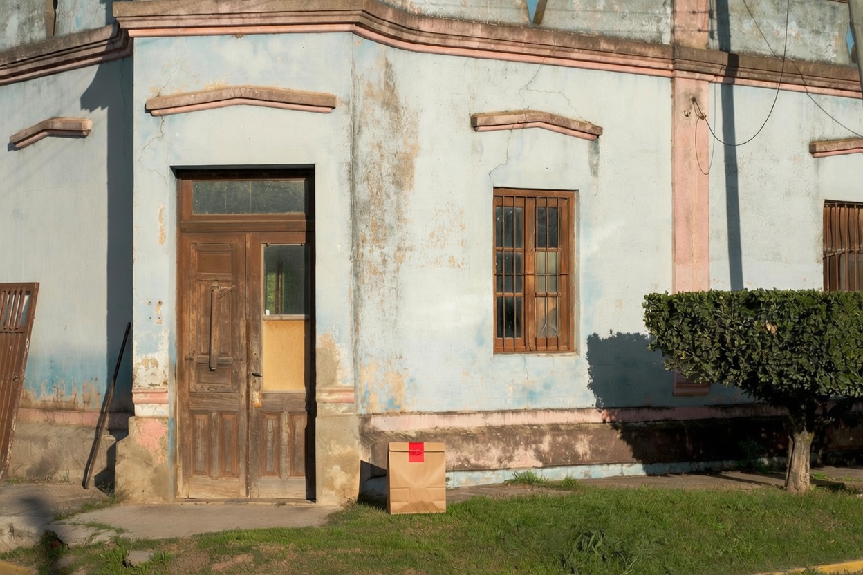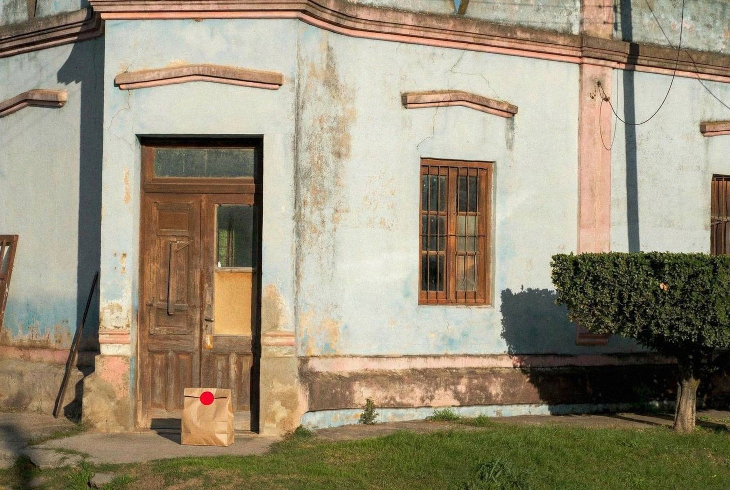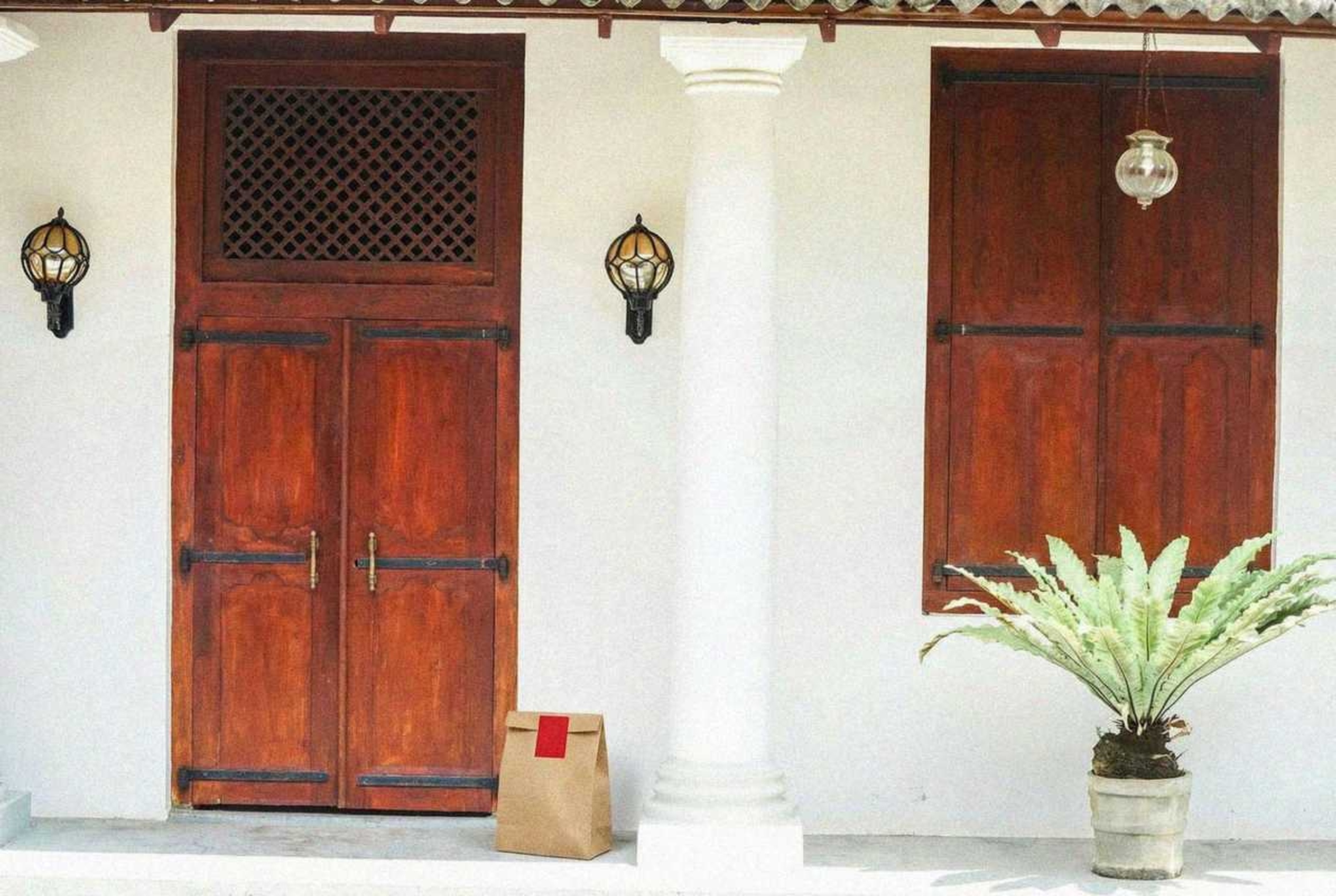“In this existing photo, add a food delivery paper bag on the ground right in front of the door. The bag should be a small brown paper bag with a solid plain red sticker on the top keeping it closed. Preserve existing photo style and lighting as much as possible.”