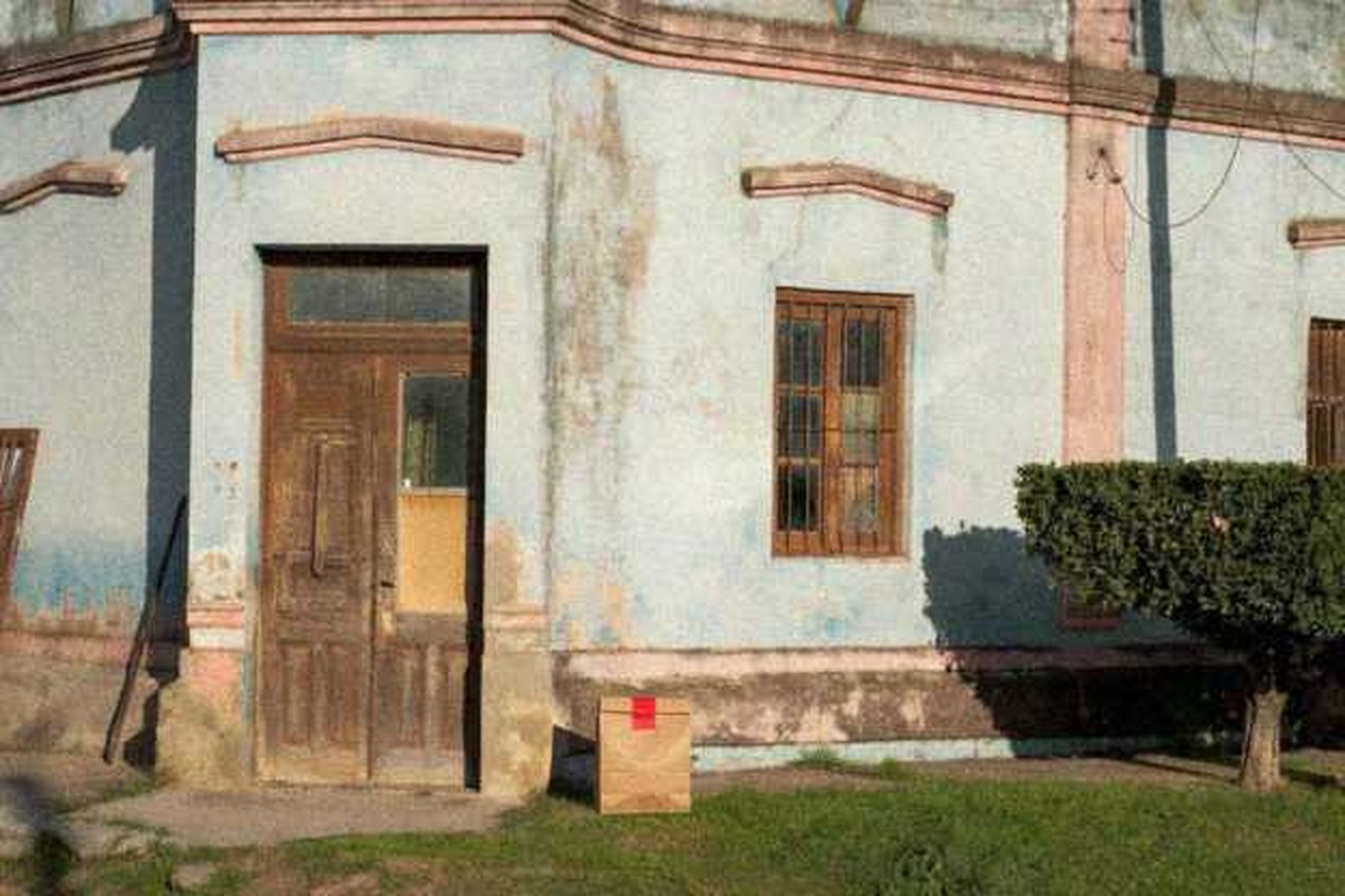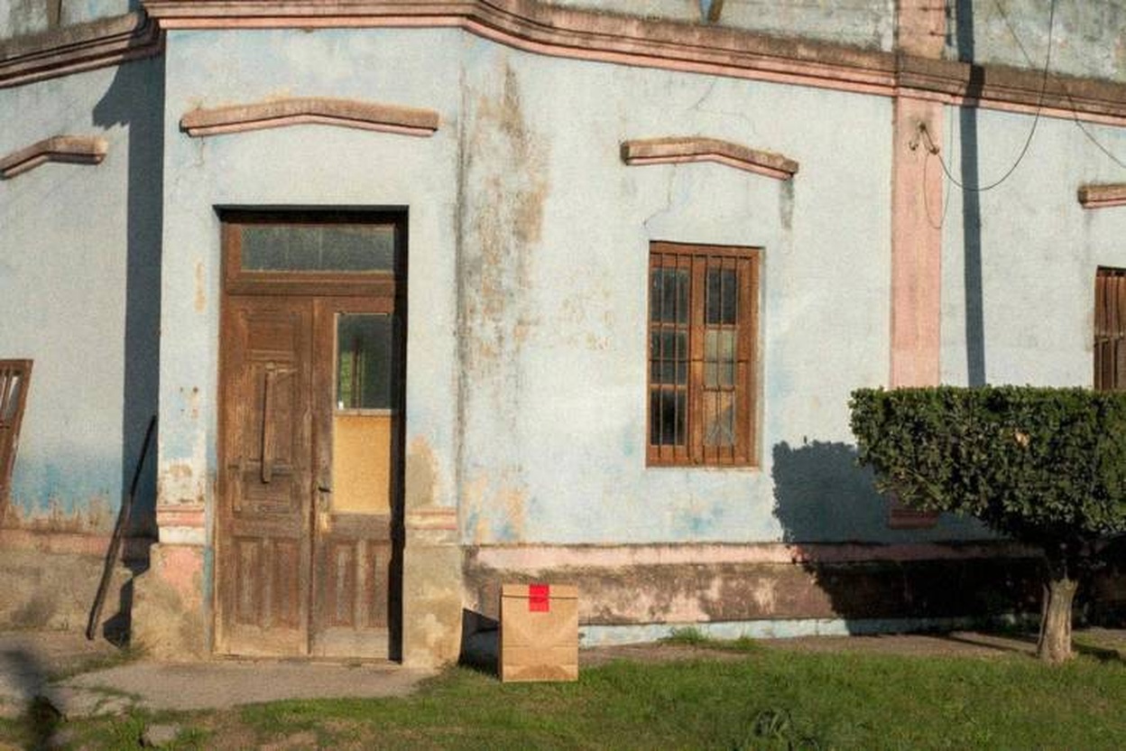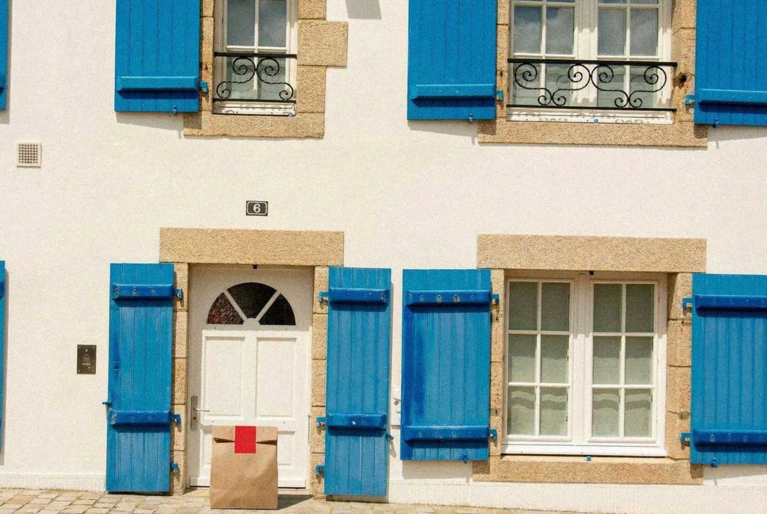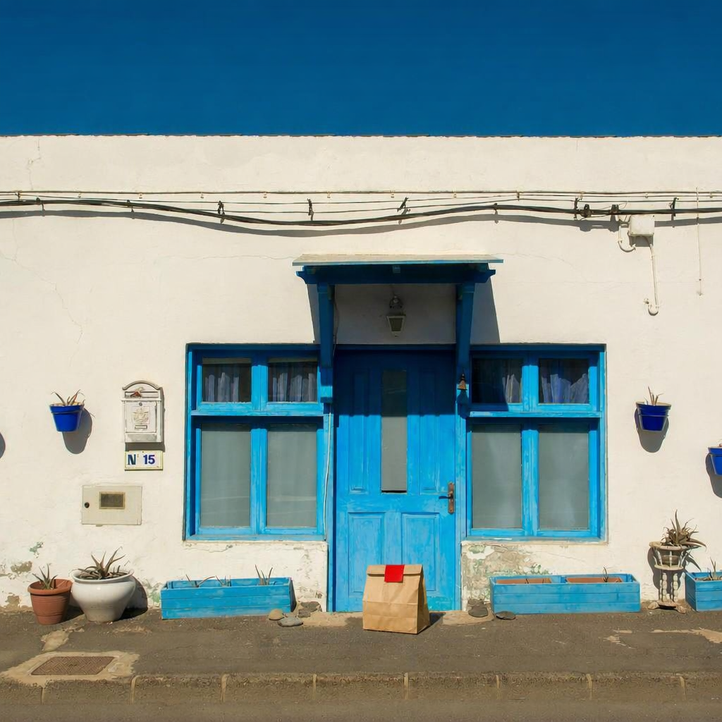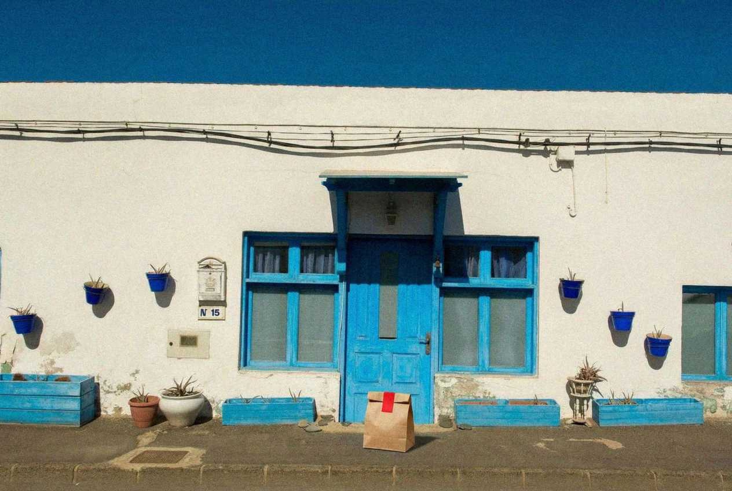 “In this existing photo, add a food delivery paper bag on the ground right in front of the door. The bag should be a small brown paper bag with a solid plain red sticker on the top keeping it closed. Preserve existing photo style and lighting as much as possible.”