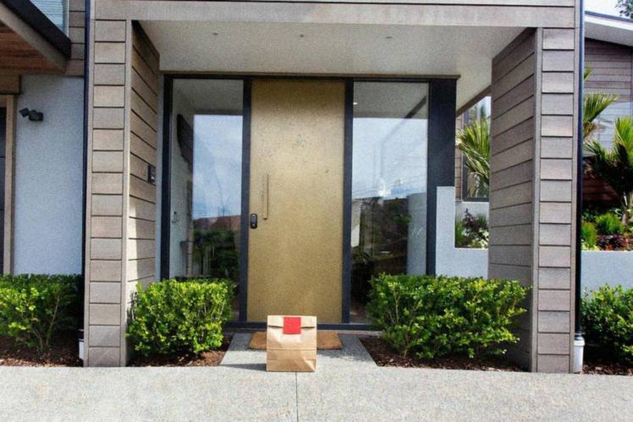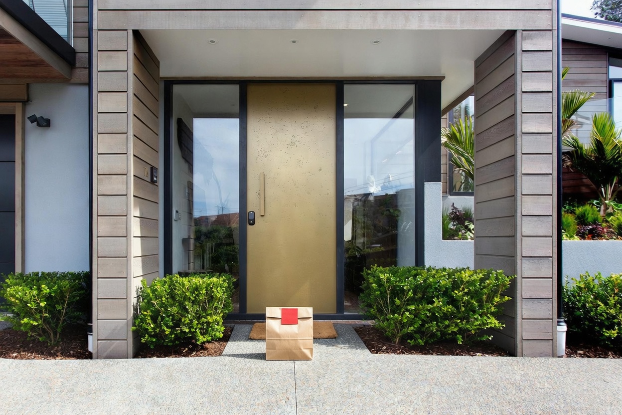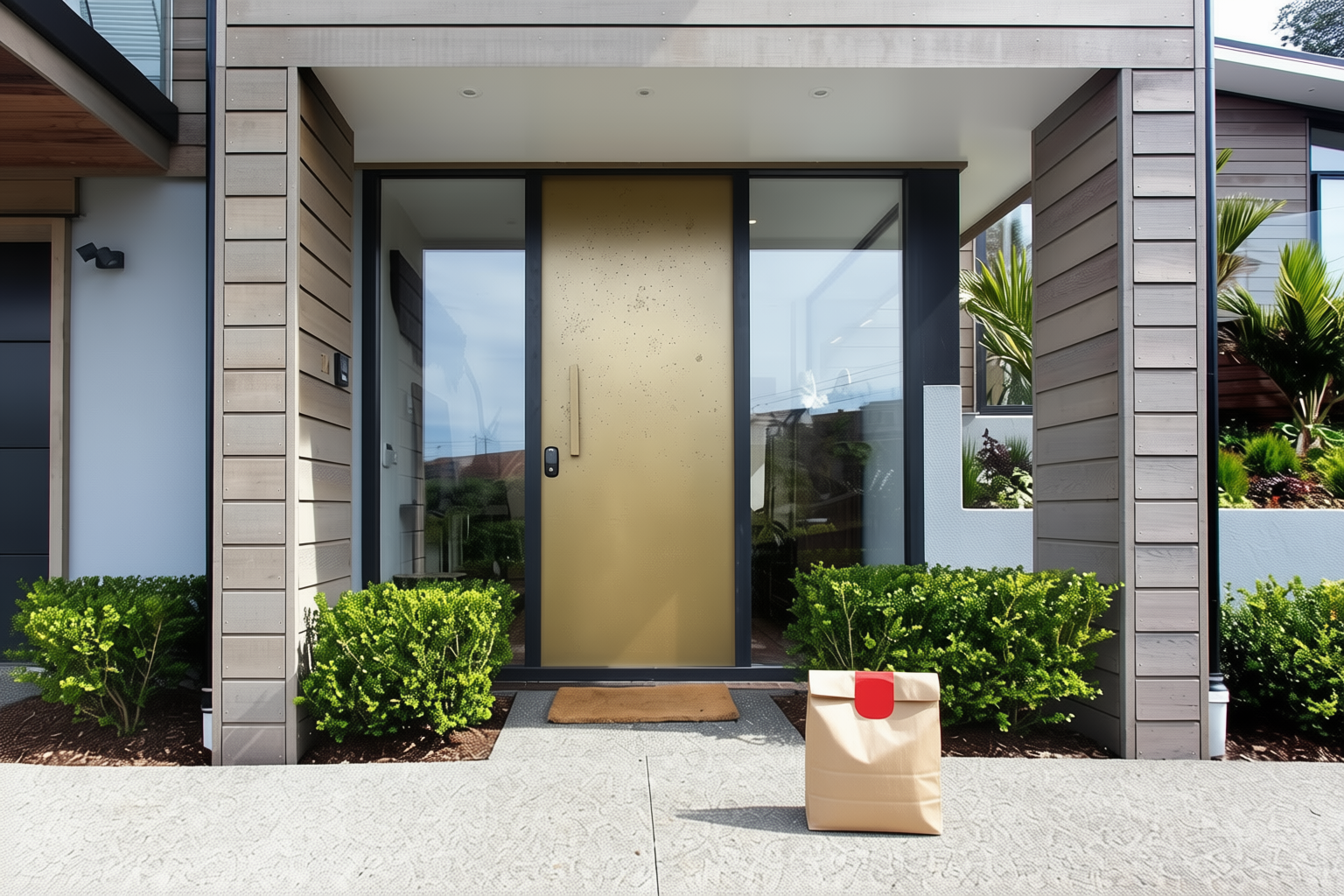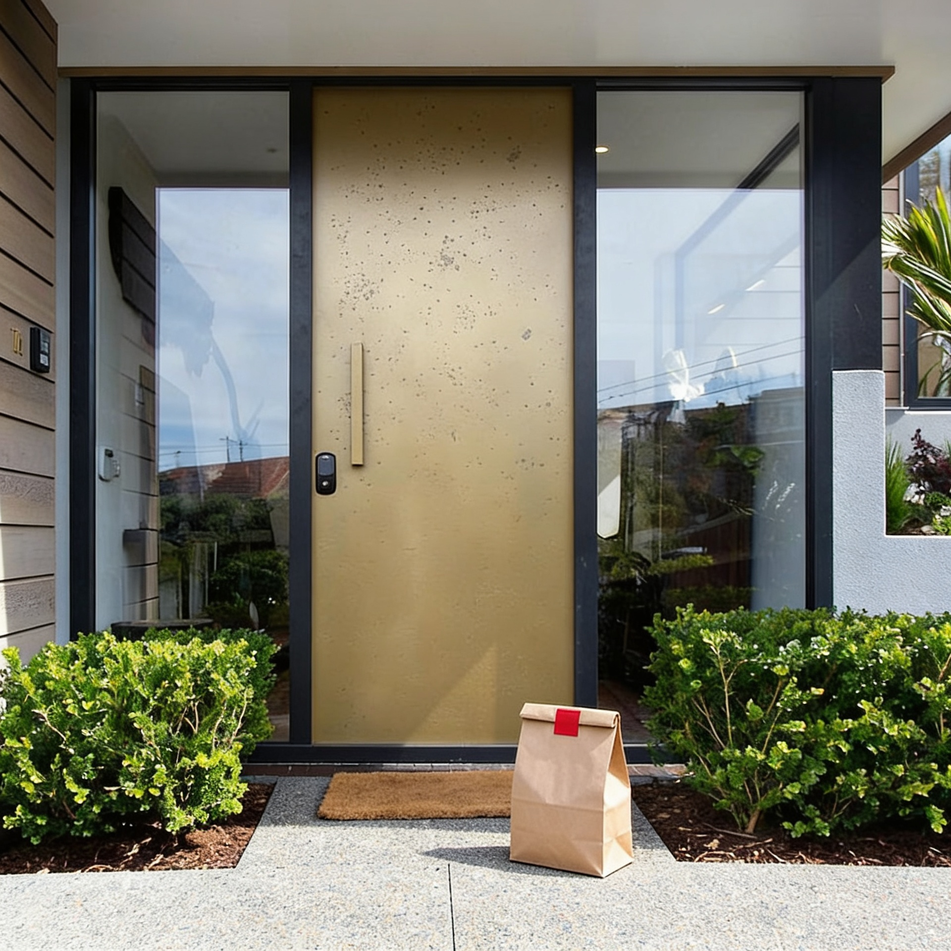 Delivery: We took real front door photos and used AI to add a fake delivery bag to the photo.