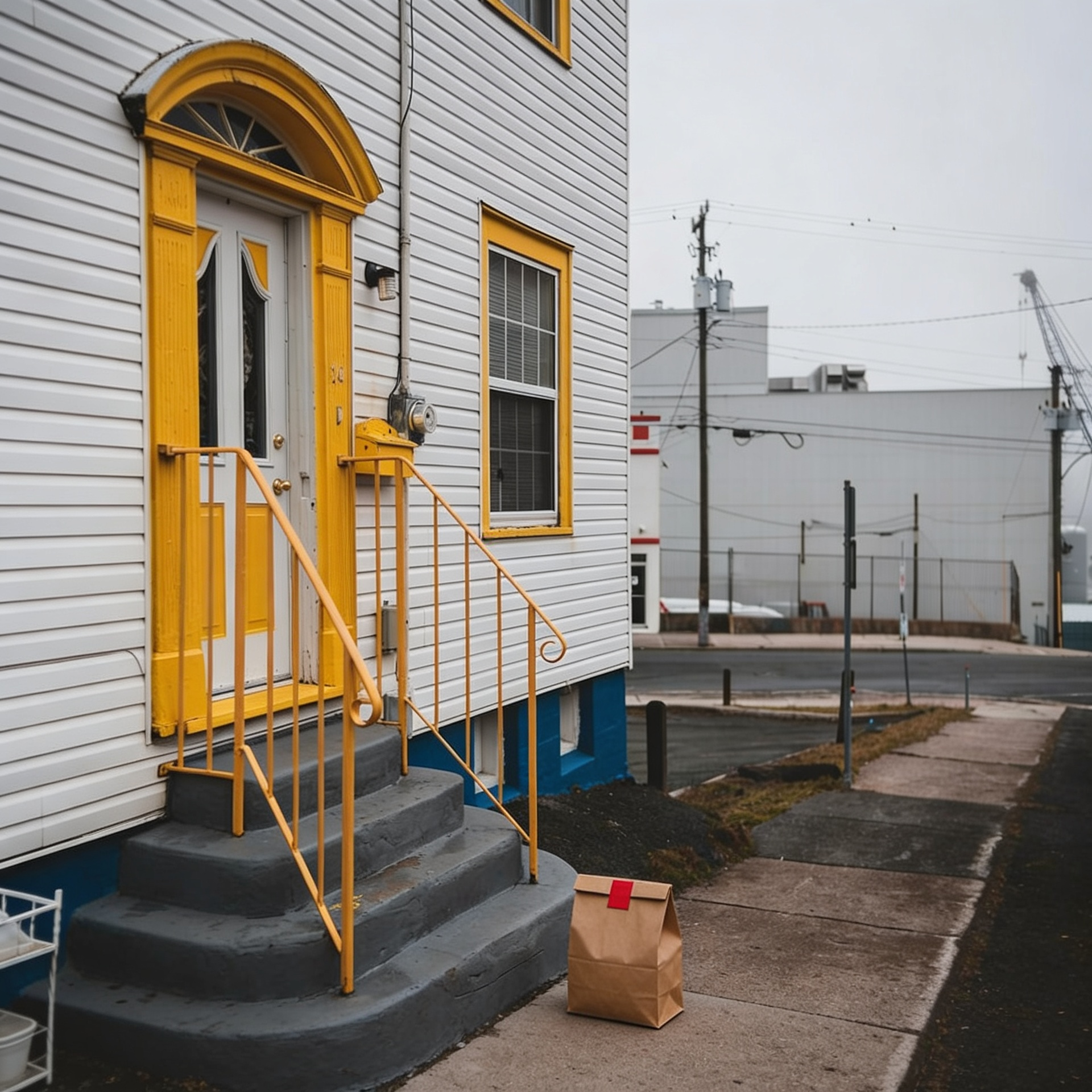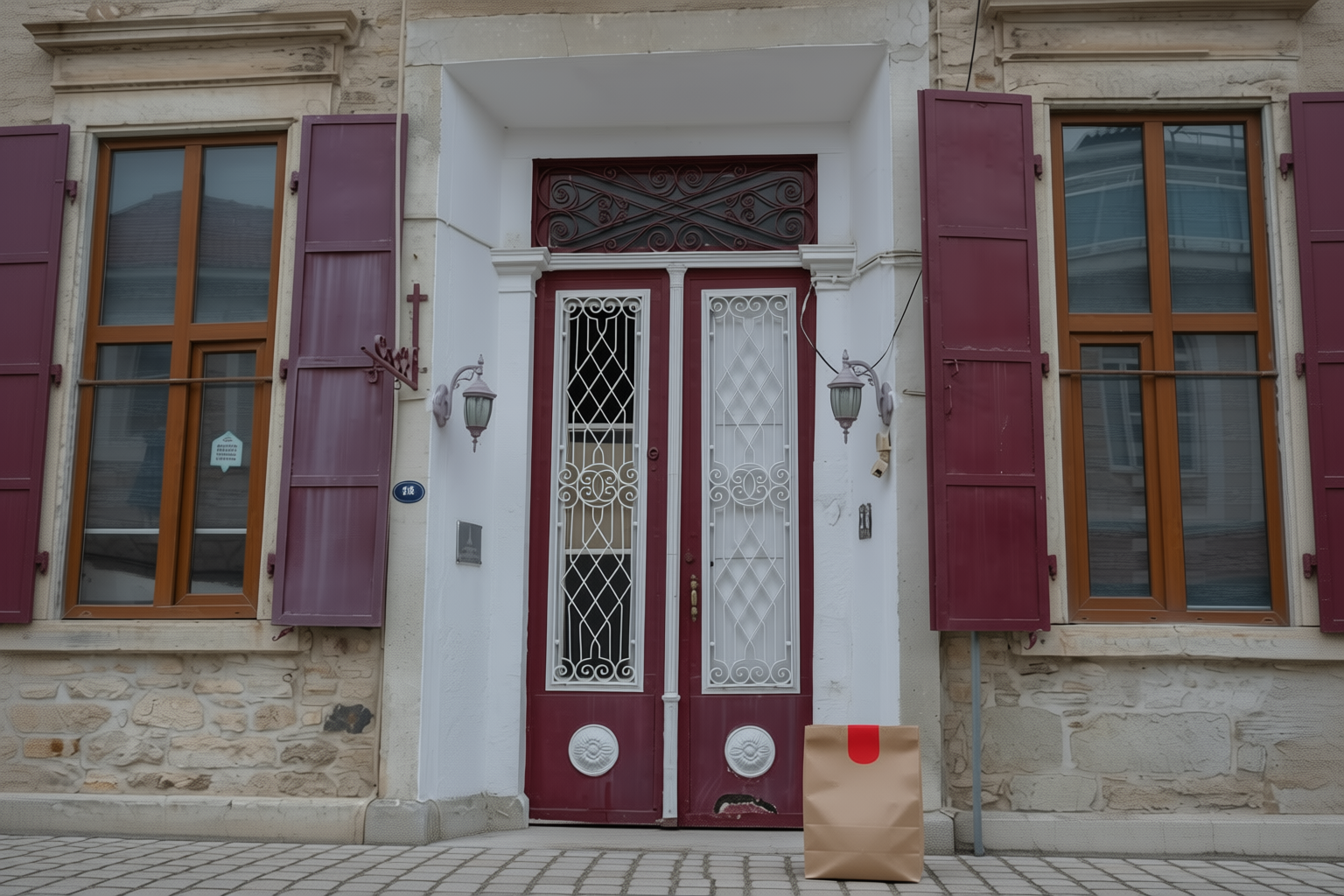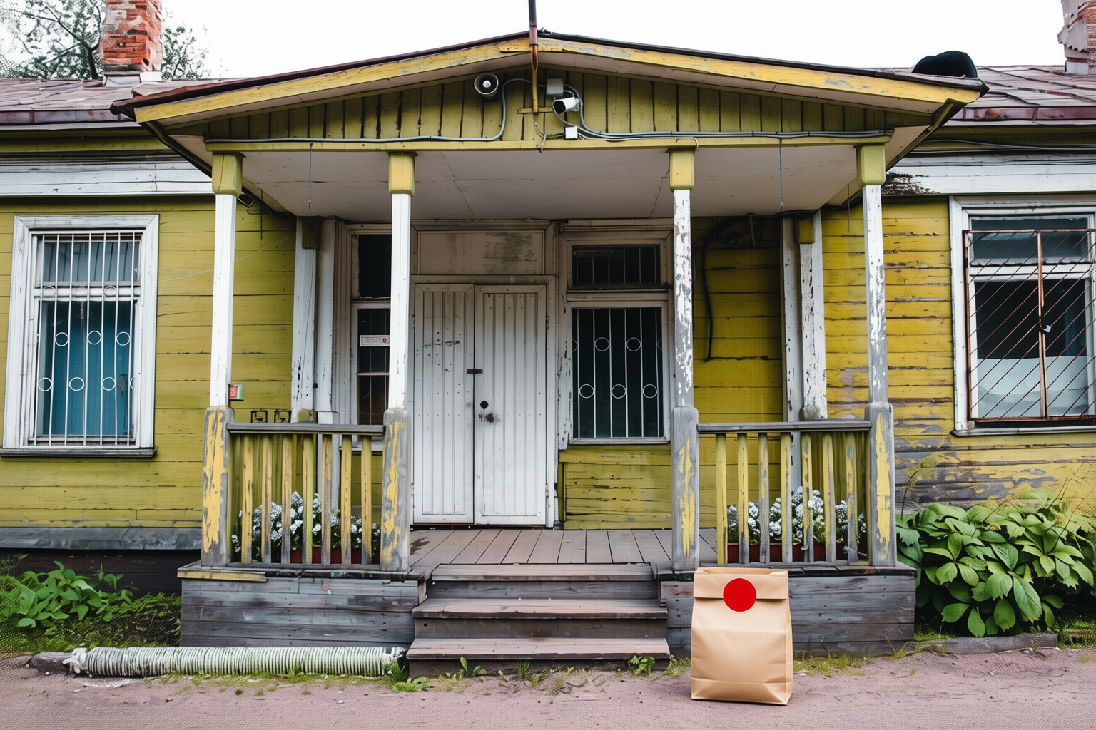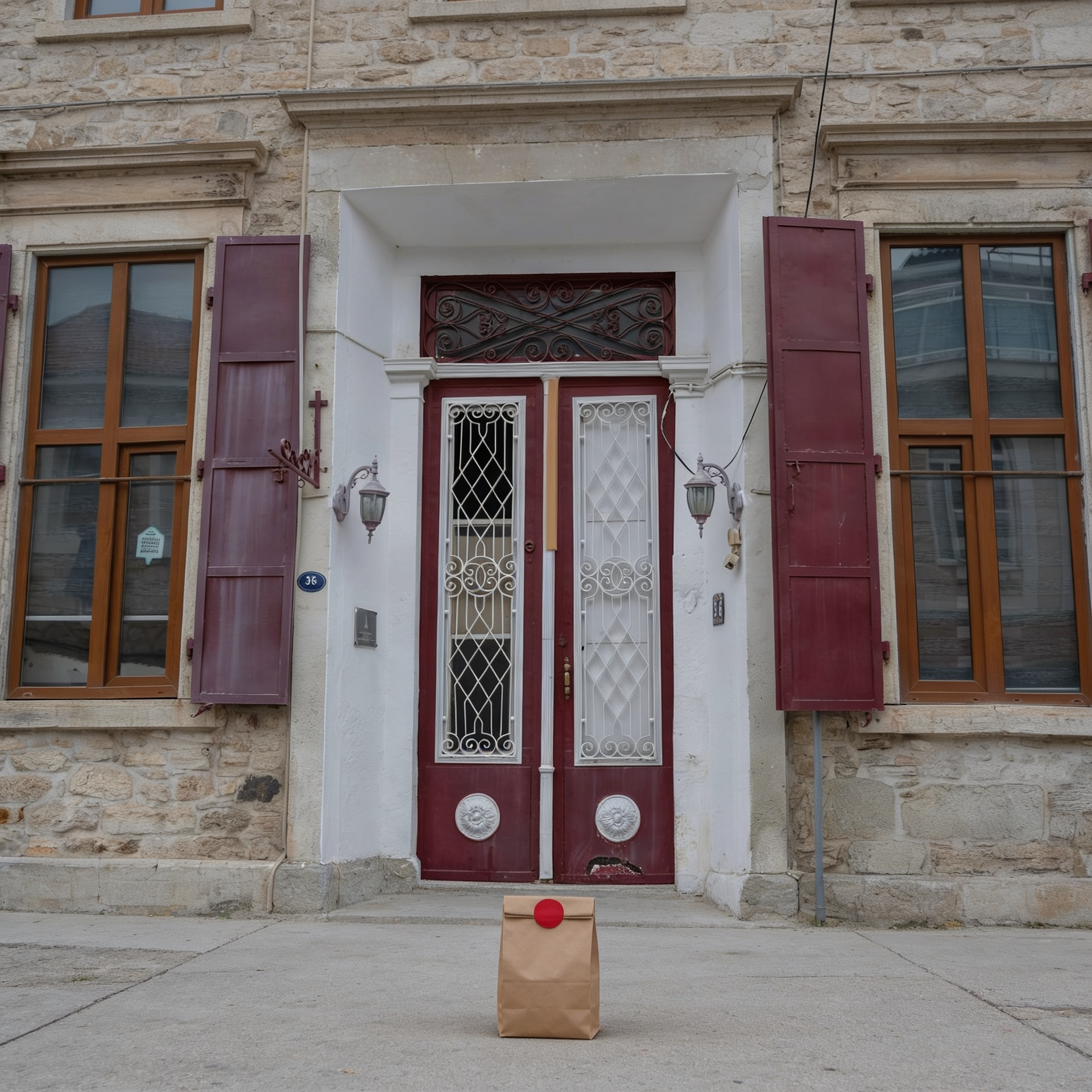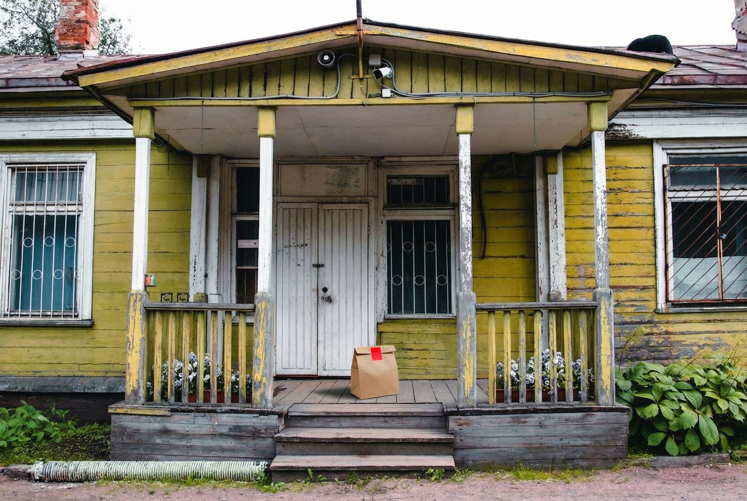 “In this existing photo, add a food delivery paper bag on the ground right in front of the door. The bag should be a small brown paper bag with a solid plain red sticker on the top keeping it closed. Preserve existing photo style and lighting as much as possible.”
