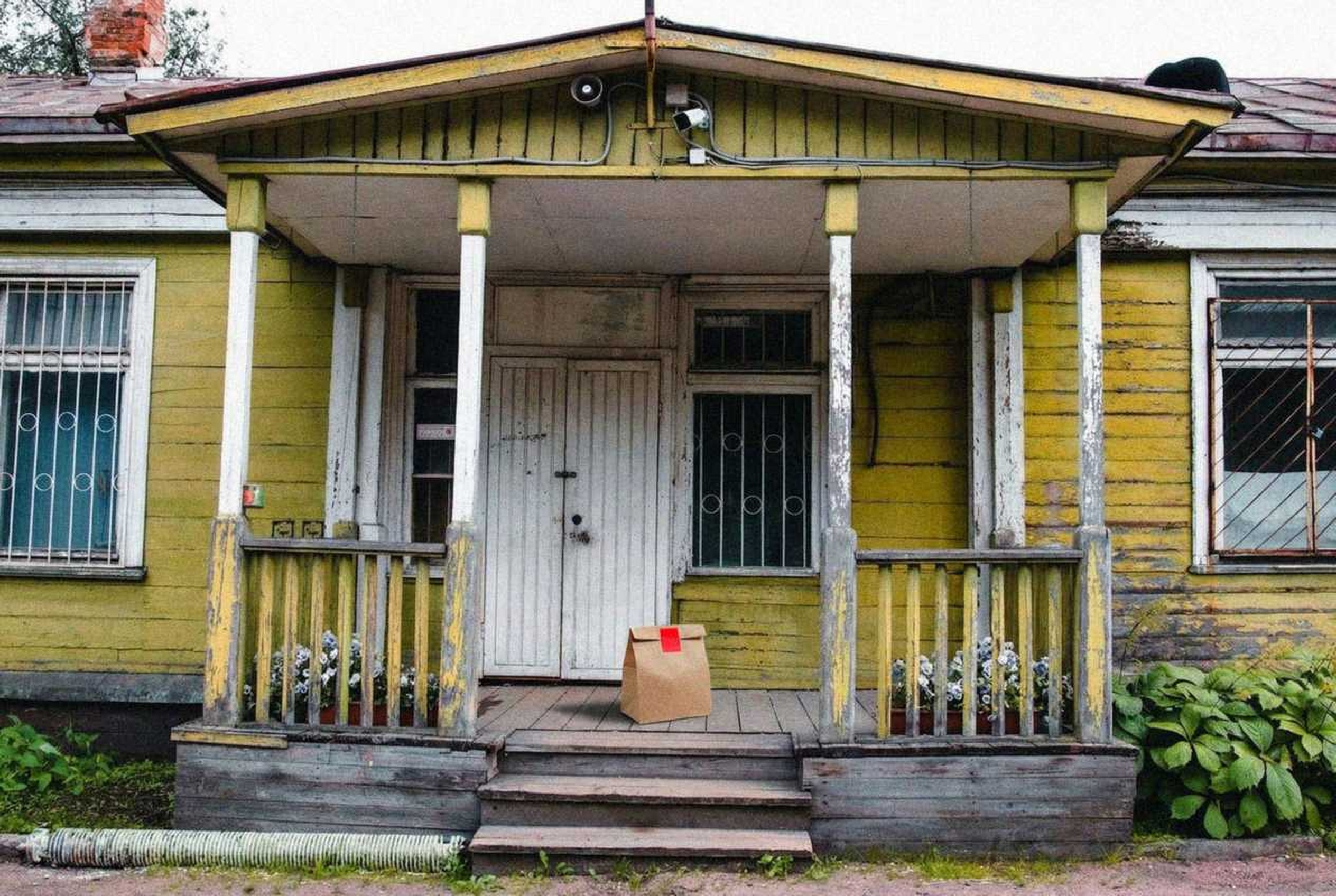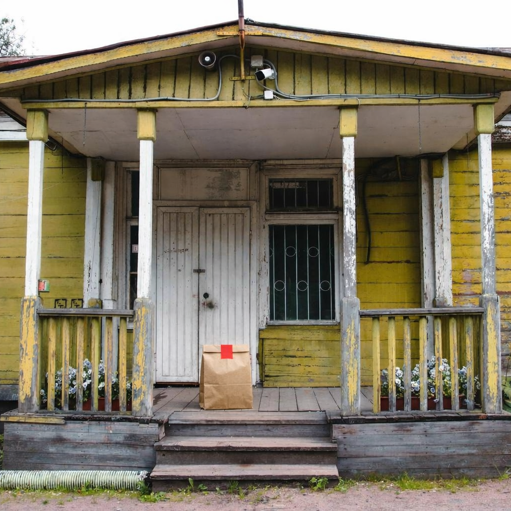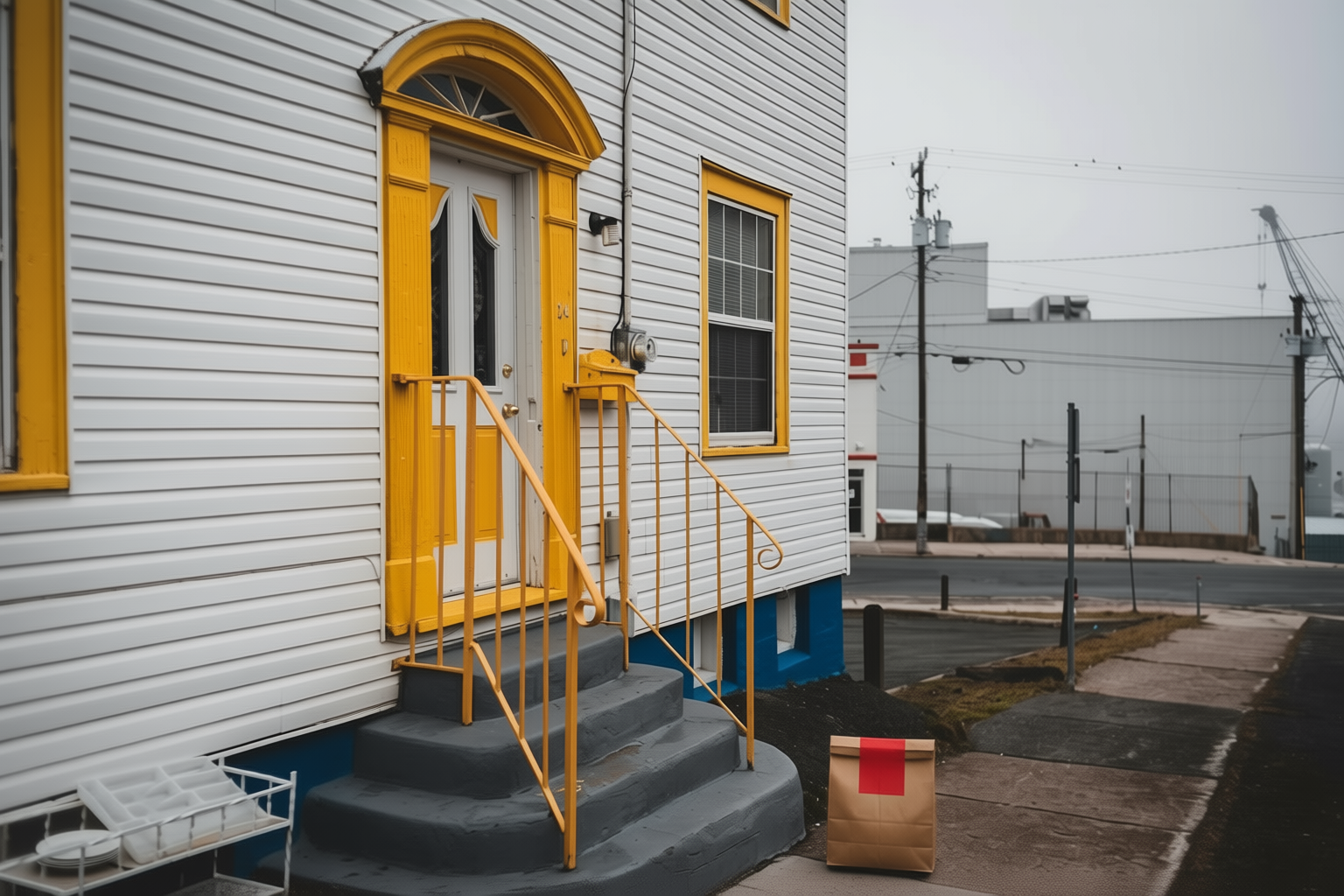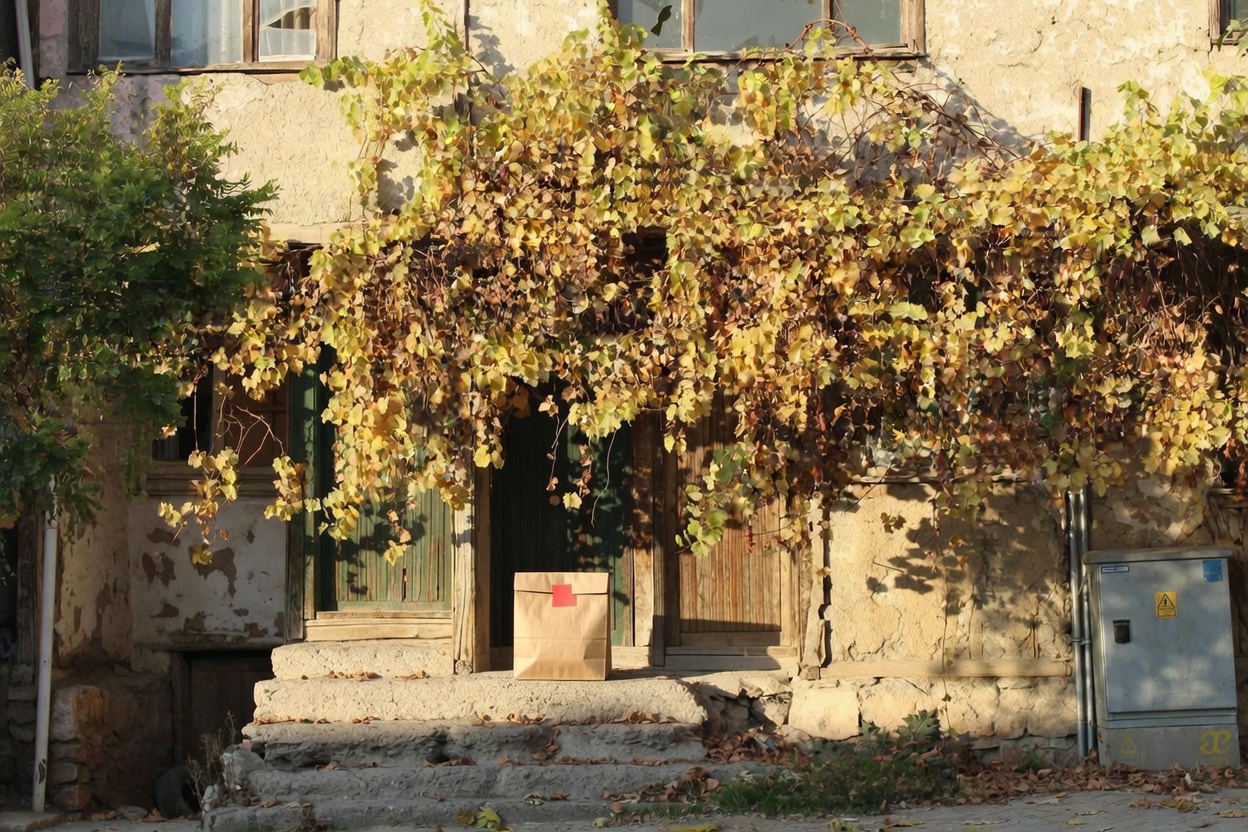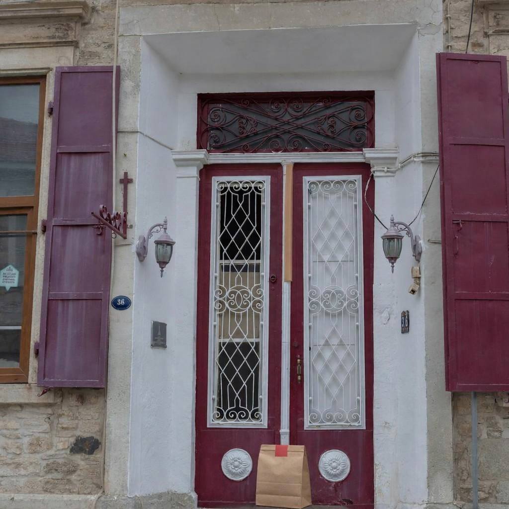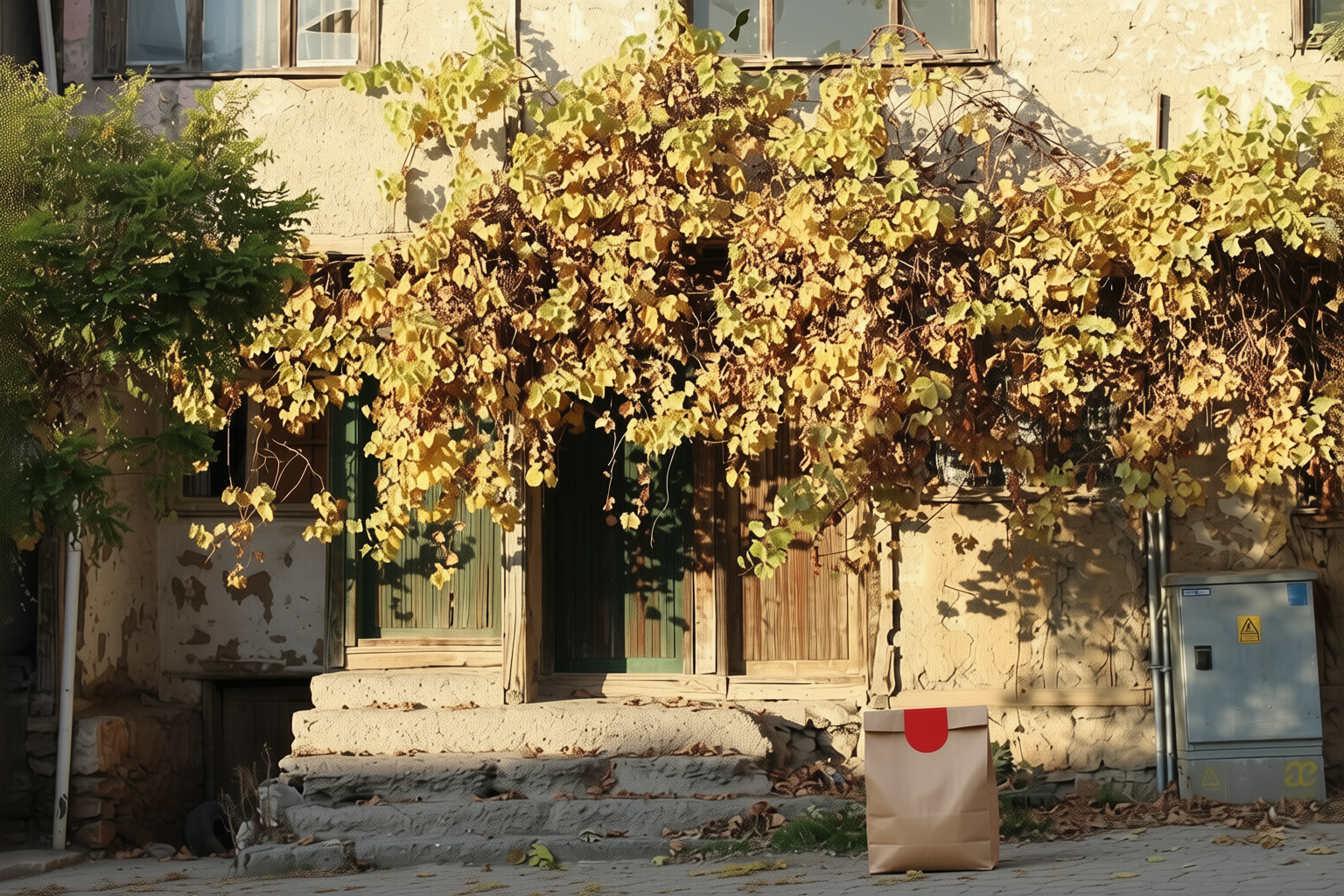 “In this existing photo, add a food delivery paper bag on the ground right in front of the door. The bag should be a small brown paper bag with a solid plain red sticker on the top keeping it closed. Preserve existing photo style and lighting as much as possible.”
