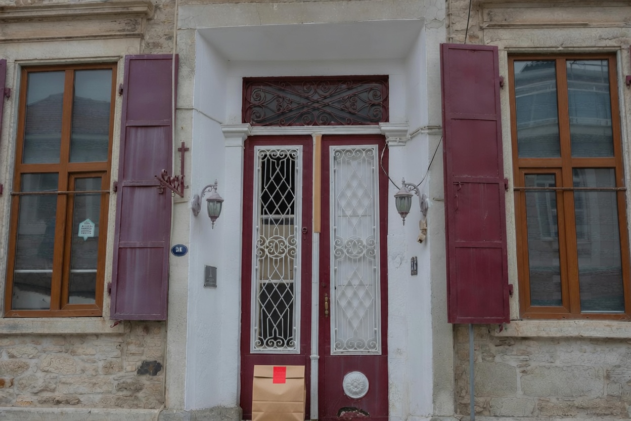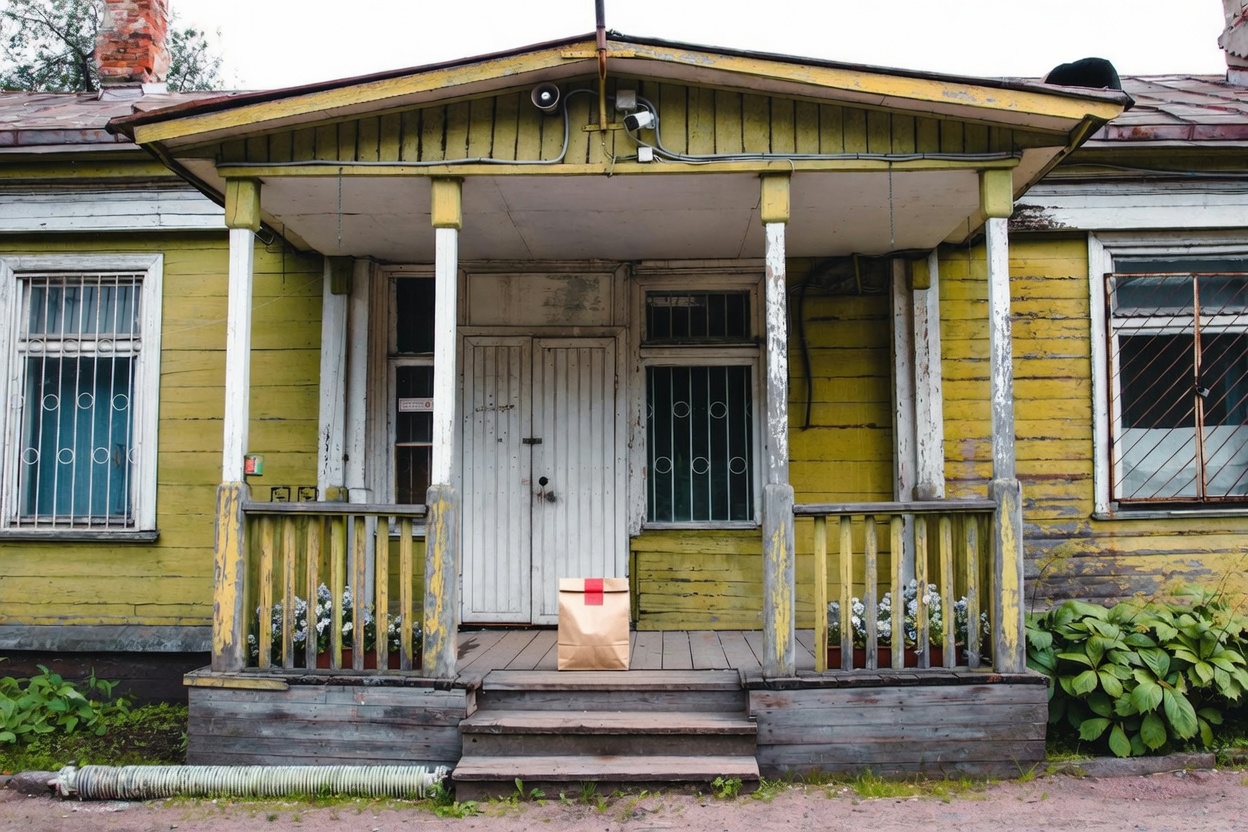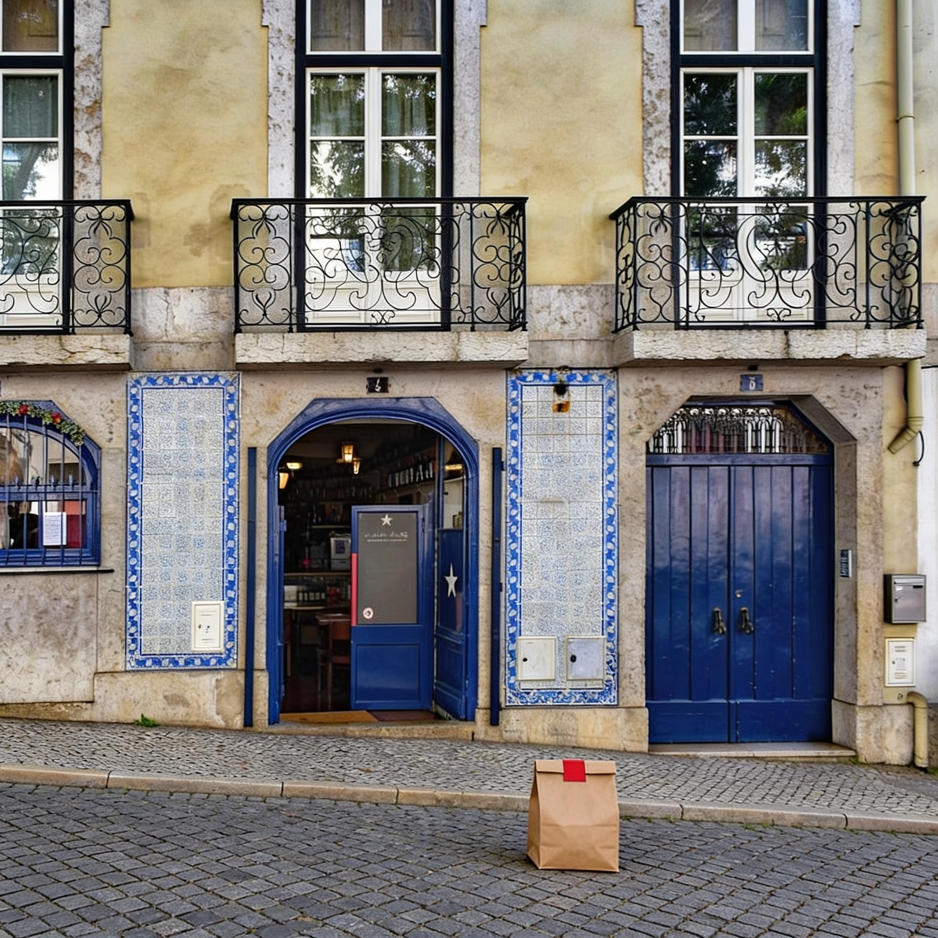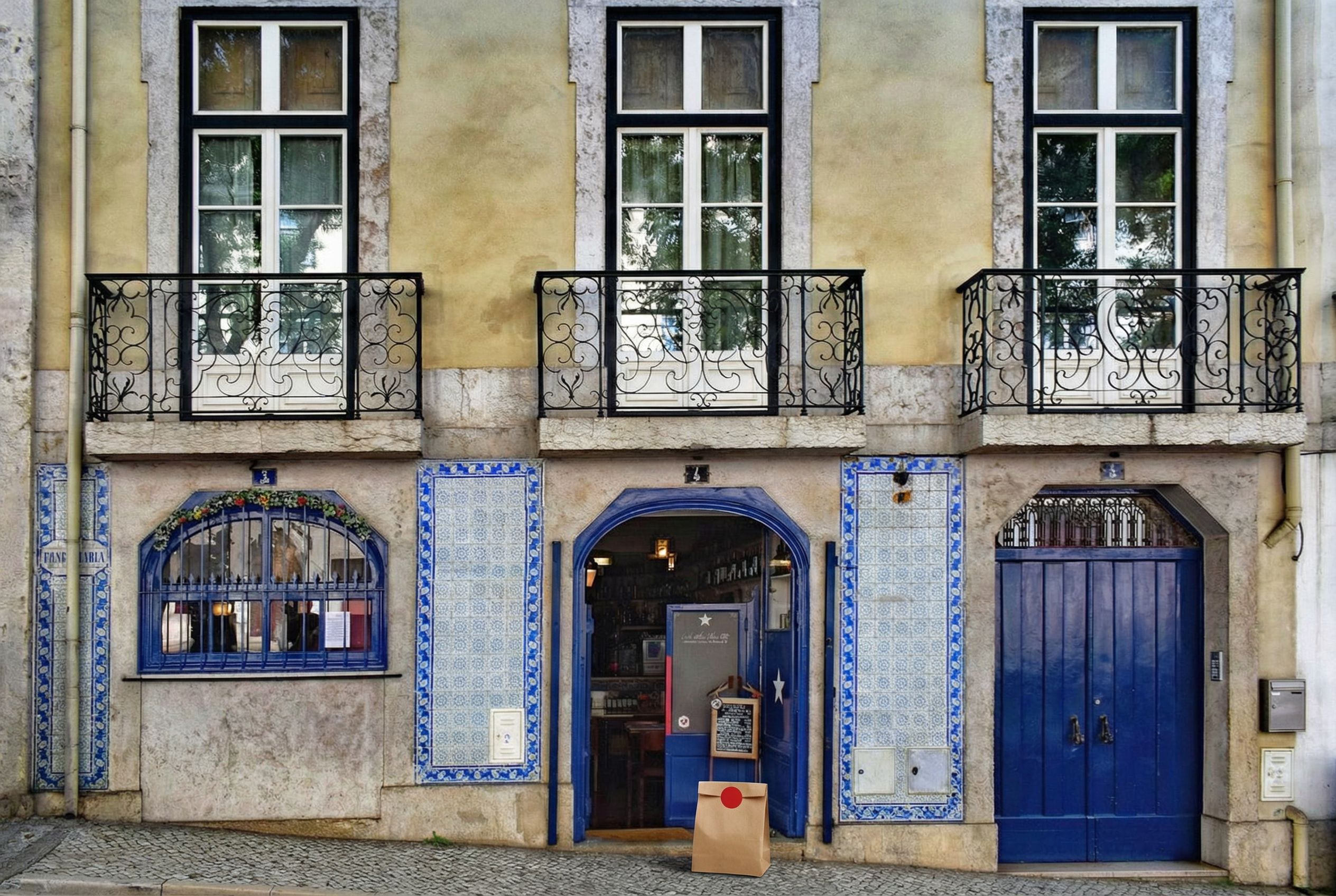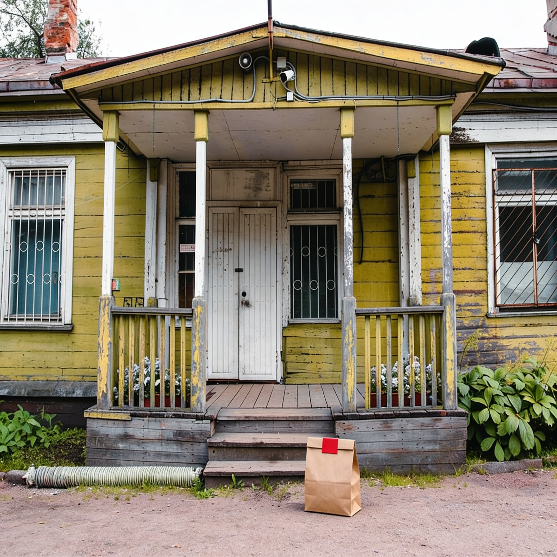 “In this existing photo, add a food delivery paper bag on the ground right in front of the door. The bag should be a small brown paper bag with a solid plain red sticker on the top keeping it closed. Preserve existing photo style and lighting as much as possible.”