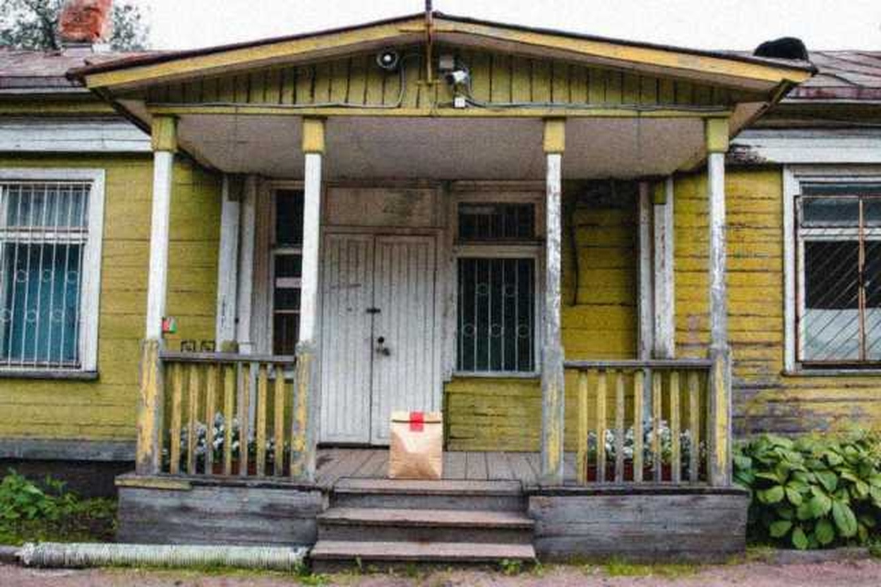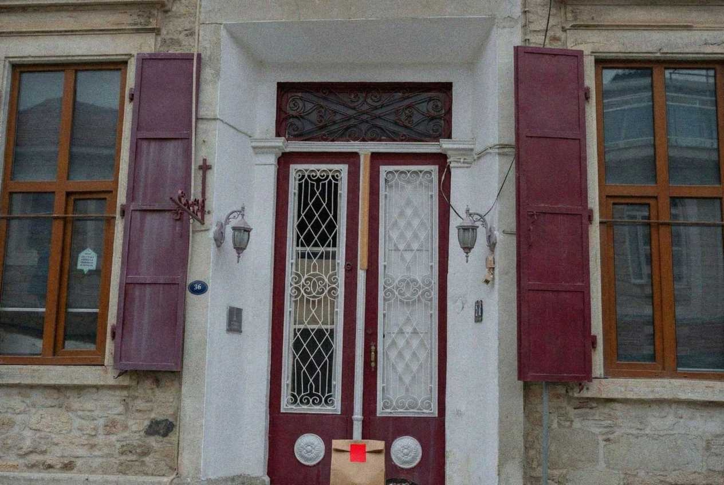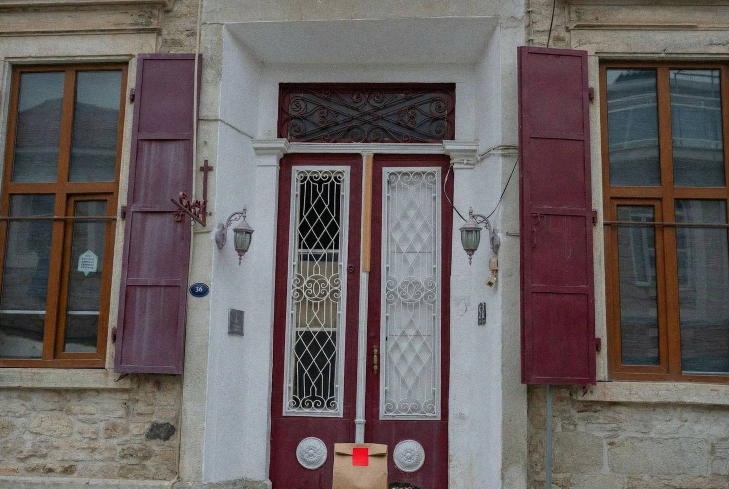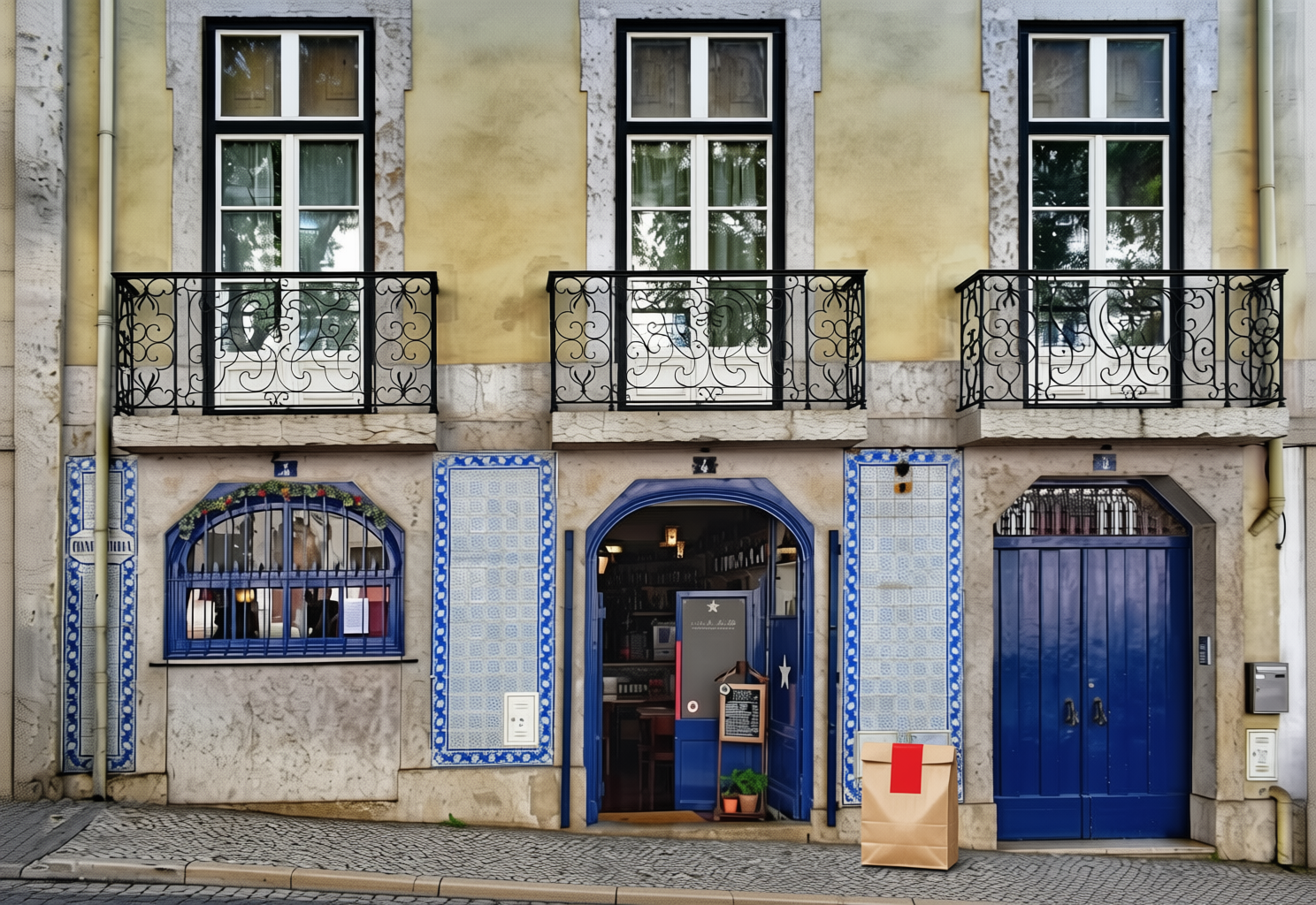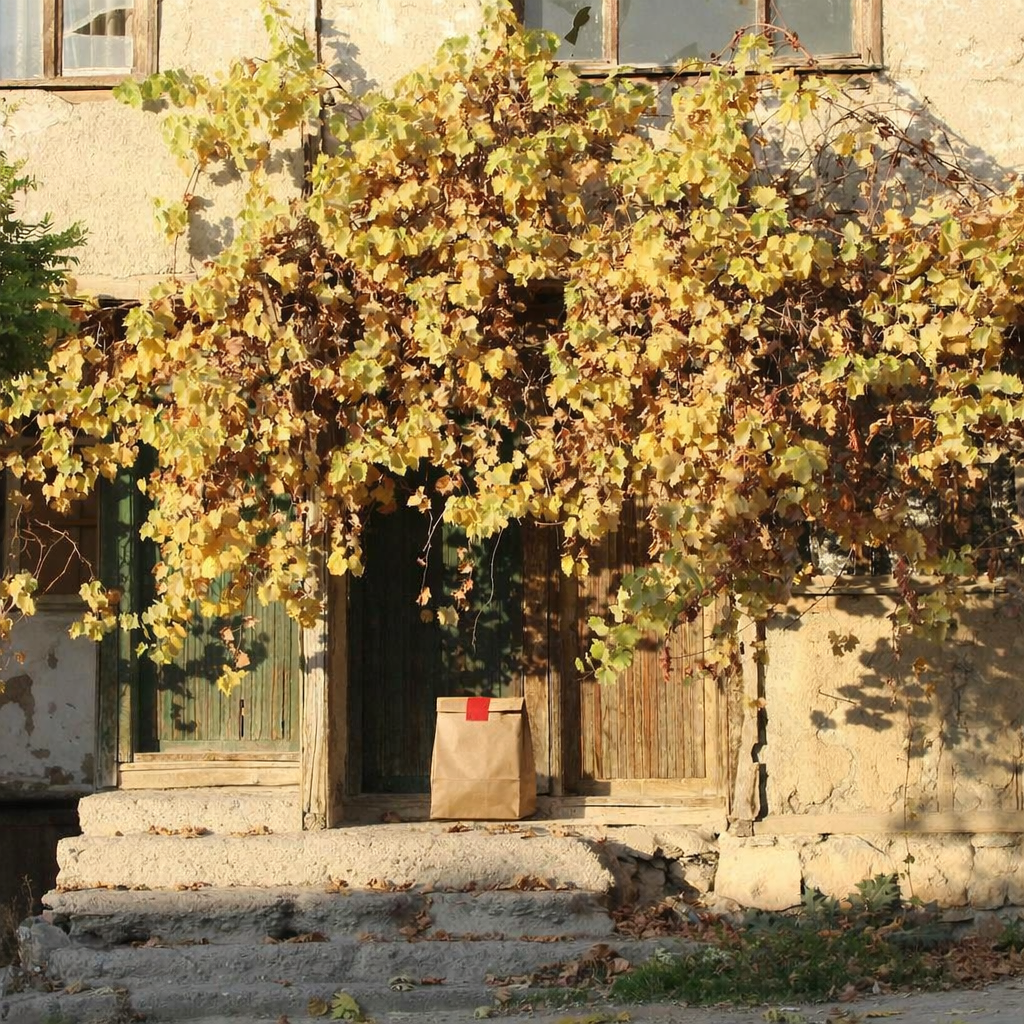 “In this existing photo, add a food delivery paper bag on the ground right in front of the door. The bag should be a small brown paper bag with a solid plain red sticker on the top keeping it closed. Preserve existing photo style and lighting as much as possible.”