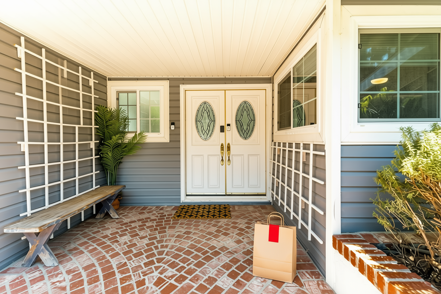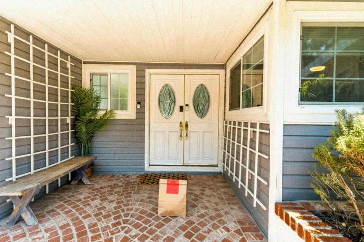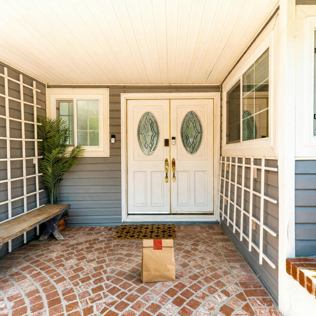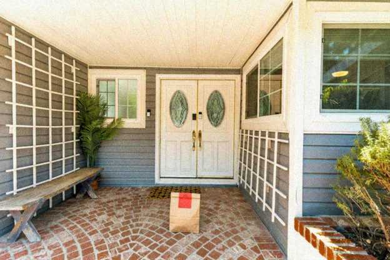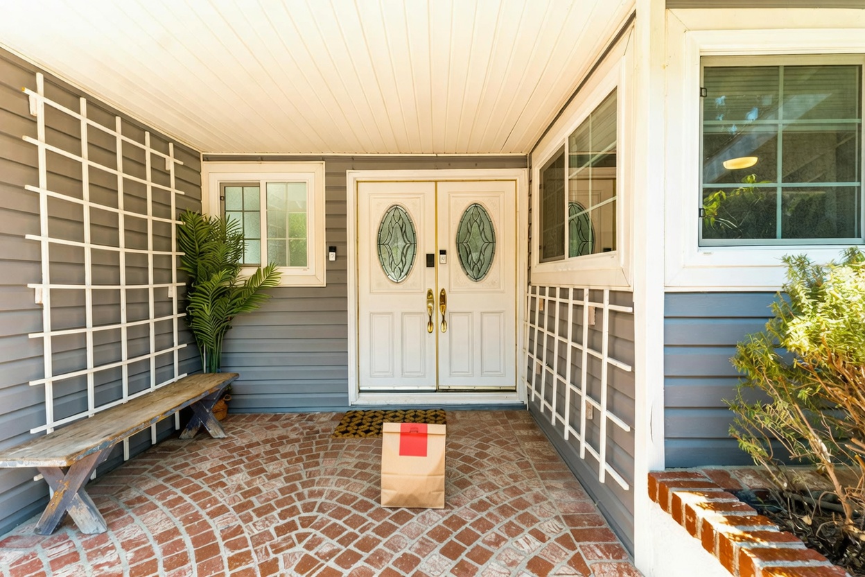 Delivery: We took real front door photos and used AI to add a fake delivery bag to the photo.