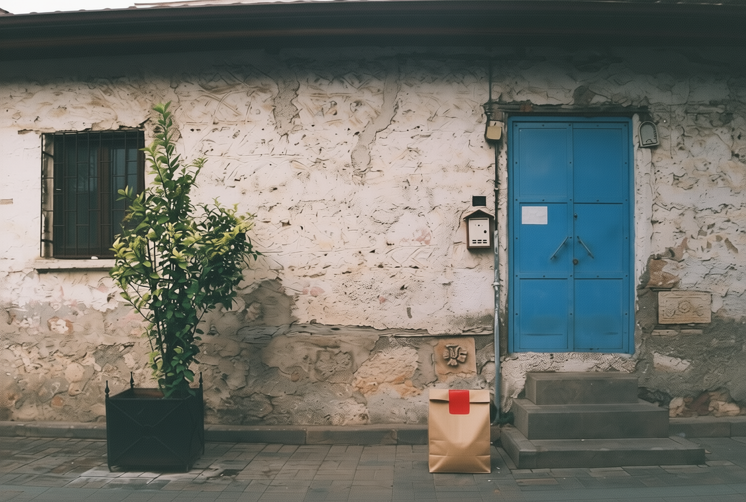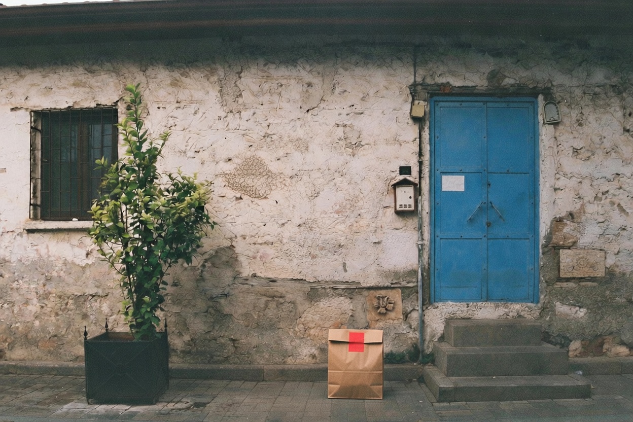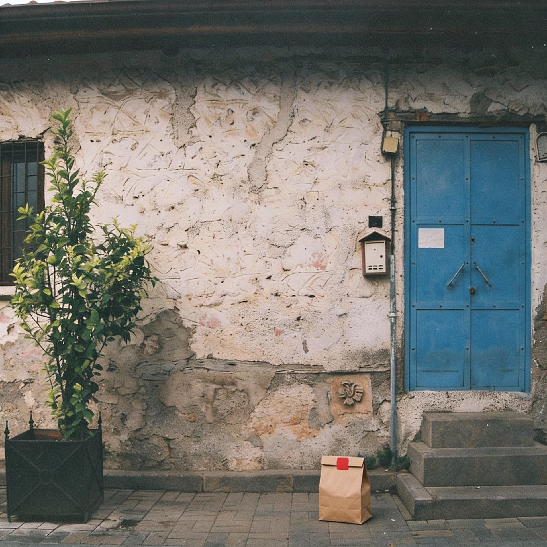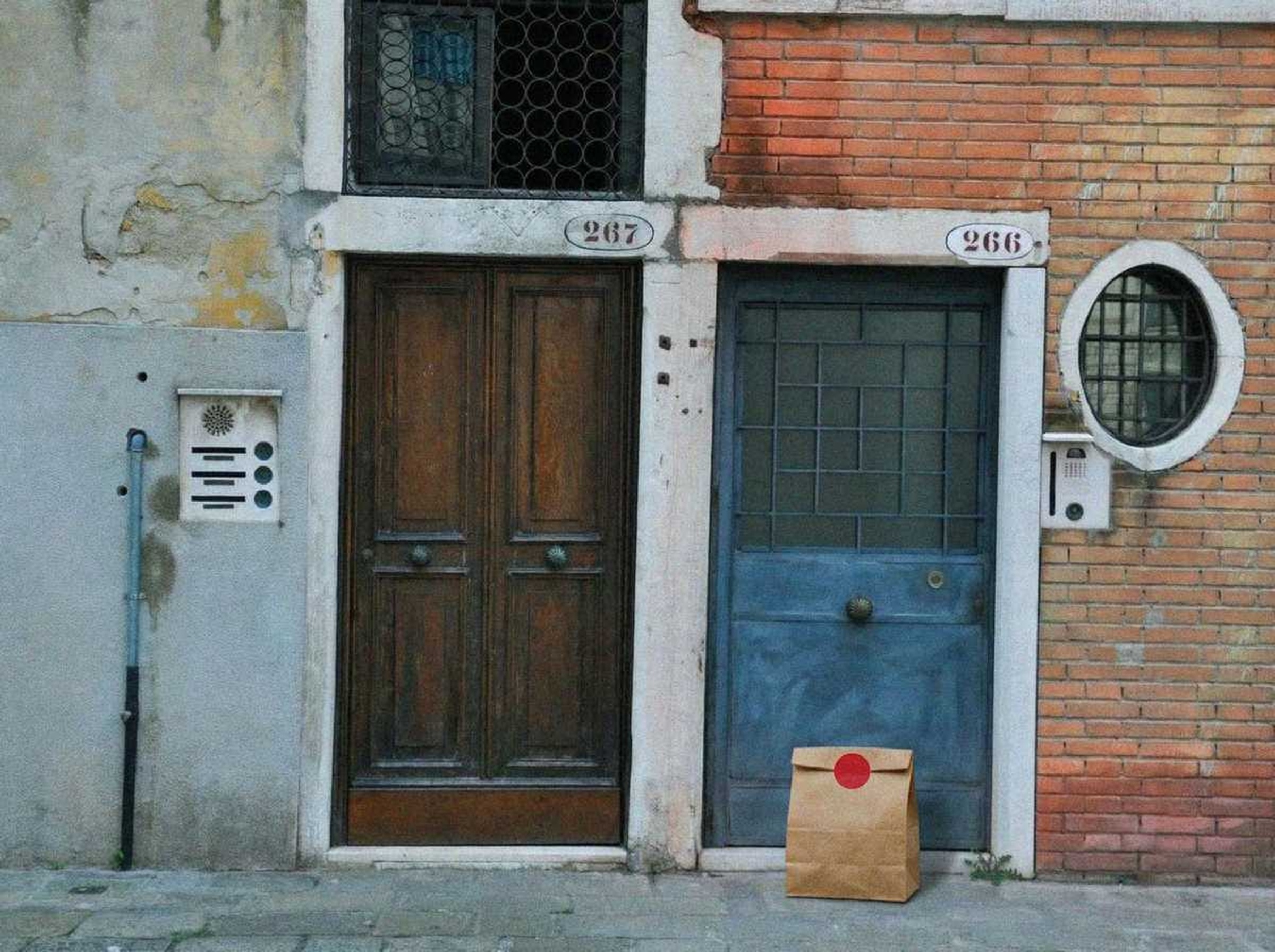 “In this existing photo, add a food delivery paper bag on the ground right in front of the door. The bag should be a small brown paper bag with a solid plain red sticker on the top keeping it closed. Preserve existing photo style and lighting as much as possible.”
