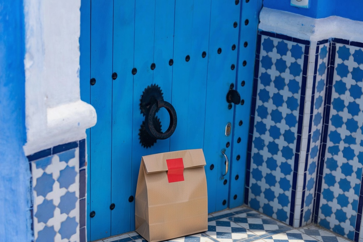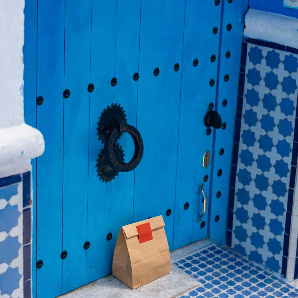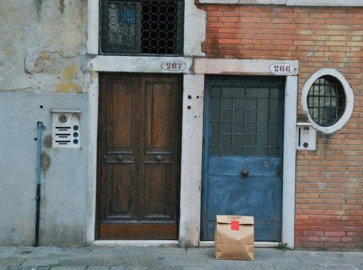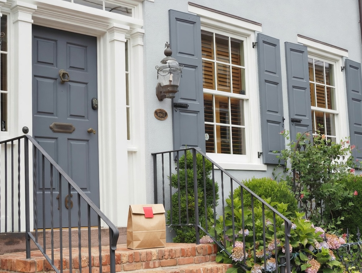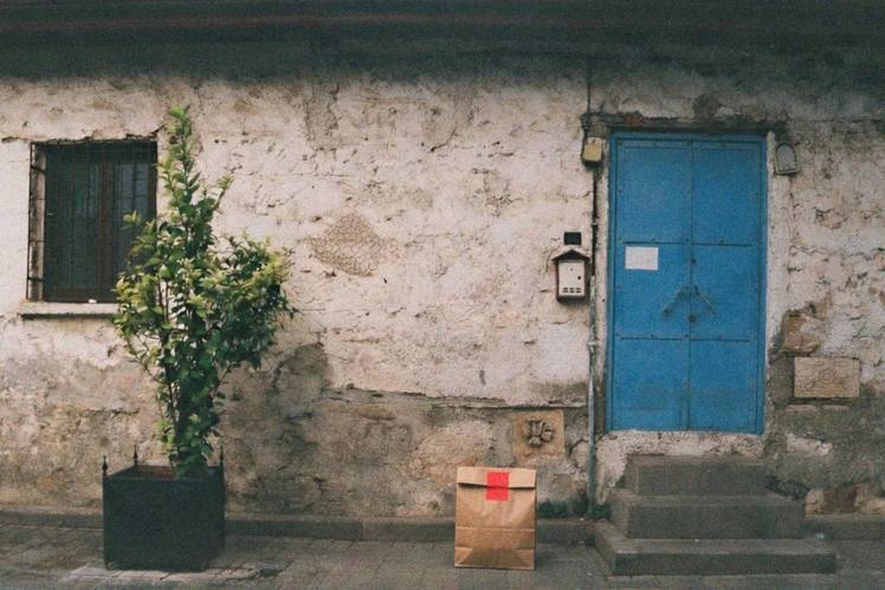“In this existing photo, add a food delivery paper bag on the ground right in front of the door. The bag should be a small brown paper bag with a solid plain red sticker on the top keeping it closed. Preserve existing photo style and lighting as much as possible.”
