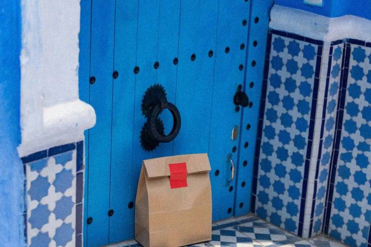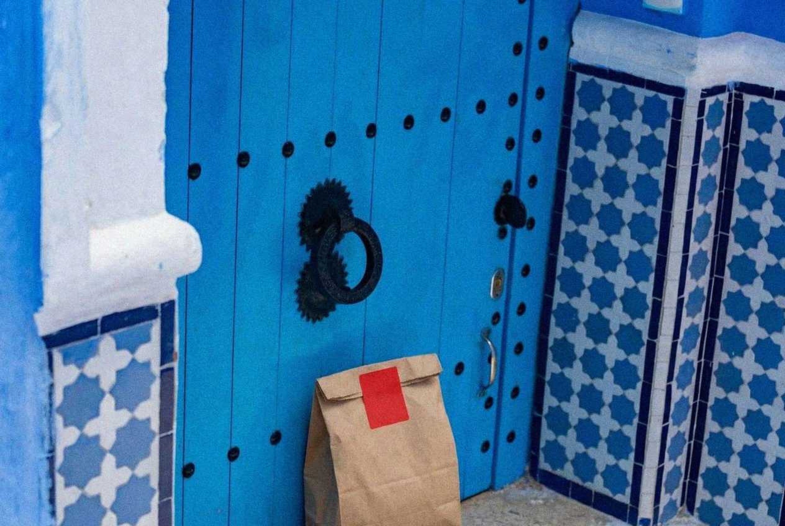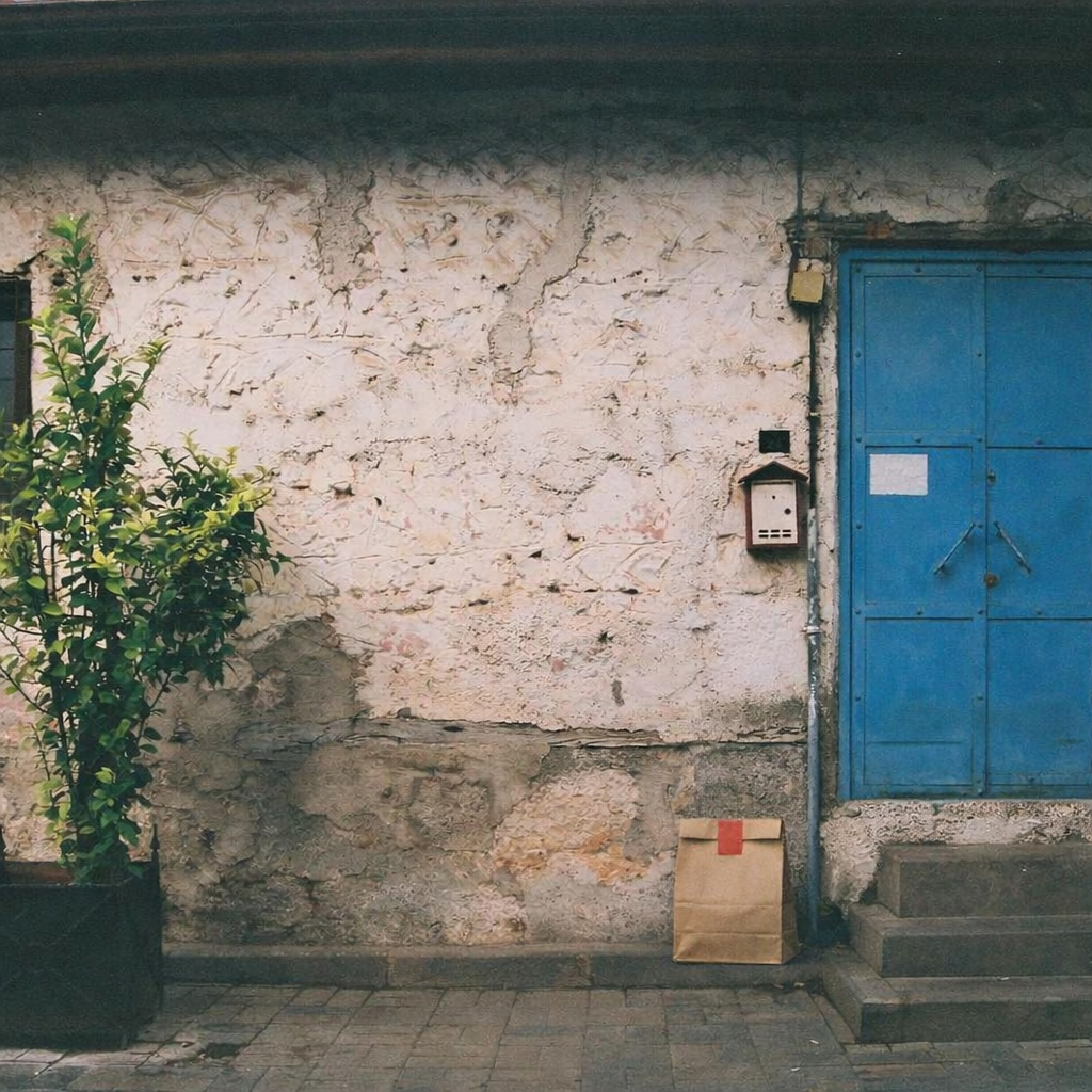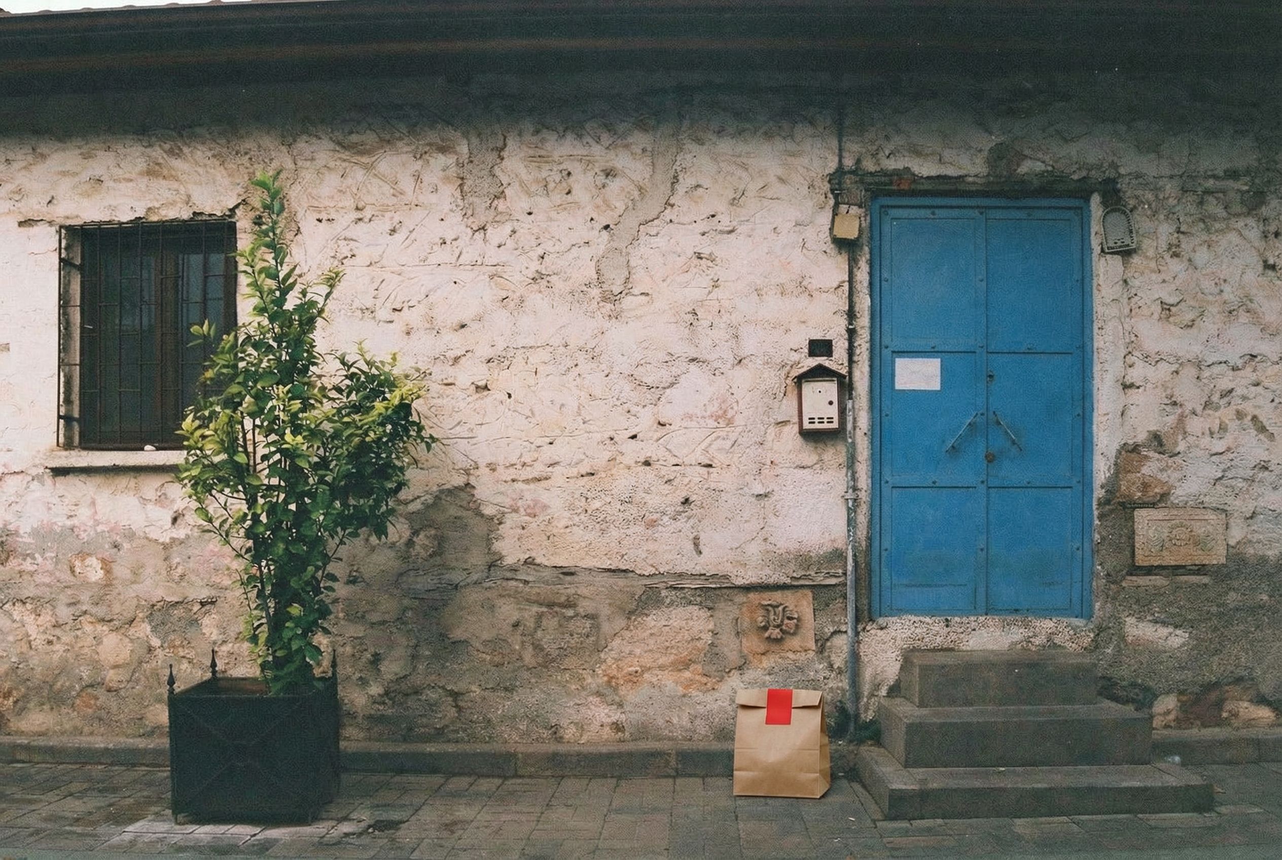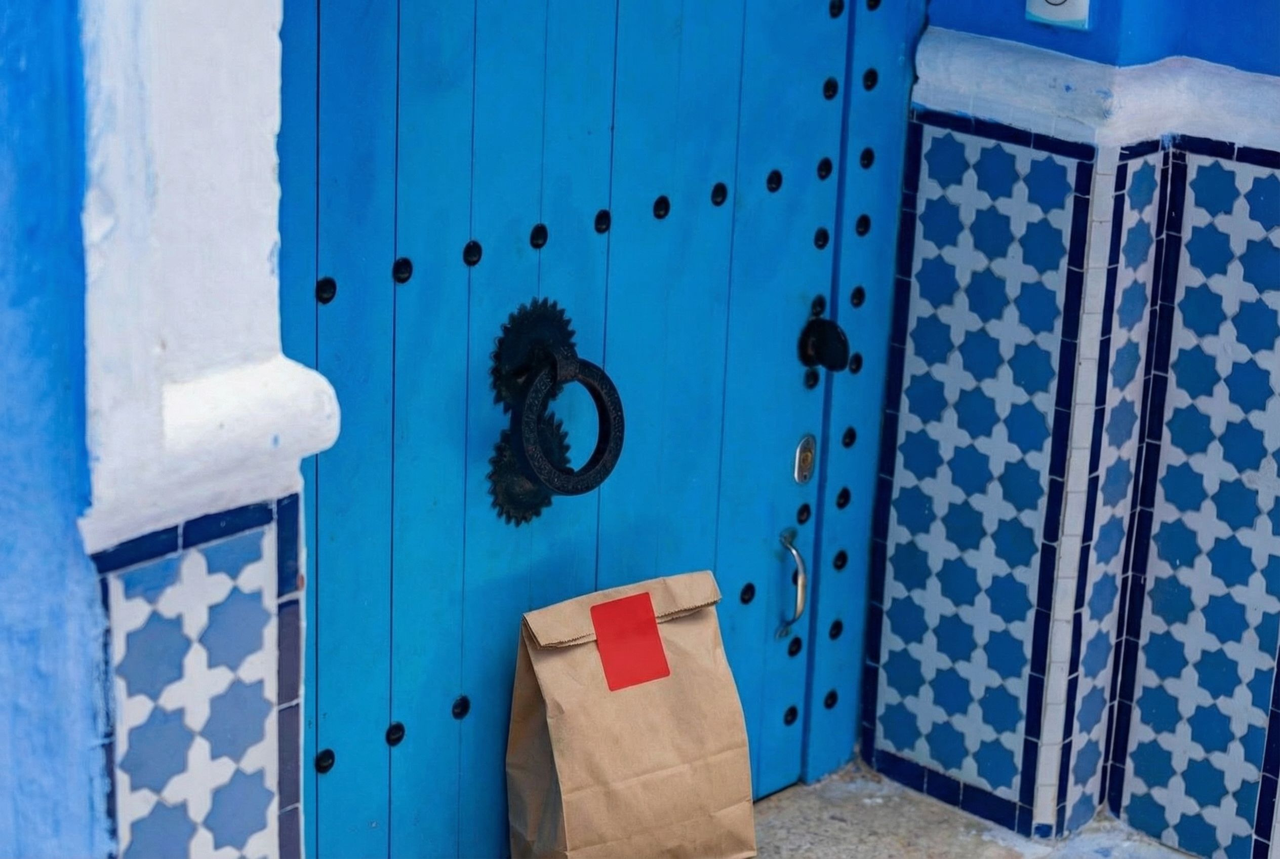 “In this existing photo, add a food delivery paper bag on the ground right in front of the door. The bag should be a small brown paper bag with a solid plain red sticker on the top keeping it closed. Preserve existing photo style and lighting as much as possible.”