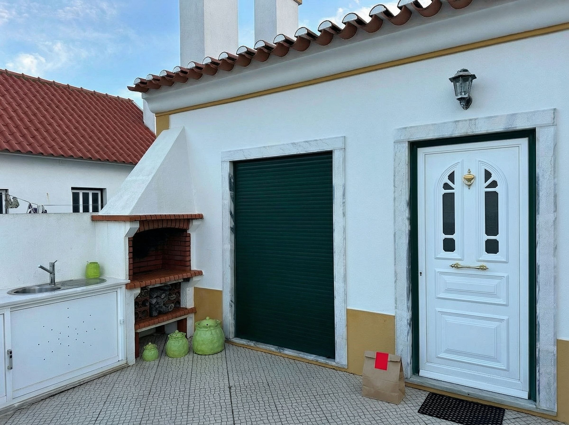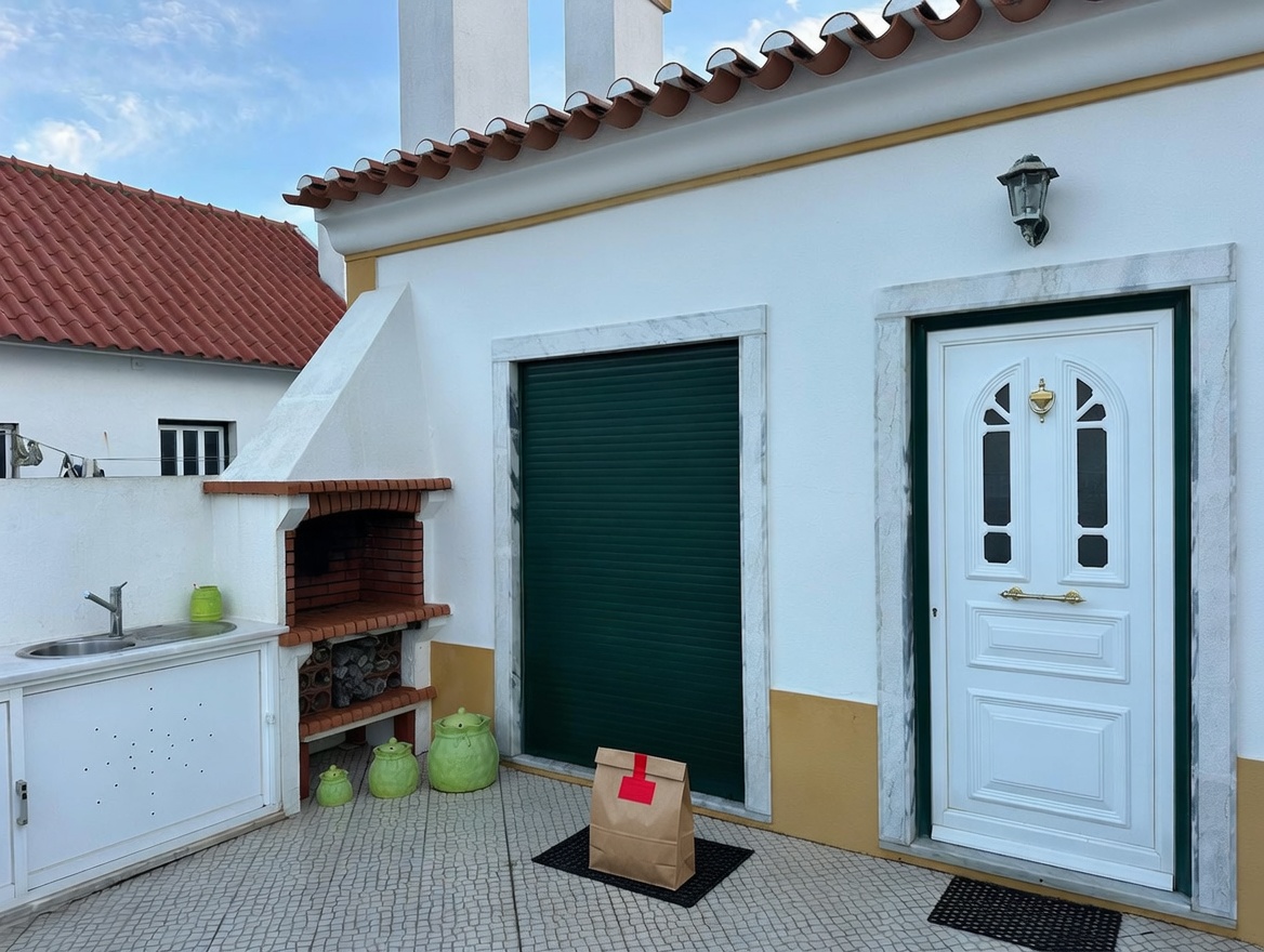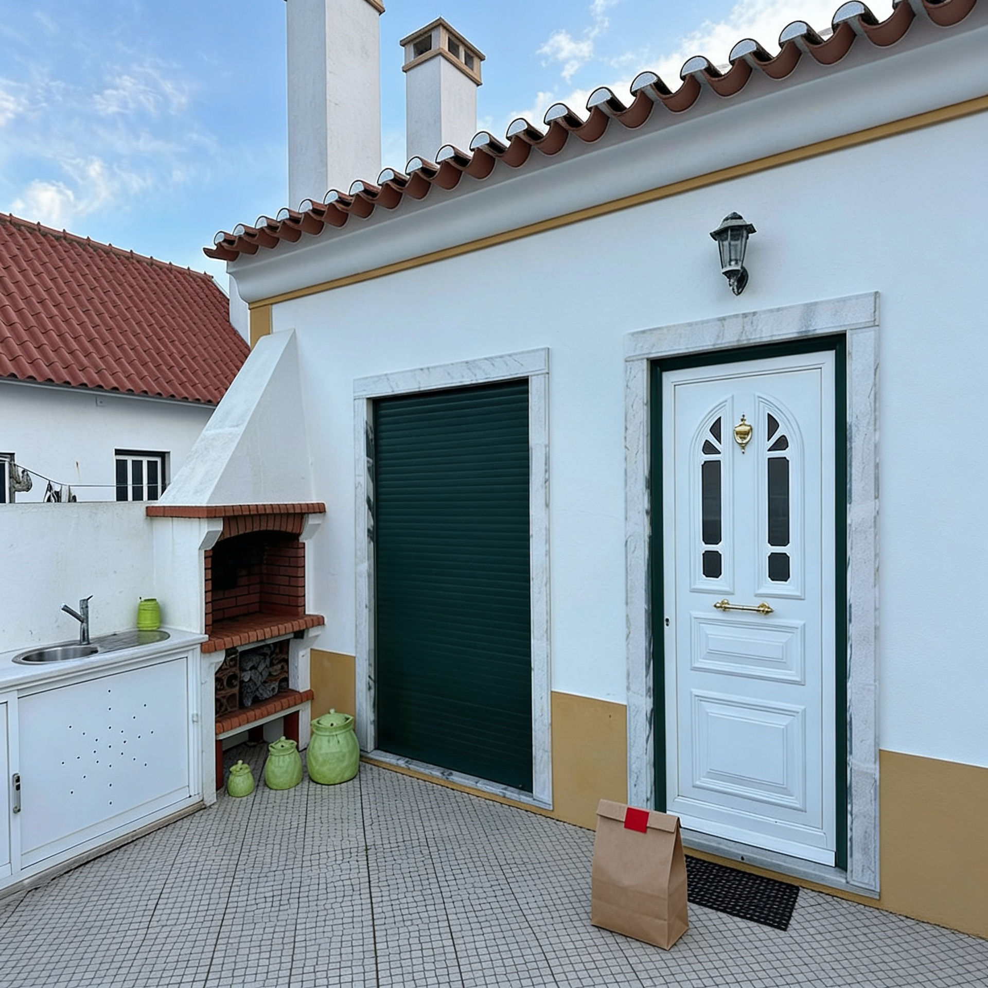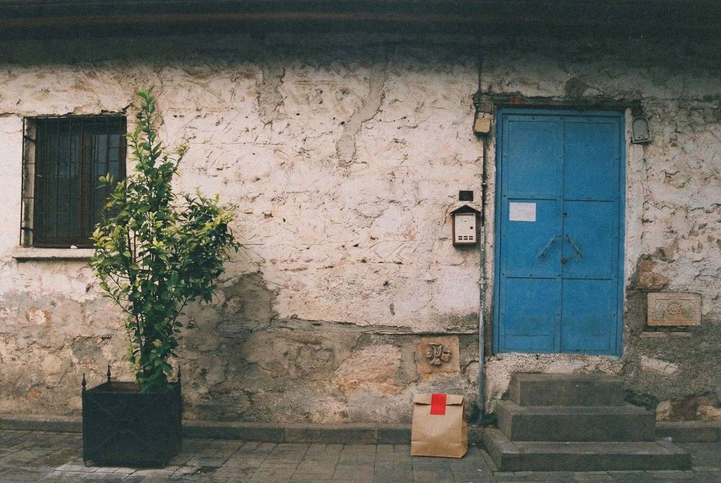 “In this existing photo, add a food delivery paper bag on the ground right in front of the door. The bag should be a small brown paper bag with a solid plain red sticker on the top keeping it closed. Preserve existing photo style and lighting as much as possible.”