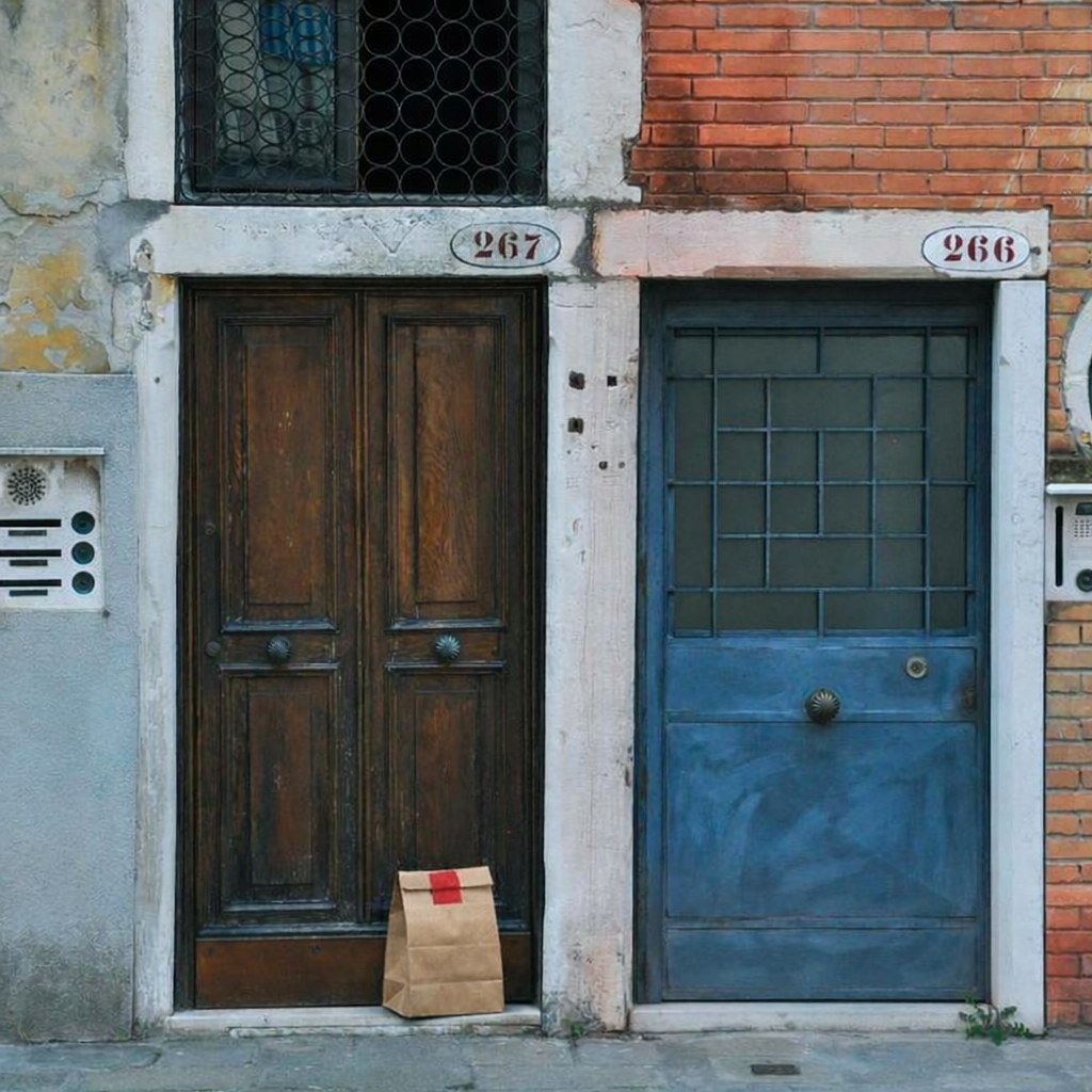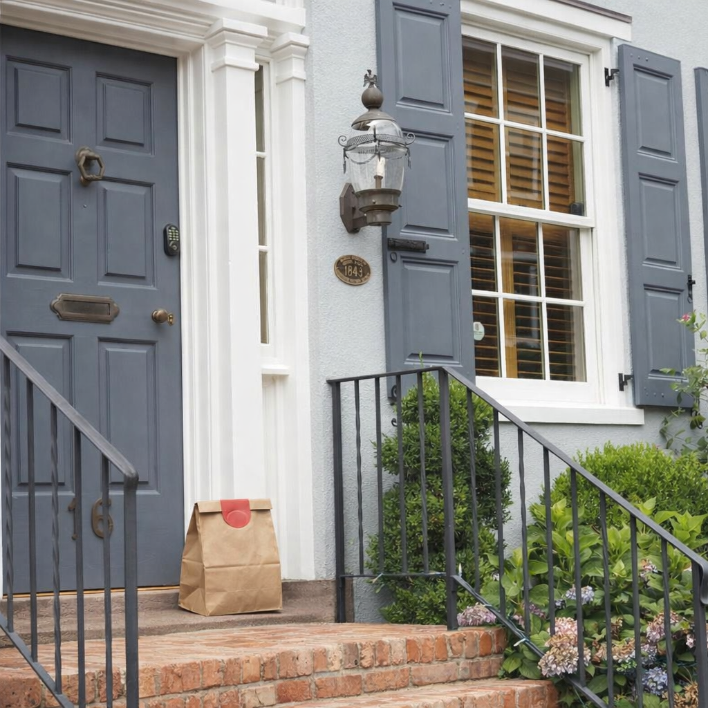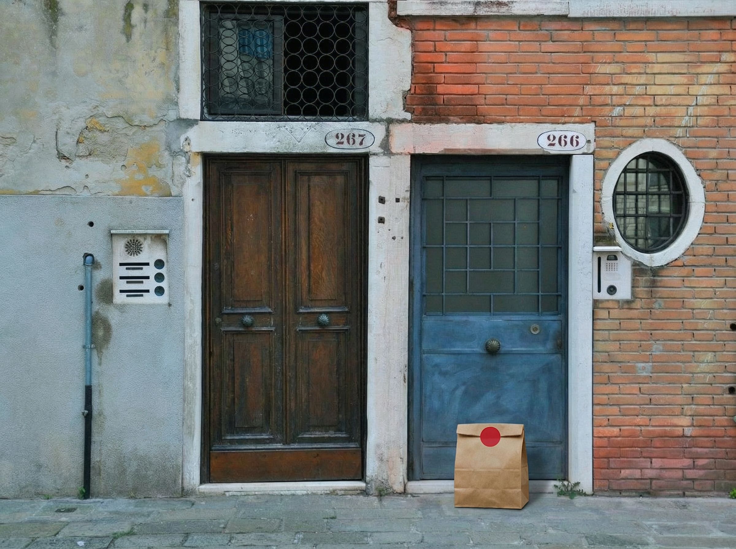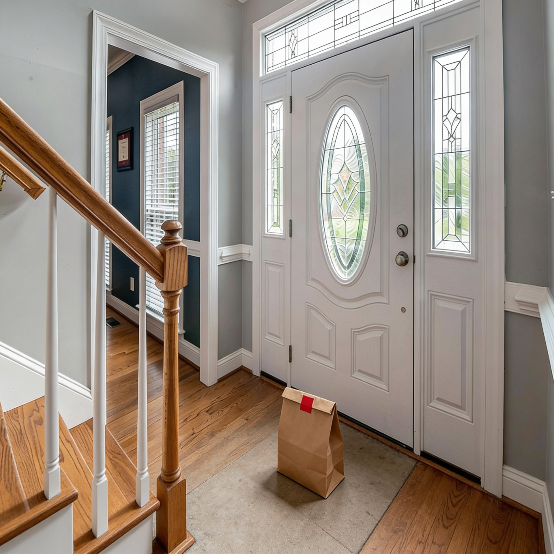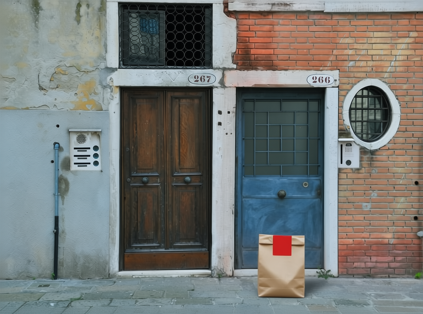 Delivery: We took real front door photos and used AI to add a fake delivery bag to the photo.
