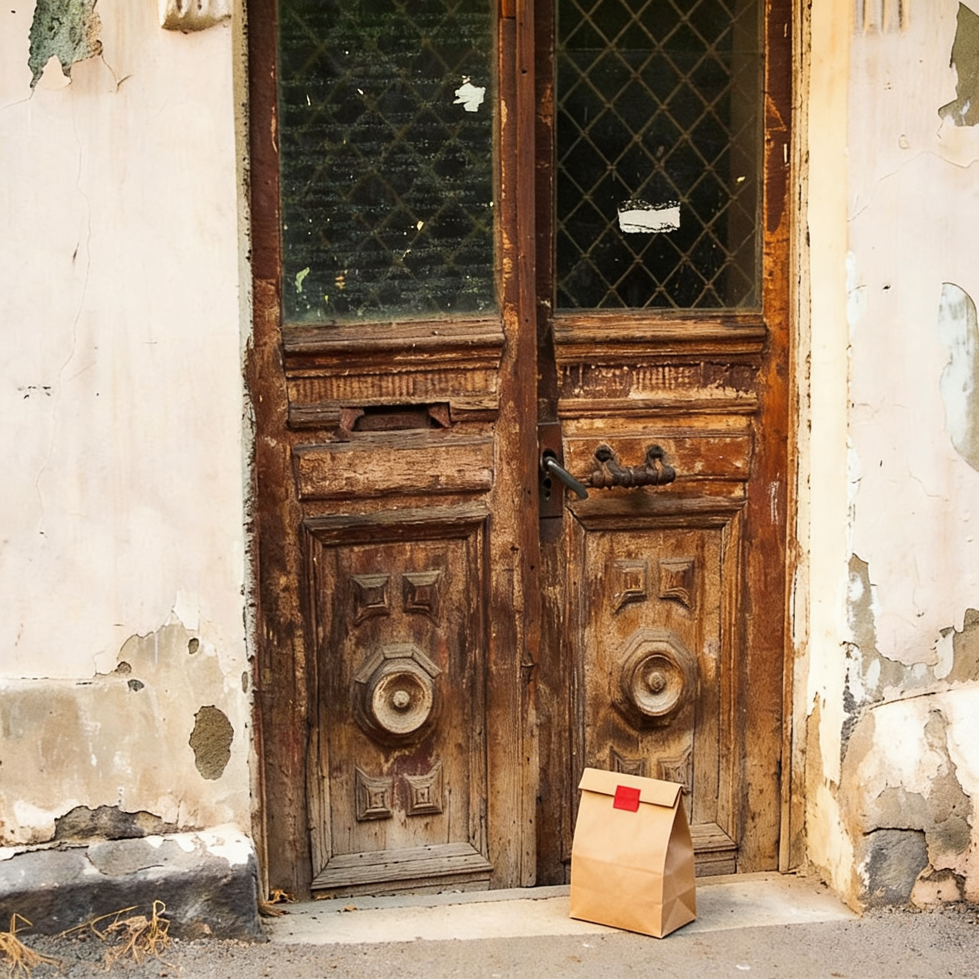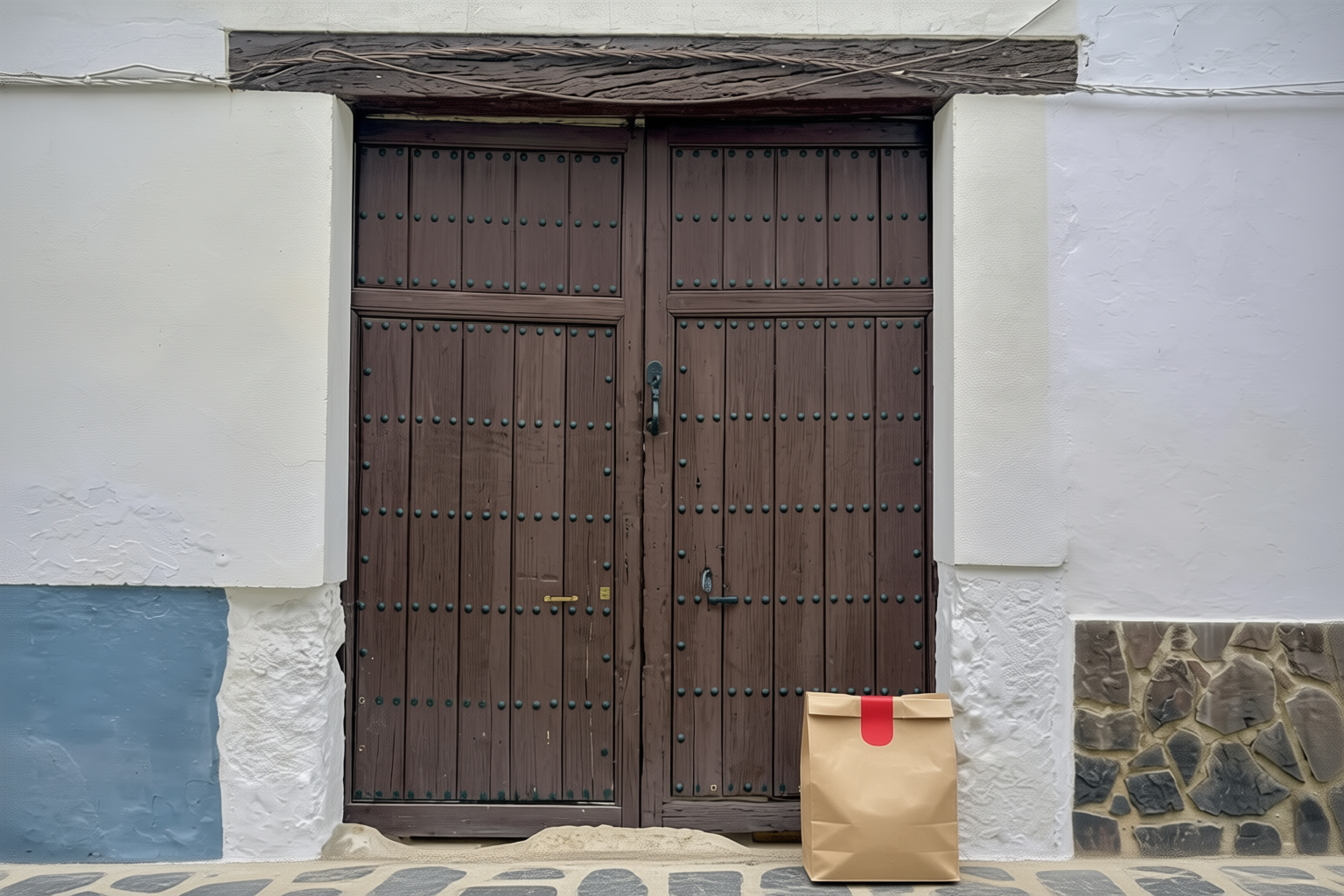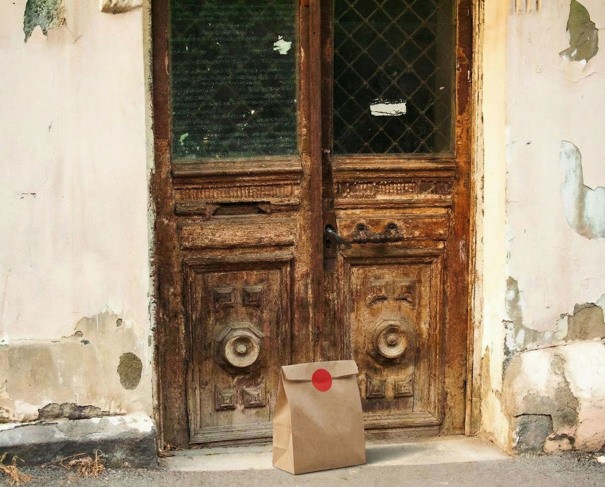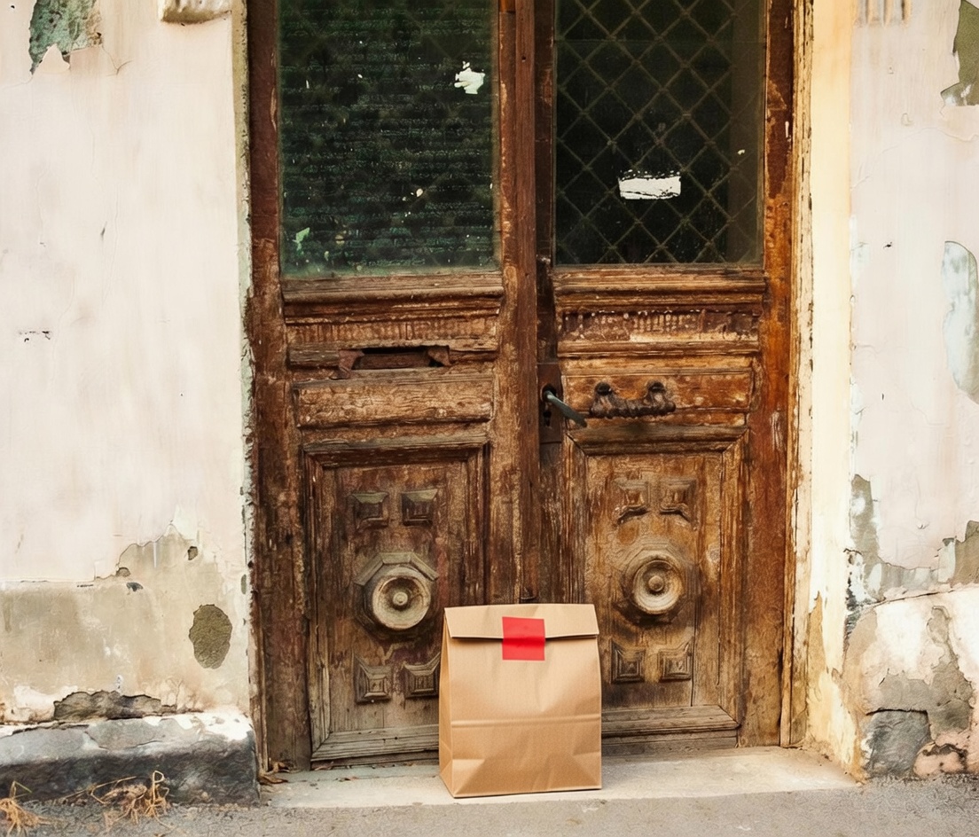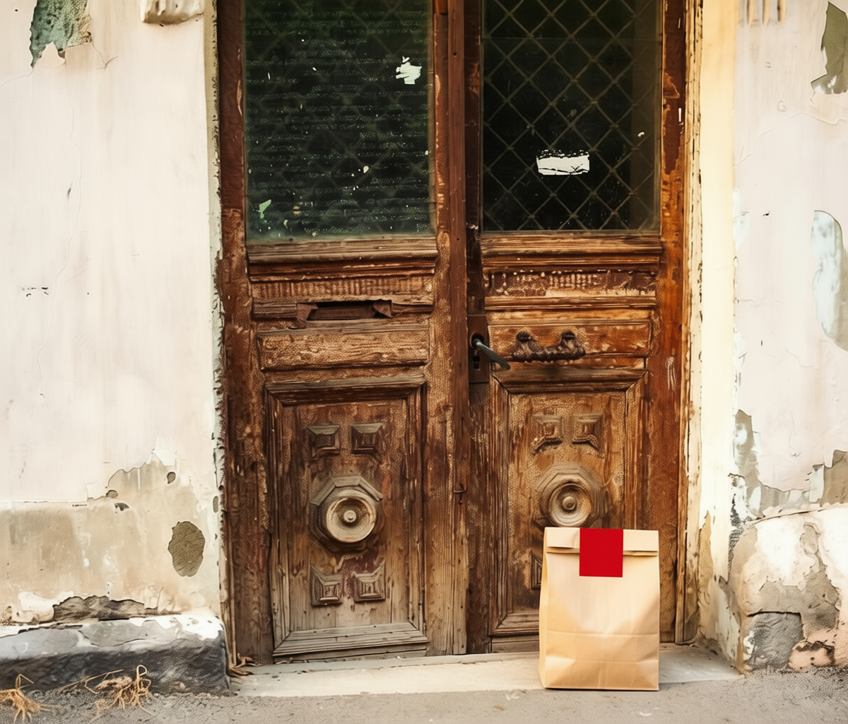 “In this existing photo, add a food delivery paper bag on the ground right in front of the door. The bag should be a small brown paper bag with a solid plain red sticker on the top keeping it closed. Preserve existing photo style and lighting as much as possible.”