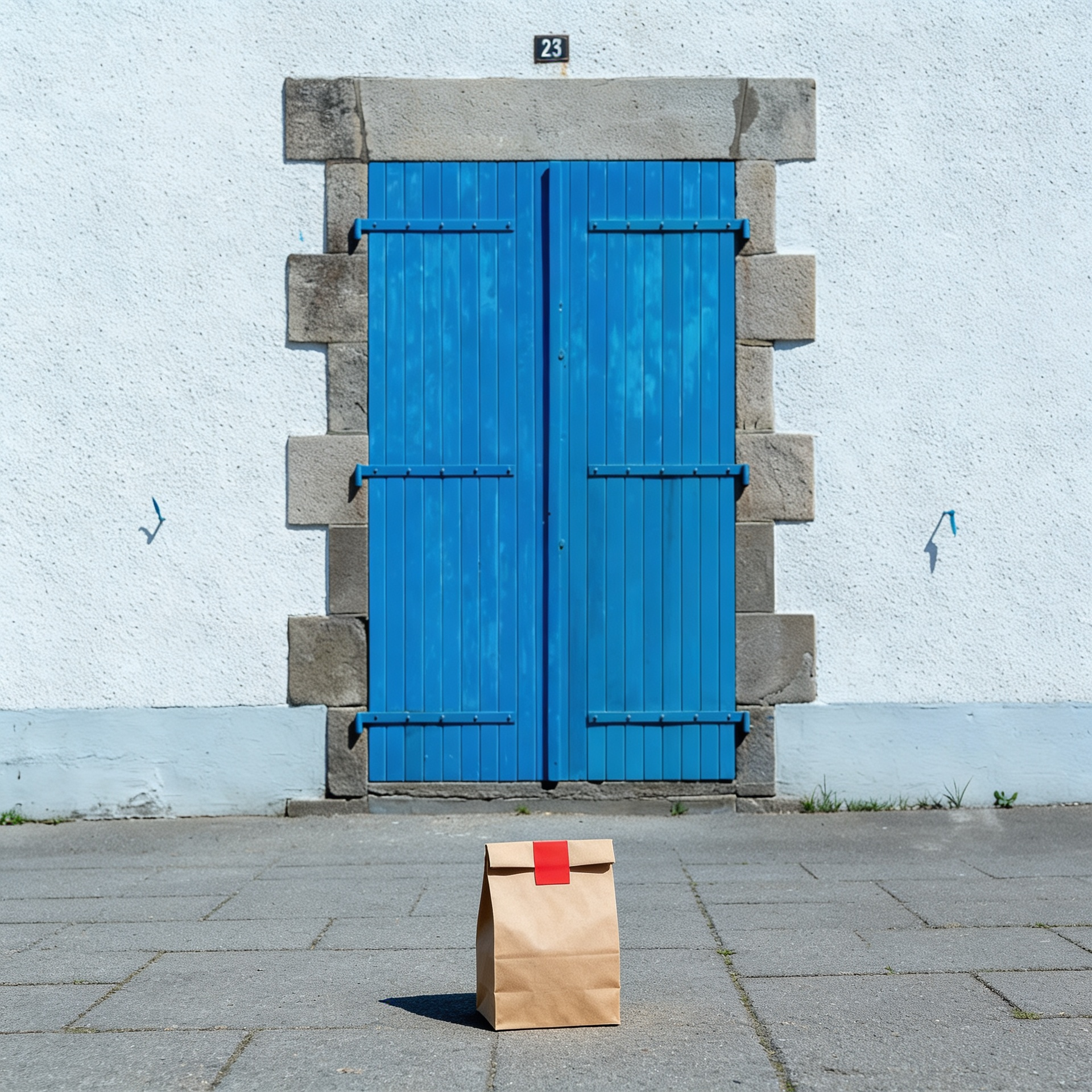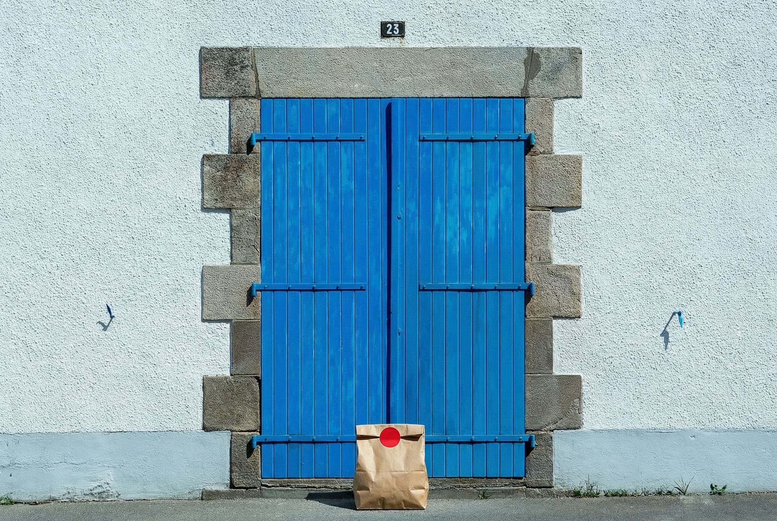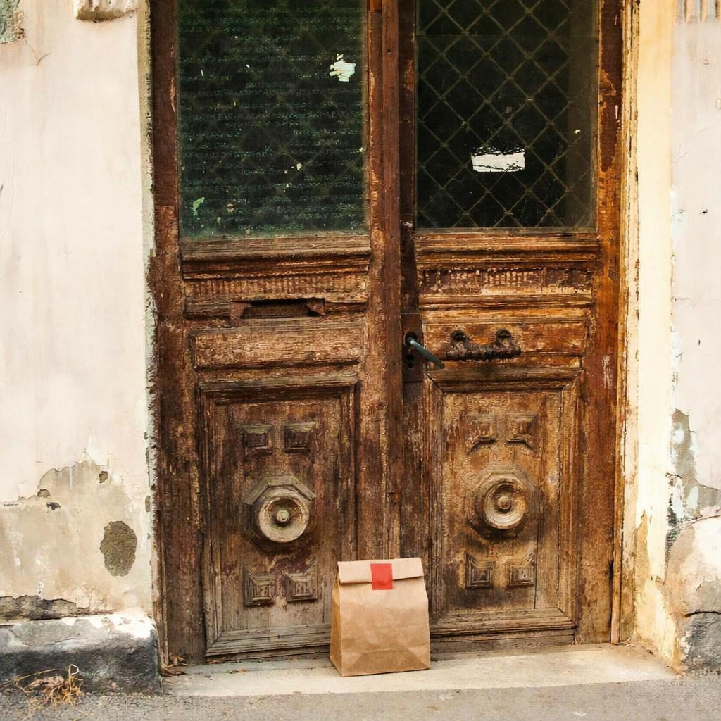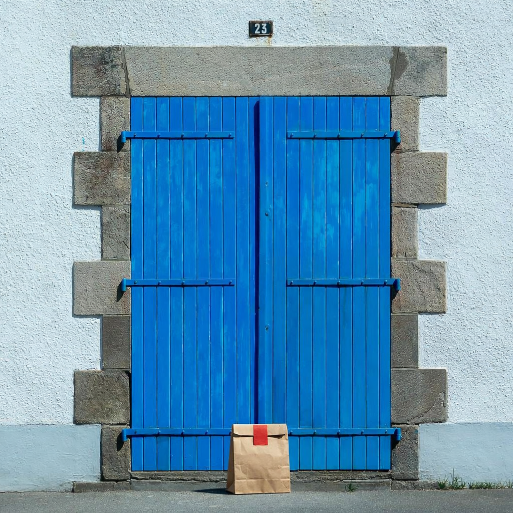 “In this existing photo, add a food delivery paper bag on the ground right in front of the door. The bag should be a small brown paper bag with a solid plain red sticker on the top keeping it closed. Preserve existing photo style and lighting as much as possible.”