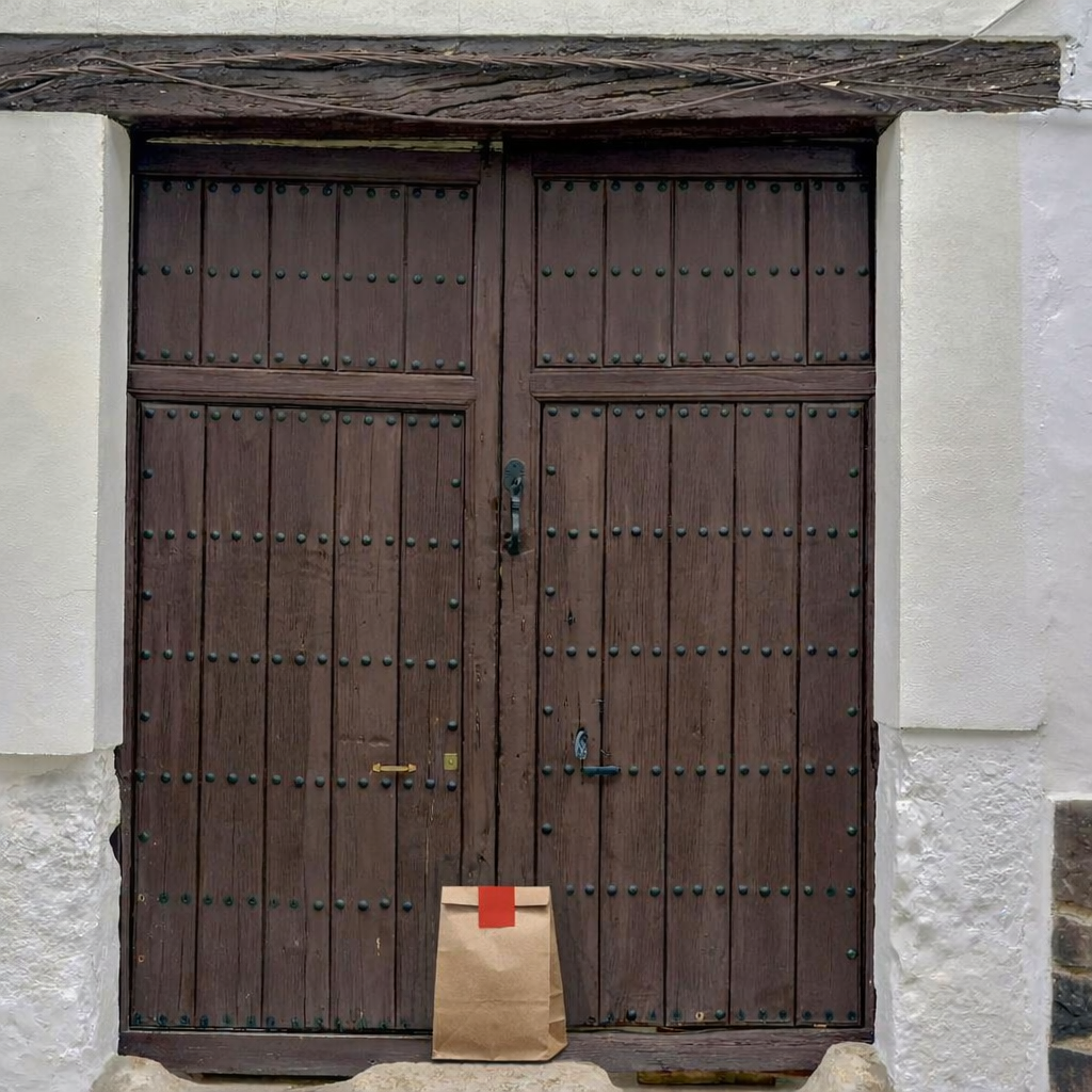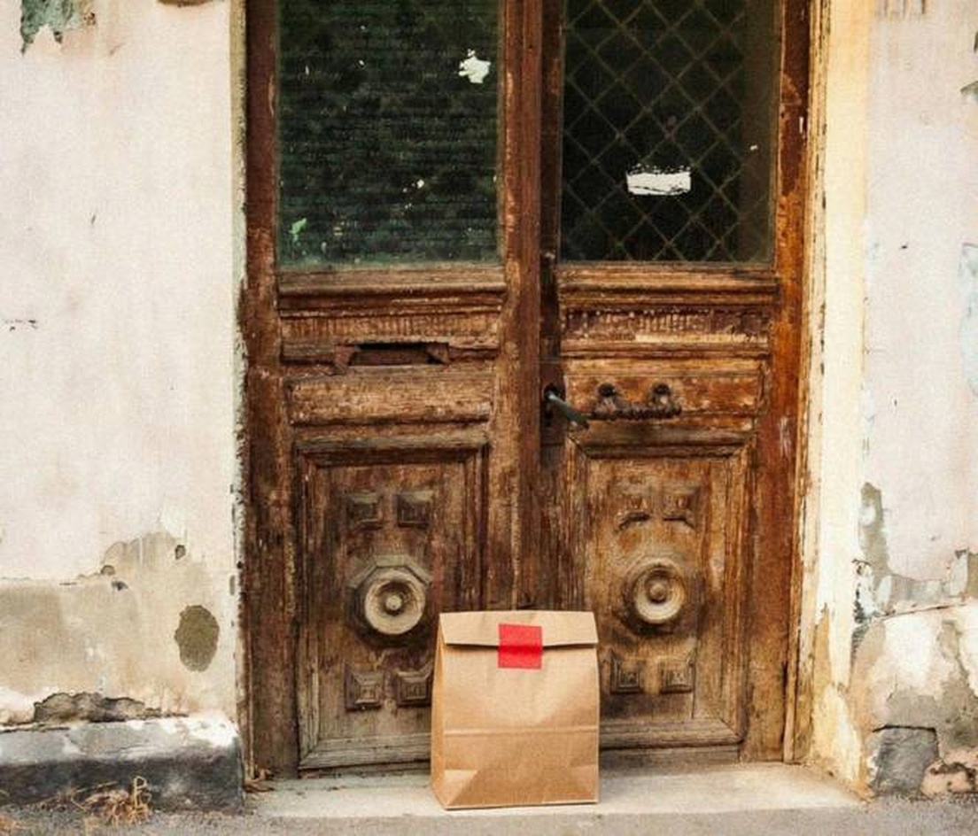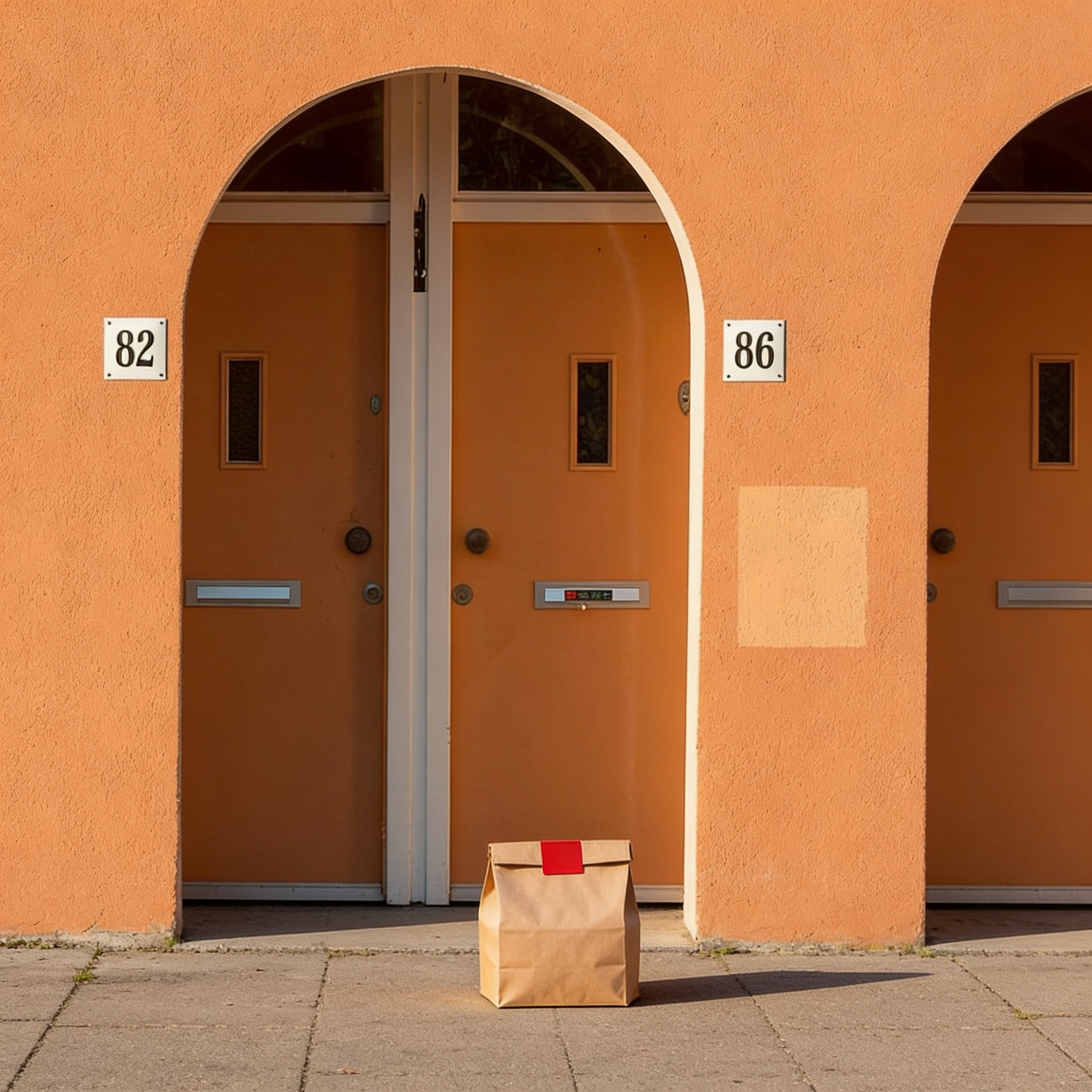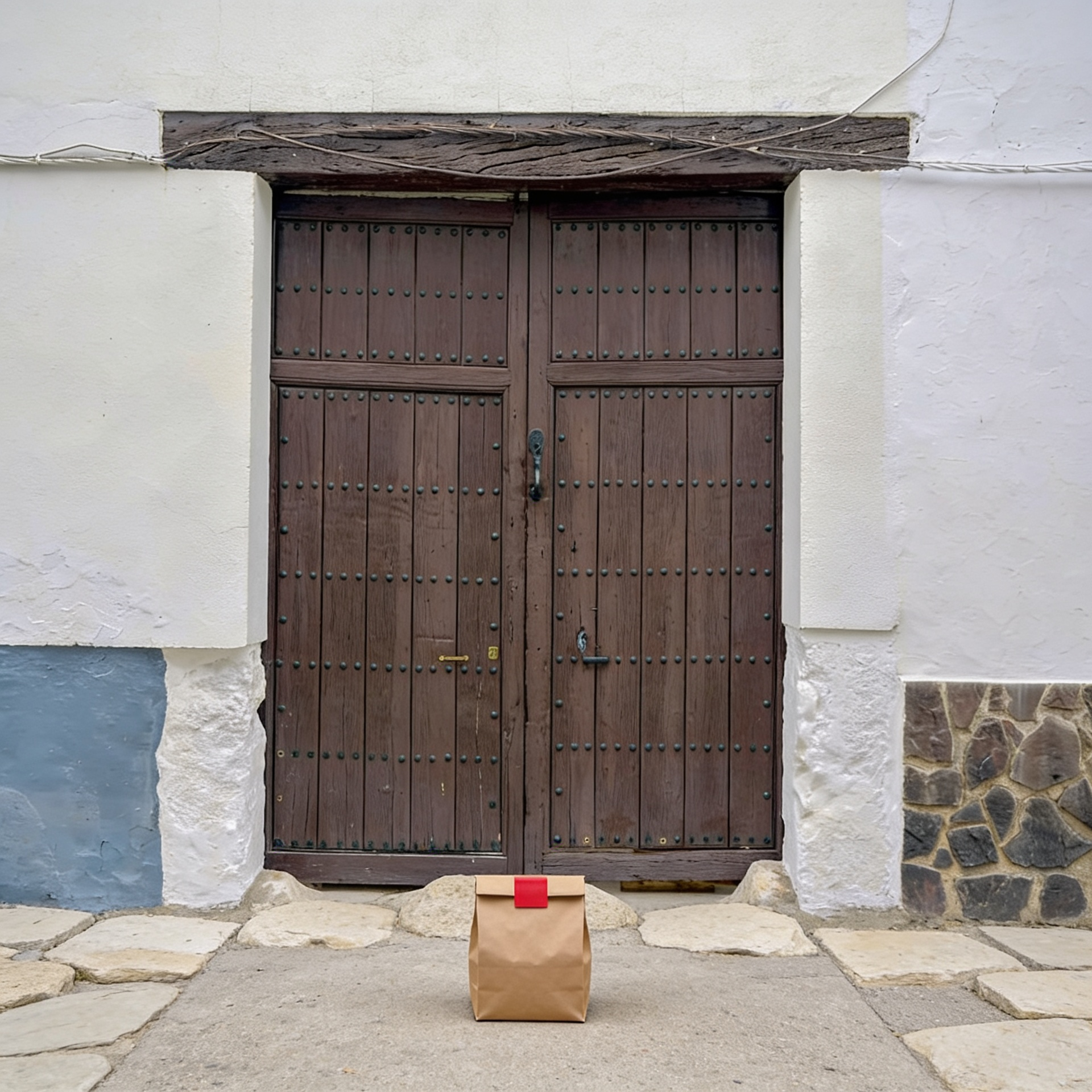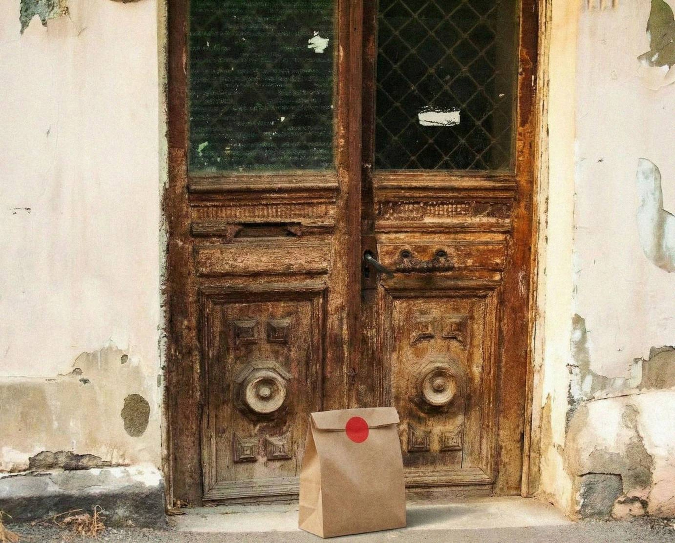 “In this existing photo, add a food delivery paper bag on the ground right in front of the door. The bag should be a small brown paper bag with a solid plain red sticker on the top keeping it closed. Preserve existing photo style and lighting as much as possible.”