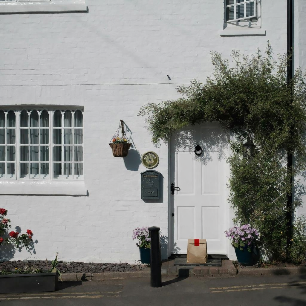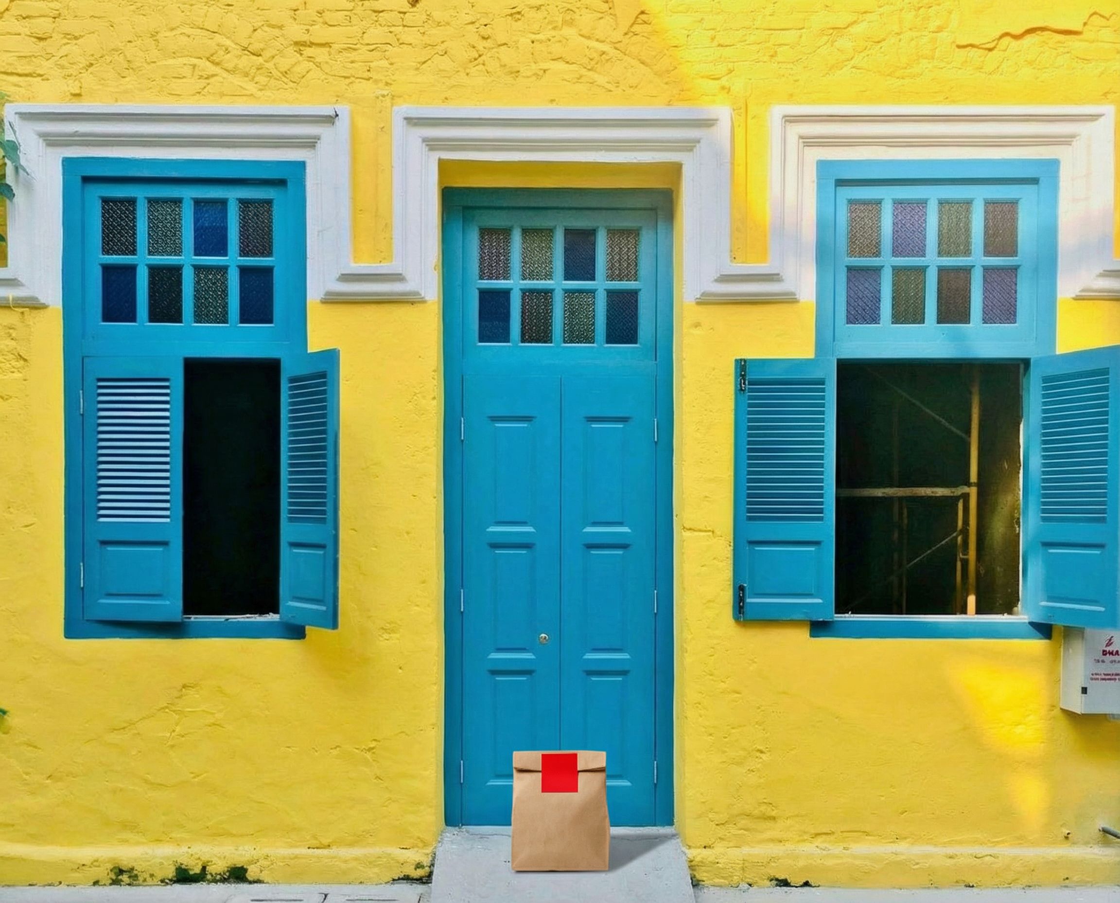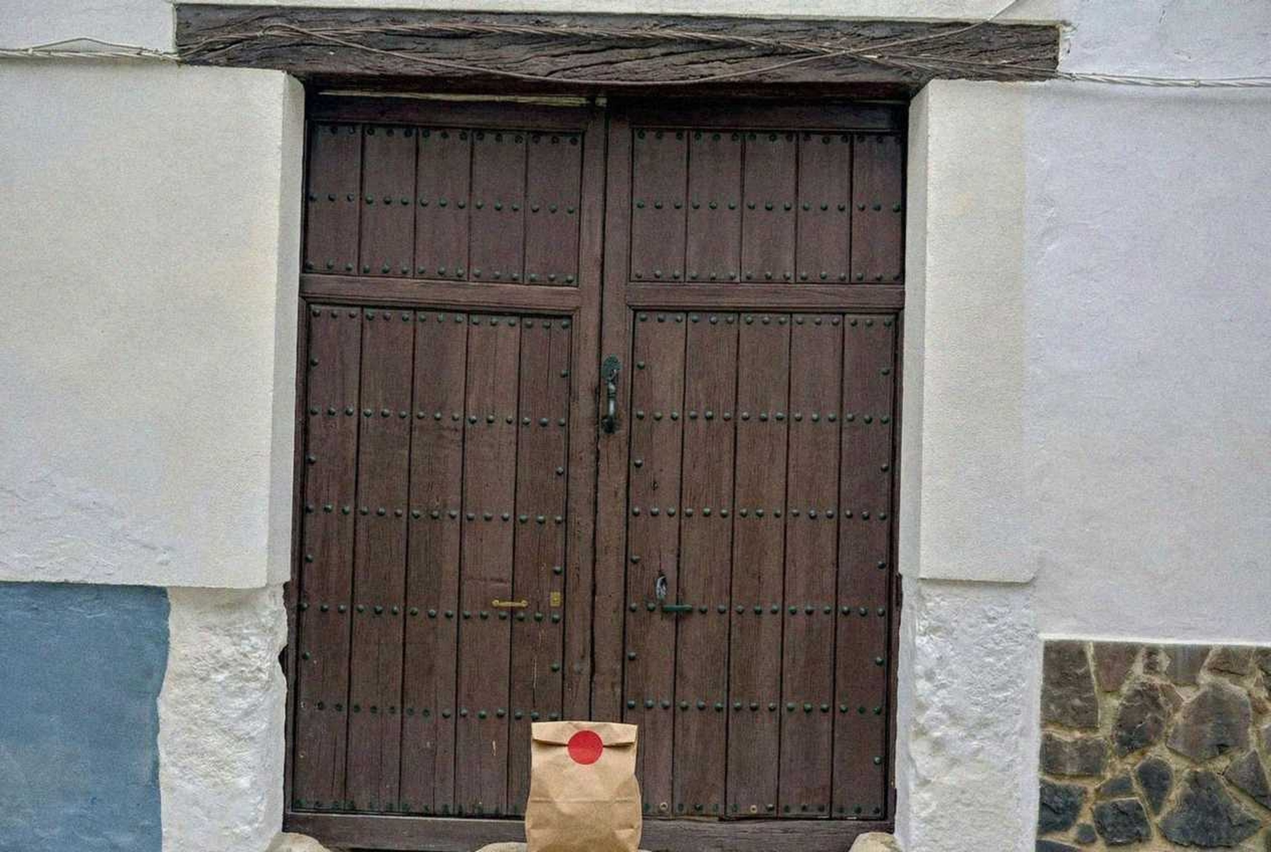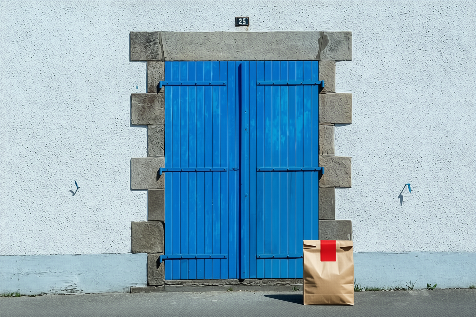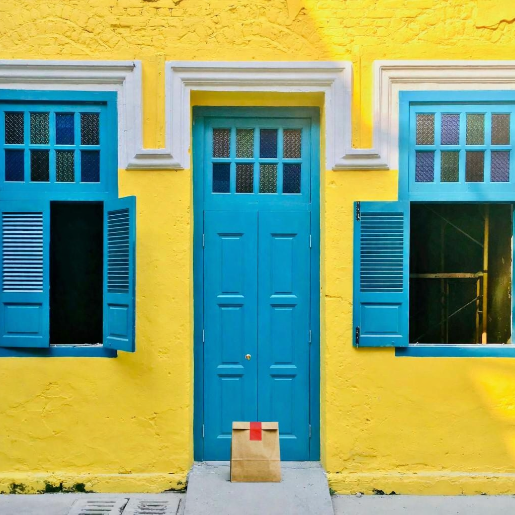 “In this existing photo, add a food delivery paper bag on the ground right in front of the door. The bag should be a small brown paper bag with a solid plain red sticker on the top keeping it closed. Preserve existing photo style and lighting as much as possible.”