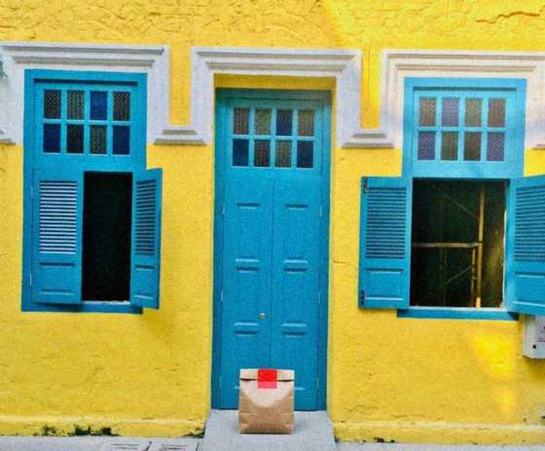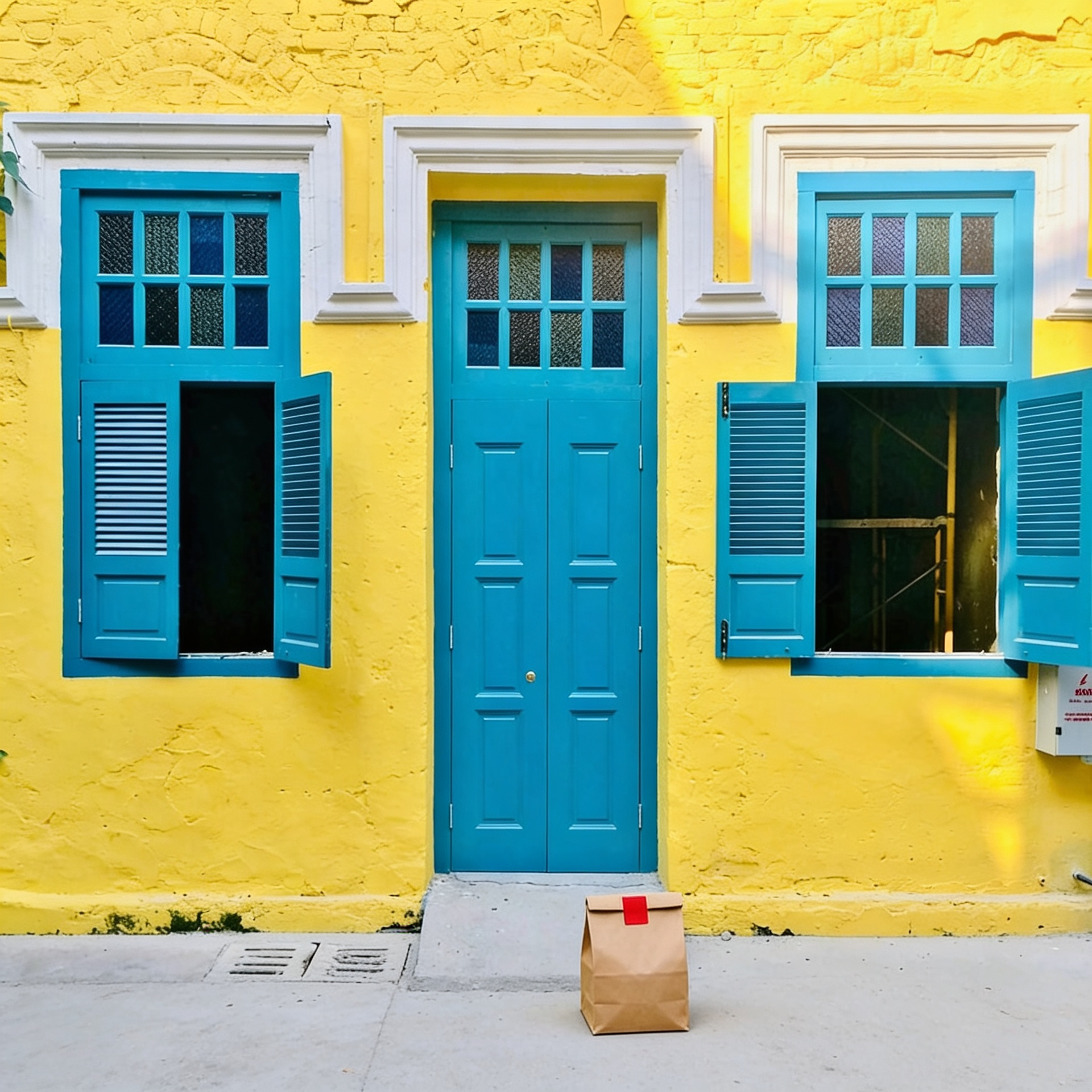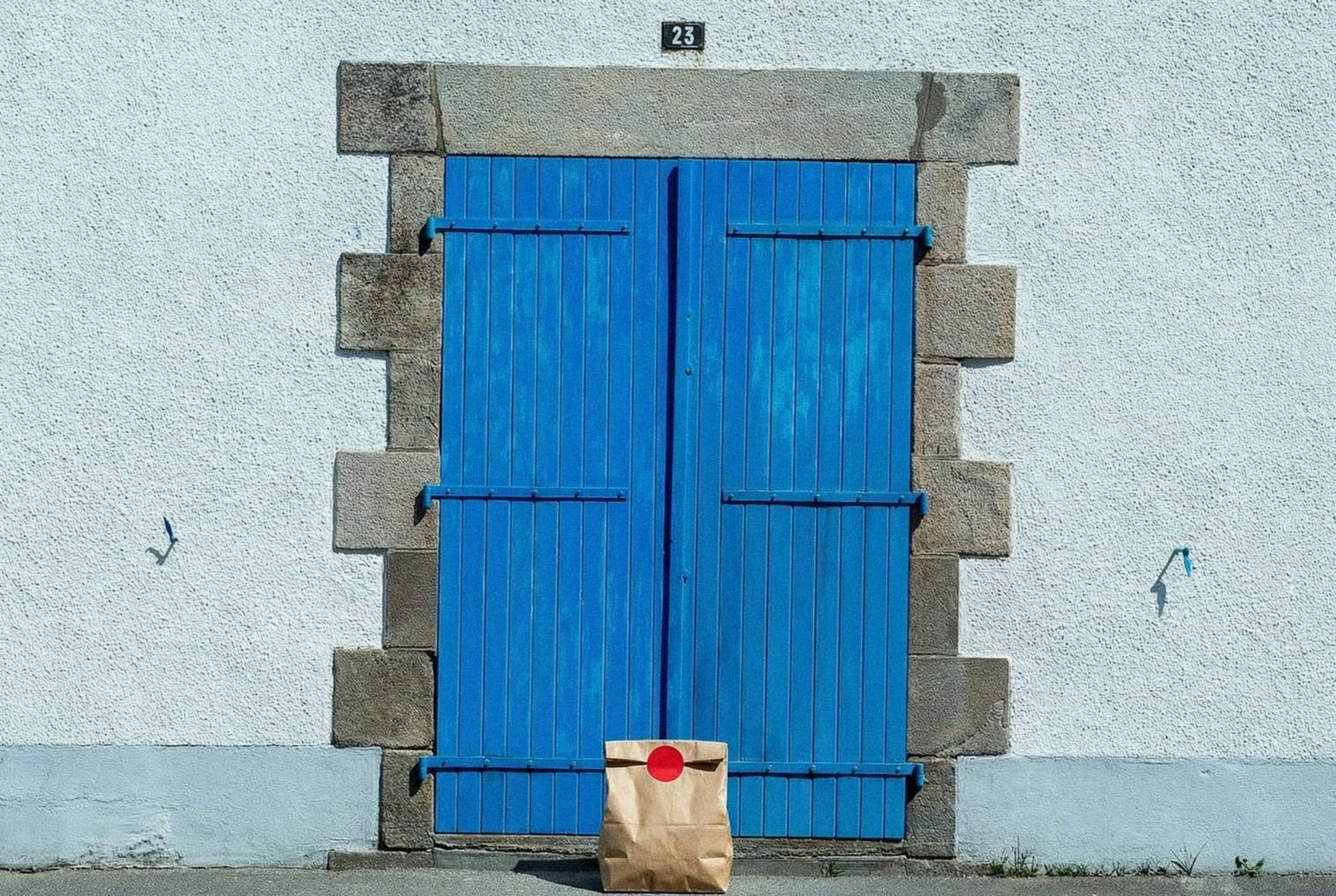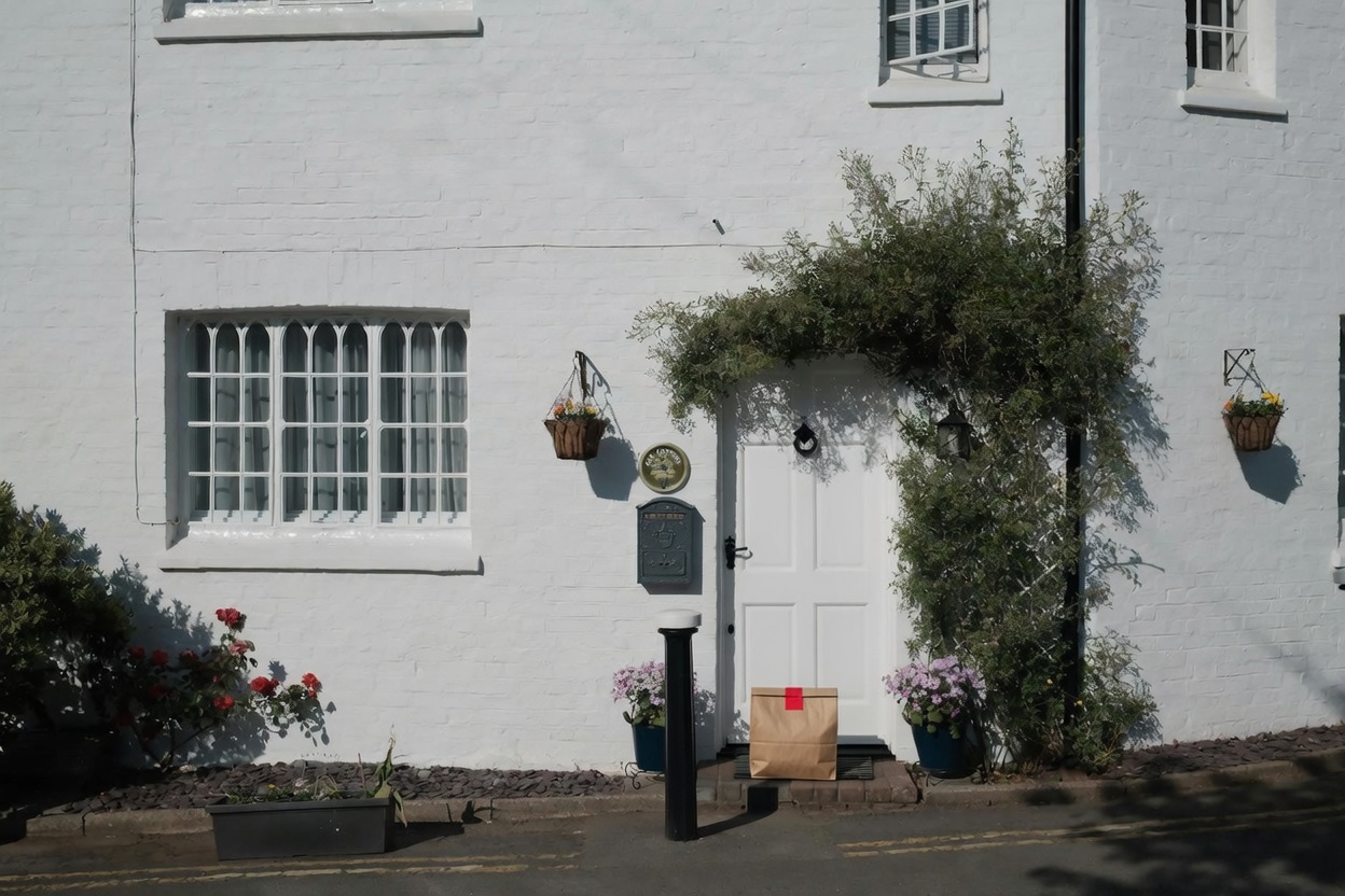 “In this existing photo, add a food delivery paper bag on the ground right in front of the door. The bag should be a small brown paper bag with a solid plain red sticker on the top keeping it closed. Preserve existing photo style and lighting as much as possible.”