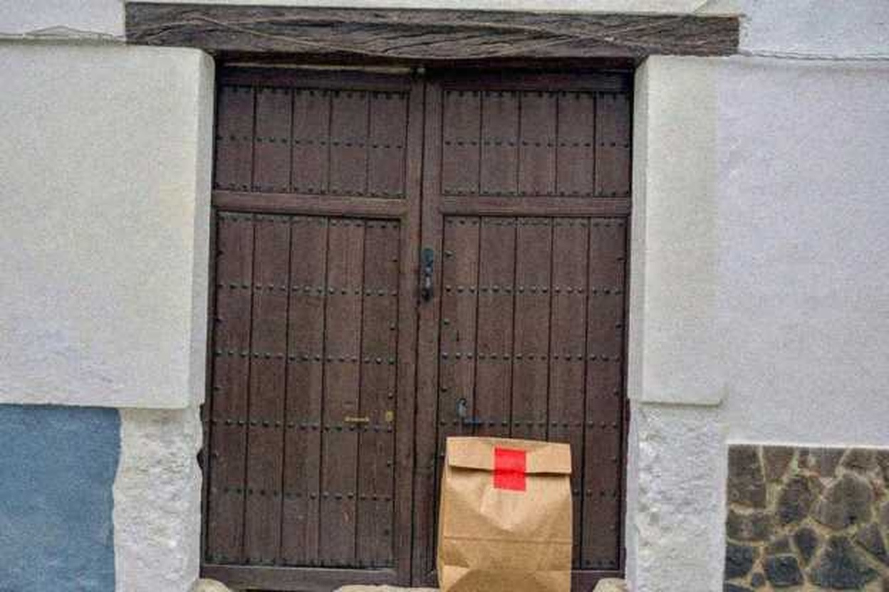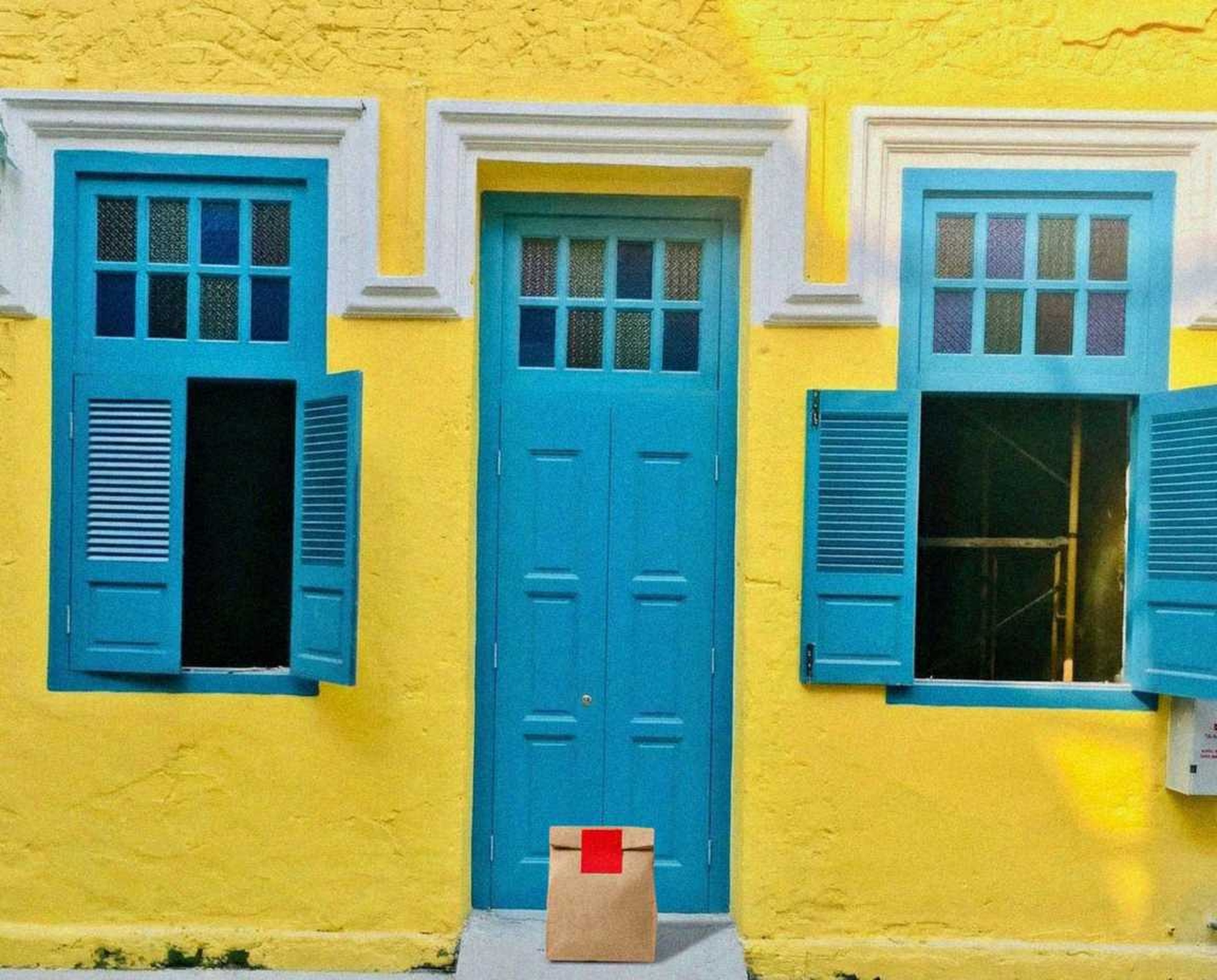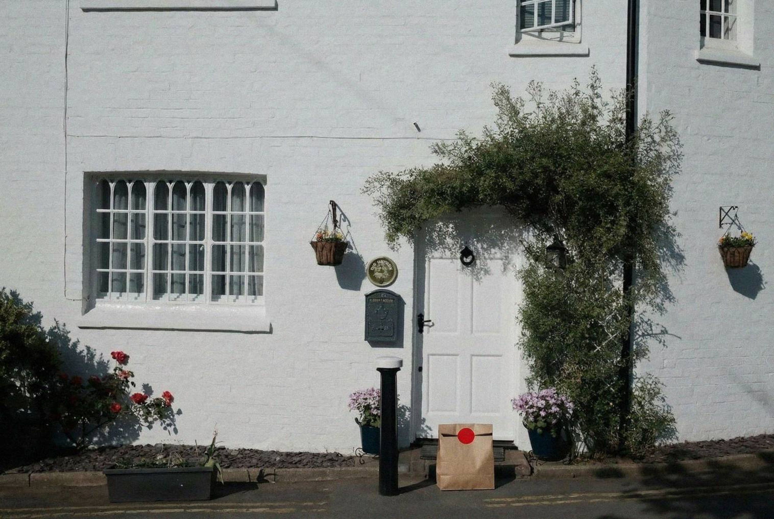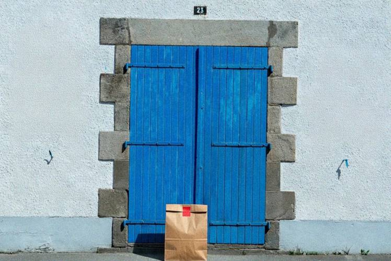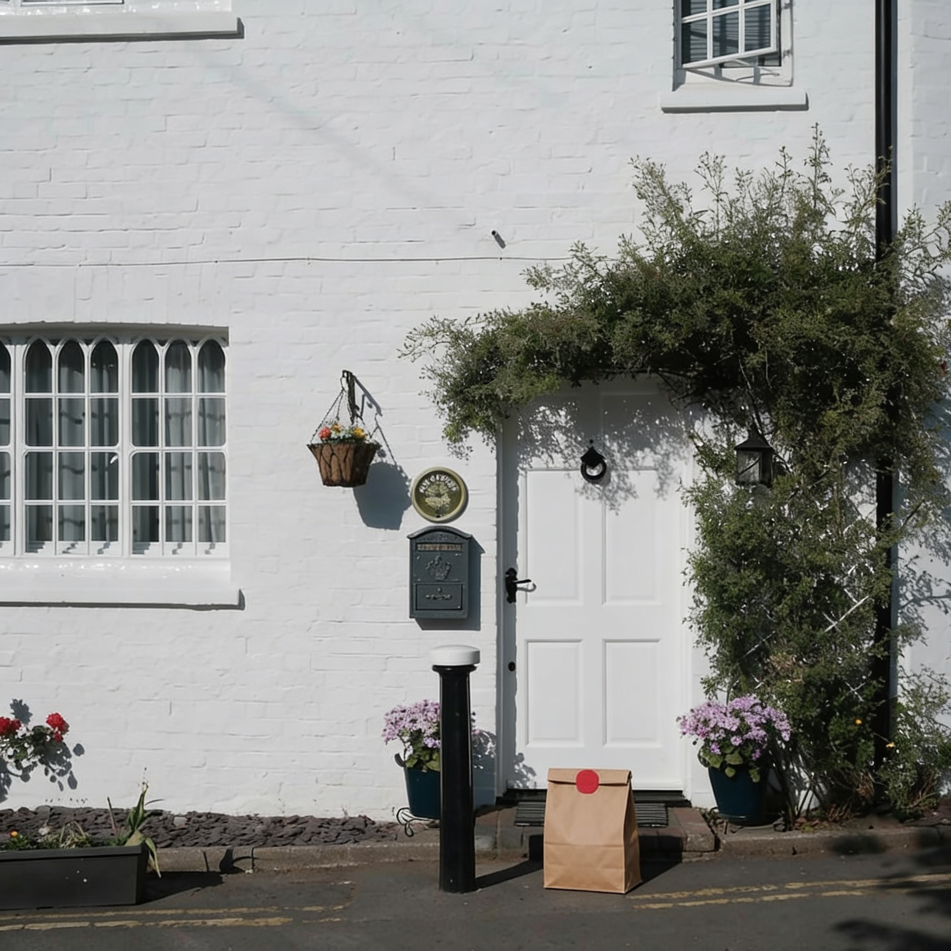 “In this existing photo, add a food delivery paper bag on the ground right in front of the door. The bag should be a small brown paper bag with a solid plain red sticker on the top keeping it closed. Preserve existing photo style and lighting as much as possible.”